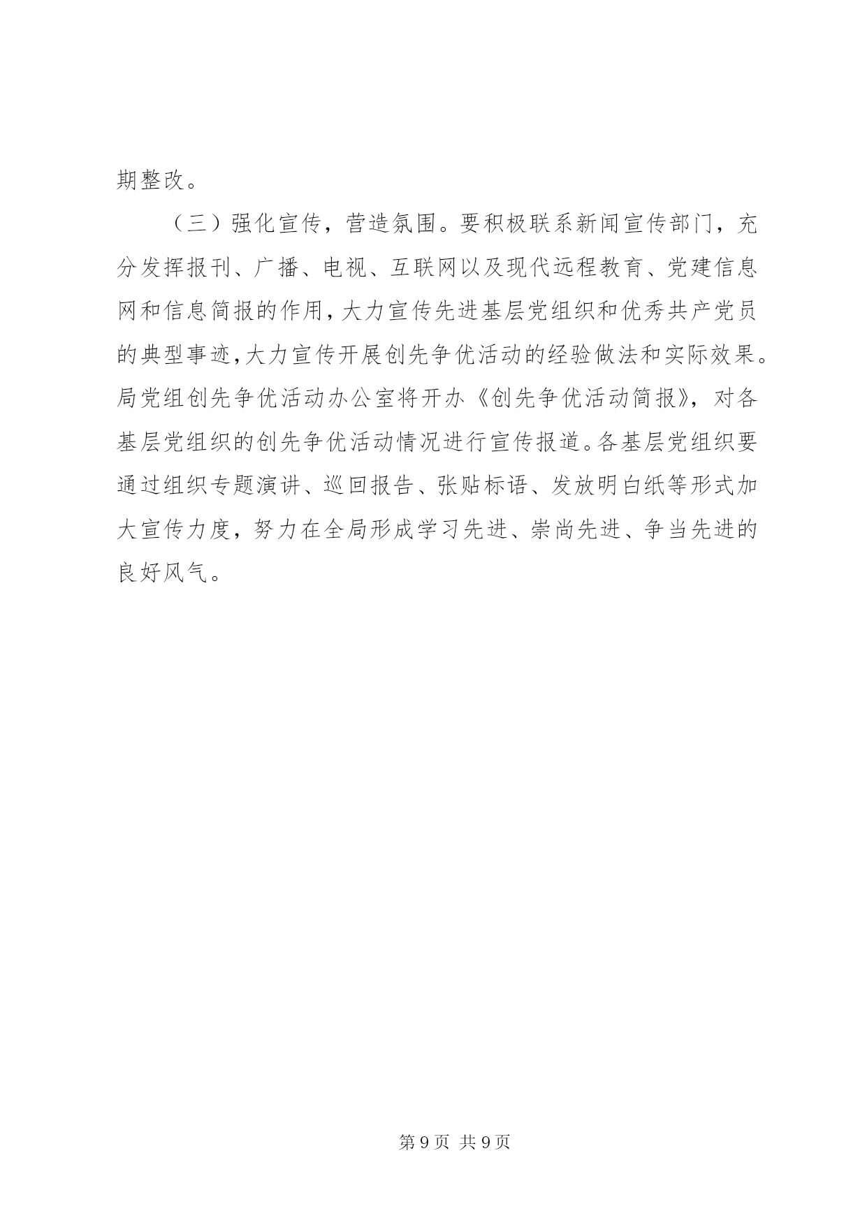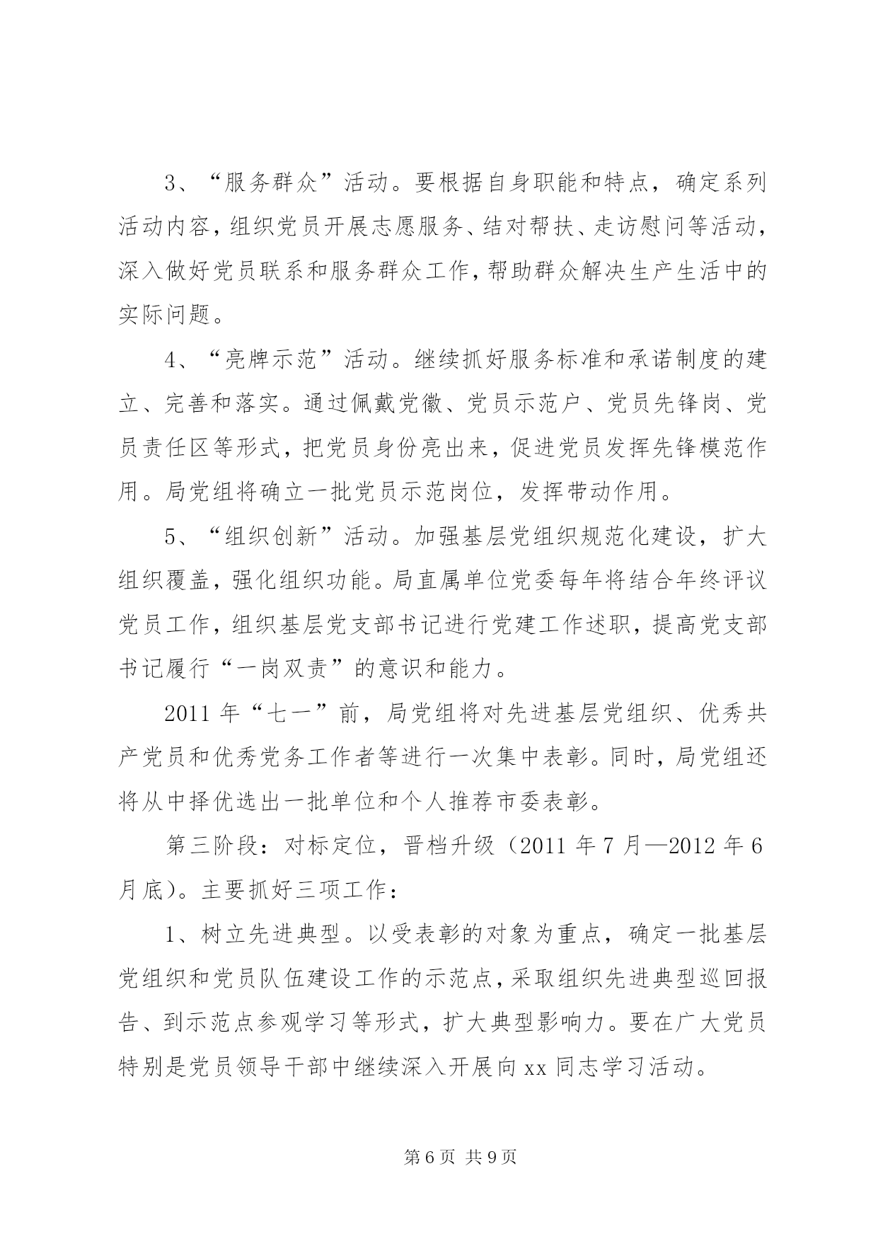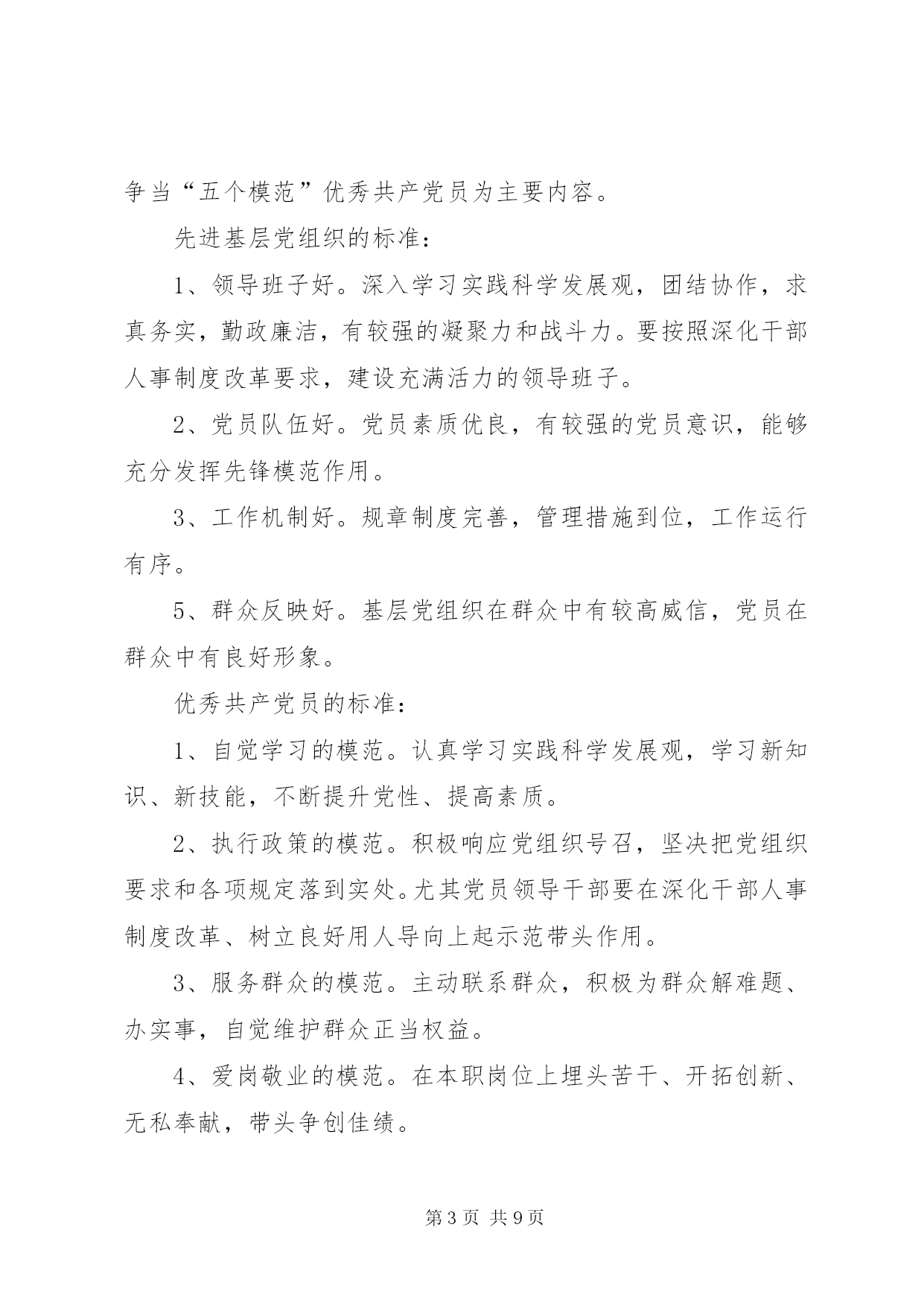 第PAGE\*Arabic\*MERGEFORMAT9页共NUMPAGES\*MERGEFORMAT9页某市司法局创先争优活动实施方案xx市司法局党组关于在基层党组织和全体党员中深入开展创先争优活动的实施方案根据中央和省、市委的安排部署,从2010年4月开始,到党的十八大召开前,按照市委《关于在全市基层党组织和党员中深入开展创先争优活动的实施方案》(石办发〔2010〕3号)要求,结合我局实际,经局党组研究决定,在局机关和下属单位基层党组织和全体党员中深入开展创建先进基层党组织、争当优秀共产党员活动(以下简称“创先争优活动”),现提出如下实施方案。一、指导思想活动主题和总体要求(一)指导思想。深入开展创先争优活动,要以邓--理论和“三个代表”重要思想为指导,深入学习实践科学发展观,围绕打造繁华舒适现代一流的省会城市为目标,进一步深化干部人事制度改革,大力加强基层党组织建设和党员队伍建设,充分发挥基层党组织的战斗堡垒作用和共产党员的先锋模范作用,全面提升司法行政工作水平,促进全市经济社会又好又快发展。(二)活动主题。中央明确创先争优活动要以深入学习实践科学发展观为主题,省委明确要以“筑坚强堡垒、树先锋形象、促科学发展”为主线,以“科学发展、富民强省”为目标。市委以“建堡垒夯实基础、学先进争当楷模、比奉献岗位立功、强省会科学发展”为主题,以“创先争优深入人心、基层组织坚强有力、党员队伍充满生机、科学发展取得实效”为目标。根据市委确定的主题和目标,司法局创先争优活动的主题为:固本强基筑堡垒、创先争优作表率、科学发展求突破、服务大局比奉献。主要目标为:党组织建设得到加强、党员模范作用更加明显、法律服务保障成效显著、司法行政工作全面提升。每一个基层党组织,都要紧紧围绕中央和省、市委以及局党组确定的主题、主线和目标等,提出本单位、本部门有鲜明特点的活动主题和符合实际的活动目标,从一开始就牢牢把握活动的大方向。(三)总体要求。按照中央和省、市委确定的“推动科学发展、促进社会和谐、服务人民群众、加强基层组织”的总体要求,坚持从实际出发,改革创新,使党的工作和党的建设更加符合科学发展观要求。通过推进干部人事制度改革,匡正选人用人风气,建立公正、公平、竞争、择优的科学选拔干部机制,真正建设团结高效的基层党组织和党员干部队伍,在推动科学发展、促进社会和谐、服务人民群众、加强基层组织的实践中建功立业。二、创先争优活动的主要内容开展创先争优活动,要以创建“五个好”先进基层党组织、争当“五个模范”优秀共产党员为主要内容。先进基层党组织的标准:1、领导班子好。深入学习实践科学发展观,团结协作,求真务实,勤政廉洁,有较强的凝聚力和战斗力。要按照深化干部人事制度改革要求,建设充满活力的领导班子。2、党员队伍好。党员素质优良,有较强的党员意识,能够充分发挥先锋模范作用。3、工作机制好。规章制度完善,管理措施到位,工作运行有序。5、群众反映好。基层党组织在群众中有较高威信,党员在群众中有良好形象。优秀共产党员的标准:1、自觉学习的模范。认真学习实践科学发展观,学习新知识、新技能,不断提升党性、提高素质。2、执行政策的模范。积极响应党组织号召,坚决把党组织要求和各项规定落到实处。尤其党员领导干部要在深化干部人事制度改革、树立良好用人导向上起示范带头作用。3、服务群众的模范。主动联系群众,积极为群众解难题、办实事,自觉维护群众正当权益。4、爱岗敬业的模范。在本职岗位上埋头苦干、开拓创新、无私奉献,带头争创佳绩。5、遵纪守法的模范。自觉遵守党的纪律,模范遵守国家法律法规,带头弘扬正气、维护稳定,争当文明守法好公民。三、加强创先争优活动的分类指导机关党支部要把创先争优活动与深入推进干部作风建设有机结合起来,继续开展蹲点调研、公开承诺、行风评议等工作,抓好主题实践活动,促进干部作风转变,提高机关效能。要认真贯彻我市五个干部人事制度改革文件,进一步完善选人用人工作机制。劳教所党委要以维护场所安全稳定作为“首要任务”,大力开展“劳教所管理建设年”、岗位大练兵、公正廉洁文明执法评比等活动,通过先进基层党组织和优秀党员作用的发挥,进一步提升教育和执法质量,确保实现“单位零事故、执法零过错、干警零违纪”的目标。律师和公证员党支部要围绕发挥党组织和党员作用,扩大党的组织和工作覆盖面,以提供优质高效法律服务和法制保障为核心,广泛开展“党在我心中”、“千名律师办千案”、“百名律师献爱心”等扶贫帮困、法律援助活动,在广大群众中树立法律服务行业的良好形象,切实为基层群众服务。四、开展创先争优活动的方法步骤开展创先争优活动,要重点围绕迎接建党90周年、向党的十八大献礼两个重大节点展开,分四个步骤进行。第一阶段:广泛发动,安排部署(2010年4月—5月底)。主要抓好三项工作