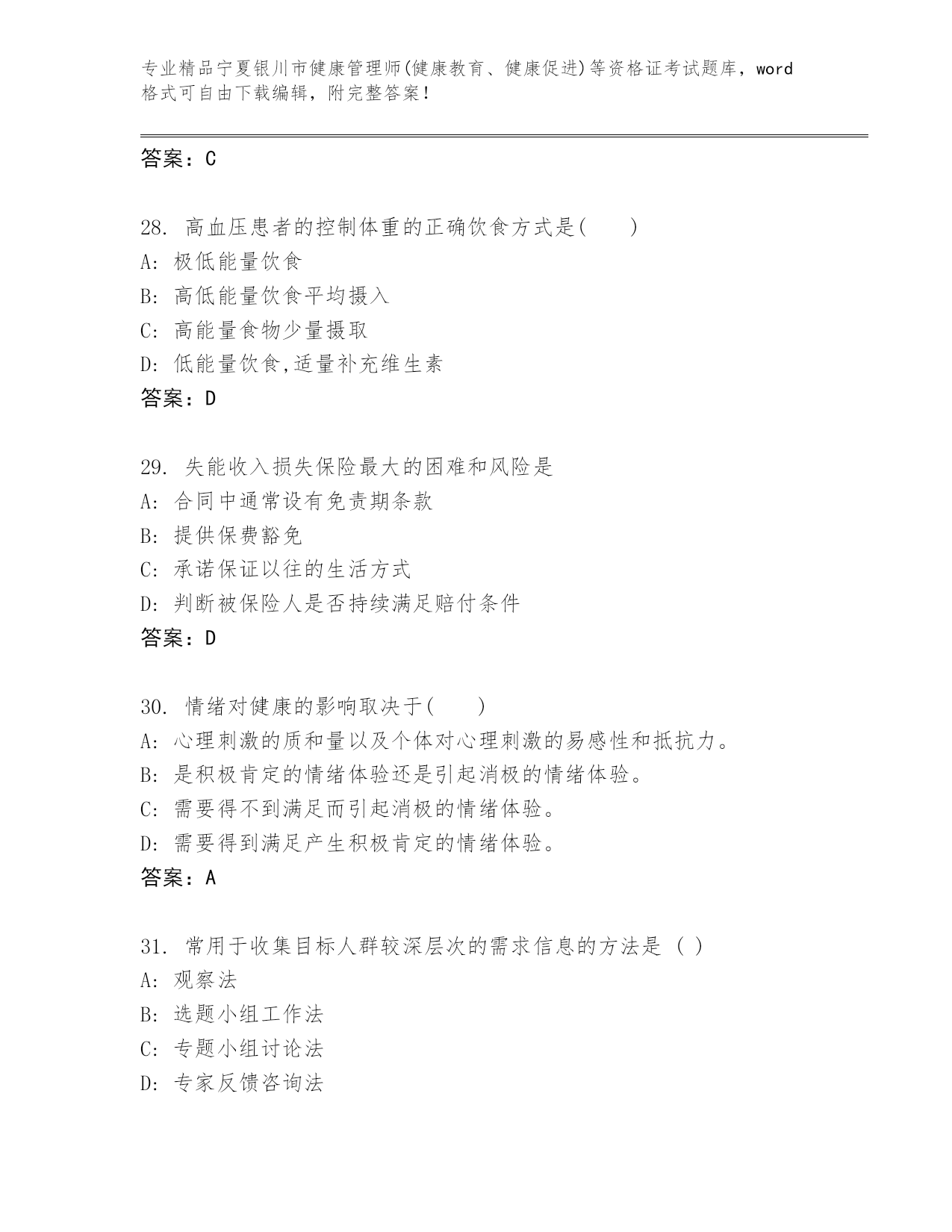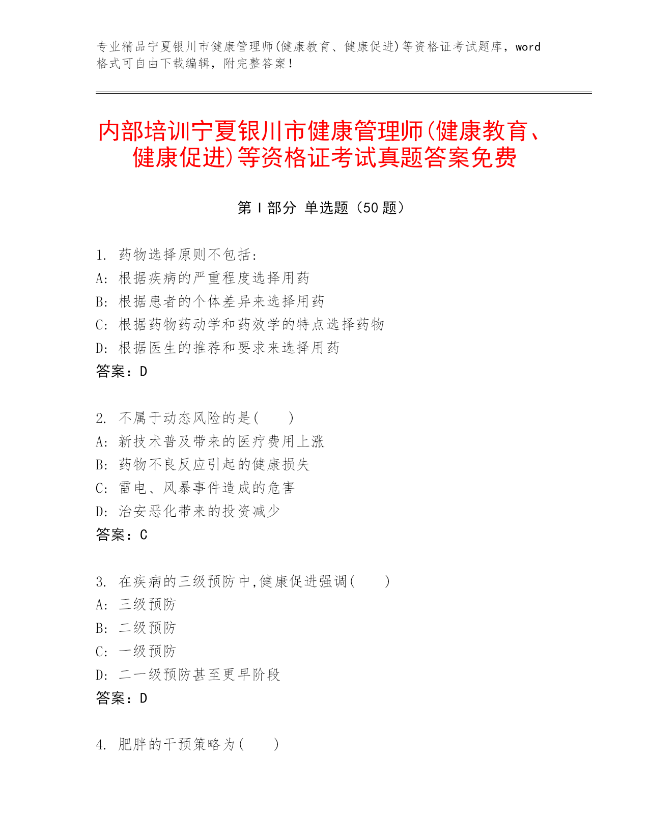 内部培训宁夏银川市健康管理师(健康教育、健康促进)等资格证考试真题答案免费