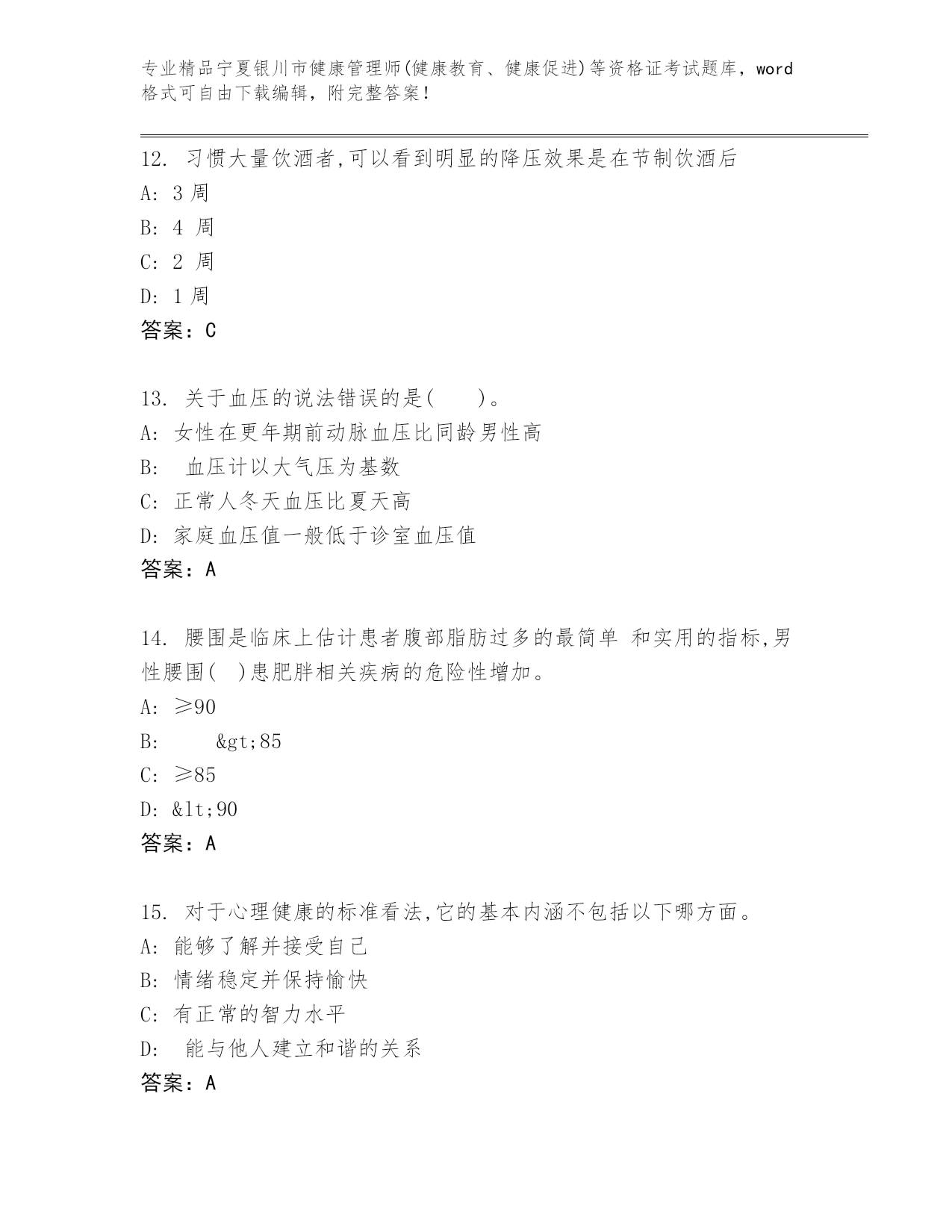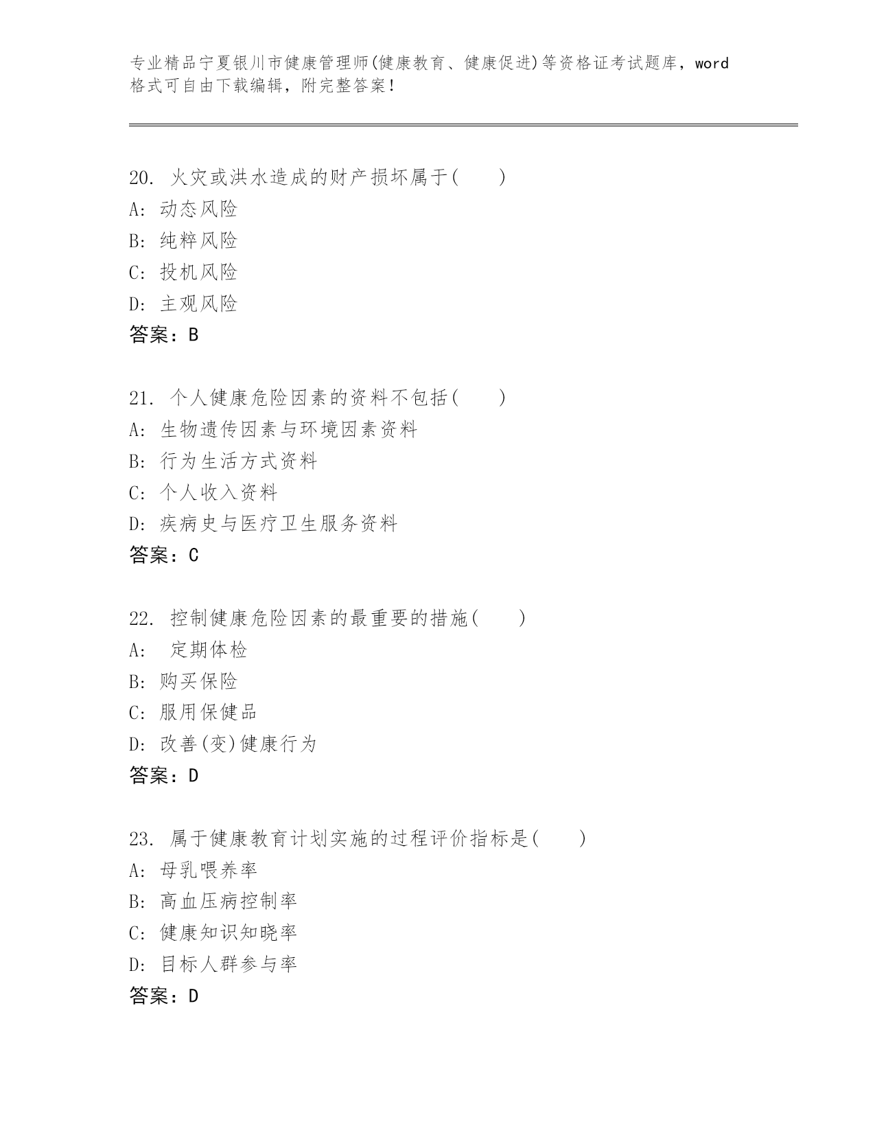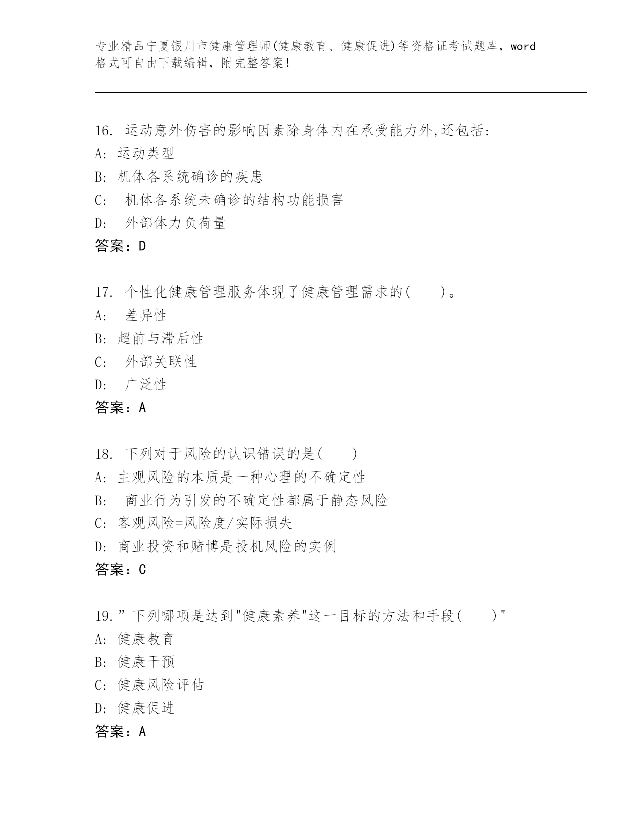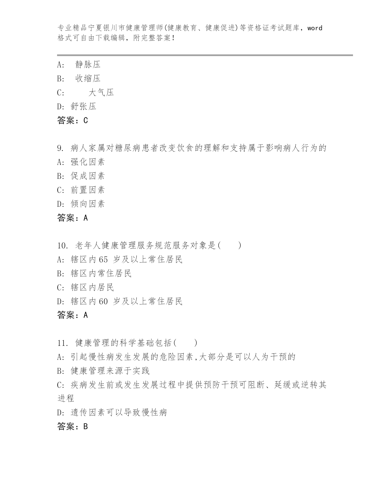 内部培训宁夏银川市健康管理师(健康教育、健康促进)等资格证考试真题答案免费.docx