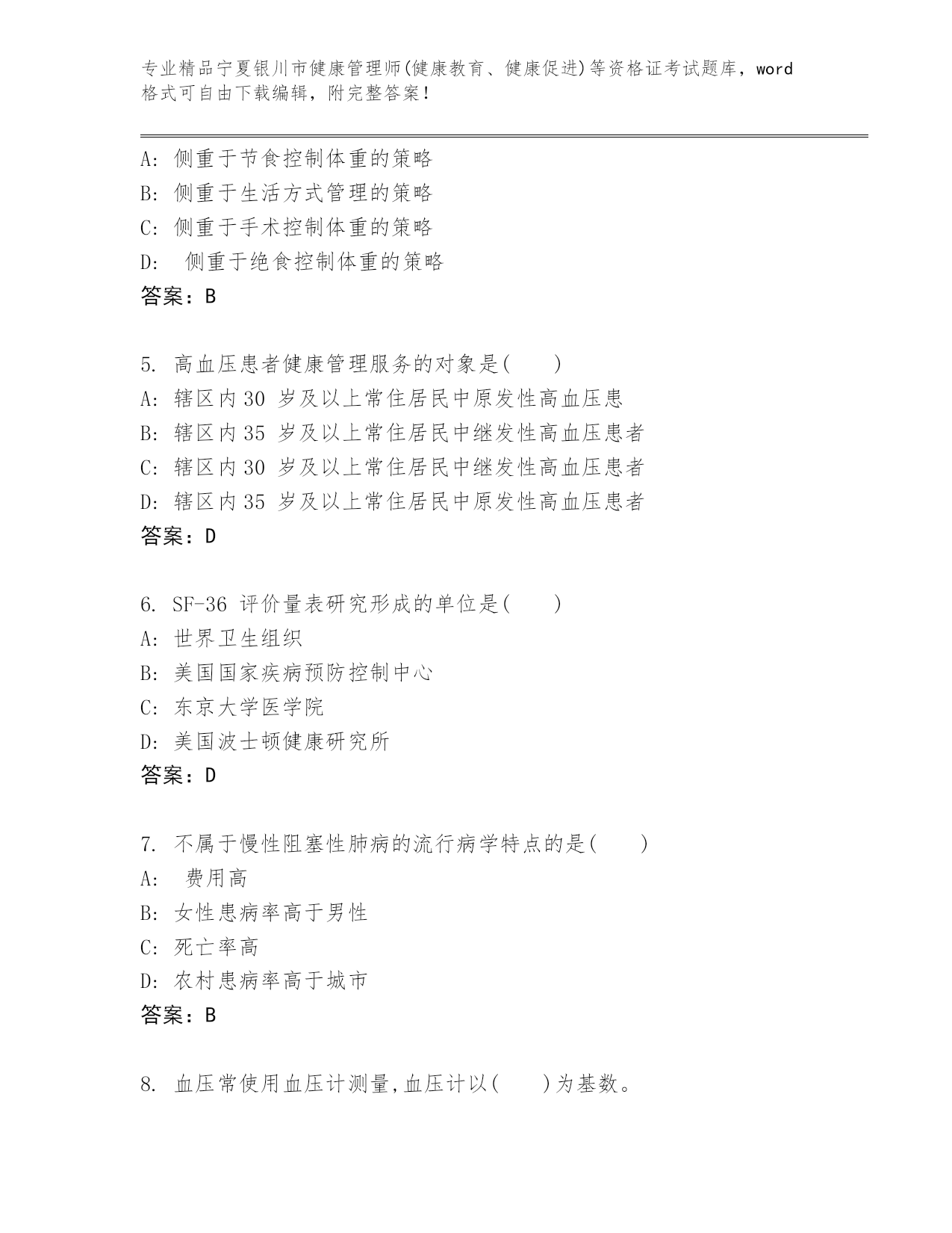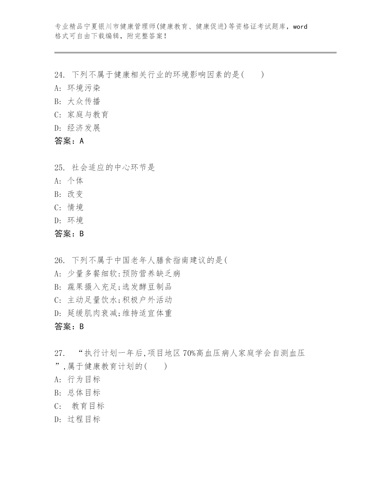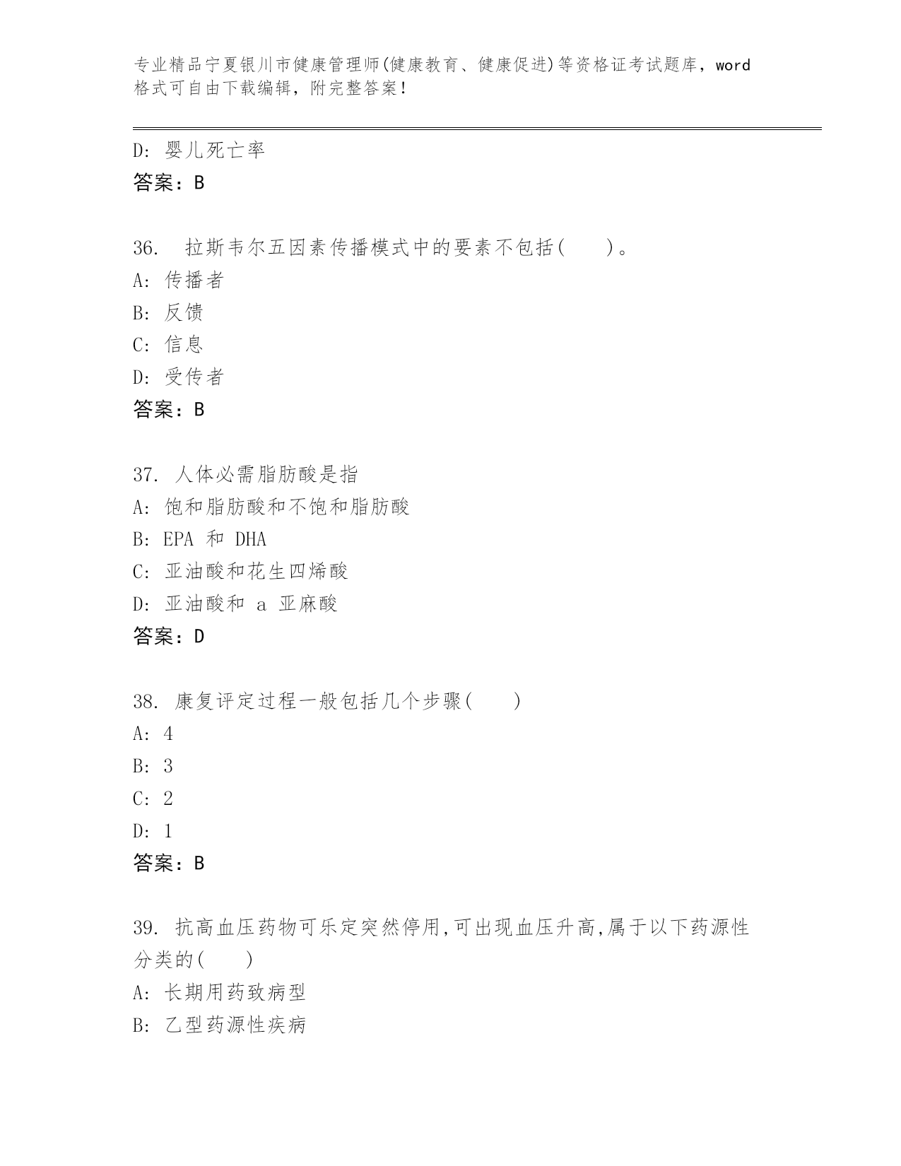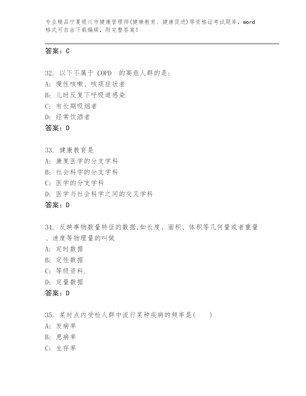 内部培训宁夏银川市健康管理师(健康教育、健康促进)等资格证考试真题答案免费.docx