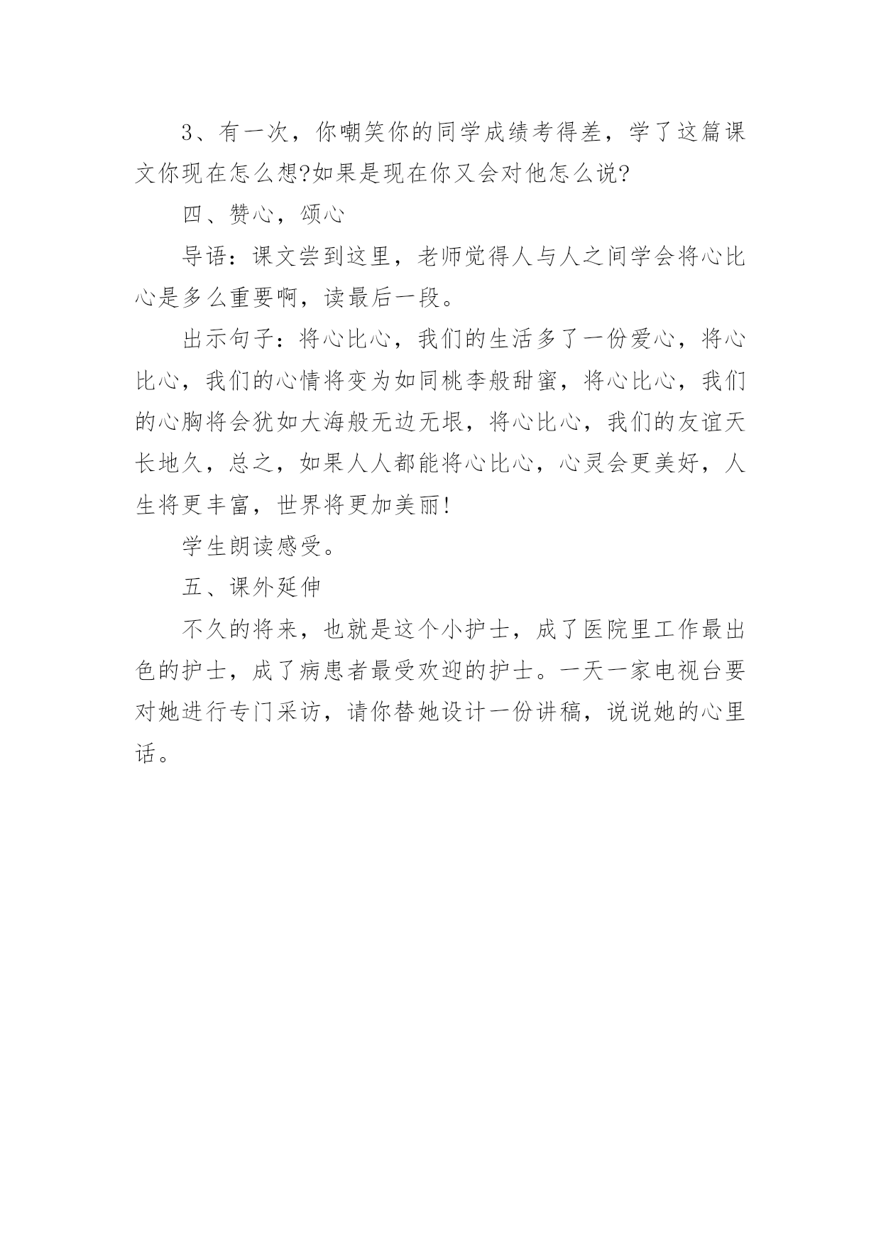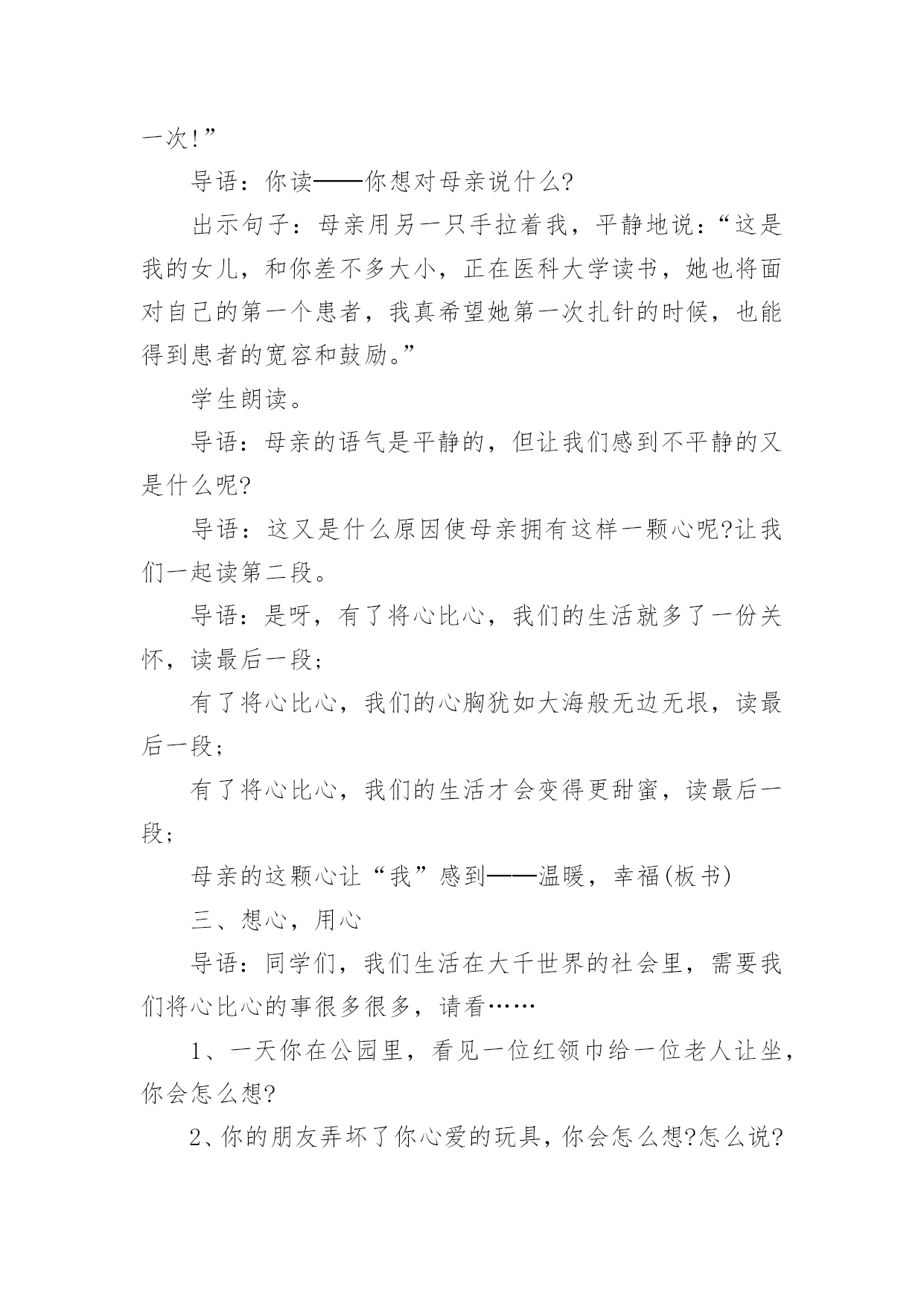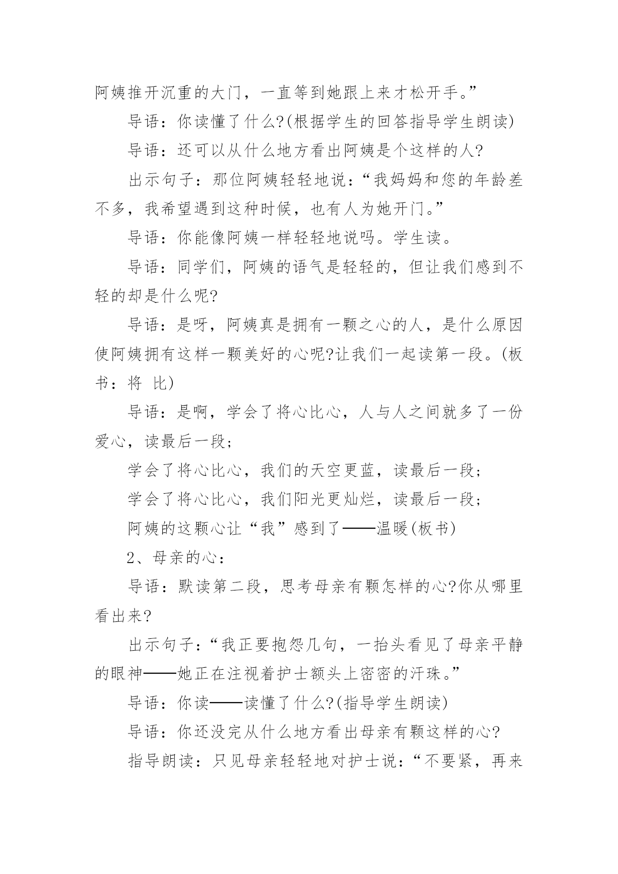 《将心比心》教学设计教案【教学目标】1、理解课文内容,体会生活中只有将心比心,才会使人与人之间多一些宽容和理解。2、正确、流利、有感情地朗读课文。【教学重、难点】引导学生懂得在生活中与人相处应将心比心。【教学课时】一课时。【教学过程】一、谈心、说心导入:同学们,方老师拿到课文已经读了20遍,始终被一个字深深感动了,想知道这是什么字吗?(板书),看到这个心,你想说什么?生说:是呀,心的含义很多很多,我们今天要学的这篇课文主要讲讲谁的心?一颗什么心?请同学们走进课文,自由读读。生说师板书:阿姨母亲二、读心、悟心1、阿姨的心:导语:阿姨有颗怎样的心,请同学们认真默读第一段,思考这个问题。根据学生回答板书。导语:你从什么地方可以算出阿姨有颗善良的心?出示句子:“有一次,奶奶去商店,走在她前面的一位阿姨推开沉重的大门,一直等到她跟上来才松开手。”导语:你读懂了什么?(根据学生的回答指导学生朗读)导语:还可以从什么地方看出阿姨是个这样的人?出示句子:那位阿姨轻轻地说:“我妈妈和您的年龄差不多,我希望遇到这种时候,也有人为她开门。”导语:你能像阿姨一样轻轻地说吗。学生读。导语:同学们,阿姨的语气是轻轻的,但让我们感到不轻的却是什么呢?导语:是呀,阿姨真是拥有一颗之心的人,是什么原因使阿姨拥有这样一颗美好的心呢?让我们一起读第一段。(板书:将比)导语:是啊,学会了将心比心,人与人之间就多了一份爱心,读最后一段;学会了将心比心,我们的天空更蓝,读最后一段;学会了将心比心,我们阳光更灿烂,读最后一段;阿姨的这颗心让“我”感到了──温暖(板书)2、母亲的心:导语:默读第二段,思考母亲有颗怎样的心?你从哪里看出来?出示句子:“我正要抱怨几句,一抬头看见了母亲平静的眼神──她正在注视着护士额头上密密的汗珠。”导语:你读──读懂了什么?(指导学生朗读)导语:你还没完从什么地方看出母亲有颗这样的心?指导朗读:只见母亲轻轻地对护士说:“不要紧,再来一次!”导语:你读──你想对母亲说什么?出示句子:母亲用另一只手拉着我,平静地说:“这是我的女儿,和你差不多大小,正在医科大学读书,她也将面对自己的第一个患者,我真希望她第一次扎针的时候,也能得到患者的宽容和鼓励。”学生朗读。导语:母亲的语气是平静的,但让我们感到不平静的又是什么呢?导语:这又是什么原因使母亲拥有这样一颗心呢?让我们一起读第二段。导语:是呀,有了将心比心,我们的生活就多了一份关怀,读最后一段;有了将心比心,我们的心胸犹如大海般无边无垠,读最后一段;有了将心比心,我们的生活才会变得更甜蜜,读最后一段;母亲的这颗心让“我”感到──温暖,幸福(板书)三、想心,用心导语:同学们,我们生活在大千世界的社会里,需要我们将心比心的事很多很多,请看……1、一天你在公园里,看见一位红领巾给一位老人让坐,你会怎么想?2、你的朋友弄坏了你心爱的玩具,你会怎么想?怎么说?3、有一次,你嘲笑你的同学成绩考得差,学了这篇课文你现在怎么想?如果是现在你又会对他怎么说?四、赞心,颂心导语:课文尝到这里,老师觉得人与人之间学会将心比心是多么重要啊,读最后一段。出示句子:将心比心,我们的生活多了一份爱心,将心比心,我们的心情将变为如同桃李般甜蜜,将心比心,我们的心胸将会犹如大海般无边无垠,将心比心,我们的友谊天长地久,总之,如果人人都能将心比心,心灵会更美好,人生将更丰富,世界将更加美丽!学生朗读感受。五、课外延伸不久的将来,也就是这个小护士,成了医院里工作最出色的护士,成了病患者最受欢迎的护士。一天一家电视台要对她进行专门采访,请你替她设计一份讲稿,说说她的心里话。