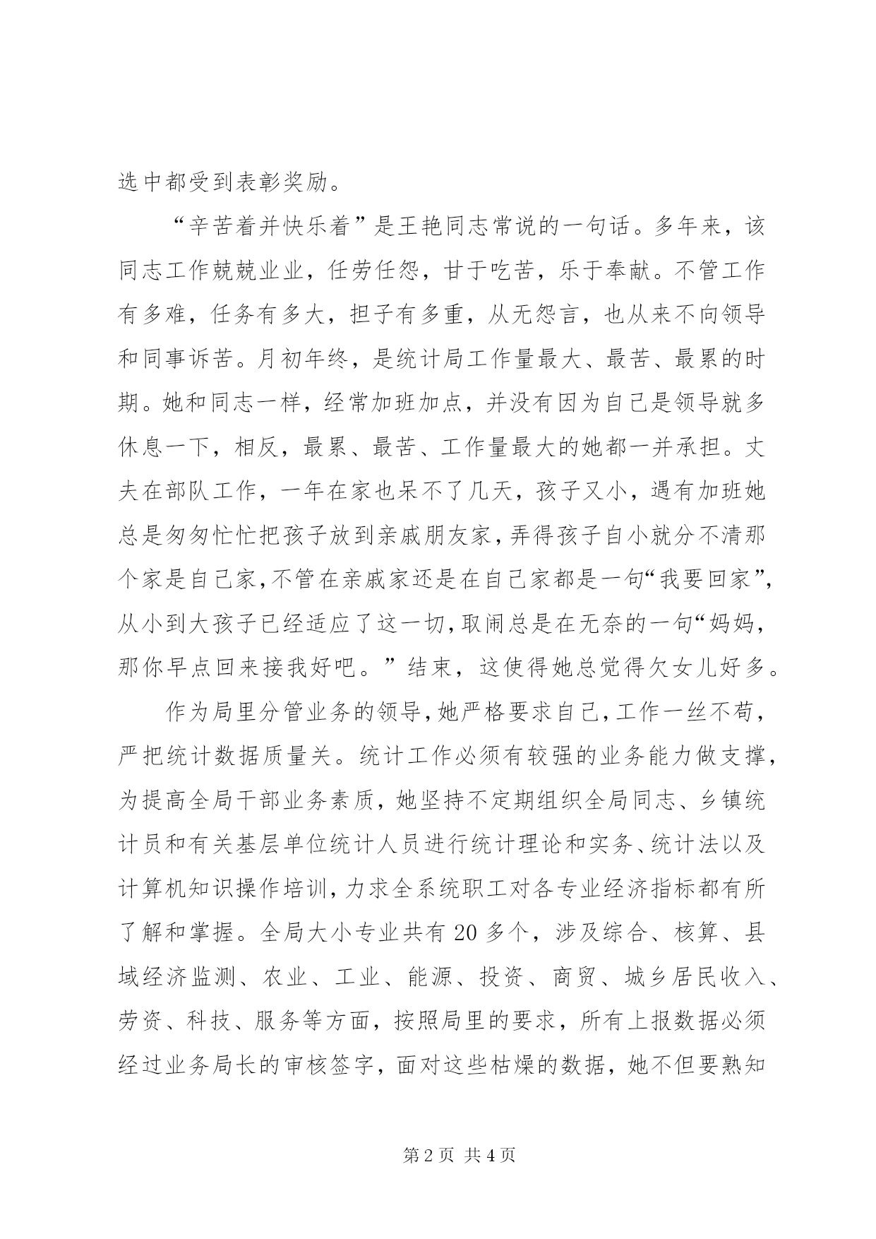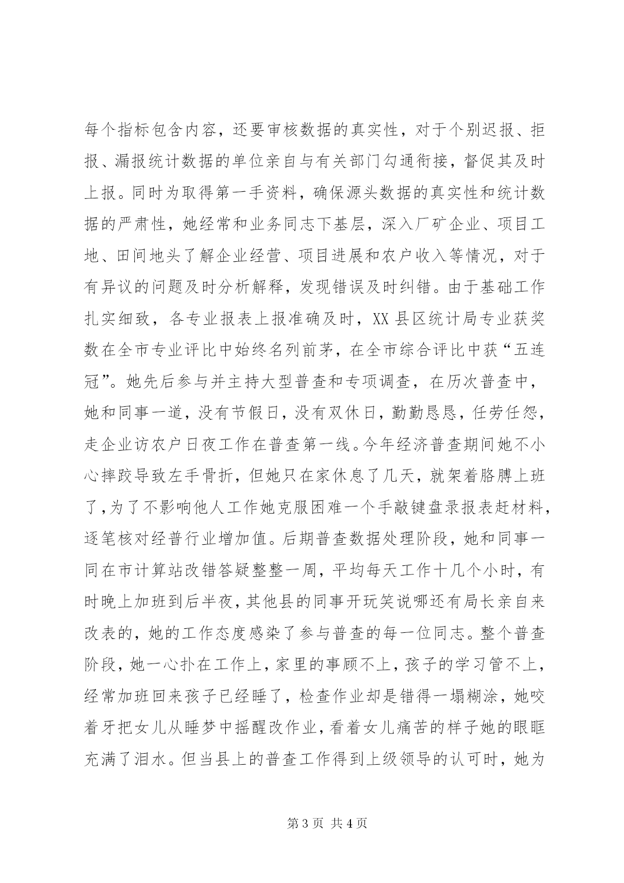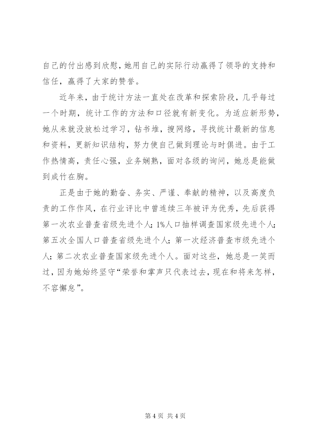 第PAGE\*Arabic\*MERGEFORMAT4页共NUMPAGES\*MERGEFORMAT4页优秀公务员先进材料12篇女,汉族,中共党员,XX县区柳枝人。年出生,年参加工作,年入党,现任XX县区统计局副局长,主管业务工作。自参加工作以来,一直坚守在统计工作的第一线。先后从事过商贸、核算、综合等多项业务工作,在平凡而枯燥的统计工作岗位上,凭着个人强烈的事业心和责任感,刻苦钻研,好学上进,练就了过硬的统计业务能力和扎实细致的工作作风,是全市统计系统公认的业务尖子。坚持不懈抓学习,促思想业务双提高。该同志能始终认真学习党的理论知识,坚持用邓小平理论和“三个代表”重要思想武装头脑、指导工作,全面贯彻落实科学发展观,时刻以共产党员的标准严格要求自已,立场坚定,旗帜鲜明,在政治上、思想上、行动上始终与党中央保持高度一致,牢记宗旨、克己奉公。自工作以来能够坚持不懈抓学习,统计工作专业性非常强,不但要熟知县情,更要具备较强的专业理论功底,为了更好的做好本职工作,该同志平时注重业务知识学习,积极研读统计理论和实务。在工作初期,或请教其他专业老同志,或走访基层询实情,上班不长时间就先后取得了统计专业初级和中级职称,成为统计系统公认的业务骨干。为了更好地为领导决策当好参谋,提供更为优质的统计服务,坚持每年深入企业、农户搞调研,撰写了大量的统计分析,受到县级领导好评,几乎每年在全市优秀统计分析评选中都受到表彰奖励。“辛苦着并快乐着”是王艳同志常说的一句话。多年来,该同志工作兢兢业业,任劳任怨,甘于吃苦,乐于奉献。不管工作有多难,任务有多大,担子有多重,从无怨言,也从来不向领导和同事诉苦。月初年终,是统计局工作量最大、最苦、最累的时期。她和同志一样,经常加班加点,并没有因为自己是领导就多休息一下,相反,最累、最苦、工作量最大的她都一并承担。丈夫在部队工作,一年在家也呆不了几天,孩子又小,遇有加班她总是匆匆忙忙把孩子放到亲戚朋友家,弄得孩子自小就分不清那个家是自己家,不管在亲戚家还是在自己家都是一句“我要回家”,从小到大孩子已经适应了这一切,取闹总是在无奈的一句“妈妈,那你早点回来接我好吧。”结束,这使得她总觉得欠女儿好多。作为局里分管业务的领导,她严格要求自己,工作一丝不苟,严把统计数据质量关。统计工作必须有较强的业务能力做支撑,为提高全局干部业务素质,她坚持不定期组织全局同志、乡镇统计员和有关基层单位统计人员进行统计理论和实务、统计法以及计算机知识操作培训,力求全系统职工对各专业经济指标都有所了解和掌握。全局大小专业共有20多个,涉及综合、核算、县域经济监测、农业、工业、能源、投资、商贸、城乡居民收入、劳资、科技、服务等方面,按照局里的要求,所有上报数据必须经过业务局长的审核签字,面对这些枯燥的数据,她不但要熟知每个指标包含内容,还要审核数据的真实性,对于个别迟报、拒报、漏报统计数据的单位亲自与有关部门勾通衔接,督促其及时上报。同时为取得第一手资料,确保源头数据的真实性和统计数据的严肃性,她经常和业务同志下基层,深入厂矿企业、项目工地、田间地头了解企业经营、项目进展和农户收入等情况,对于有异议的问题及时分析解释,发现错误及时纠错。由于基础工作扎实细致,各专业报表上报准确及时,XX县区统计局专业获奖数在全市专业评比中始终名列前茅,在全市综合评比中获“五连冠”。她先后参与并主持大型普查和专项调查,在历次普查中,她和同事一道,没有节假日,没有双休日,勤勤恳恳,任劳任怨,走企业访农户日夜工作在普查第一线。今年经济普查期间她不小心摔跤导致左手骨折,但她只在家休息了几天,就架着胳膊上班了,为了不影响他人工作她克服困难一个手敲键盘录报表赶材料,逐笔核对经普行业增加值。后期普查数据处理阶段,她和同事一同在市计算站改错答疑整整一周,平均每天工作十几个小时,有时晚上加班到后半夜,其他县的同事开玩笑说哪还有局长亲自来改表的,她的工作态度感染了参与普查的每一位同志。整个普查阶段,她一心扑在工作上,家里的事顾不上,孩子的学习管不上,经常加班回来孩子已经睡了,检查作业却是错得一塌糊涂,她咬着牙把女儿从睡梦中摇醒改作业,看着女儿痛苦的样子她的眼眶充满了泪水。但当县上的普查工作得到上级领导的认可时,她为自己的付出感到欣慰,她用自己的实际行动赢得了领导的支持和信任,赢得了大家的赞誉。近年来,由于统计方法一直处在改革和探索阶段,几乎每过一个时期,统计工作的方法和口径就有新变化。为适应新形势,她从来就没放松过学习,钻书堆,搜网络,寻找统计最新的信息和资料,更新知识结构,努力使自己做到理论与时俱进。由于工作热情高,责任心强,业务娴熟,面对各级的询问,她总是能做到成竹在胸。正是由于她的勤奋、务实、严谨、奉献的精神,以及高度负责的工作作风,在行业评比中曾连续