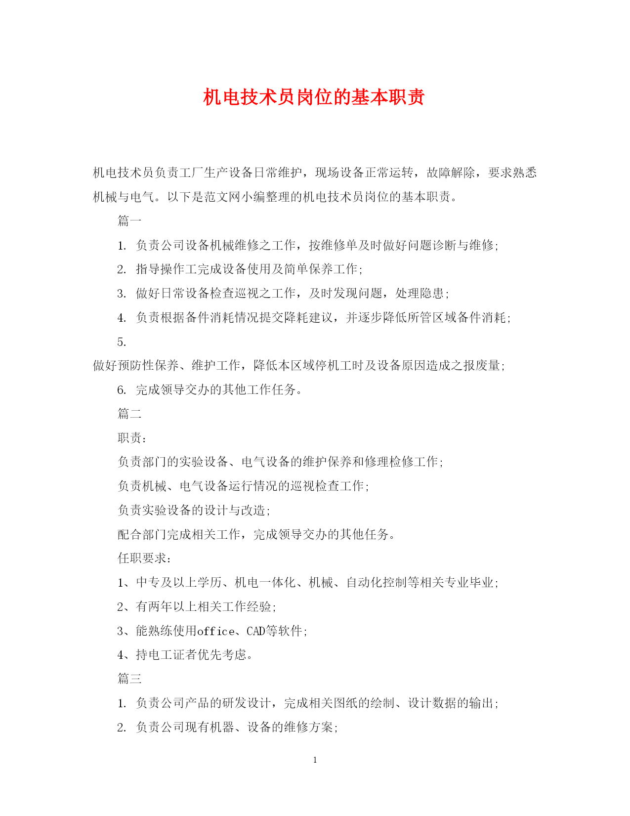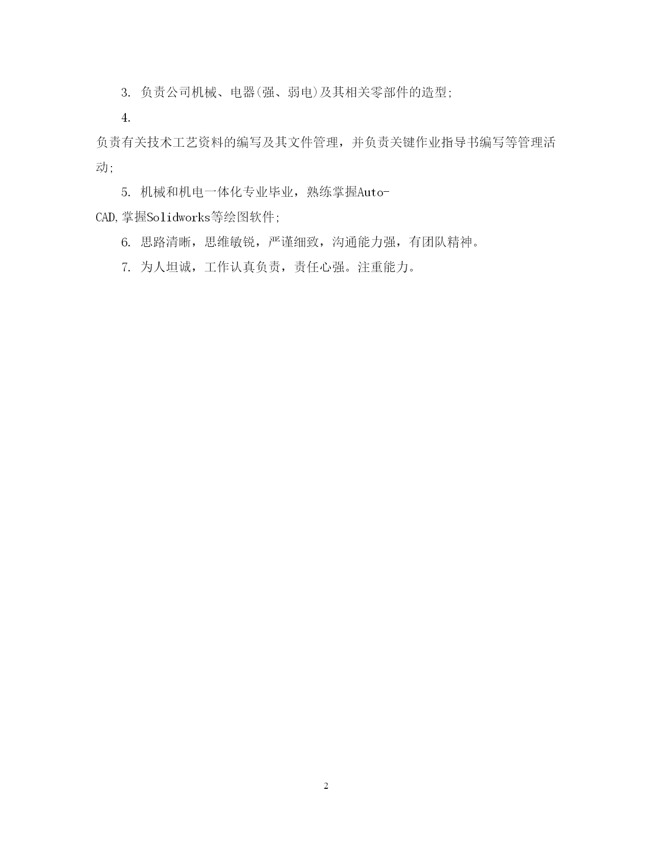 此资料由网络收集而来,如有侵权请告知上传者立即删除。资料共分享,我们负责传递知识。PAGEPAGE2机电技术员岗位的基本职责机电技术员负责工厂生产设备日常维护,现场设备正常运转,故障解除,要求熟悉机械与电气。以下是范文网小编整理的机电技术员岗位的基本职责。篇一1.负责公司设备机械维修之工作,按维修单及时做好问题诊断与维修;2.指导操作工完成设备使用及简单保养工作;3.做好日常设备检查巡视之工作,及时发现问题,处理隐患;4.负责根据备件消耗情况提交降耗建议,并逐步降低所管区域备件消耗;5.做好预防性保养、维护工作,降低本区域停机工时及设备原因造成之报废量;6.完成领导交办的其他工作任务。篇二职责:负责部门的实验设备、电气设备的维护保养和修理检修工作;负责机械、电气设备运行情况的巡视检查工作;负责实验设备的设计与改造;配合部门完成相关工作,完成领导交办的其他任务。任职要求:1、中专及以上学历、机电一体化、机械、自动化控制等相关专业毕业;2、有两年以上相关工作经验;3、能熟练使用office、CAD等软件;4、持电工证者优先考虑。篇三1.负责公司产品的研发设计,完成相关图纸的绘制、设计数据的输出;2.负责公司现有机器、设备的维修方案;3.负责公司机械、电器(强、弱电)及其相关零部件的造型;4.负责有关技术工艺资料的编写及其文件管理,并负责关键作业指导书编写等管理活动;5.机械和机电一体化专业毕业,熟练掌握Auto-CAD,掌握Solidworks等绘图软件;6.思路清晰,思维敏锐,严谨细致,沟通能力强,有团队精神。7.为人坦诚,工作认真负责,责任心强。注重能力。