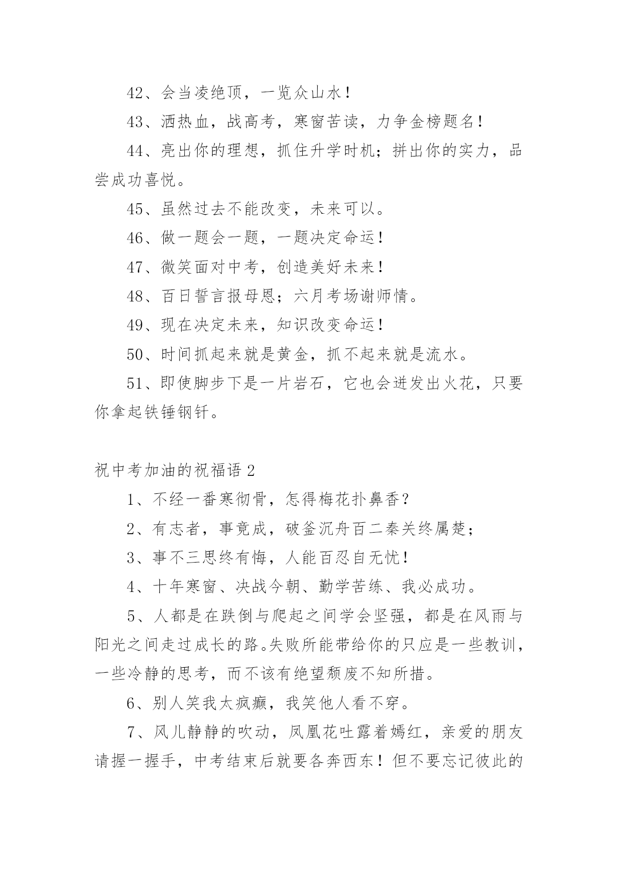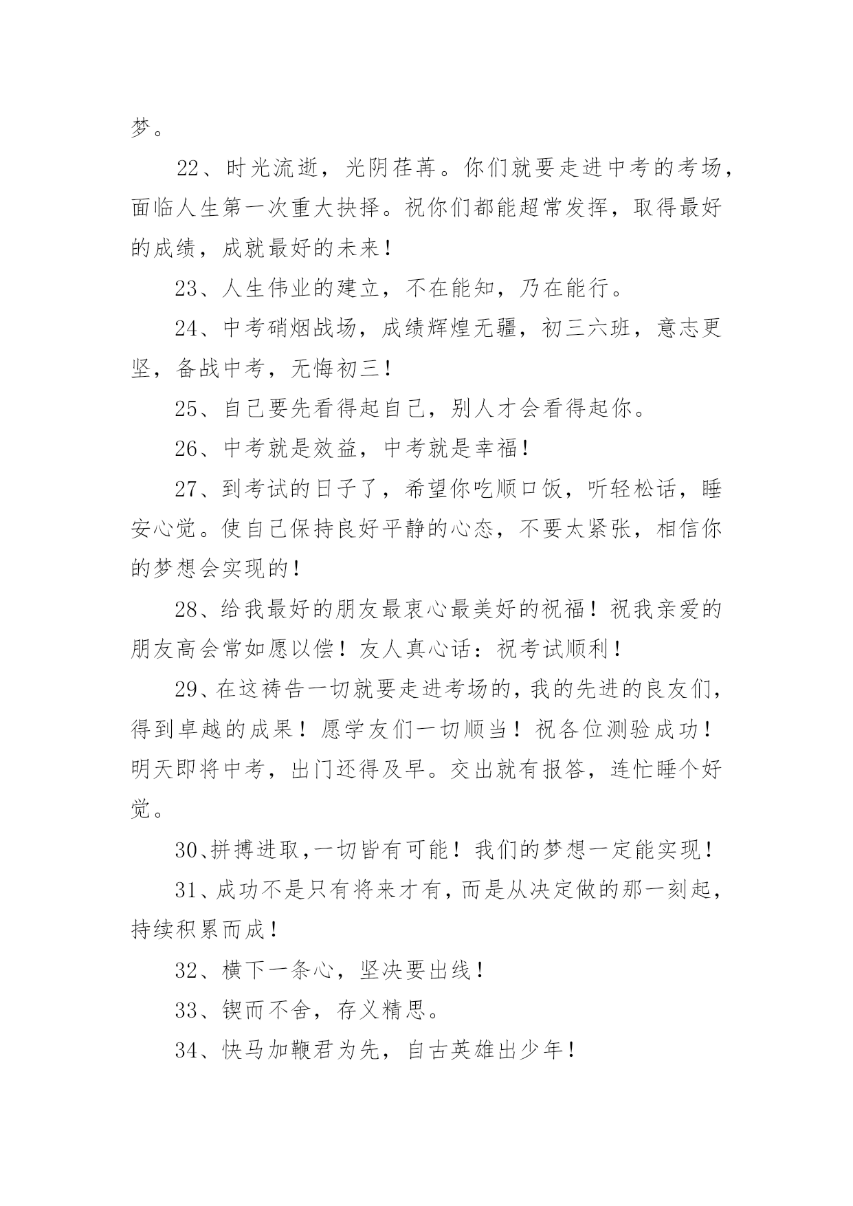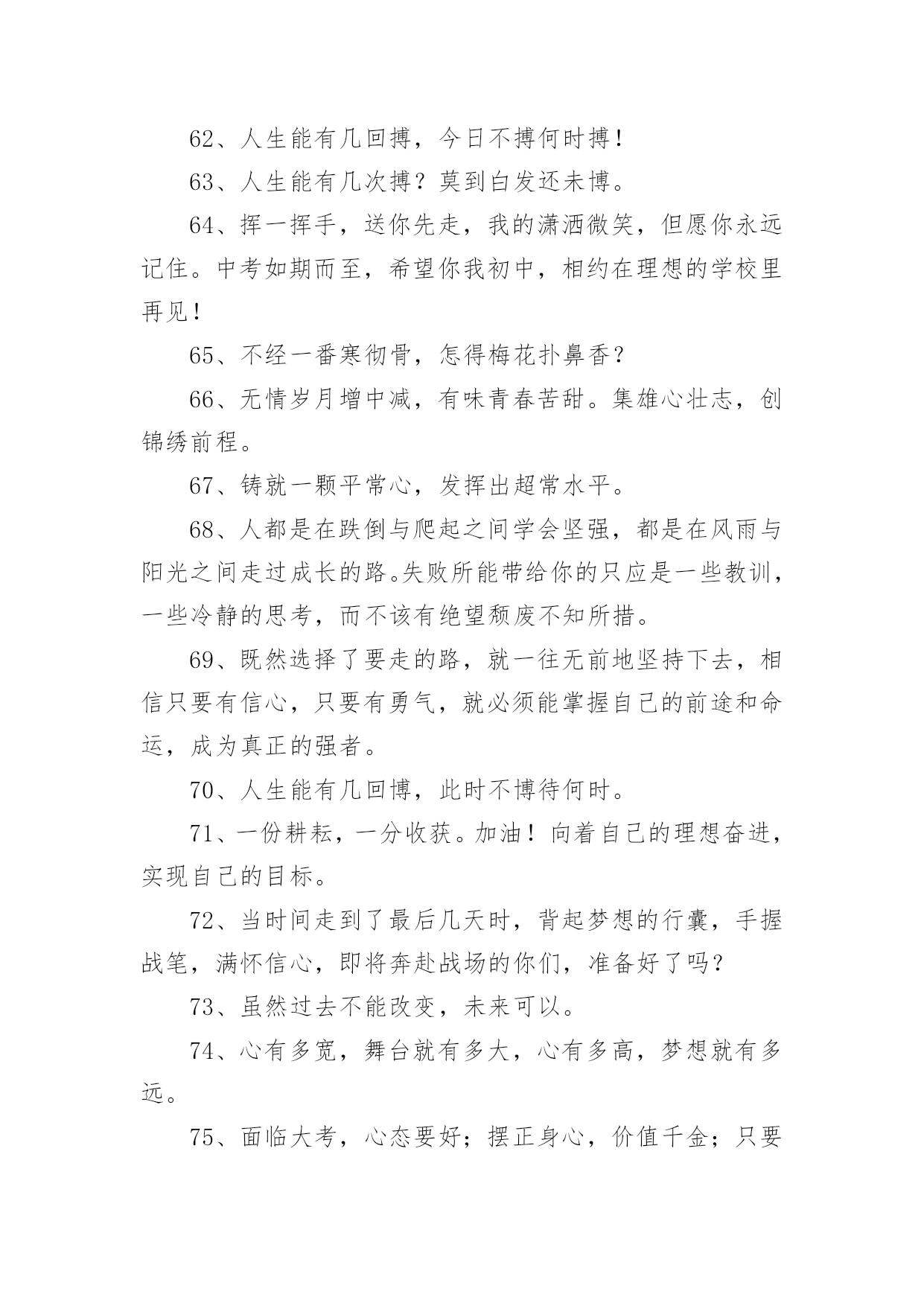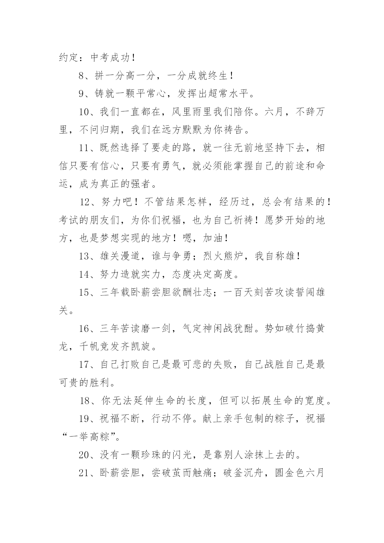 祝中考加油的祝福语在日常学习、工作或生活中,要用到祝福语的地方还是很多的,祝福语能给亲朋好带去好运和欢乐。那什么样的祝福语才算得上是好的祝福语呢?下面是小编精心整理的祝中考加油的祝福语,希望能够帮助到大家。祝中考加油的祝福语11、十年寒窗,决战今朝,勤学苦练,我必成功。2、把握现在,就是创造未来!3、放飞你的心灵,播撒你的希望!4、超越自己,向自己挑战,向弱项挑战,向懒惰挑战,向陋习挑战。5、站在新起点,迎接新挑战,创造新成绩。6、相互支持,共同奋斗:相信自己,直到成功那一刻,笑看风云!7、捷报频传进家门,理科状元数你能。各大院校都临门,报考志愿费人心。心中理想要坚定,不选名气选兴趣。愿你今后宏图展,志向远大梦想成!8、天下大事,必作于细;天下难事,必作于易!9、每个人都可以给自己快乐,纵然他是乞丐;每个人都能使自己痛苦,即便他是国王。10、人生能有几回搏,今日不搏何时搏!11、浪花,从不伴随躲在避风港的小表演,而始终追赶着拼搏向前的巨轮。12、无才无以立足,不苦不能成才!13、快马加鞭君为先,自古英雄出少年!14、模拟的成绩一定不要成为包袱,成为阴影。15、拥有知识改变命运,拥有理想改变态度。16、寒窗苦读十几载,只为今日露锋芒。中考场上不慌张,从容答题心顺畅。才思敏捷审题准,难题下手也不挡。金榜题名在今朝,父母亲朋赞声扬。祝你中考取得好成绩!17、争取时间就是争取成功,提高效率就是提高分数。18、有来路,没退路;留退路,是绝路!19、扛得住给我扛,扛不住给我死扛。20、这么天都坚持下来了,只剩下最后的两个星期了,继续加油,相信你一定会成功的,顺利考入理想,胜利永远属于你!21、时光如梭看我少年学子六月追风去,云帆直挂令那美丽人生明朝入眼来。22、不耍小聪明,不作弊应当是我们学习的原则,也应当是我们做人的原则。23、努力拼搏,奋勇向上;为自己扬帆,为明天喝彩。24、宁可战死,不可吓死。今朝不搏,更待何时?25、没有什么事情有象热忱这般具有传染性,它能感动顽石,它是真诚的精髓。26、目标明确,积极向上;勤学苦练,斗志向上。27、人都是在跌倒与爬起之间学会坚强,都是在风雨与阳光之间走过成长的路。失败所能带给你的只应是一些教训,一些冷静的思考,而不该有绝望颓废不知所措。28、脚踏实地沉着备战,相信自己相信未来。29、每天都是一个起点,每天都有一点进步,每天都有一点收获!30、珍惜机遇,挑战自我,战胜自我;遵规守纪,沉着冷静,力创佳绩。31、为理想,早起三更,读迎晨曦!为目标,晚卧夜半,全力以赴!32、决战中考,改变命运!屡挫屡战,笑傲群雄!33、鲤鱼不跃,岂可成龙?大鹏驻足,焉能腾空?34、中考就是效益,中考就是幸福!35、人生能有几次搏?莫到白发还未博。36、今年我誓要把中考踩在脚低下!37、人生能有几回搏?现在不搏更待何时?珍惜机遇吧,让金色的年华碰撞出更加灿烂的火花!38、一心读遍圣贤书,三心二意无益处,四书五经励我志;五洲四海任我游,三堂二课皆用功,一生前程始于此。39、到了,到了,中考就在眼前了;快了,快了,梦想就快实现了;微笑,微笑,把美好明天拥抱。40、挑战人生是我无悔的.选择,决胜中考是我不懈的追求!41、书山有路勤为径,学海无涯苦作舟;海到无边天作岸,山登绝顶我为峰。42、会当凌绝顶,一览众山水!43、洒热血,战高考,寒窗苦读,力争金榜题名!44、亮出你的理想,抓住升学时机;拼出你的实力,品尝成功喜悦。45、虽然过去不能改变,未来可以。46、做一题会一题,一题决定命运!47、微笑面对中考,创造美好未来!48、百日誓言报母恩;六月考场谢师情。49、现在决定未来,知识改变命运!50、时间抓起来就是黄金,抓不起来就是流水。51、即使脚步下是一片岩石,它也会迸发出火花,只要你拿起铁锤钢钎。祝中考加油的祝福语21、不经一番寒彻骨,怎得梅花扑鼻香?2、有志者,事竟成,破釜沉舟百二秦关终属楚;3、事不三思终有悔,人能百忍自无忧!4、十年寒窗、决战今朝、勤学苦练、我必成功。5、人都是在跌倒与爬起之间学会坚强,都是在风雨与阳光之间走过成长的路。失败所能带给你的只应是一些教训,一些冷静的思考,而不该有绝望颓废不知所措。6、别人笑我太疯癫,我笑他人看不穿。7、风儿静静的吹动,凤凰花吐露着嫣红,亲爱的朋友请握一握手,中考结束后就要各奔西东!但不要忘记彼此的约定:中考成功!8、拼一分高一分,一分成就终生!9、铸就一颗平常心,发挥出超常水平。10、我们一直都在,风里雨里我们陪你。六月,不辞万里,不问归期,我们在远方默默为你祷告。11、既然选择了要走的路,就一往无前地坚持下去,相信只要有信心,只要有勇气,就必须能掌握自己的前途和命运,成为真正的强者。12、努力吧!不管结果怎样,经历过,总会有结果的!考试的朋友们,为你们祝福,也为自己祈祷!