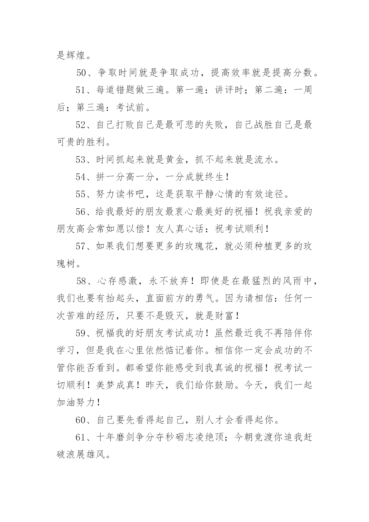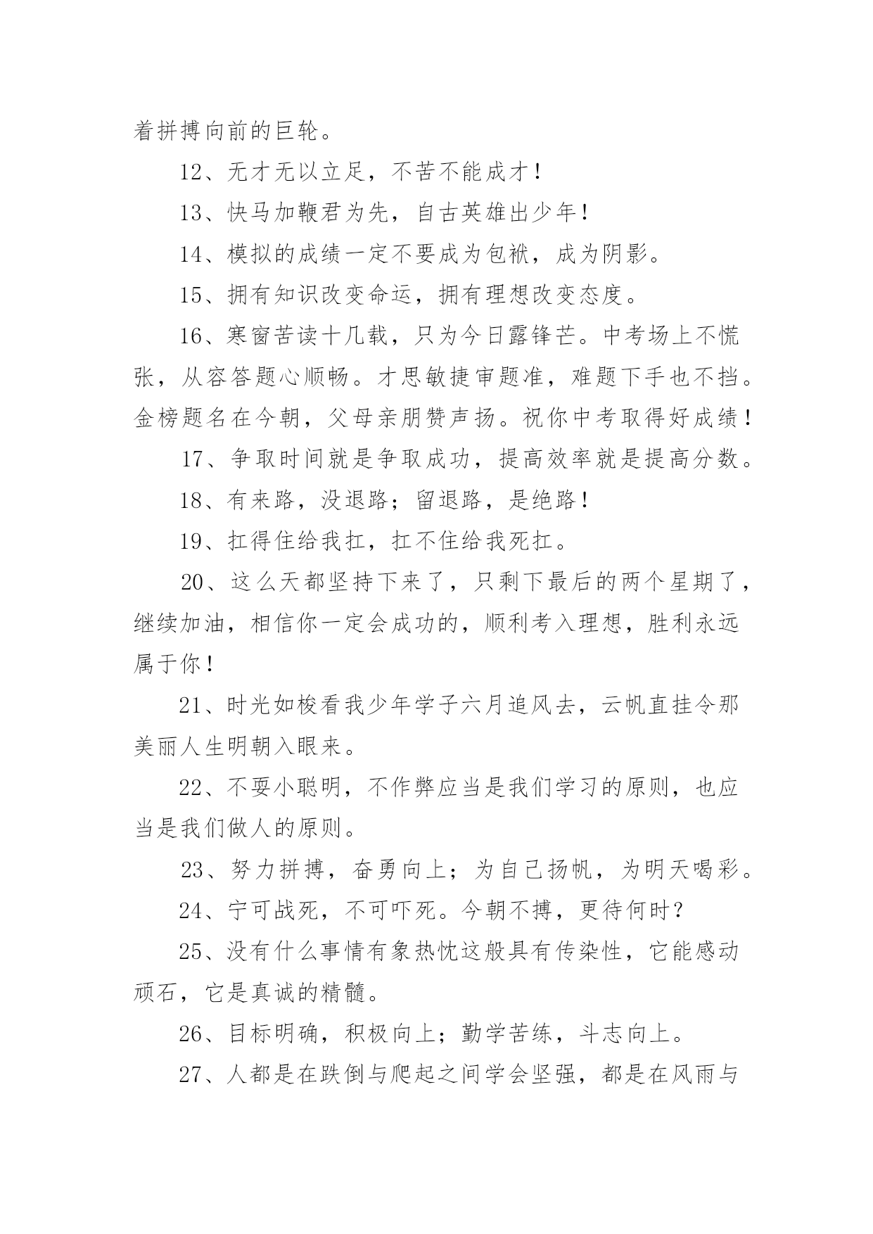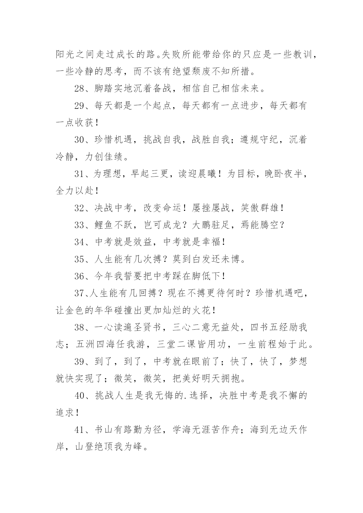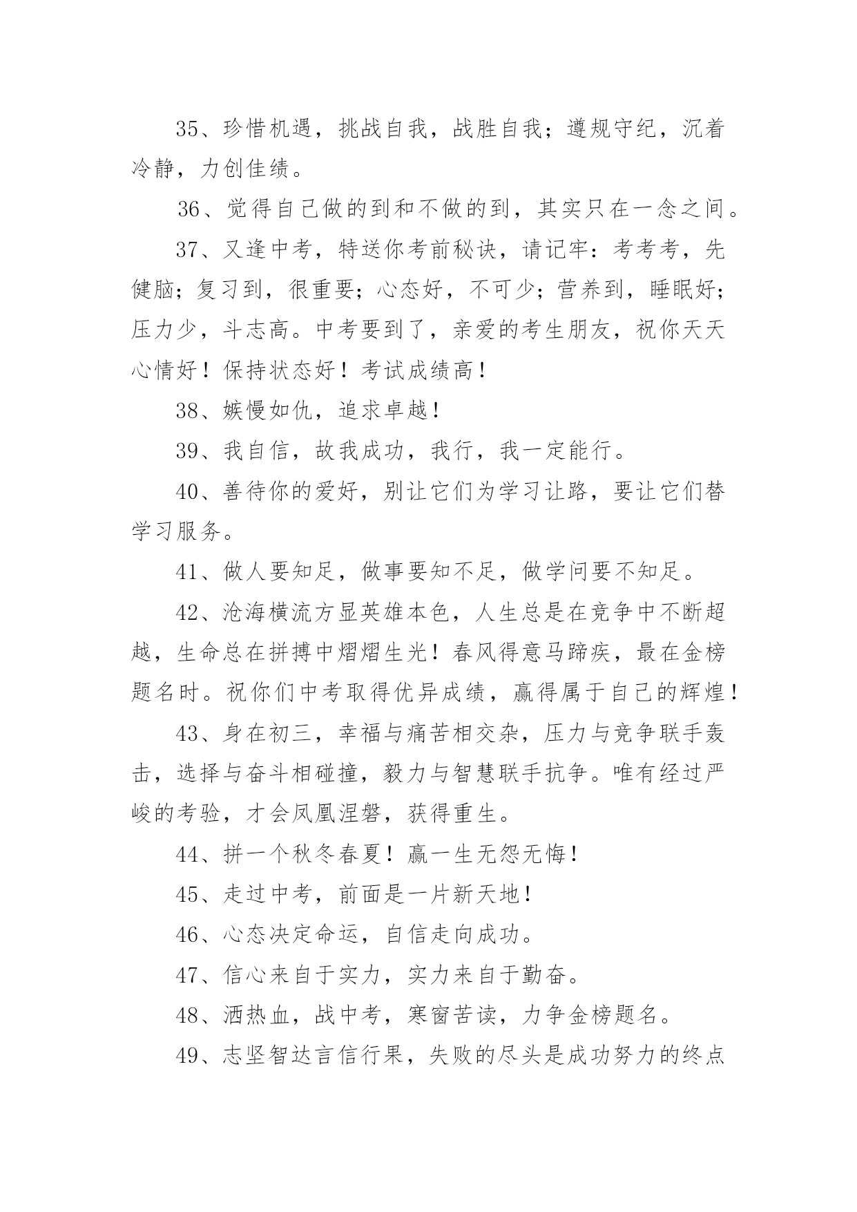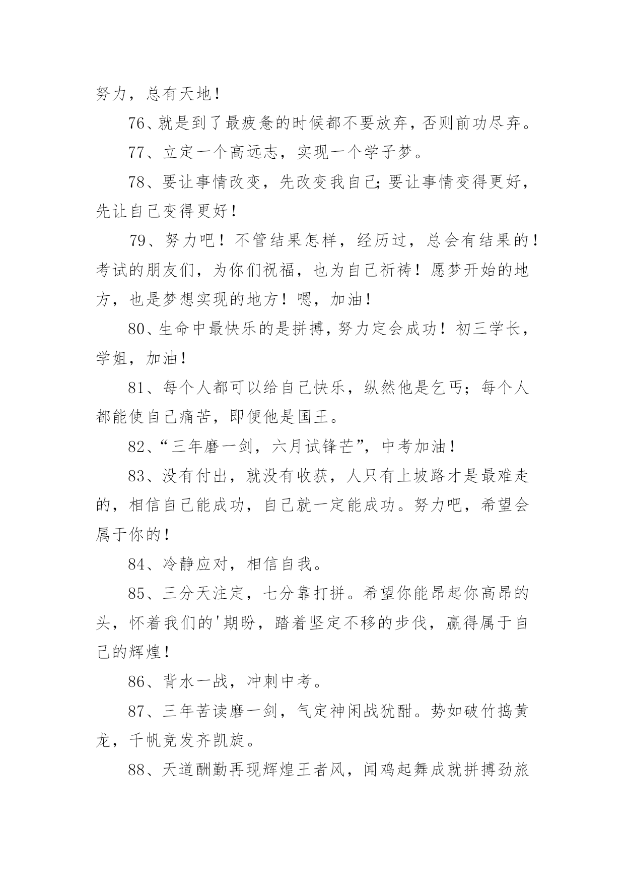 祝中考加油的祝福语在日常学习、工作或生活中,要用到祝福语的地方还是很多的,祝福语能给亲朋好带去好运和欢乐。那什么样的祝福语才算得上是好的祝福语呢?下面是小编精心整理的祝中考加油的祝福语,希望能够帮助到大家。祝中考加油的祝福语11、十年寒窗,决战今朝,勤学苦练,我必成功。2、把握现在,就是创造未来!3、放飞你的心灵,播撒你的希望!4、超越自己,向自己挑战,向弱项挑战,向懒惰挑战,向陋习挑战。5、站在新起点,迎接新挑战,创造新成绩。6、相互支持,共同奋斗:相信自己,直到成功那一刻,笑看风云!7、捷报频传进家门,理科状元数你能。各大院校都临门,报考志愿费人心。心中理想要坚定,不选名气选兴趣。愿你今后宏图展,志向远大梦想成!8、天下大事,必作于细;天下难事,必作于易!9、每个人都可以给自己快乐,纵然他是乞丐;每个人都能使自己痛苦,即便他是国王。10、人生能有几回搏,今日不搏何时搏!11、浪花,从不伴随躲在避风港的小表演,而始终追赶着拼搏向前的巨轮。12、无才无以立足,不苦不能成才!13、快马加鞭君为先,自古英雄出少年!14、模拟的成绩一定不要成为包袱,成为阴影。15、拥有知识改变命运,拥有理想改变态度。16、寒窗苦读十几载,只为今日露锋芒。中考场上不慌张,从容答题心顺畅。才思敏捷审题准,难题下手也不挡。金榜题名在今朝,父母亲朋赞声扬。祝你中考取得好成绩!17、争取时间就是争取成功,提高效率就是提高分数。18、有来路,没退路;留退路,是绝路!19、扛得住给我扛,扛不住给我死扛。20、这么天都坚持下来了,只剩下最后的两个星期了,继续加油,相信你一定会成功的,顺利考入理想,胜利永远属于你!21、时光如梭看我少年学子六月追风去,云帆直挂令那美丽人生明朝入眼来。22、不耍小聪明,不作弊应当是我们学习的原则,也应当是我们做人的原则。23、努力拼搏,奋勇向上;为自己扬帆,为明天喝彩。24、宁可战死,不可吓死。今朝不搏,更待何时?25、没有什么事情有象热忱这般具有传染性,它能感动顽石,它是真诚的精髓。26、目标明确,积极向上;勤学苦练,斗志向上。27、人都是在跌倒与爬起之间学会坚强,都是在风雨与阳光之间走过成长的路。失败所能带给你的只应是一些教训,一些冷静的思考,而不该有绝望颓废不知所措。28、脚踏实地沉着备战,相信自己相信未来。29、每天都是一个起点,每天都有一点进步,每天都有一点收获!30、珍惜机遇,挑战自我,战胜自我;遵规守纪,沉着冷静,力创佳绩。31、为理想,早起三更,读迎晨曦!为目标,晚卧夜半,全力以赴!32、决战中考,改变命运!屡挫屡战,笑傲群雄!33、鲤鱼不跃,岂可成龙?大鹏驻足,焉能腾空?34、中考就是效益,中考就是幸福!35、人生能有几次搏?莫到白发还未博。36、今年我誓要把中考踩在脚低下!37、人生能有几回搏?现在不搏更待何时?珍惜机遇吧,让金色的年华碰撞出更加灿烂的火花!38、一心读遍圣贤书,三心二意无益处,四书五经励我志;五洲四海任我游,三堂二课皆用功,一生前程始于此。39、到了,到了,中考就在眼前了;快了,快了,梦想就快实现了;微笑,微笑,把美好明天拥抱。40、挑战人生是我无悔的.选择,决胜中考是我不懈的追求!41、书山有路勤为径,学海无涯苦作舟;海到无边天作岸,山登绝顶我为峰。42、会当凌绝顶,一览众山水!43、洒热血,战高考,寒窗苦读,力争金榜题名!44、亮出你的理想,抓住升学时机;拼出你的实力,品尝成功喜悦。45、虽然过去不能改变,未来可以。46、做一题会一题,一题决定命运!47、微笑面对中考,创造美好未来!48、百日誓言报母恩;六月考场谢师情。49、现在决定未来,知识改变命运!50、时间抓起来就是黄金,抓不起来就是流水。51、即使脚步下是一片岩石,它也会迸发出火花,只要你拿起铁锤钢钎。祝中考加油的祝福语21、不经一番寒彻骨,怎得梅花扑鼻香?2、有志者,事竟成,破釜沉舟百二秦关终属楚;3、事不三思终有悔,人能百忍自无忧!4、十年寒窗、决战今朝、勤学苦练、我必成功。5、人都是在跌倒与爬起之间学会坚强,都是在风雨与阳光之间走过成长的路。失败所能带给你的只应是一些教训,一些冷静的思考,而不该有绝望颓废不知所措。6、别人笑我太疯癫,我笑他人看不穿。7、风儿静静的吹动,凤凰花吐露着嫣红,亲爱的朋友请握一握手,中考结束后就要各奔西东!但不要忘记彼此的约定:中考成功!8、拼一分高一分,一分成就终生!9、铸就一颗平常心,发挥出超常水平。10、我们一直都在,风里雨里我们陪你。六月,不辞万里,不问归期,我们在远方默默为你祷告。11、既然选择了要走的路,就一往无前地坚持下去,相信只要有信心,只要有勇气,就必须能掌握自己的前途和命运,成为真正的强者。12、努力吧!不管结果怎样,经历过,总会有结果的!考试的朋友们,为你们祝福,也为自己祈祷!