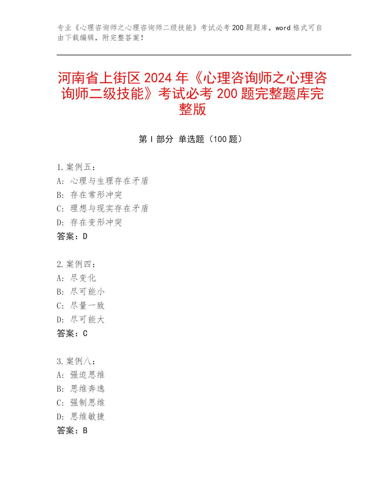 河南省上街区2023-2024年《心理咨询师之心理咨询师二级技能》考试必考200题题库及答案(易错题)