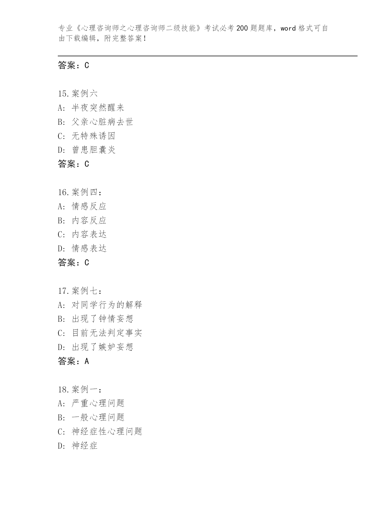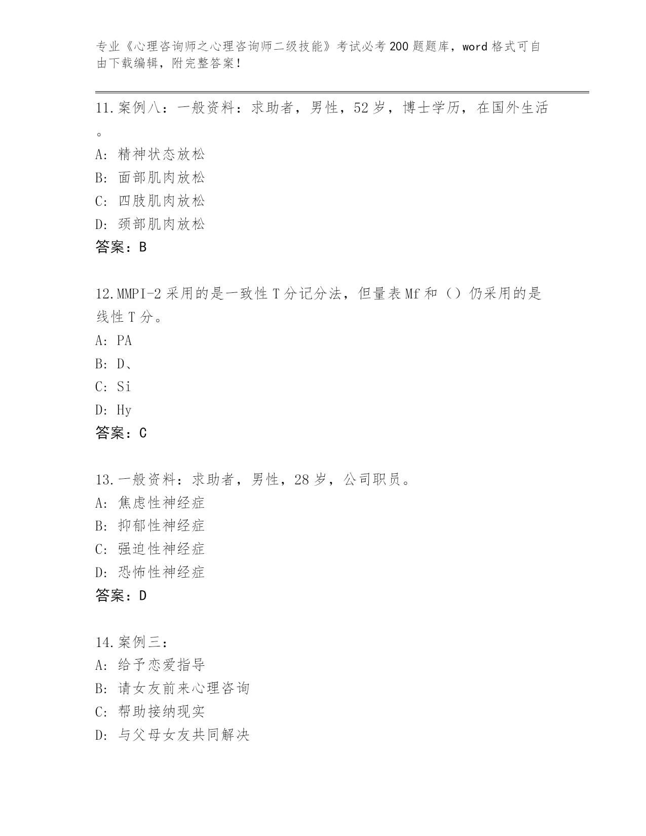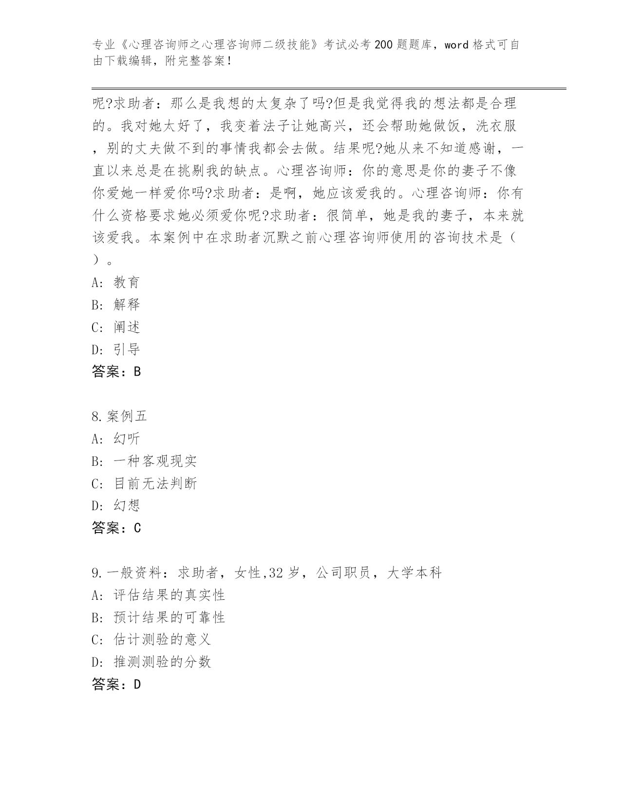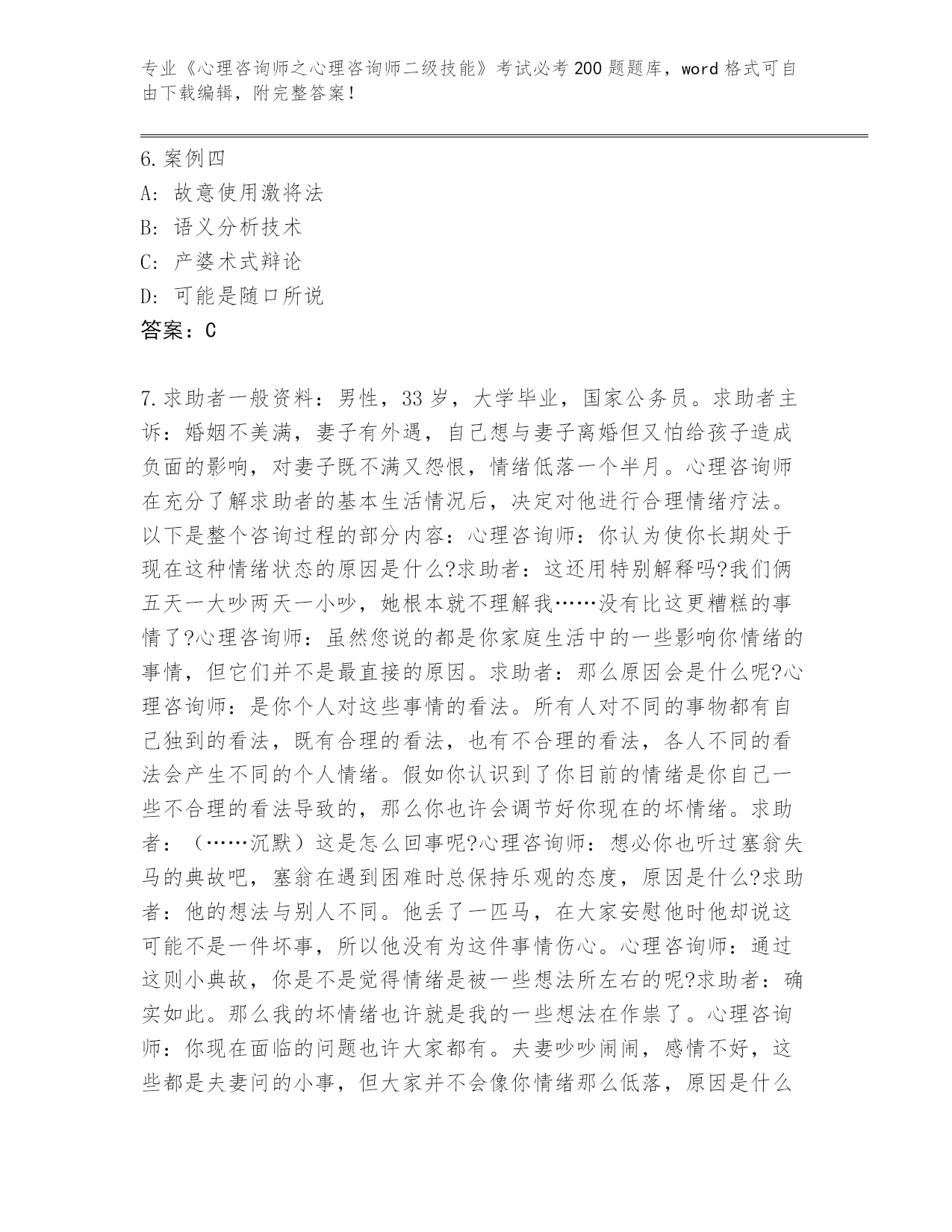 河南省完整版《心理咨询师之心理咨询师二级技能》考试必考200题完整版(夺冠)