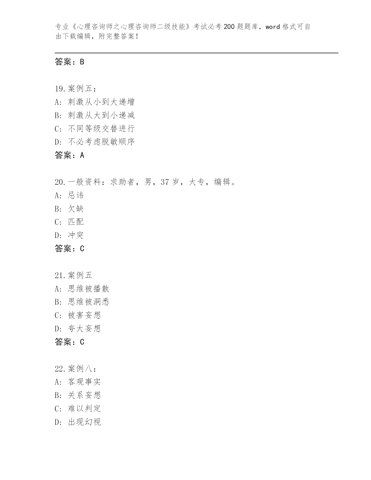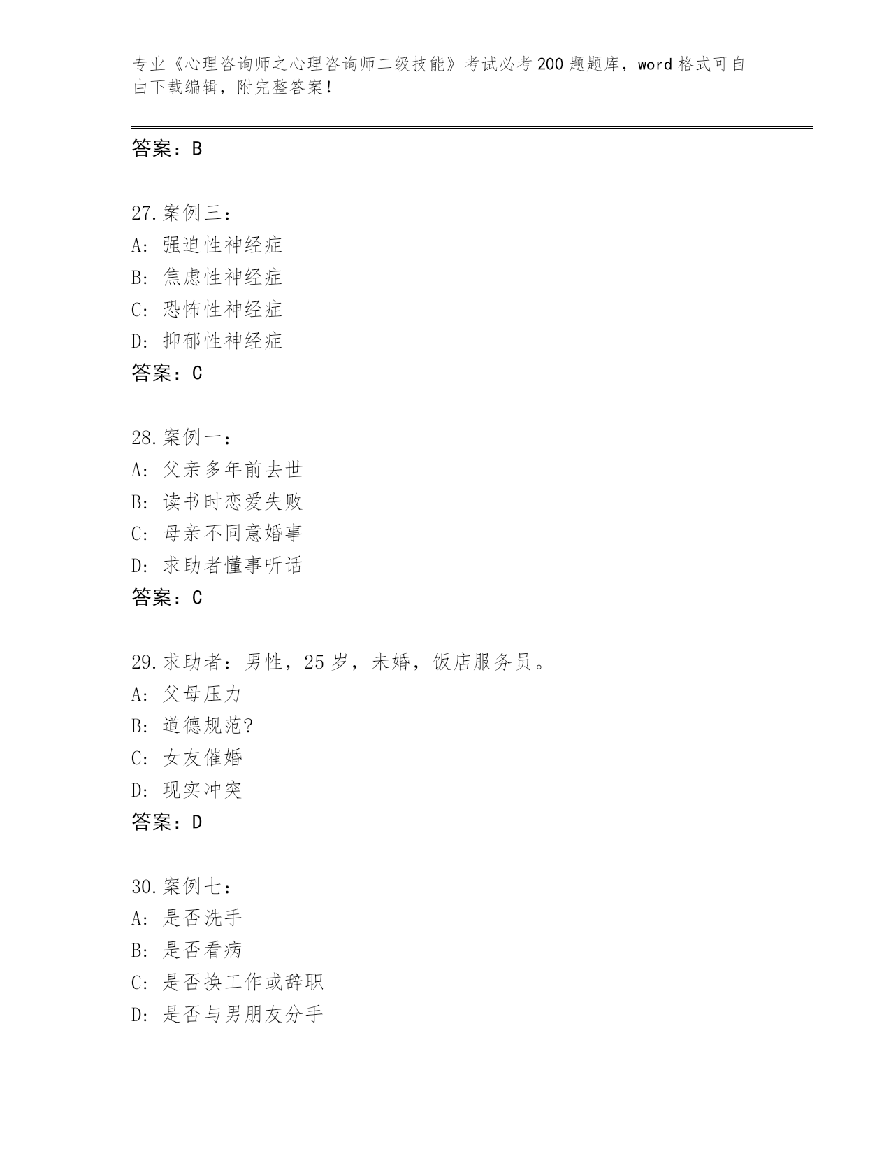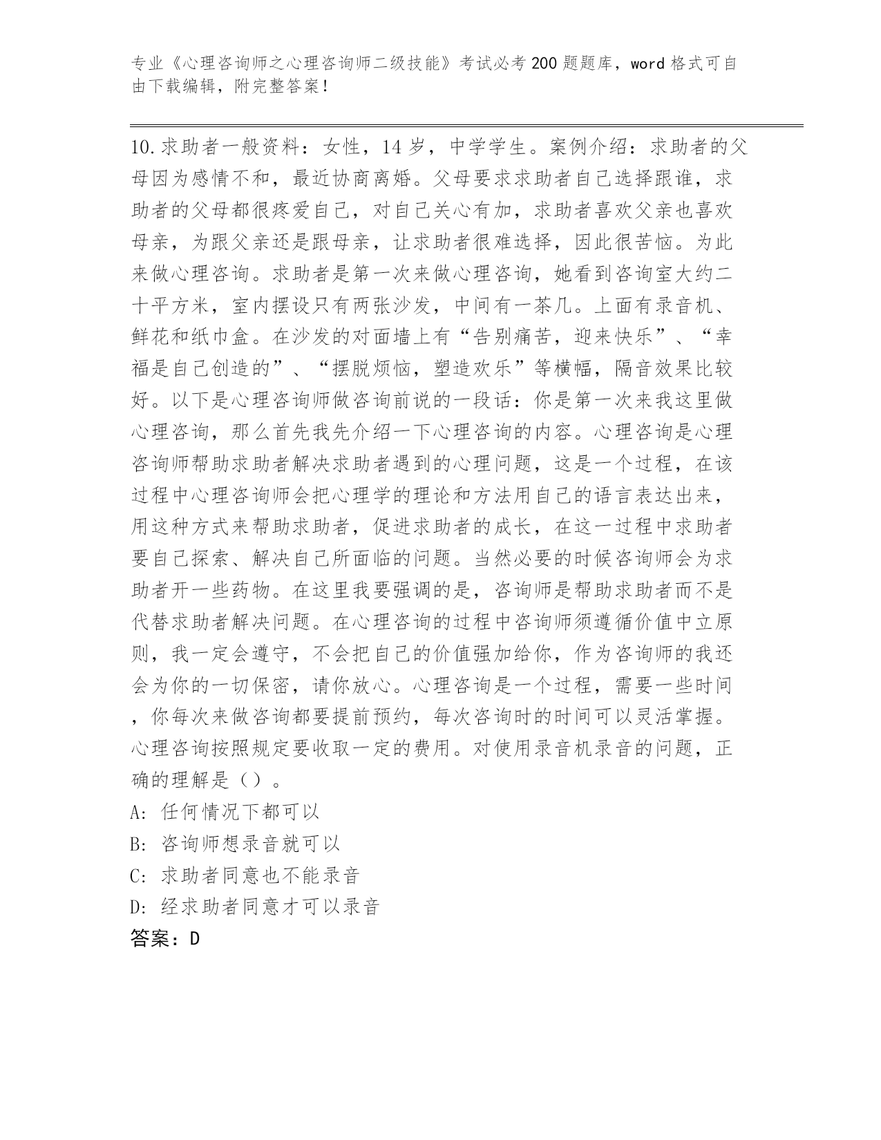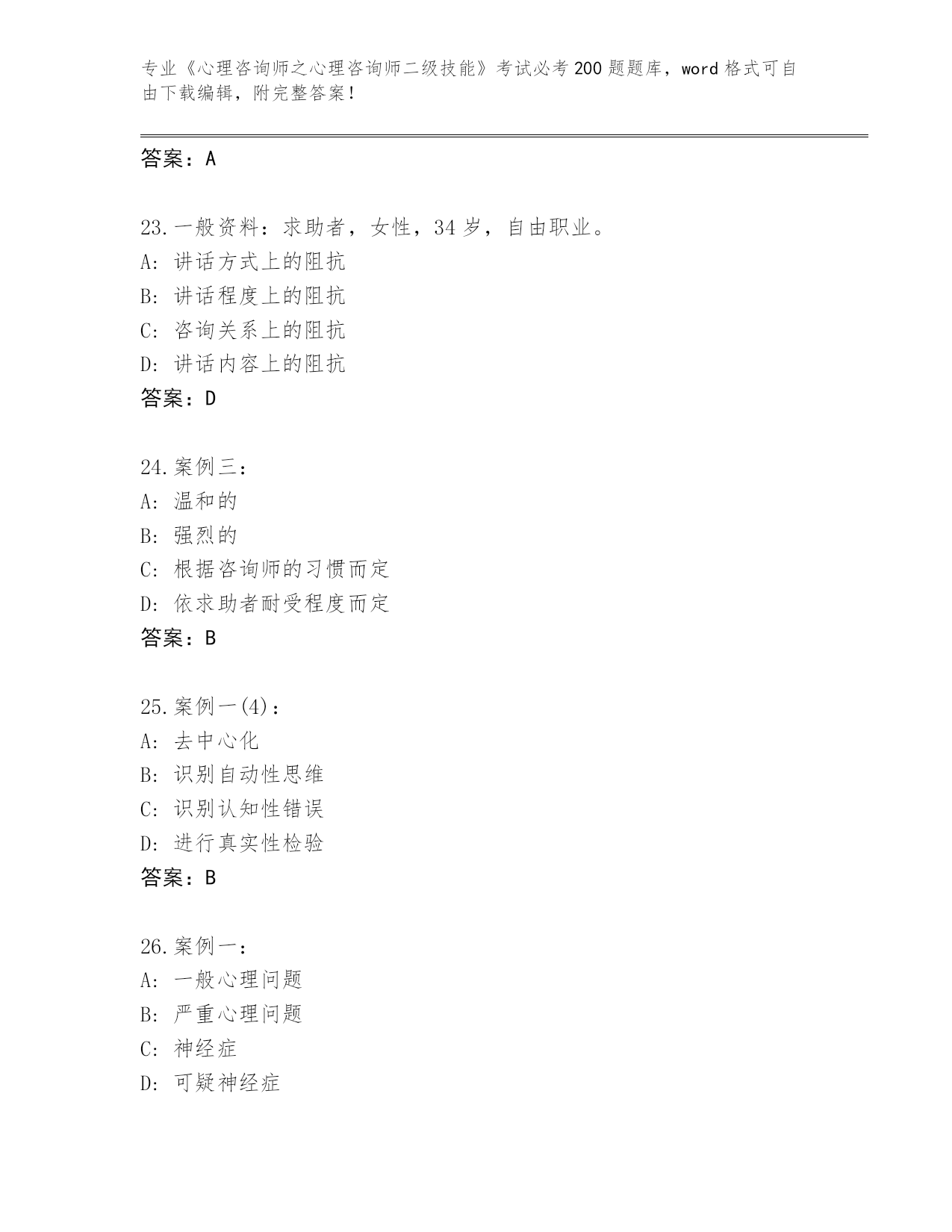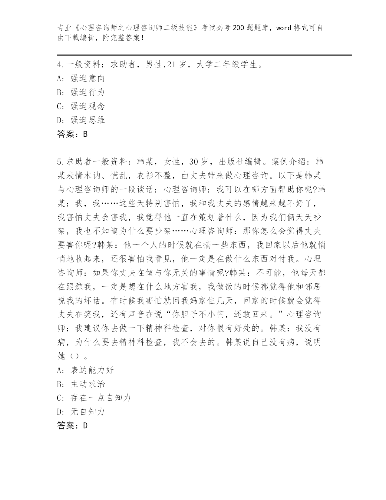 河南省完整版《心理咨询师之心理咨询师二级技能》考试必考200题完整版(夺冠)