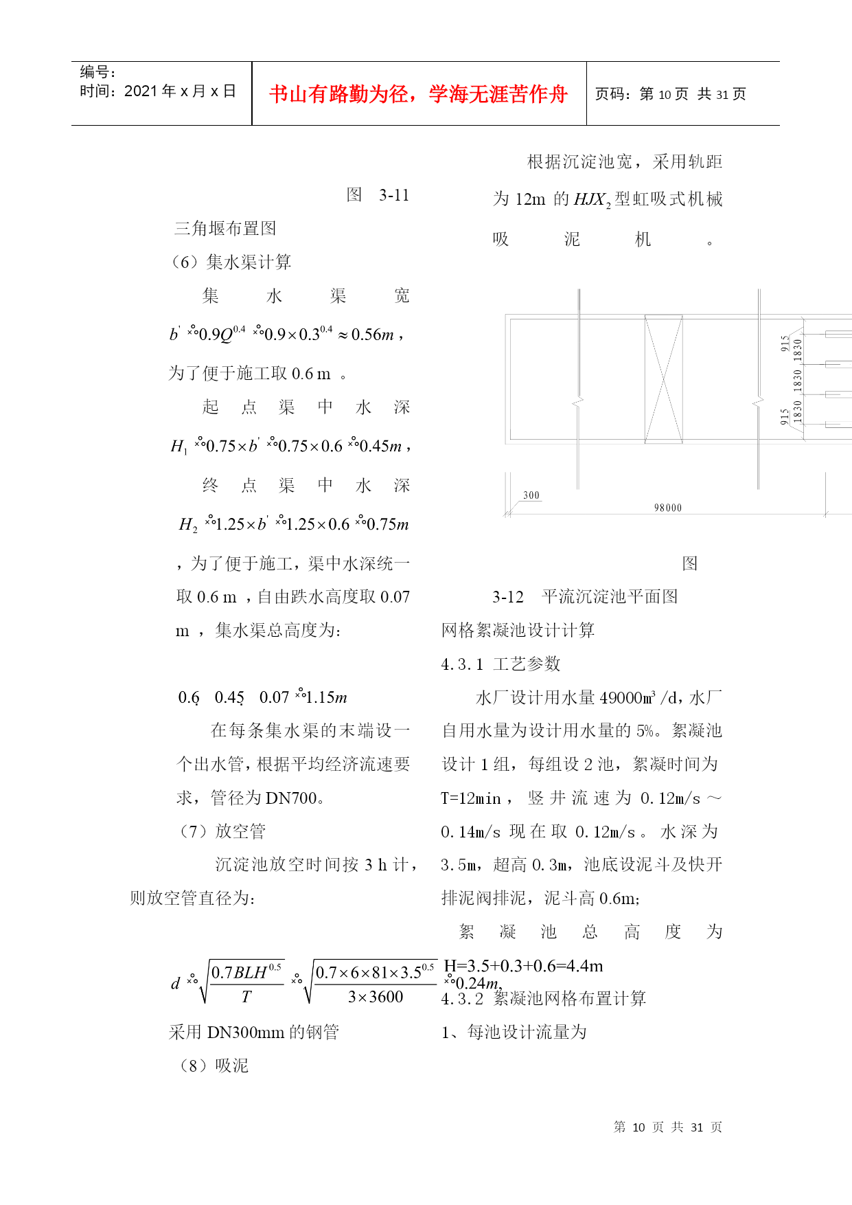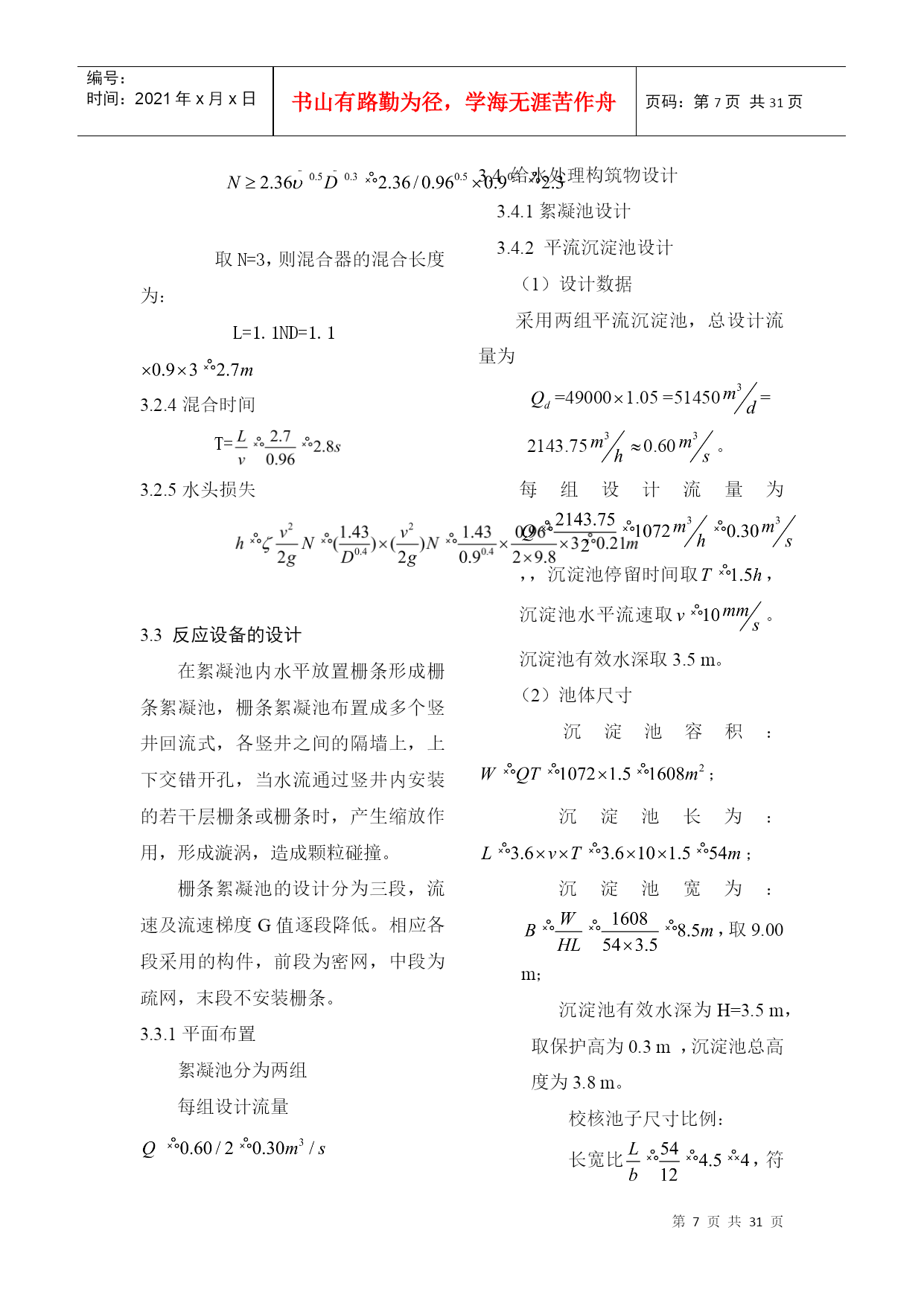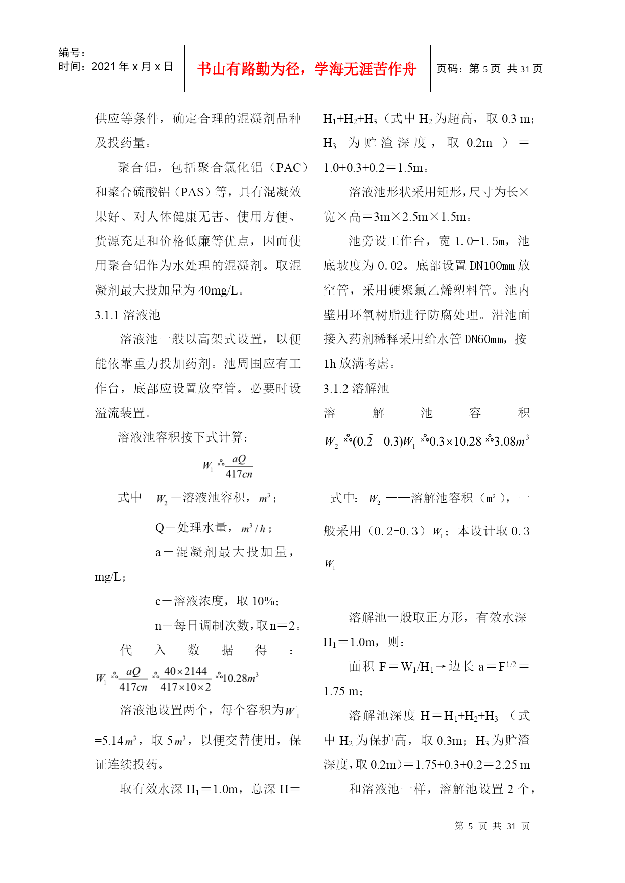 编号:时间:2021年x月x日书山有路勤为径,学海无涯苦作舟页码:第PAGE31页共NUMPAGES31页第PAGE\*MERGEFORMAT31页共NUMPAGES\*MERGEFORMAT31页2.设计说明2.1方案比较2.1.1预选方案进行综合考虑之后,拟采用以下两种工艺流程:加矾方案一:源水斗槽(一泵房)栅条絮凝池凝池加氯平流式沉淀池V型滤池清水池吸水井二泵城市管网加矾方案二:源水斗槽(一泵房)机械絮凝池+往复式隔板絮加氯斜管沉淀池普通快滤池清水池吸水井二泵城市管网2.1.2方案技术比较从这两个方案来看都符合一般的流程要求而且出水的水质可以得到保障,所不同的主要是单体构筑物有区别,现将其比较如下:(1)絮凝工艺:方案一采用网格絮凝池。优点:絮凝效果好;水头损失小;絮凝时间短。缺点:存在池底积泥现象,如有积泥现象应当及时清除。方案二采用机械絮凝池和往复式隔板絮凝池组合使用机械絮凝池优点:絮凝效果好,节省药剂;水头损失小;可适应水质水量的变化。缺点:需机械设备和经常维修。往复式隔板絮凝池优点:絮凝效果好;构造简单;施工方便。缺点:容积较大;水头损失较大;转弯处絮粒容易破碎;出水流量不易分配均匀;出口处易积泥,适用于流量每日大于3万立方米且水量变化较小的水厂。两种形式絮凝池组合使用有如下优点:当水质水量发生变化时,可以调节机械搅拌速度以弥补隔板往复式絮凝池的不足;当机械搅拌装置需要维修时,隔板往复式絮凝池仍可继续运行。此外,若设计流量较小,采用往复式隔板絮凝池往往前端廊道宽度不足0.5m,不利于施工,则前端采用机械絮凝池可弥补此不足。(2)沉淀工艺:方案一采用平流沉淀池优点:造价较低;操作管理方便;施工简单;对源水浊度适应性较强;处理效果稳定;采用机械排泥设施时,排泥效果好。缺点:需要维护机械排泥设备;占地面积较大;水力排泥时排泥困难;一般使用于中型水厂。方案二采用斜管沉淀池优点:沉淀效率高;池体小;占地面积小。缺点:斜管耗材多;对源水适应性较平流沉淀池差;若不设排泥装置时排泥困难若设排泥装置,维护管理麻烦;尤其使用于沉淀池改造扩建和挖潜。(3)过滤工艺:方案一V型滤池优点:可以采用均质滤料,截污能力大,反冲洗干净,过滤周期长,处理水质稳定,节省反冲洗水量。缺点:对施工的精度和操作管理水平要求甚严,否则会产生如下问题:反冲洗不均匀,有较严重的短流现象发生;跑砂;滤板接缝不平、滤头套管处密封不严,滤头堵塞甚至发生开裂;阀门启闭不畅等现象时有发生。方案二采用普通快滤池优点:运行管理可靠,有成熟的运行经验,池深较浅。缺点:阀件较多,一般为大阻力冲洗,需设冲洗设备。方案一较好,故本设计中采用方案一给水处理工艺流程。2.2水厂设计说明2.2.1设计规模设计用水量定额是确定设计用水量的主要依据,它可影响给水系统相应设施的规模、工程投资、工程扩建的期限、今后水量的保证等方面,所以必须慎重考虑,应结合现状和规划资料并参照类似地区或企业的用水情况,确定用水定额。城市生活用水和工业用水的增长速度,在一定程度上是有规律的,但如果对生活用水采取节约用水措施,对工业用水采取计划用水、提高工业用水重复利用率等措施,可以影响用水量的增长速度,在确定设计用水量定额时应考虑这种变化。居民生活用水定额和综合用水定额,应根据当地国民经济和社会发展规划和水资源充沛程度,在现有用水定额基础上,结合给水专业规划和给水工程发展条件综合分析确定。设计任务书已给出最高日用水量为:=49000,水厂自用水系数按5%计,则设计水量为:=490001.05=51450。2.2.4混凝剂的配制与投加。混凝剂投加采用如下流程:搅拌-→提升-→贮液-→计量-→投加拟定:选用精制硫酸铝,最大的投加量为40mg/l,混凝剂每日配置次数为3次,药溶液浓度为10%,不用助凝剂。2.2.4.4投药计量设备采用JM型微型机械隔膜计量泵。2.2.4.5药剂仓库混凝剂为精制硫酸铝,每袋质量是40kg,每袋规格为。药剂堆放高度为1.5m,药剂储存期为30d。仓库平面尺寸为:。2.2.4.6投药间投药间靠近投药点,与药剂仓库相连,设置两条投药管路,具有良好的通风和采光效果。投药间要求有值班室,面积在15左右。3.设计计算3.1给水处理厂设计用水量3.1.1最高日设计用水量设计任务书已给出最高日用水量为:=49000,水厂自用水系数按5%计,则最高日设计用水量为:=490001.05=51450=2143.750.60。3.3混凝剂的配制和投加3.3.1混凝剂的配制和投加混凝剂的配置和投加采用如下流程:搅拌-→提升-→贮液-→计量-→投加3.