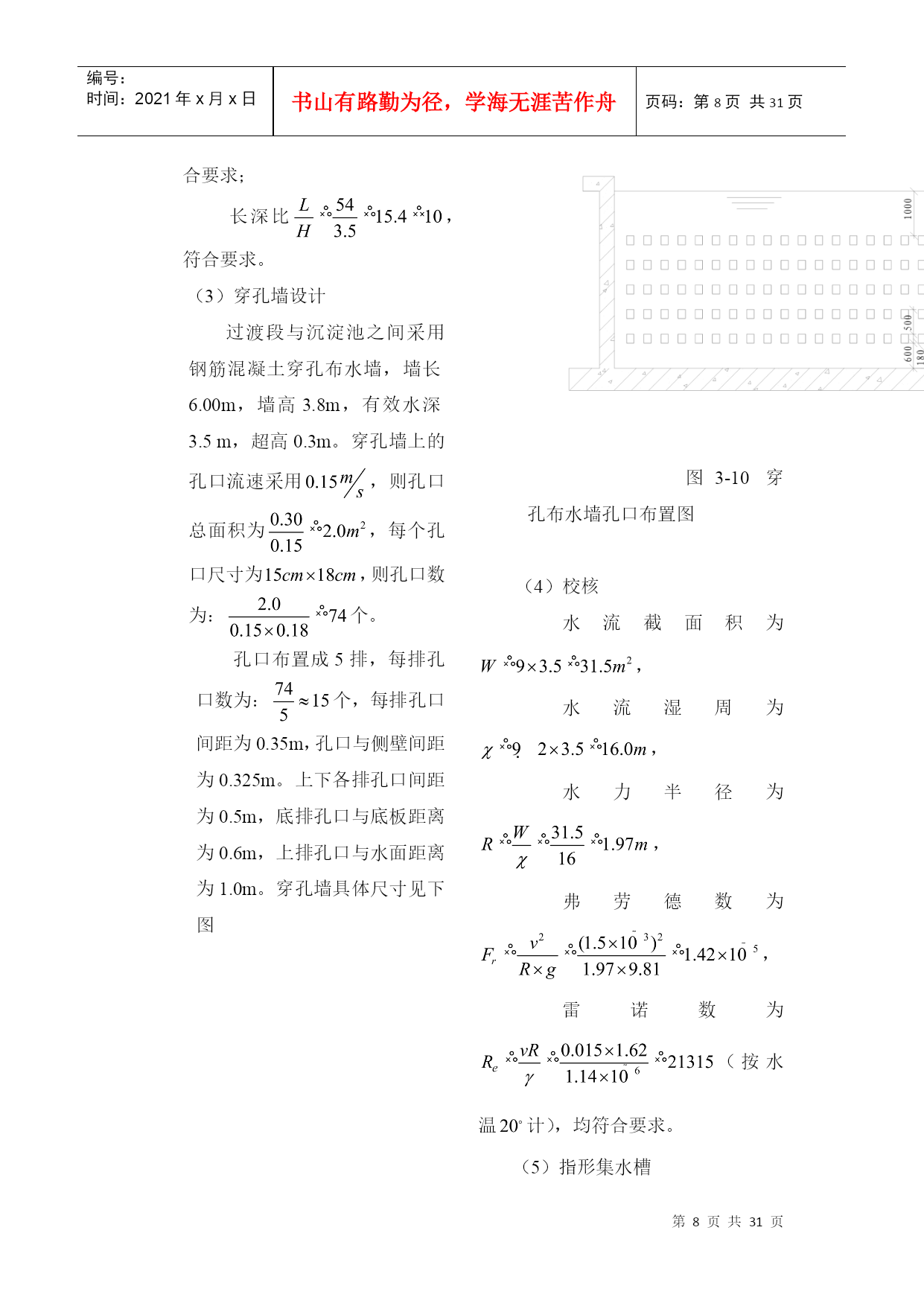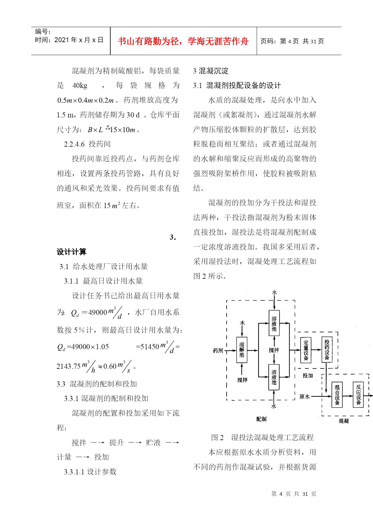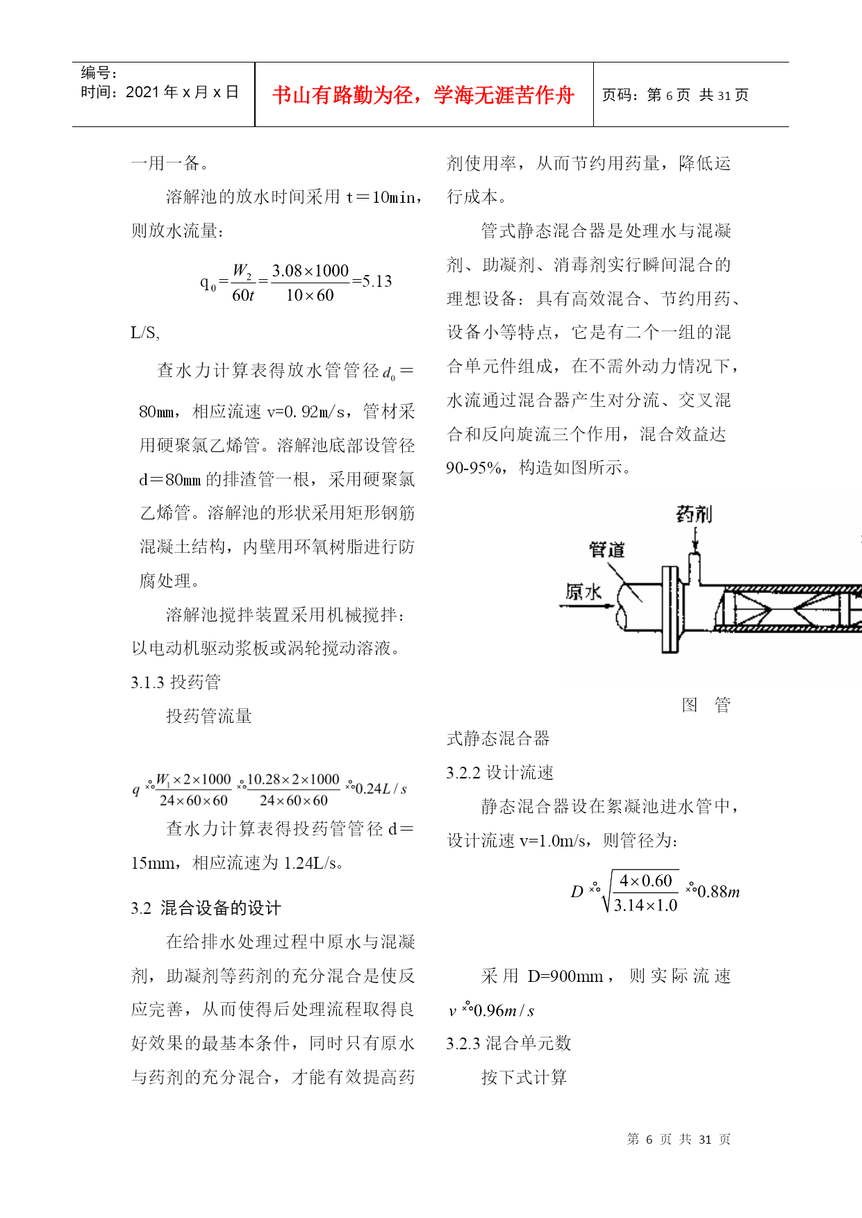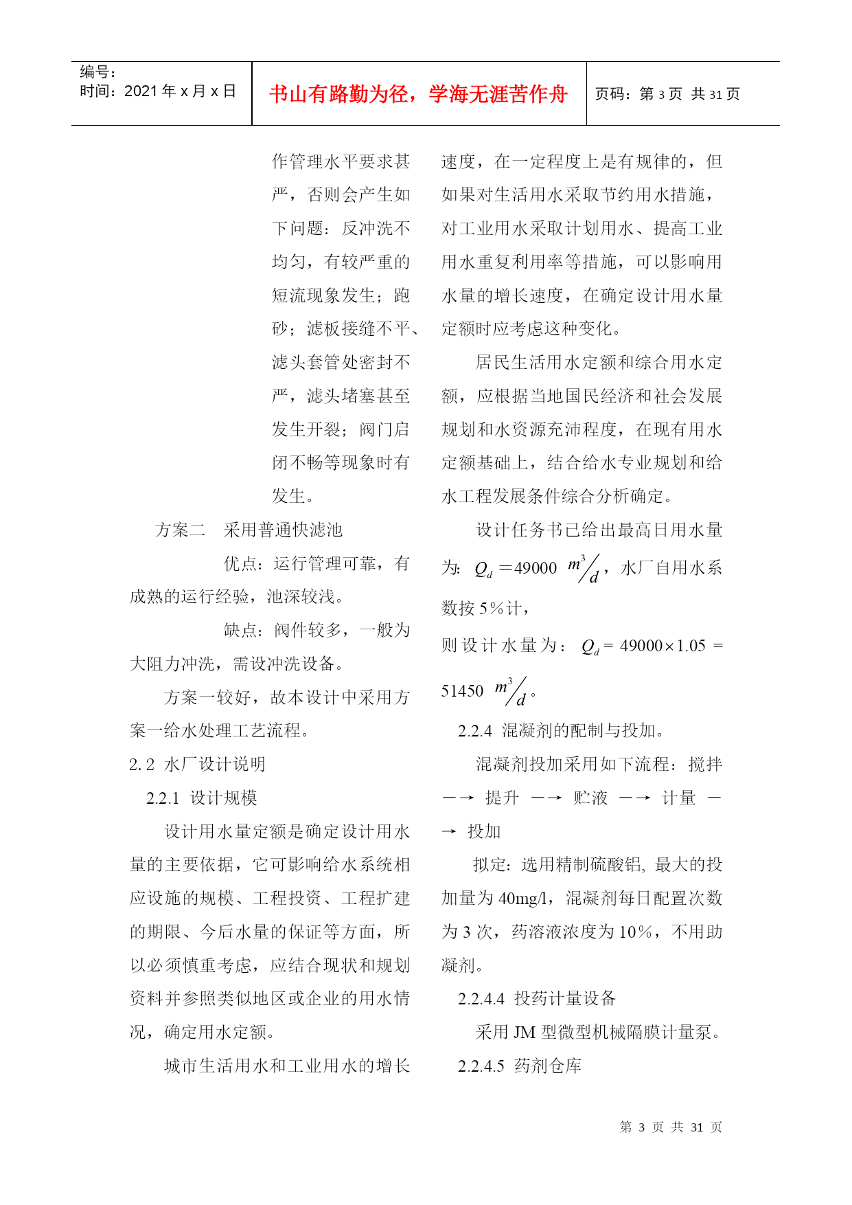 编号:时间:2021年x月x日书山有路勤为径,学海无涯苦作舟页码:第PAGE31页共NUMPAGES31页第PAGE\*MERGEFORMAT31页共NUMPAGES\*MERGEFORMAT31页2.设计说明2.1方案比较2.1.1预选方案进行综合考虑之后,拟采用以下两种工艺流程:加矾方案一:源水斗槽(一泵房)栅条絮凝池凝池加氯平流式沉淀池V型滤池清水池吸水井二泵城市管网加矾方案二:源水斗槽(一泵房)机械絮凝池+往复式隔板絮加氯斜管沉淀池普通快滤池清水池吸水井二泵城市管网2.1.2方案技术比较从这两个方案来看都符合一般的流程要求而且出水的水质可以得到保障,所不同的主要是单体构筑物有区别,现将其比较如下:(1)絮凝工艺:方案一采用网格絮凝池。优点:絮凝效果好;水头损失小;絮凝时间短。缺点:存在池底积泥现象,如有积泥现象应当及时清除。方案二采用机械絮凝池和往复式隔板絮凝池组合使用机械絮凝池优点:絮凝效果好,节省药剂;水头损失小;可适应水质水量的变化。缺点:需机械设备和经常维修。往复式隔板絮凝池优点:絮凝效果好;构造简单;施工方便。缺点:容积较大;水头损失较大;转弯处絮粒容易破碎;出水流量不易分配均匀;出口处易积泥,适用于流量每日大于3万立方米且水量变化较小的水厂。两种形式絮凝池组合使用有如下优点:当水质水量发生变化时,可以调节机械搅拌速度以弥补隔板往复式絮凝池的不足;当机械搅拌装置需要维修时,隔板往复式絮凝池仍可继续运行。此外,若设计流量较小,采用往复式隔板絮凝池往往前端廊道宽度不足0.5m,不利于施工,则前端采用机械絮凝池可弥补此不足。(2)沉淀工艺:方案一采用平流沉淀池优点:造价较低;操作管理方便;施工简单;对源水浊度适应性较强;处理效果稳定;采用机械排泥设施时,排泥效果好。缺点:需要维护机械排泥设备;占地面积较大;水力排泥时排泥困难;一般使用于中型水厂。方案二采用斜管沉淀池优点:沉淀效率高;池体小;占地面积小。缺点:斜管耗材多;对源水适应性较平流沉淀池差;若不设排泥装置时排泥困难若设排泥装置,维护管理麻烦;尤其使用于沉淀池改造扩建和挖潜。(3)过滤工艺:方案一V型滤池优点:可以采用均质滤料,截污能力大,反冲洗干净,过滤周期长,处理水质稳定,节省反冲洗水量。缺点:对施工的精度和操作管理水平要求甚严,否则会产生如下问题:反冲洗不均匀,有较严重的短流现象发生;跑砂;滤板接缝不平、滤头套管处密封不严,滤头堵塞甚至发生开裂;阀门启闭不畅等现象时有发生。方案二采用普通快滤池优点:运行管理可靠,有成熟的运行经验,池深较浅。缺点:阀件较多,一般为大阻力冲洗,需设冲洗设备。方案一较好,故本设计中采用方案一给水处理工艺流程。2.2水厂设计说明2.2.1设计规模设计用水量定额是确定设计用水量的主要依据,它可影响给水系统相应设施的规模、工程投资、工程扩建的期限、今后水量的保证等方面,所以必须慎重考虑,应结合现状和规划资料并参照类似地区或企业的用水情况,确定用水定额。城市生活用水和工业用水的增长速度,在一定程度上是有规律的,但如果对生活用水采取节约用水措施,对工业用水采取计划用水、提高工业用水重复利用率等措施,可以影响用水量的增长速度,在确定设计用水量定额时应考虑这种变化。居民生活用水定额和综合用水定额,应根据当地国民经济和社会发展规划和水资源充沛程度,在现有用水定额基础上,结合给水专业规划和给水工程发展条件综合分析确定。设计任务书已给出最高日用水量为:=49000,水厂自用水系数按5%计,则设计水量为:=490001.05=51450。2.2.4混凝剂的配制与投加。混凝剂投加采用如下流程:搅拌-→提升-→贮液-→计量-→投加拟定:选用精制硫酸铝,最大的投加量为40mg/l,混凝剂每日配置次数为3次,药溶液浓度为10%,不用助凝剂。2.2.4.4投药计量设备采用JM型微型机械隔膜计量泵。2.2.4.5药剂仓库混凝剂为精制硫酸铝,每袋质量是40kg,每袋规格为。药剂堆放高度为1.5m,药剂储存期为30d。仓库平面尺寸为:。2.2.4.6投药间投药间靠近投药点,与药剂仓库相连,设置两条投药管路,具有良好的通风和采光效果。投药间要求有值班室,面积在15左右。3.设计计算3.1给水处理厂设计用水量3.1.1最高日设计用水量设计任务书已给出最高日用水量为:=49000,水厂自用水系数按5%计,则最高日设计用水量为:=490001.05=51450=2143.750.60。3.3混凝剂的配制和投加3.3.1混凝剂的配制和投加混凝剂的配置和投加采用如下流程:搅拌-→提升-→贮液-→计量-→投加3.