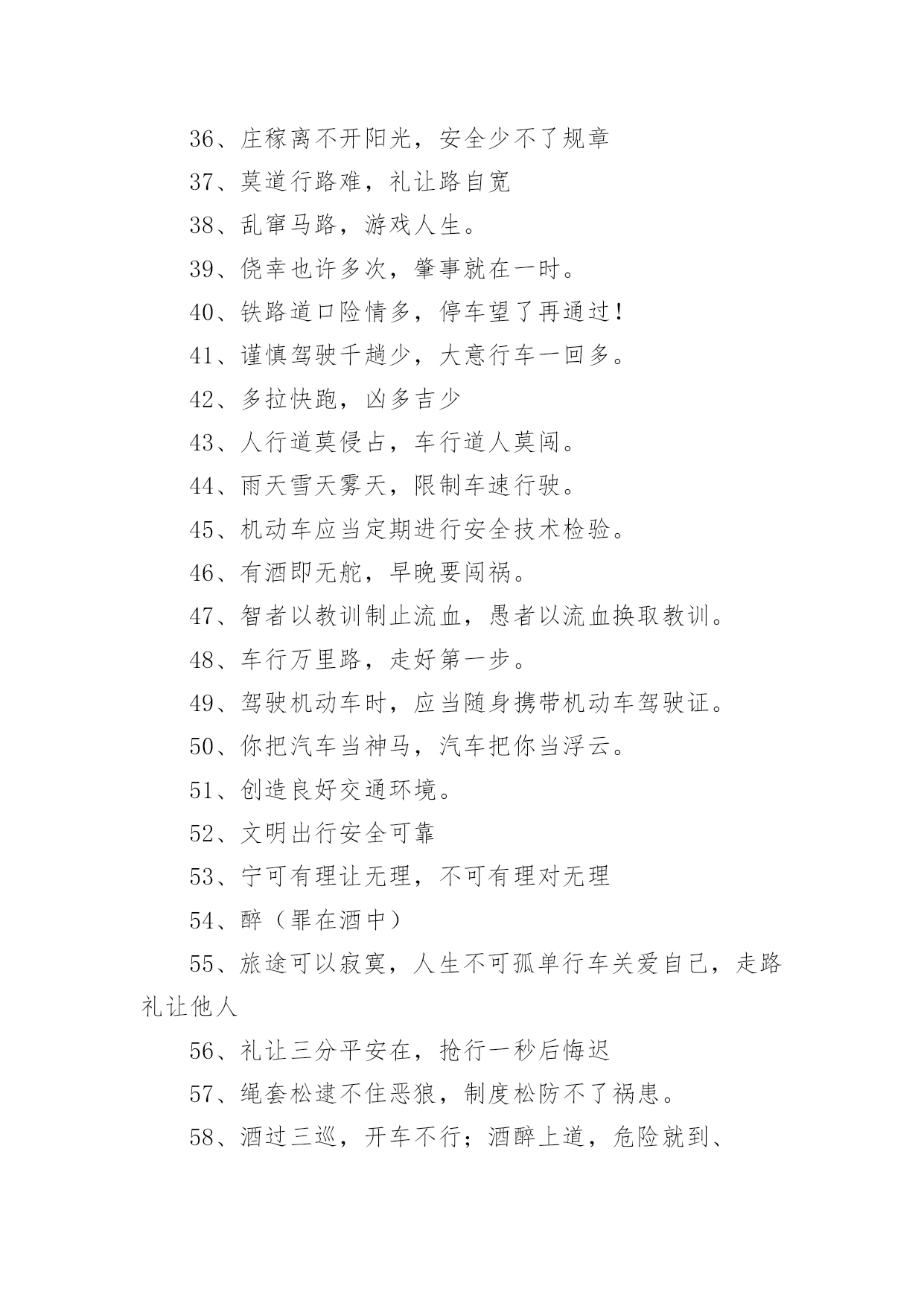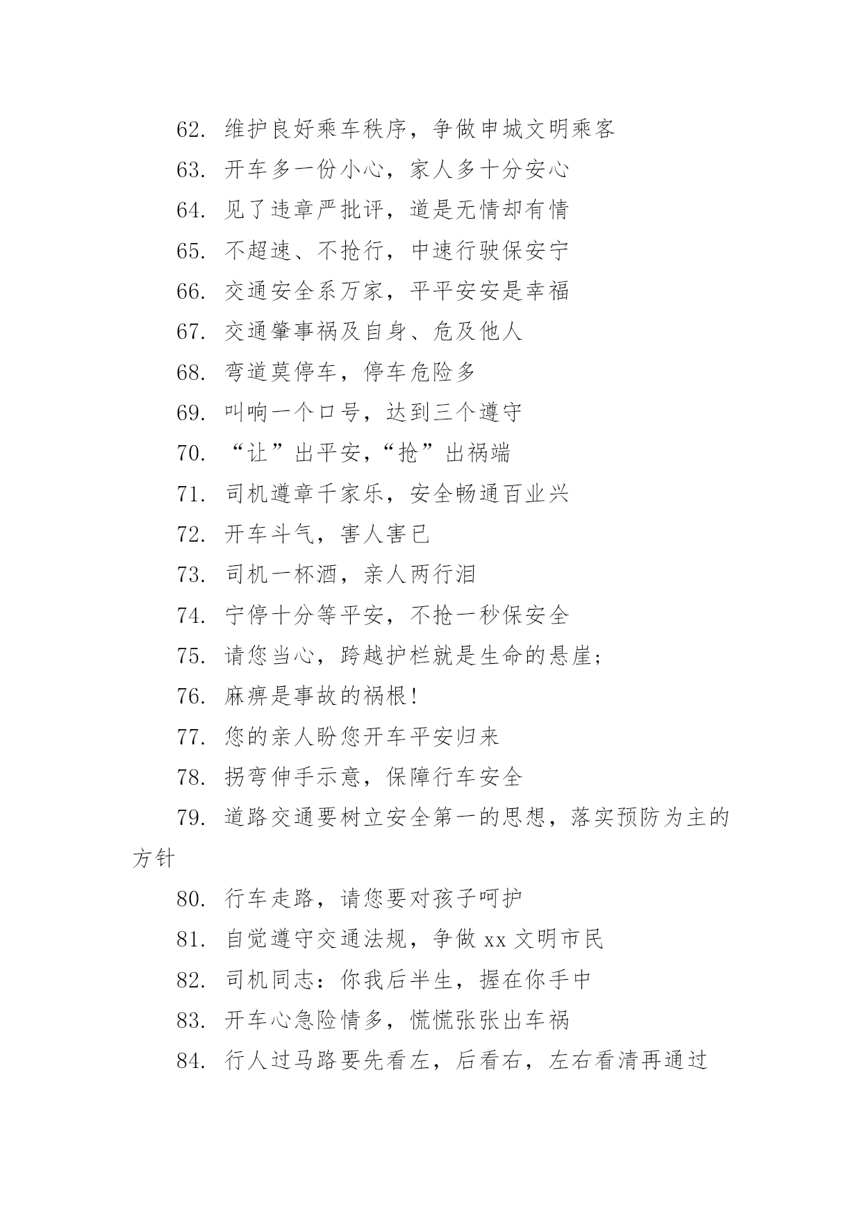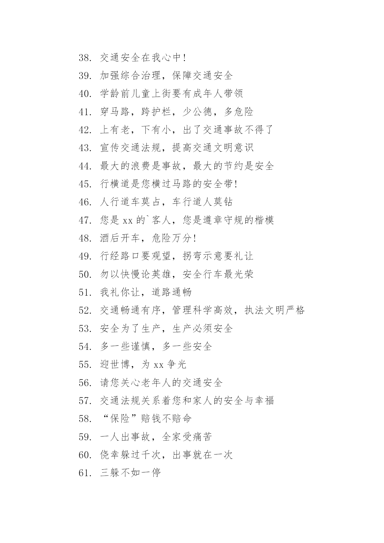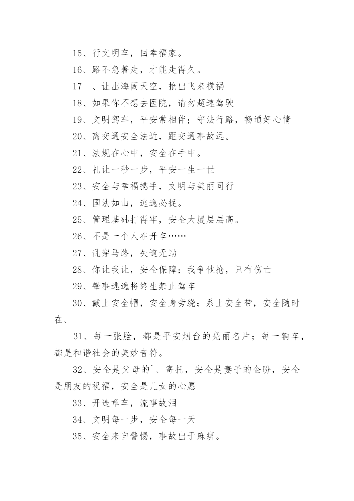 交通安全宣传口号标语交通安全宣传口号标语在日常的学习、工作、生活中,大家都接触过比较经典的口号吧,不同时期不同的口号可以看出,意识对物质具有能动作用。那么什么样的口号才是好的口号呢?以下是小编精心整理的交通安全宣传口号标语,供大家参考借鉴,希望可以帮助到有需要的朋友。交通安全宣传口号标语11、生命只有一次,平安伴君一生。2、我为瑞安交通添光彩!3、维护交通安全,关爱生命久远。4、居安思危危自小,有备无患患可除5、彼此让一让,安全有保障。6、宁可走远路,也不闯马路、7、道路通行见形象,红绿灯前看修养8、红绿灯下讲文明,斑马线上知荣辱9、一次坚定的穿行,足以改变一个家庭的命运。10、给违章驾驶差评,为文明行车点赞。11、行人应当走人行横道或者过街设施。12、一丝不苟保安全,半分疏忽生祸端。13、车好、路好,安全最好14、安全最佳效应,平安共同心声。15、行文明车,回幸福家。16、路不急著走,才能走得久。17、让出海阔天空,抢出飞来横祸18、如果你不想去医院,请勿超速驾驶19、文明驾车,平安常相伴;守法行路,畅通好心情20、离交通安全法近,距交通事故远。21、法规在心中,安全在手中。22、礼让一秒一步,平安一生一世23、安全与幸福携手,文明与美丽同行24、国法如山,逃逸必捉。25、管理基础打得牢,安全大厦层层高。26、不是一个人在开车……27、乱穿马路,失道无助28、你让我让,安全保障;我争他抢,只有伤亡29、肇事逃逸将终生禁止驾车30、戴上安全帽,安全身旁绕;系上安全带,安全随时在、31、每一张脸,都是平安烟台的亮丽名片;每一辆车,都是和谐社会的美妙音符。32、安全是父母的`、寄托,安全是妻子的企盼,安全是朋友的祝福,安全是儿女的心愿33、开违章车,流事故泪34、文明每一步,安全每一天35、安全来自警惕,事故出于麻痹。36、庄稼离不开阳光,安全少不了规章37、莫道行路难,礼让路自宽38、乱窜马路,游戏人生。39、侥幸也许多次,肇事就在一时。40、铁路道口险情多,停车望了再通过!41、谨慎驾驶千趟少,大意行车一回多。42、多拉快跑,凶多吉少43、人行道莫侵占,车行道人莫闯。44、雨天雪天雾天,限制车速行驶。45、机动车应当定期进行安全技术检验。46、有酒即无舵,早晚要闯祸。47、智者以教训制止流血,愚者以流血换取教训。48、车行万里路,走好第一步。49、驾驶机动车时,应当随身携带机动车驾驶证。50、你把汽车当神马,汽车把你当浮云。51、创造良好交通环境。52、文明出行安全可靠53、宁可有理让无理,不可有理对无理54、醉(罪在酒中)55、旅途可以寂寞,人生不可孤单行车关爱自己,走路礼让他人56、礼让三分平安在,抢行一秒后悔迟57、绳套松逮不住恶狼,制度松防不了祸患。58、酒过三巡,开车不行;酒醉上道,危险就到、59、唱文明安全歌,走健康幸福路。60、母念妻等娇儿盼,愿君平安把家还。61、安全是最大的节约,事故是最大的浪费62、车子向你招招手,千万不要向前走63、全面开展道路交通安全集中整治大会战64、机动车行经人行横道时,应当减速行驶。65、认真开展“全国交通安全日”活动66、儿行千里母担忧,遵守交规娘不愁。67、红灯、绿灯、灯灯是令;直道、弯道、道道小心68、维护交通秩序,争做文明公民。69、蔚然文明新风70、疾病从口入,事故由松出。71、法规记心中,三思而后行72、良药苦口利于病,交通法规利于行。交通安全宣传口号标语21.以德立校育人为本2.厚德载物自强不息3.传承文明启智求真4.与时俱进开拓创新5.同心同德争创名校6.团结奋进共育英才7.尊师爱生重教勤学8.上学放学,安全最乐。9.创宏外大业谱教育新篇10.以特色办学以质量取胜11.关爱孩子,从起步开始。12.路上不游戏,搭车守秩序。13.莫争先恐后,多照顾老幼。14.加快宏外发展创建教育品牌15.实施品牌战略打造世纪名校16.实施素质教育实现全面发展17.走立志报国路做文明宏外人18.培育创新精神塑造健康人格19.理想就是价值奉献就是人生20.目标就是动力事业就是生命21.奋斗就是乐趣务实就是作为22.做道德文章育“四有”新人23.珍爱宝贵生命,拒绝交通违法24.抓好安全教育,确保师生平安25.学习生活秩序,重视交通安全。26.乘文明车,走文明路,做文明人27.安全乘车,安全骑车,安全走路28.高高兴兴上学来,平平安安回家去29.安全与守法同在,事故与违法相随30.马路嬉戏危险多,交通安全最重要31.学生走路要靠边,切勿并行路中间。32.学生行路单行走,不并肩来不携手。33.不在马路上玩耍,放学后立刻回家。34.遵守交通规则,就是实践生活规范。35.红灯停绿灯行,横过马路请走斑马线36.学校门前莫开快,司机献出一点爱。37.人的生命只有一次,请您注意交通安全38.倡导文明交