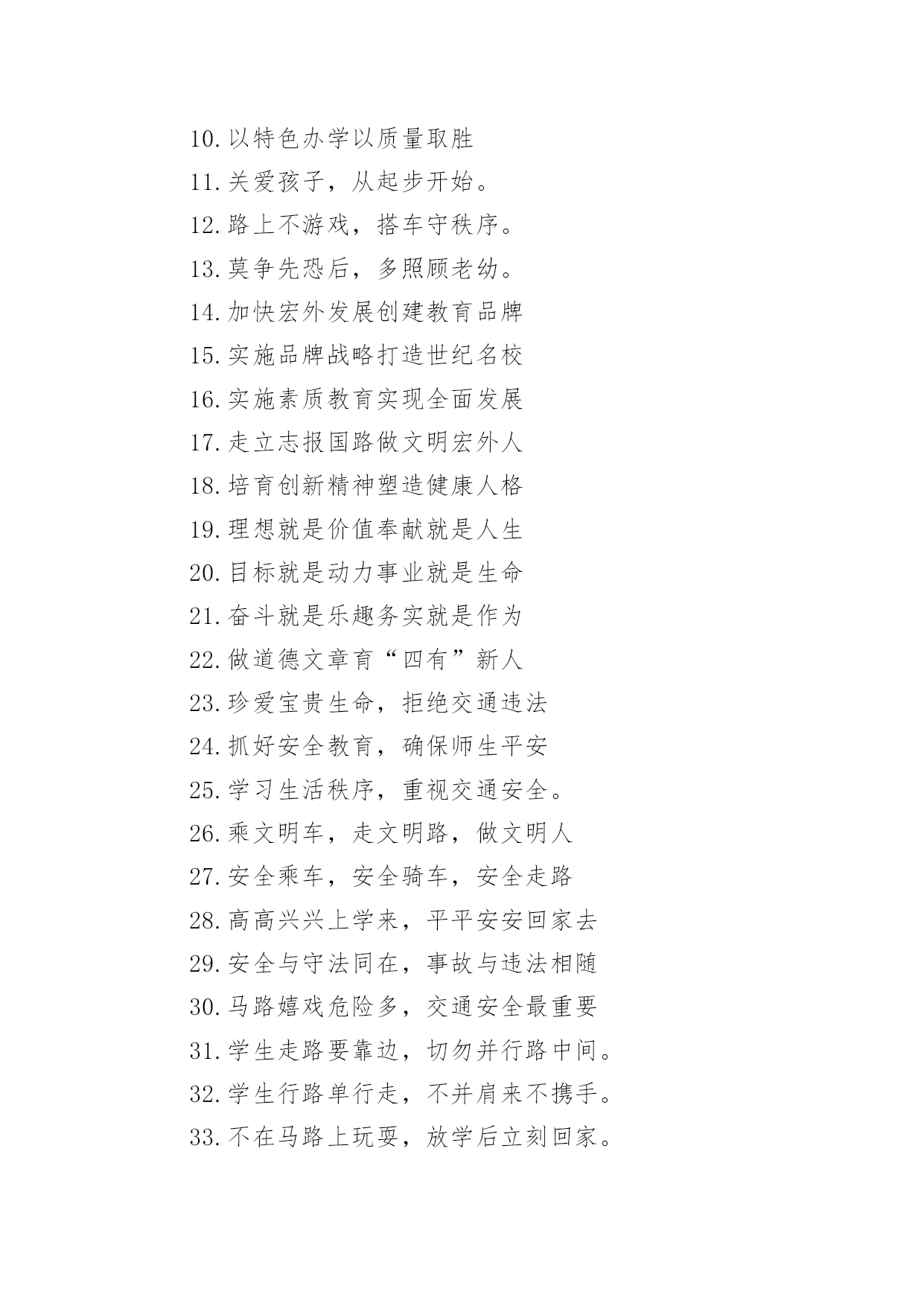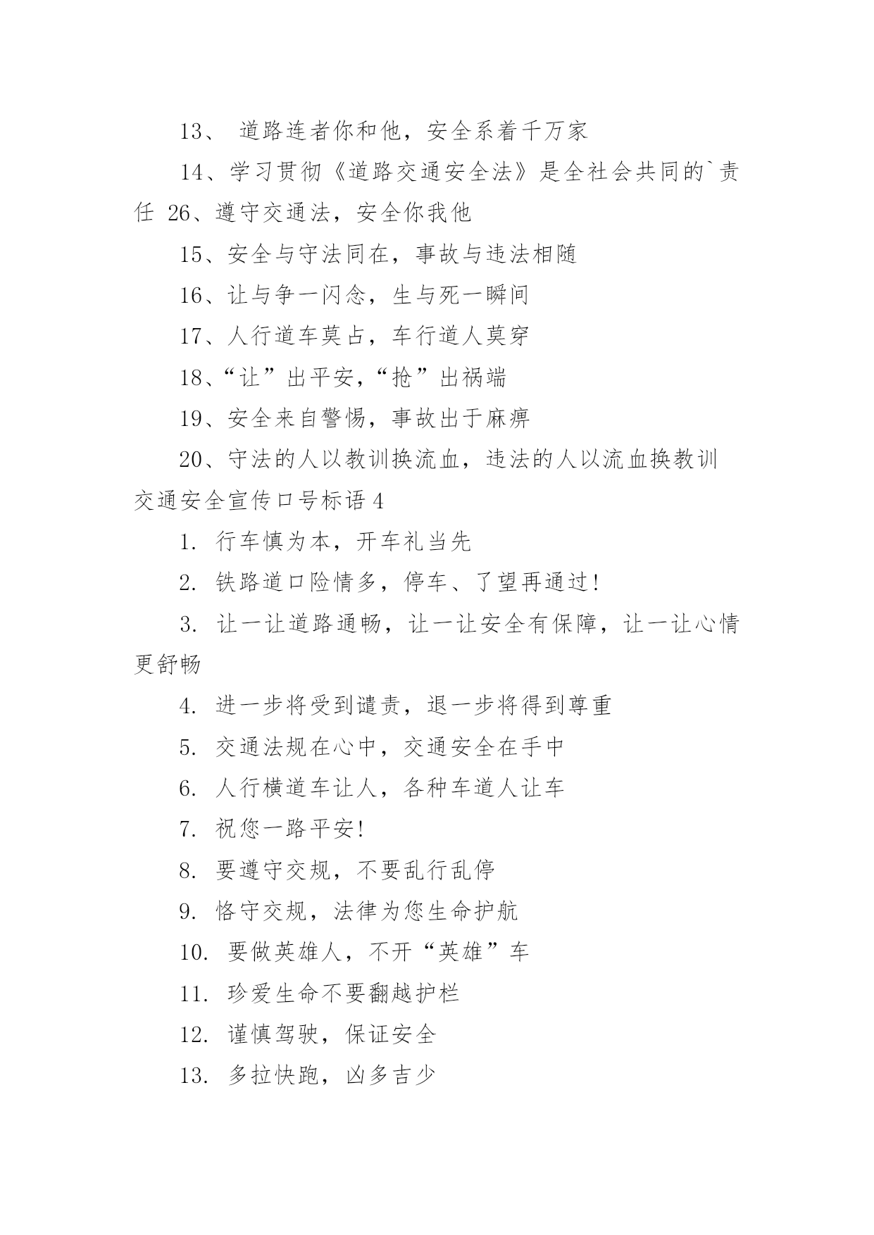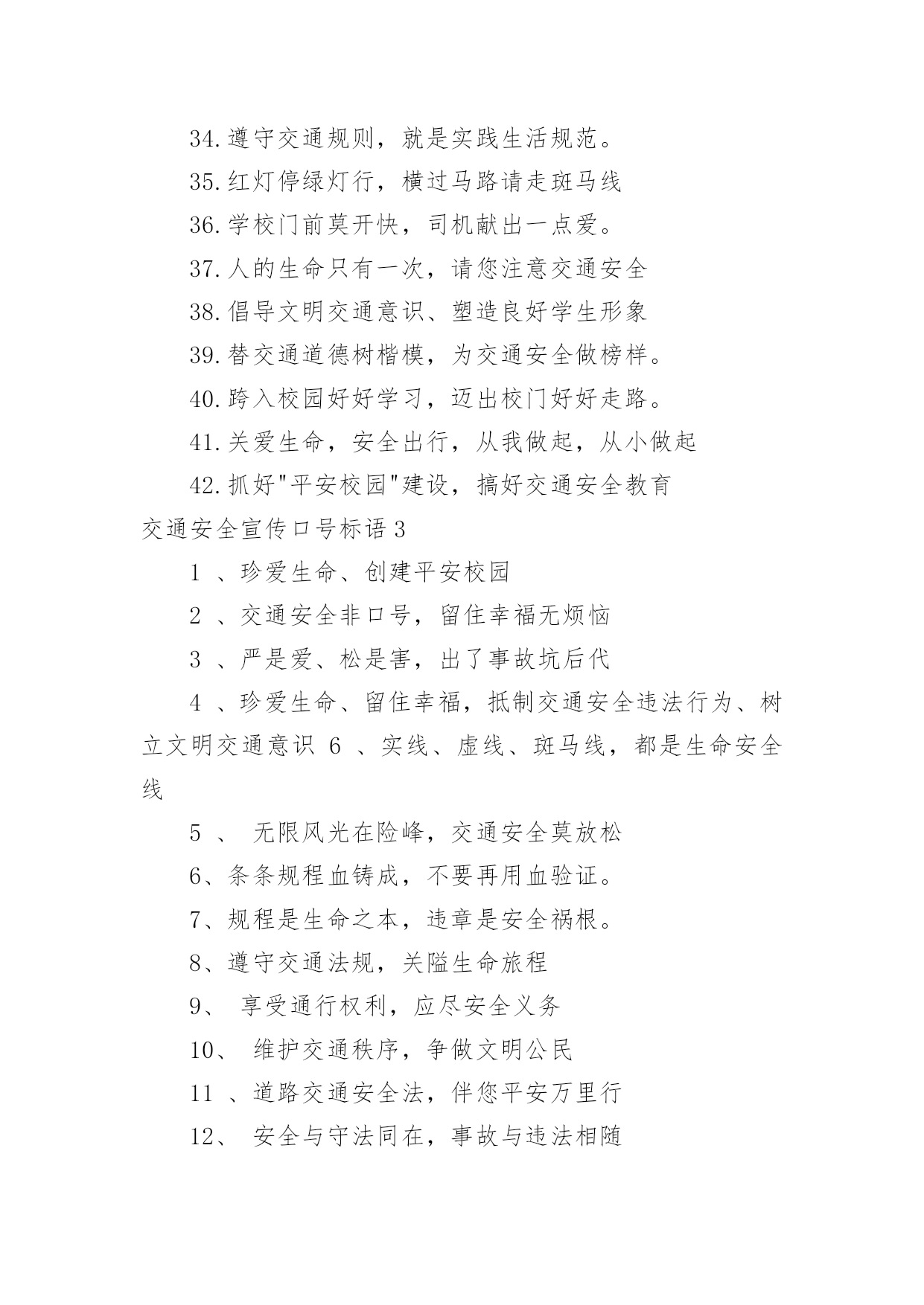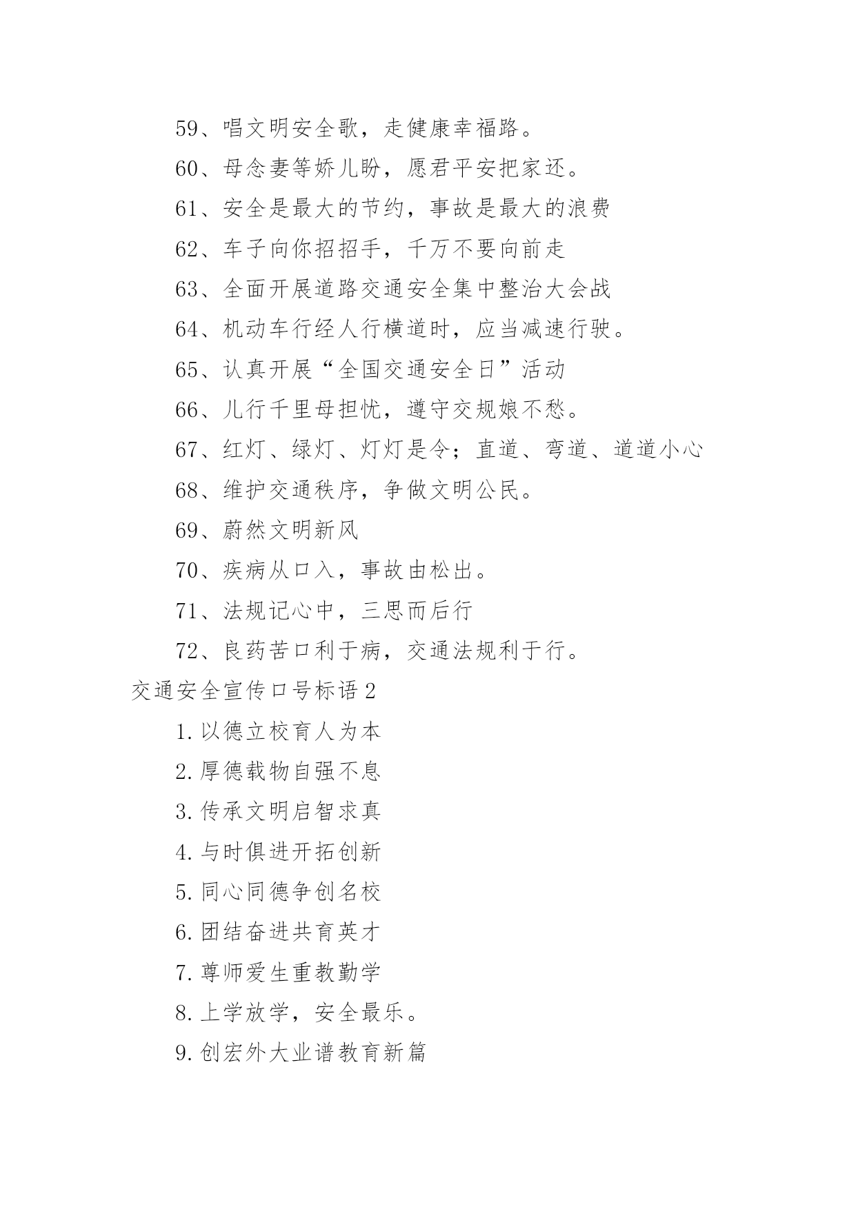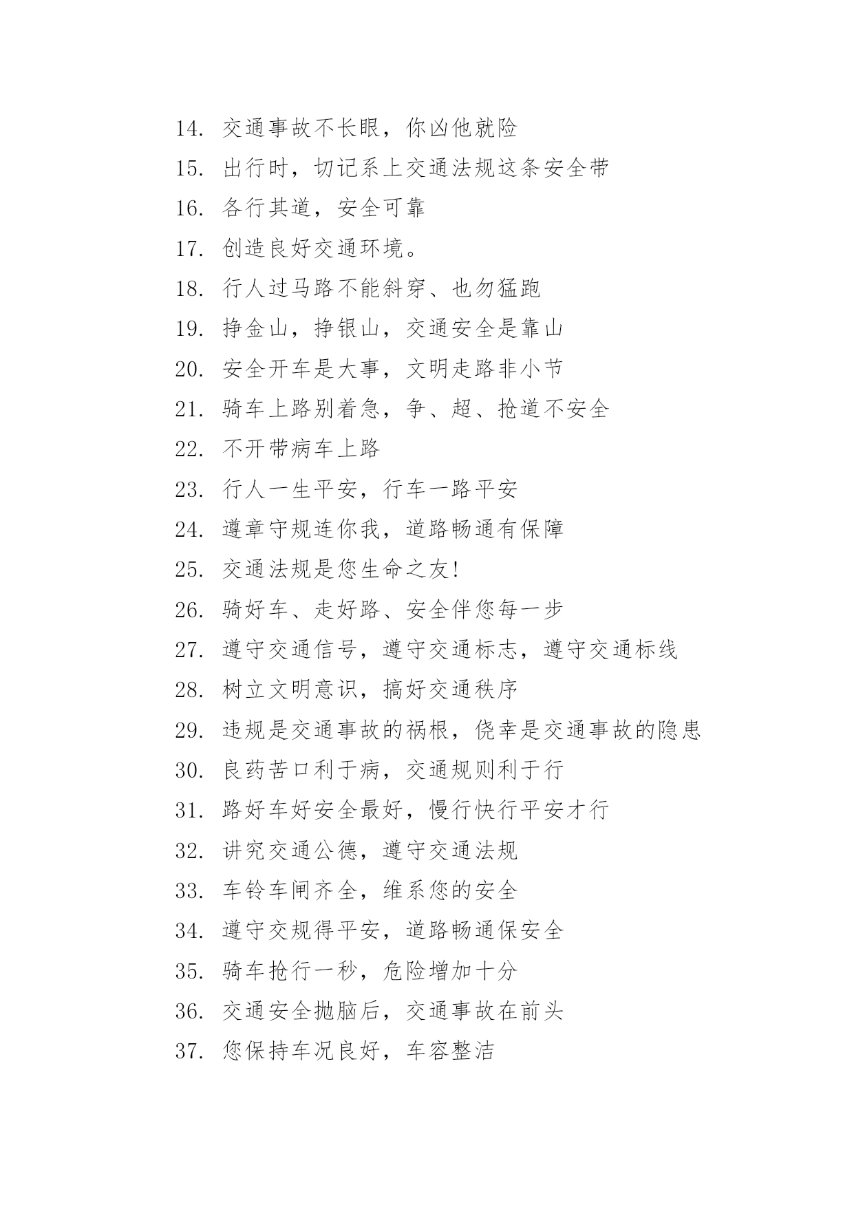 交通安全宣传口号标语交通安全宣传口号标语在日常的学习、工作、生活中,大家都接触过比较经典的口号吧,不同时期不同的口号可以看出,意识对物质具有能动作用。那么什么样的口号才是好的口号呢?以下是小编精心整理的交通安全宣传口号标语,供大家参考借鉴,希望可以帮助到有需要的朋友。交通安全宣传口号标语11、生命只有一次,平安伴君一生。2、我为瑞安交通添光彩!3、维护交通安全,关爱生命久远。4、居安思危危自小,有备无患患可除5、彼此让一让,安全有保障。6、宁可走远路,也不闯马路、7、道路通行见形象,红绿灯前看修养8、红绿灯下讲文明,斑马线上知荣辱9、一次坚定的穿行,足以改变一个家庭的命运。10、给违章驾驶差评,为文明行车点赞。11、行人应当走人行横道或者过街设施。12、一丝不苟保安全,半分疏忽生祸端。13、车好、路好,安全最好14、安全最佳效应,平安共同心声。15、行文明车,回幸福家。16、路不急著走,才能走得久。17、让出海阔天空,抢出飞来横祸18、如果你不想去医院,请勿超速驾驶19、文明驾车,平安常相伴;守法行路,畅通好心情20、离交通安全法近,距交通事故远。21、法规在心中,安全在手中。22、礼让一秒一步,平安一生一世23、安全与幸福携手,文明与美丽同行24、国法如山,逃逸必捉。25、管理基础打得牢,安全大厦层层高。26、不是一个人在开车……27、乱穿马路,失道无助28、你让我让,安全保障;我争他抢,只有伤亡29、肇事逃逸将终生禁止驾车30、戴上安全帽,安全身旁绕;系上安全带,安全随时在、31、每一张脸,都是平安烟台的亮丽名片;每一辆车,都是和谐社会的美妙音符。32、安全是父母的`、寄托,安全是妻子的企盼,安全是朋友的祝福,安全是儿女的心愿33、开违章车,流事故泪34、文明每一步,安全每一天35、安全来自警惕,事故出于麻痹。36、庄稼离不开阳光,安全少不了规章37、莫道行路难,礼让路自宽38、乱窜马路,游戏人生。39、侥幸也许多次,肇事就在一时。40、铁路道口险情多,停车望了再通过!41、谨慎驾驶千趟少,大意行车一回多。42、多拉快跑,凶多吉少43、人行道莫侵占,车行道人莫闯。44、雨天雪天雾天,限制车速行驶。45、机动车应当定期进行安全技术检验。46、有酒即无舵,早晚要闯祸。47、智者以教训制止流血,愚者以流血换取教训。48、车行万里路,走好第一步。49、驾驶机动车时,应当随身携带机动车驾驶证。50、你把汽车当神马,汽车把你当浮云。51、创造良好交通环境。52、文明出行安全可靠53、宁可有理让无理,不可有理对无理54、醉(罪在酒中)55、旅途可以寂寞,人生不可孤单行车关爱自己,走路礼让他人56、礼让三分平安在,抢行一秒后悔迟57、绳套松逮不住恶狼,制度松防不了祸患。58、酒过三巡,开车不行;酒醉上道,危险就到、59、唱文明安全歌,走健康幸福路。60、母念妻等娇儿盼,愿君平安把家还。61、安全是最大的节约,事故是最大的浪费62、车子向你招招手,千万不要向前走63、全面开展道路交通安全集中整治大会战64、机动车行经人行横道时,应当减速行驶。65、认真开展“全国交通安全日”活动66、儿行千里母担忧,遵守交规娘不愁。67、红灯、绿灯、灯灯是令;直道、弯道、道道小心68、维护交通秩序,争做文明公民。69、蔚然文明新风70、疾病从口入,事故由松出。71、法规记心中,三思而后行72、良药苦口利于病,交通法规利于行。交通安全宣传口号标语21.以德立校育人为本2.厚德载物自强不息3.传承文明启智求真4.与时俱进开拓创新5.同心同德争创名校6.团结奋进共育英才7.尊师爱生重教勤学8.上学放学,安全最乐。9.创宏外大业谱教育新篇10.以特色办学以质量取胜11.关爱孩子,从起步开始。12.路上不游戏,搭车守秩序。13.莫争先恐后,多照顾老幼。14.加快宏外发展创建教育品牌15.实施品牌战略打造世纪名校16.实施素质教育实现全面发展17.走立志报国路做文明宏外人18.培育创新精神塑造健康人格19.理想就是价值奉献就是人生20.目标就是动力事业就是生命21.奋斗就是乐趣务实就是作为22.做道德文章育“四有”新人23.珍爱宝贵生命,拒绝交通违法24.抓好安全教育,确保师生平安25.学习生活秩序,重视交通安全。26.乘文明车,走文明路,做文明人27.安全乘车,安全骑车,安全走路28.高高兴兴上学来,平平安安回家去29.安全与守法同在,事故与违法相随30.马路嬉戏危险多,交通安全最重要31.学生走路要靠边,切勿并行路中间。32.学生行路单行走,不并肩来不携手。33.不在马路上玩耍,放学后立刻回家。34.遵守交通规则,就是实践生活规范。35.红灯停绿灯行,横过马路请走斑马线36.学校门前莫开快,司机献出一点爱。37.人的生命只有一次,请您注意交通安全38.倡导文明交