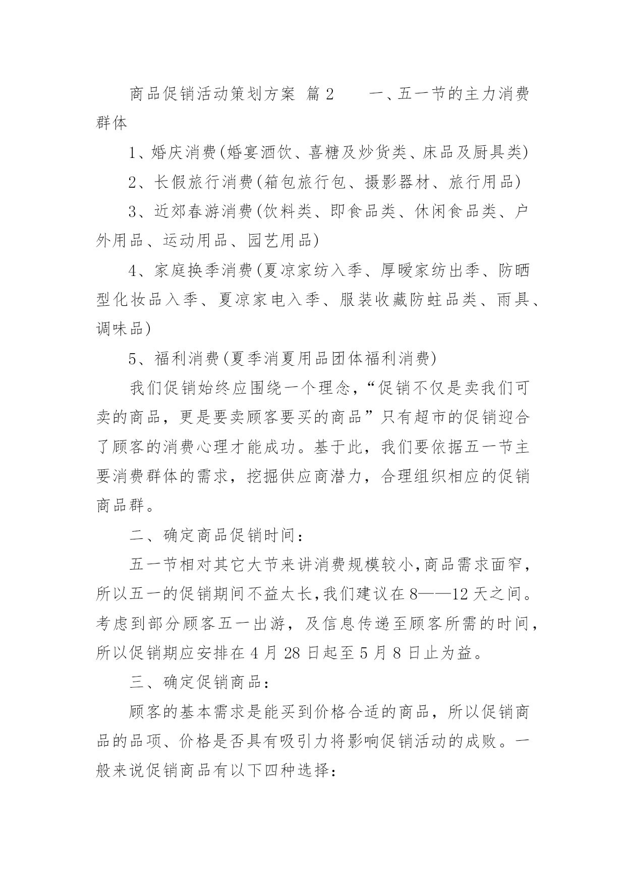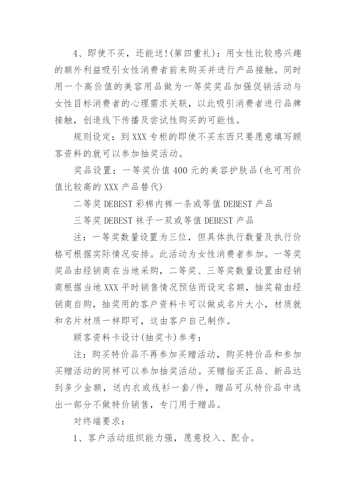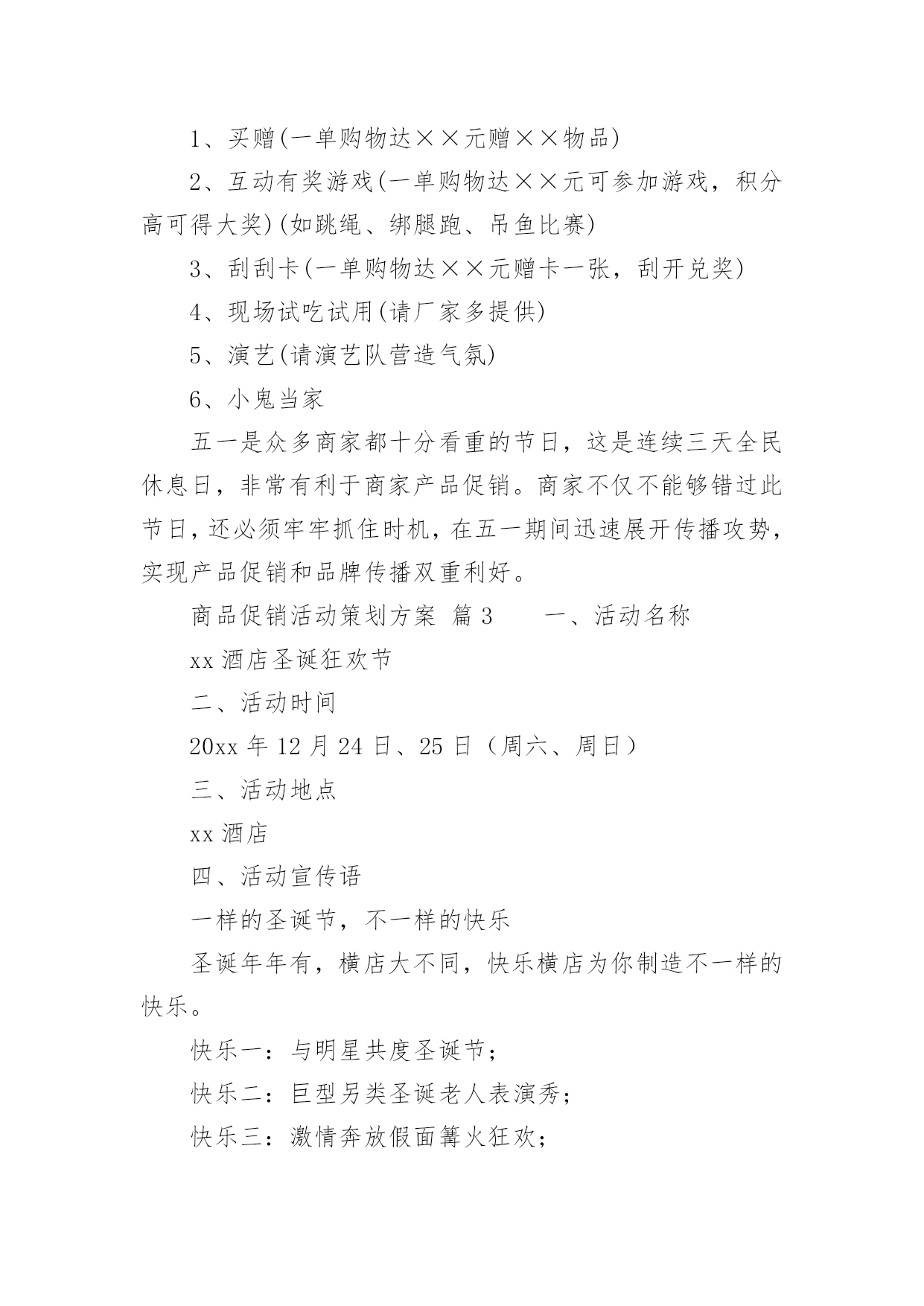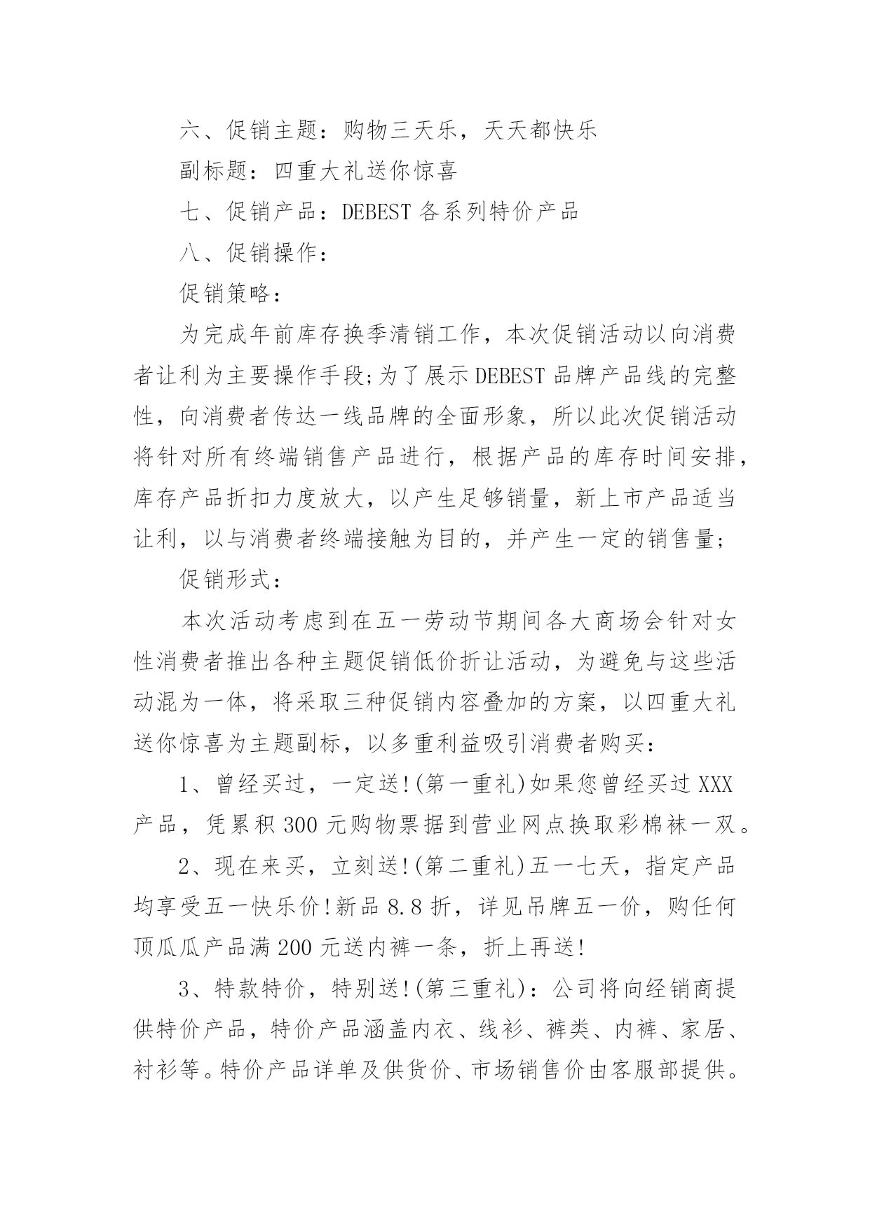 商品促销活动策划方案商品促销活动策划方案(精选16篇)为了确保活动得以顺利进行,就需要我们事先制定活动方案,活动方案的内容和形式都要围绕着活动的主题来展开,最终达到活动的目的或者意义。活动方案要怎么制定呢?下面是小编整理的商品促销活动策划方案(精选16篇),欢迎阅读,希望大家能够喜欢。商品促销活动策划方案篇1一、促销目的:利用五一假期,进行大规模促销活动,提高产品销量,消化库存和换季产品,刺激渠道的活跃性,并有效掌握消费者的顾客资料。二、促销对象:XXX的目标消费群三、促销时间:20xx年5月1日到5月3日,根据需要可适当提前或者延长促销区间,以保证促销活动最大量接触消费者四、促销城市:全国XXX零售网点。大型促销活动地点主要放在三级市场及平时销售业绩不好的城市,这么做一可而已避免大面积的伤害品牌形象,二是可以大幅度提高XXX在当地的销售业绩和知名度。五、促销方式:运用强有效的价格利器,采用多重优惠组合,以造成彩棉革命和大普及的气势,凸显强势品牌和强势营销的风范。六、促销主题:购物三天乐,天天都快乐副标题:四重大礼送你惊喜七、促销产品:DEBEST各系列特价产品八、促销操作:促销策略:为完成年前库存换季清销工作,本次促销活动以向消费者让利为主要操作手段;为了展示DEBEST品牌产品线的完整性,向消费者传达一线品牌的全面形象,所以此次促销活动将针对所有终端销售产品进行,根据产品的库存时间安排,库存产品折扣力度放大,以产生足够销量,新上市产品适当让利,以与消费者终端接触为目的,并产生一定的销售量;促销形式:本次活动考虑到在五一劳动节期间各大商场会针对女性消费者推出各种主题促销低价折让活动,为避免与这些活动混为一体,将采取三种促销内容叠加的方案,以四重大礼送你惊喜为主题副标,以多重利益吸引消费者购买:1、曾经买过,一定送!(第一重礼)如果您曾经买过XXX产品,凭累积300元购物票据到营业网点换取彩棉袜一双。2、现在来买,立刻送!(第二重礼)五一七天,指定产品均享受五一快乐价!新品8.8折,详见吊牌五一价,购任何顶瓜瓜产品满200元送内裤一条,折上再送!3、特款特价,特别送!(第三重礼):公司将向经销商提供特价产品,特价产品涵盖内衣、线衫、裤类、内裤、家居、衬衫等。特价产品详单及供货价、市场销售价由客服部提供。4、即使不买,还能送!(第四重礼):用女性比较感兴趣的额外利益吸引女性消费者前来购买并进行产品接触。同时用一个高价值的美容用品做为一等奖奖品加强促销活动与女性目标消费者的心理需求关联,以此吸引消费者进行品牌接触,创造线下传播及尝试性购买的可能性。规则设定:到XXX专柜的即使不买东西只要愿意填写顾客资料的就可以参加抽奖活动。奖品设置:一等奖价值400元的美容护肤品(也可用价值比较高的XXX产品替代)二等奖DEBEST彩棉内裤一条或等值DEBEST产品三等奖DEBEST袜子一双或等值DEBEST产品注:一等奖数量设置为三位,但具体执行数量及执行价格可根据实际情况安排。此活动为女性消费者参加。一等奖奖品由经销商在当地采购,二等奖、三等奖数量设置由经销商根据当地XXX平时销售情况预估而设定名额,抽奖箱由经销商自购,抽奖用的客户资料卡可以做成名片大小,材质就和名片材质一样即可,这由客户自己制作。顾客资料卡设计(抽奖卡)参考:注:购买特价品不再参加买赠活动,购买特价品和参加买赠活动的同样可以参加抽奖活动。买赠指买正品、新品达到多少金额,送内衣或线衫一套/件,赠品可从特价品中选出一部分不做特价销售,专门用于赠品。对终端要求:1、客户活动组织能力强,愿意投入、配合。2、五一活动前有大量备货,活动前有一定量的广告宣传。3、严格按照公司制定的促销价格执行,如不能按统一的促销价销售,公司将对其进行严厉处罚。促销物料准备(每活动点):1、吊旗16--20面/10平方;2、DM宣传单1000/点3、海报1张/点注:吊旗、DM单、海报公司可统一制作,营销经理需提前和客户沟通,做好统计,4月15之前将各个数量报回公司客服部,以便公司及时安排印刷。九、大型促销活动准备:1、活动期间活动点派销售人员在各大商场入口处派发活动DM单页;2、活动点于4月18日门店或专卖点营业结束在门店内或专卖点内悬挂活动主题吊旗,张贴海报,用于吸引消费者驻足观望并烘托主题活动氛围;3、各专卖点醒目处放置主题背景及内容说明物料一个(X展架或其他物料);4、活动面积至少保证50平米以上,可选择商场门前或步行接的露天广场,也可选择商场内的活动广场,因为五一搞活动的品牌、厂家很多,所以场地要提前洽谈,越早越好。5、为加强活动的吸引力和现场的气氛,客户可同时在活动场地举办模特走秀、歌舞表演或当地老百姓喜欢的特色娱乐活动。在搞这些活动时,准备工作一定要做好,现场舞台的搭置、主持人的挑选,演员