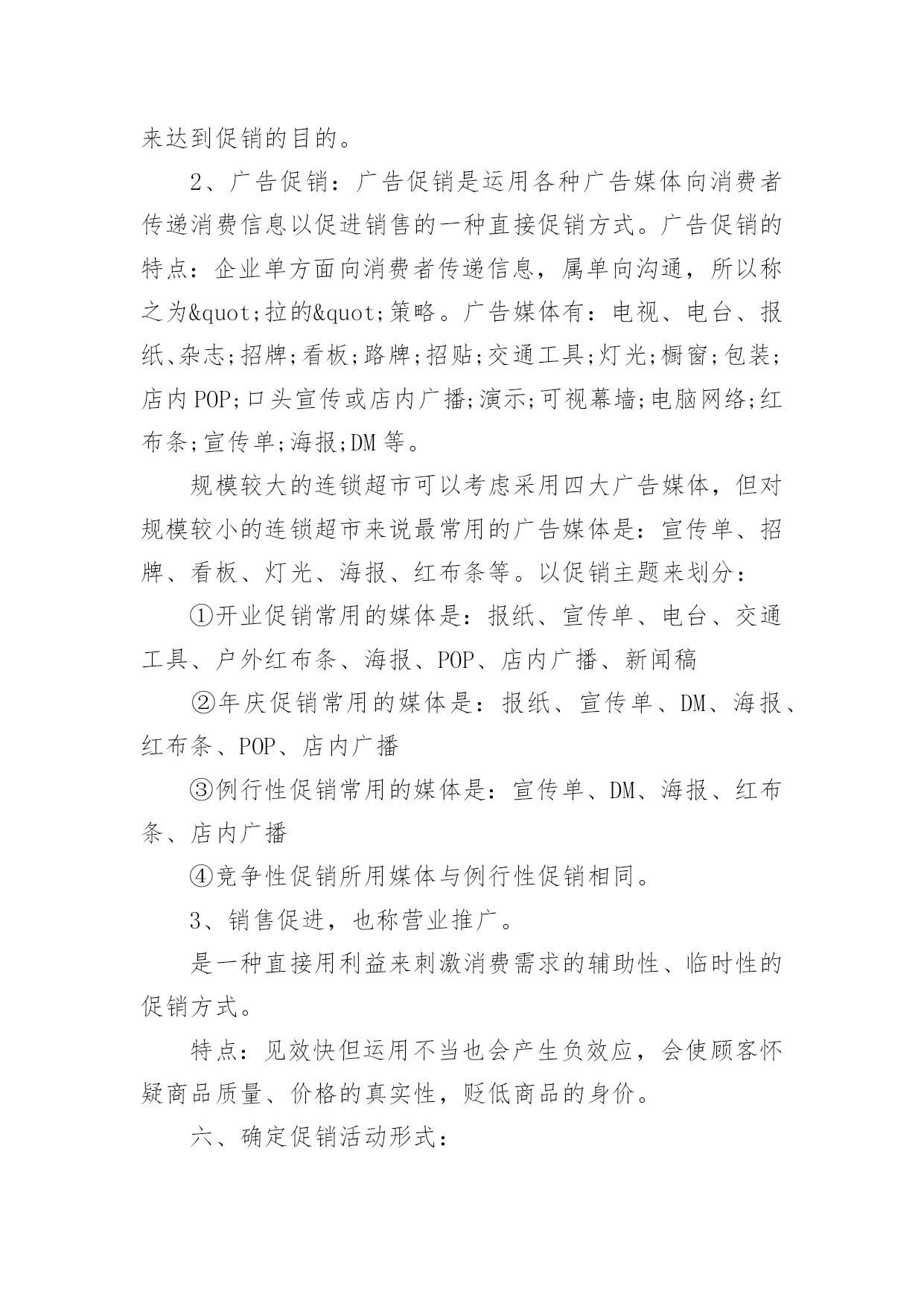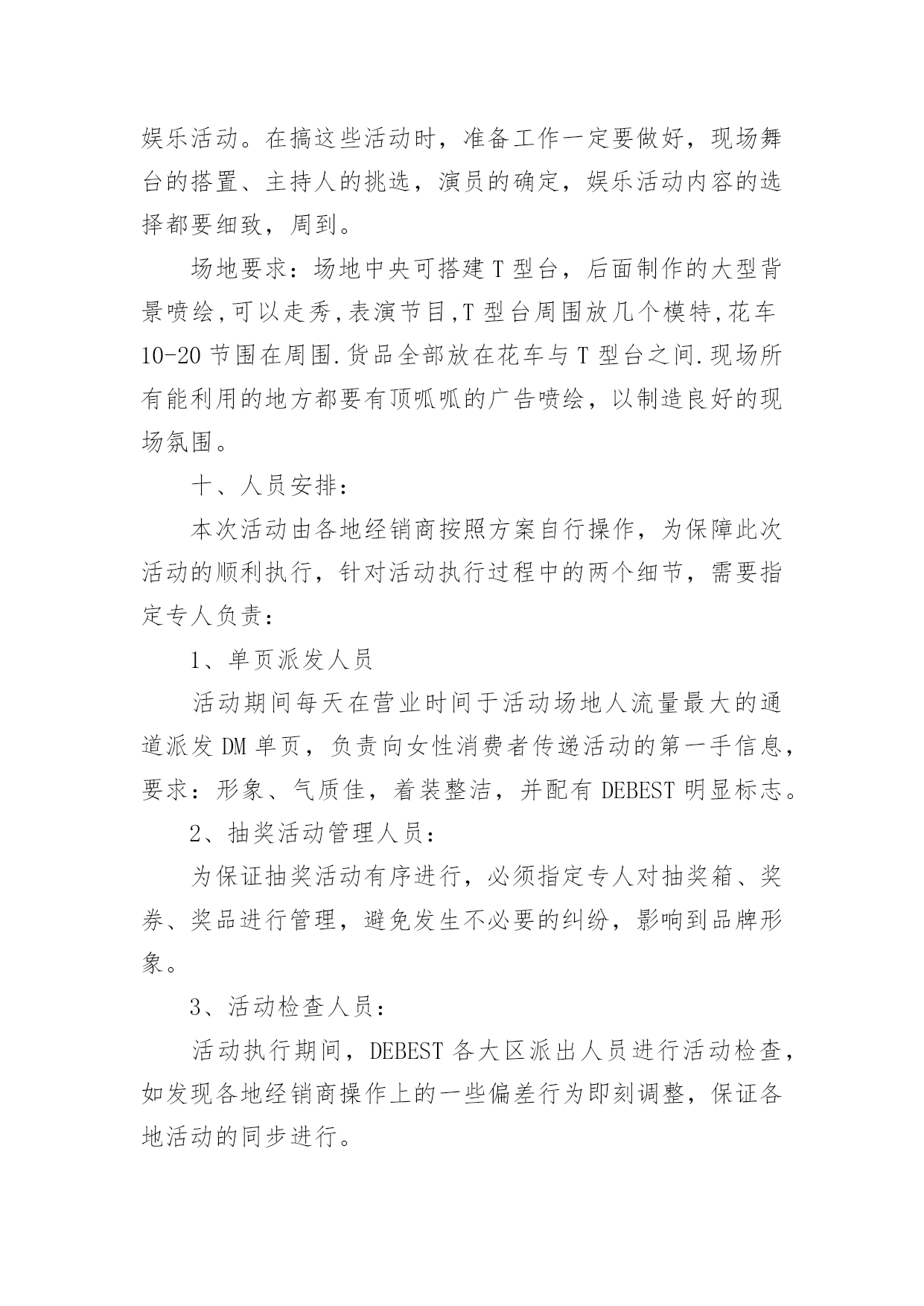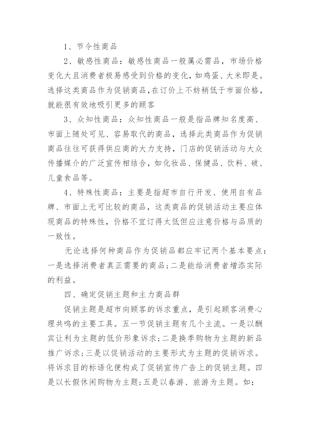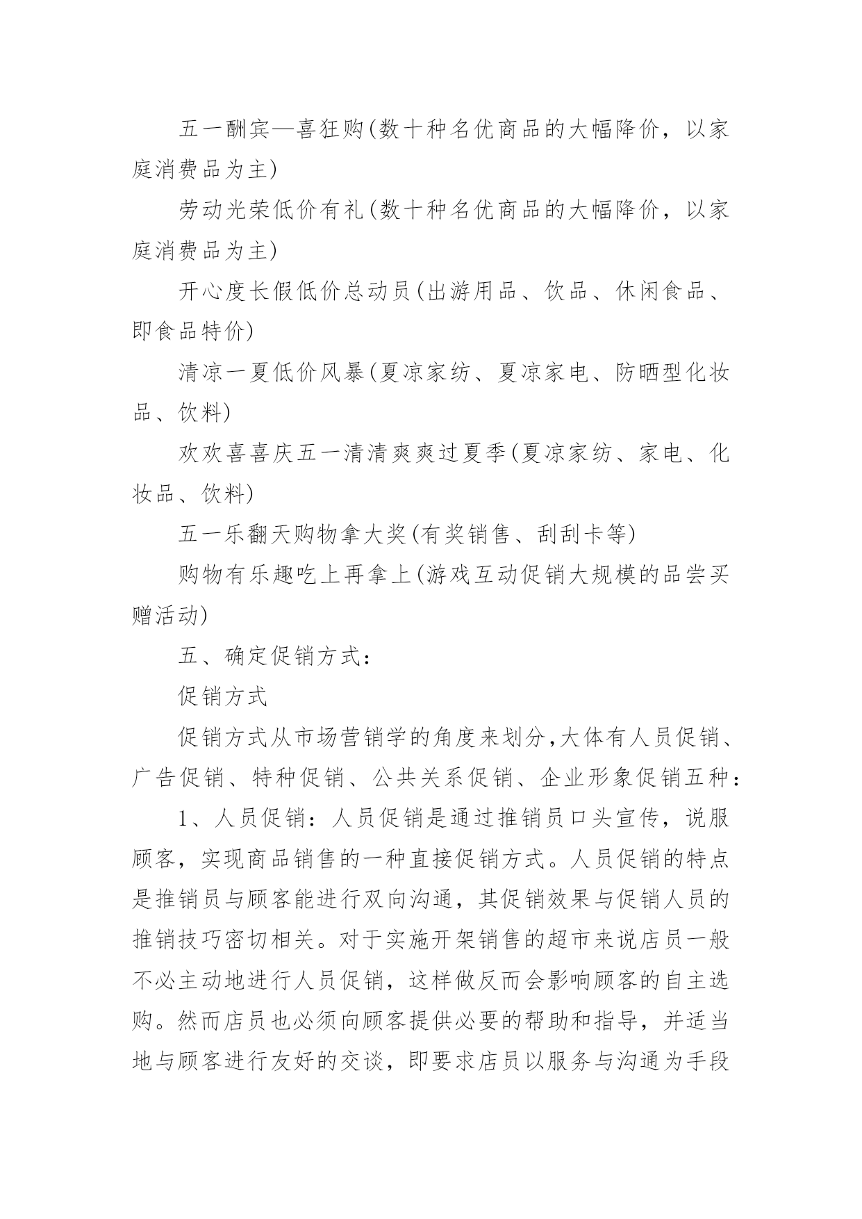 商品促销活动策划方案商品促销活动策划方案(精选16篇)为了确保活动得以顺利进行,就需要我们事先制定活动方案,活动方案的内容和形式都要围绕着活动的主题来展开,最终达到活动的目的或者意义。活动方案要怎么制定呢?下面是小编整理的商品促销活动策划方案(精选16篇),欢迎阅读,希望大家能够喜欢。商品促销活动策划方案篇1一、促销目的:利用五一假期,进行大规模促销活动,提高产品销量,消化库存和换季产品,刺激渠道的活跃性,并有效掌握消费者的顾客资料。二、促销对象:XXX的目标消费群三、促销时间:20xx年5月1日到5月3日,根据需要可适当提前或者延长促销区间,以保证促销活动最大量接触消费者四、促销城市:全国XXX零售网点。大型促销活动地点主要放在三级市场及平时销售业绩不好的城市,这么做一可而已避免大面积的伤害品牌形象,二是可以大幅度提高XXX在当地的销售业绩和知名度。五、促销方式:运用强有效的价格利器,采用多重优惠组合,以造成彩棉革命和大普及的气势,凸显强势品牌和强势营销的风范。六、促销主题:购物三天乐,天天都快乐副标题:四重大礼送你惊喜七、促销产品:DEBEST各系列特价产品八、促销操作:促销策略:为完成年前库存换季清销工作,本次促销活动以向消费者让利为主要操作手段;为了展示DEBEST品牌产品线的完整性,向消费者传达一线品牌的全面形象,所以此次促销活动将针对所有终端销售产品进行,根据产品的库存时间安排,库存产品折扣力度放大,以产生足够销量,新上市产品适当让利,以与消费者终端接触为目的,并产生一定的销售量;促销形式:本次活动考虑到在五一劳动节期间各大商场会针对女性消费者推出各种主题促销低价折让活动,为避免与这些活动混为一体,将采取三种促销内容叠加的方案,以四重大礼送你惊喜为主题副标,以多重利益吸引消费者购买:1、曾经买过,一定送!(第一重礼)如果您曾经买过XXX产品,凭累积300元购物票据到营业网点换取彩棉袜一双。2、现在来买,立刻送!(第二重礼)五一七天,指定产品均享受五一快乐价!新品8.8折,详见吊牌五一价,购任何顶瓜瓜产品满200元送内裤一条,折上再送!3、特款特价,特别送!(第三重礼):公司将向经销商提供特价产品,特价产品涵盖内衣、线衫、裤类、内裤、家居、衬衫等。特价产品详单及供货价、市场销售价由客服部提供。4、即使不买,还能送!(第四重礼):用女性比较感兴趣的额外利益吸引女性消费者前来购买并进行产品接触。同时用一个高价值的美容用品做为一等奖奖品加强促销活动与女性目标消费者的心理需求关联,以此吸引消费者进行品牌接触,创造线下传播及尝试性购买的可能性。规则设定:到XXX专柜的即使不买东西只要愿意填写顾客资料的就可以参加抽奖活动。奖品设置:一等奖价值400元的美容护肤品(也可用价值比较高的XXX产品替代)二等奖DEBEST彩棉内裤一条或等值DEBEST产品三等奖DEBEST袜子一双或等值DEBEST产品注:一等奖数量设置为三位,但具体执行数量及执行价格可根据实际情况安排。此活动为女性消费者参加。一等奖奖品由经销商在当地采购,二等奖、三等奖数量设置由经销商根据当地XXX平时销售情况预估而设定名额,抽奖箱由经销商自购,抽奖用的客户资料卡可以做成名片大小,材质就和名片材质一样即可,这由客户自己制作。顾客资料卡设计(抽奖卡)参考:注:购买特价品不再参加买赠活动,购买特价品和参加买赠活动的同样可以参加抽奖活动。买赠指买正品、新品达到多少金额,送内衣或线衫一套/件,赠品可从特价品中选出一部分不做特价销售,专门用于赠品。对终端要求:1、客户活动组织能力强,愿意投入、配合。2、五一活动前有大量备货,活动前有一定量的广告宣传。3、严格按照公司制定的促销价格执行,如不能按统一的促销价销售,公司将对其进行严厉处罚。促销物料准备(每活动点):1、吊旗16--20面/10平方;2、DM宣传单1000/点3、海报1张/点注:吊旗、DM单、海报公司可统一制作,营销经理需提前和客户沟通,做好统计,4月15之前将各个数量报回公司客服部,以便公司及时安排印刷。九、大型促销活动准备:1、活动期间活动点派销售人员在各大商场入口处派发活动DM单页;2、活动点于4月18日门店或专卖点营业结束在门店内或专卖点内悬挂活动主题吊旗,张贴海报,用于吸引消费者驻足观望并烘托主题活动氛围;3、各专卖点醒目处放置主题背景及内容说明物料一个(X展架或其他物料);4、活动面积至少保证50平米以上,可选择商场门前或步行接的露天广场,也可选择商场内的活动广场,因为五一搞活动的品牌、厂家很多,所以场地要提前洽谈,越早越好。5、为加强活动的吸引力和现场的气氛,客户可同时在活动场地举办模特走秀、歌舞表演或当地老百姓喜欢的特色娱乐活动。在搞这些活动时,准备工作一定要做好,现场舞台的搭置、主持人的挑选,演员