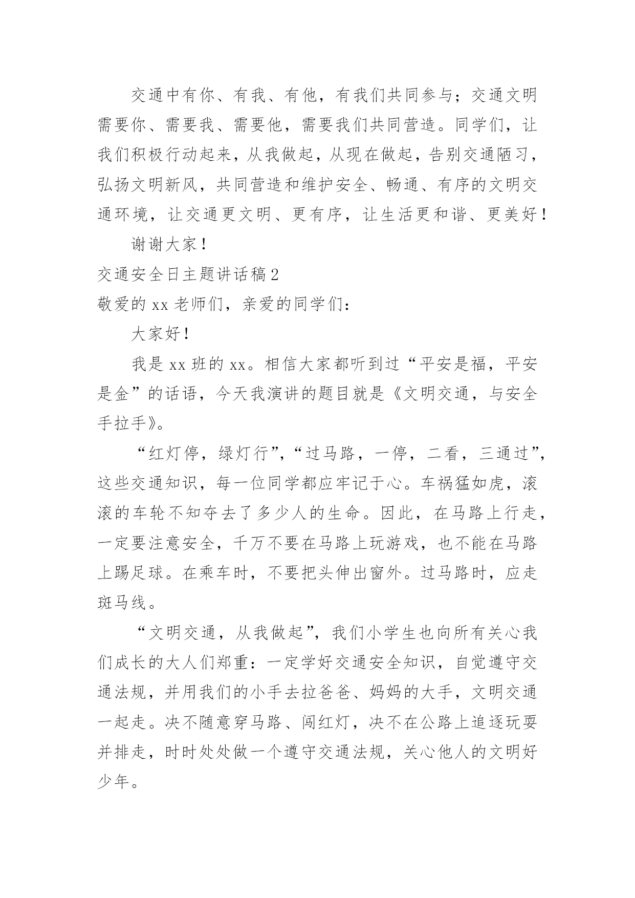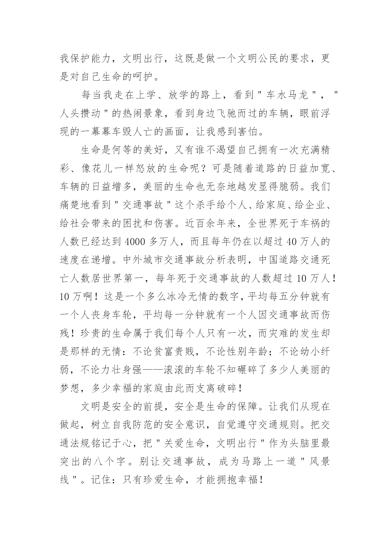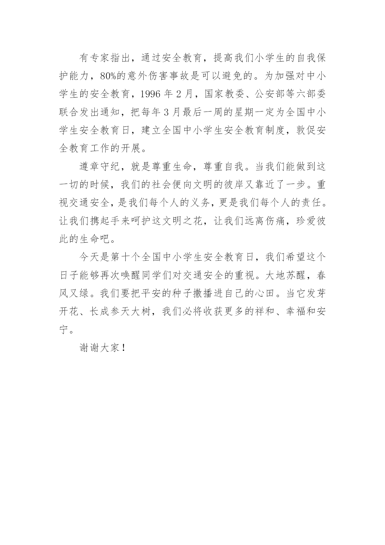 交通安全日主题讲话稿交通安全日主题讲话稿随着社会不断地进步,越来越多地方需要用到讲话稿,讲话稿可以按照用途、性质等来划分,是演讲上一个重要的准备工作。相信很多朋友都对写讲话稿感到非常苦恼吧,下面是小编收集整理的交通安全日主题讲话稿,欢迎阅读与收藏。交通安全日主题讲话稿1亲爱的xx同学们:大家好!朋友们,在这人海如潮、车轮滚滚的现实社会中,我们最需要的是什么?是漂亮的玩具,还是诱人的糕点?我认为我们最需要的是——平安!我们有了平安,爷爷、奶奶才能以休闲的心情漫步在夕阳下;我们有了平安,爸爸、妈妈才能在平凡的岗位上默默地奉献;我们有了平安,才能在优美的学校环境下,孜孜不倦地学习。"孩子,看着脚下的石头。"这是母亲在我蹒跚学步时的指点。"当心路上的汽车啊!"这是父亲在送我上学时身后的叮咛。"高高兴兴上学,平平安安回家",这是你、我、他交通安全的`祝福。随着我国经济的飞速发展,道路宽了,车辆多了,我们在享受现代文明带来便利时,也面临着突如其来的灾祸。这就要求我们在出行时增强安全意识,提高自我保护能力,文明出行,这既是做一个文明公民的要求,更是对自己生命的呵护。每当我走在上学、放学的路上,看到"车水马龙","人头攒动"的热闹景象,看到身边飞驰而过的车辆,眼前浮现的一幕幕车毁人亡的画面,让我感到害怕。生命是何等的美好,又有谁不渴望自己拥有一次充满精彩、像花儿一样怒放的生命呢?可是随着道路的日益加宽、车辆的日益增多,美丽的生命也无奈地越发显得脆弱。我们痛楚地看到"交通事故"这个杀手给个人、给家庭、给企业、给社会带来的困扰和伤害。近百余年来,全世界死于车祸的人数已经达到4000多万人,而且每年仍在以超过40万人的速度在递增。中外城市交通事故分析表明,中国道路交通死亡人数居世界第一,每年死于交通事故的人数超过10万人!10万啊!这是一个多么冰冷无情的数字,平均每五分钟就有一个人丧身车轮,平均每一分钟就有一个人因交通事故而伤残!珍贵的生命属于我们每个人只有一次,而灾难的发生却是那样的无情:不论贫富贵贱,不论性别年龄;不论幼小纤弱,不论力壮身强——滚滚的车轮不知碾碎了多少人美丽的梦想,多少幸福的家庭由此而支离破碎!文明是安全的前提,安全是生命的保障。让我们从现在做起,树立自我防范的安全意识,自觉遵守交通规则。把交通法规铭记于心,把"关爱生命,文明出行"作为头脑里最突出的八个字。别让交通事故,成为马路上一道"风景线"。记住:只有珍爱生命,才能拥抱幸福!交通中有你、有我、有他,有我们共同参与;交通文明需要你、需要我、需要他,需要我们共同营造。同学们,让我们积极行动起来,从我做起,从现在做起,告别交通陋习,弘扬文明新风,共同营造和维护安全、畅通、有序的文明交通环境,让交通更文明、更有序,让生活更和谐、更美好!谢谢大家!交通安全日主题讲话稿2敬爱的xx老师们,亲爱的同学们:大家好!我是xx班的xx。相信大家都听到过“平安是福,平安是金”的话语,今天我演讲的题目就是《文明交通,与安全手拉手》。“红灯停,绿灯行”,“过马路,一停,二看,三通过”,这些交通知识,每一位同学都应牢记于心。车祸猛如虎,滚滚的车轮不知夺去了多少人的生命。因此,在马路上行走,一定要注意安全,千万不要在马路上玩游戏,也不能在马路上踢足球。在乘车时,不要把头伸出窗外。过马路时,应走斑马线。“文明交通,从我做起”,我们小学生也向所有关心我们成长的大人们郑重:一定学好交通安全知识,自觉遵守交通法规,并用我们的小手去拉爸爸、妈妈的大手,文明交通一起走。决不随意穿马路、闯红灯,决不在公路上追逐玩耍并排走,时时处处做一个遵守交通法规,关心他人的文明好少年。有专家指出,通过安全教育,提高我们小学生的自我保护能力,80%的意外伤害事故是可以避免的。为加强对中小学生的安全教育,1996年2月,国家教委、公安部等六部委联合发出通知,把每年3月最后一周的星期一定为全国中小学生安全教育日,建立全国中小学生安全教育制度,敦促安全教育工作的开展。遵章守纪,就是尊重生命,尊重自我。当我们能做到这一切的时候,我们的社会便向文明的彼岸又靠近了一步。重视交通安全,是我们每个人的义务,更是我们每个人的责任。让我们携起手来呵护这文明之花,让我们远离伤痛,珍爱彼此的生命吧。今天是第十个全国中小学生安全教育日,我们希望这个日子能够再次唤醒同学们对交通安全的重视。大地苏醒,春风又绿。我们要把平安的种子撒播进自己的心田。当它发芽开花、长成参天大树,我们必将收获更多的祥和、幸福和安宁。谢谢大家!
