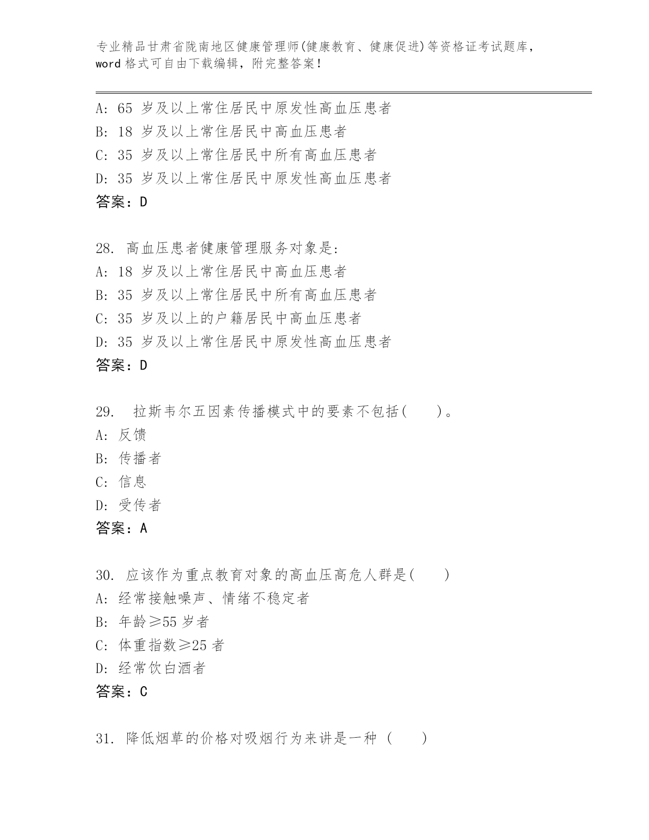 精编甘肃省陇南地区健康管理师(健康教育、健康促进)等资格证考试大全精品附答案