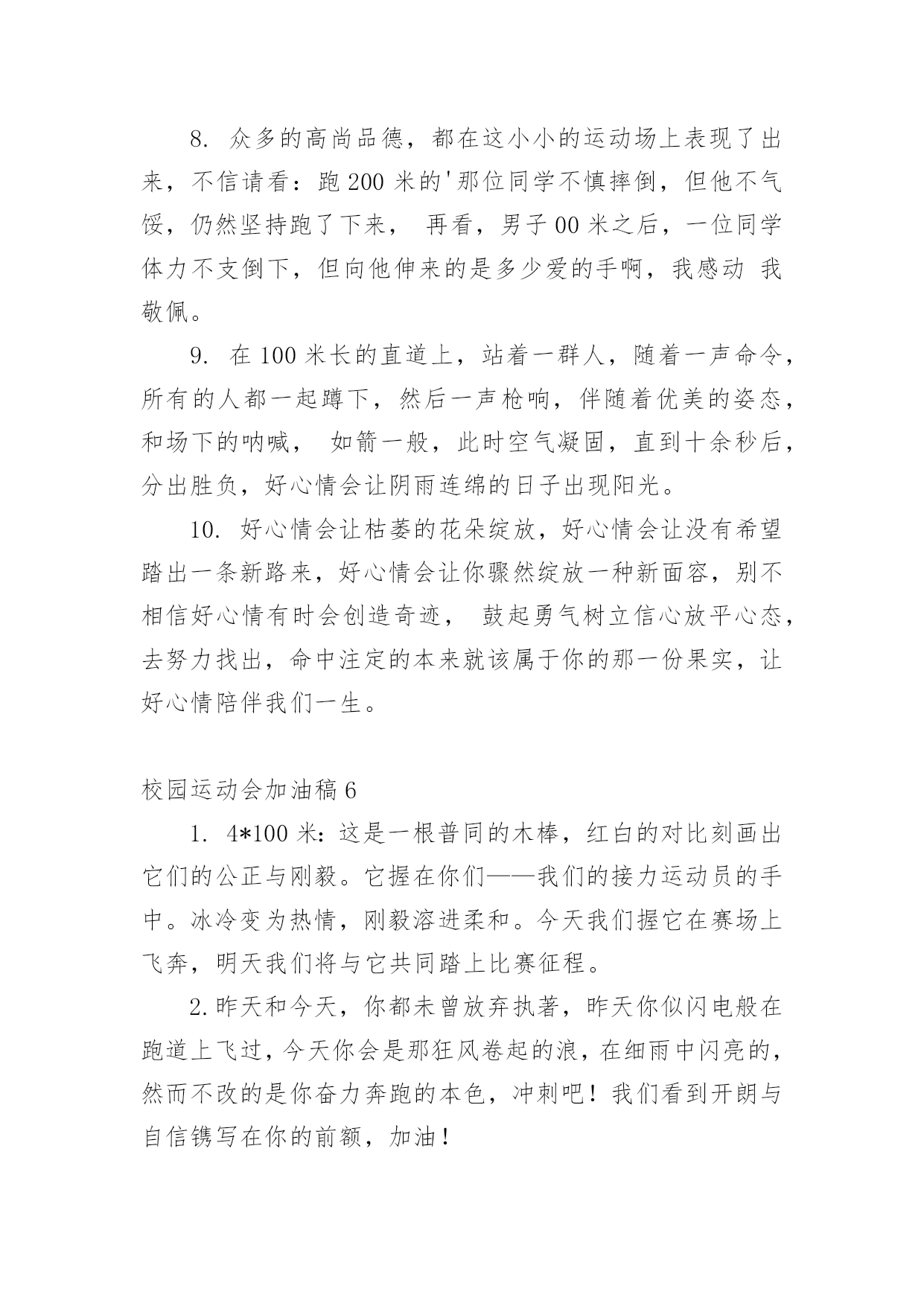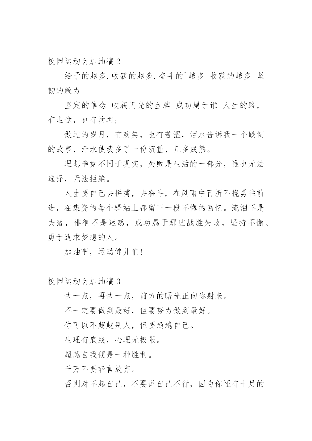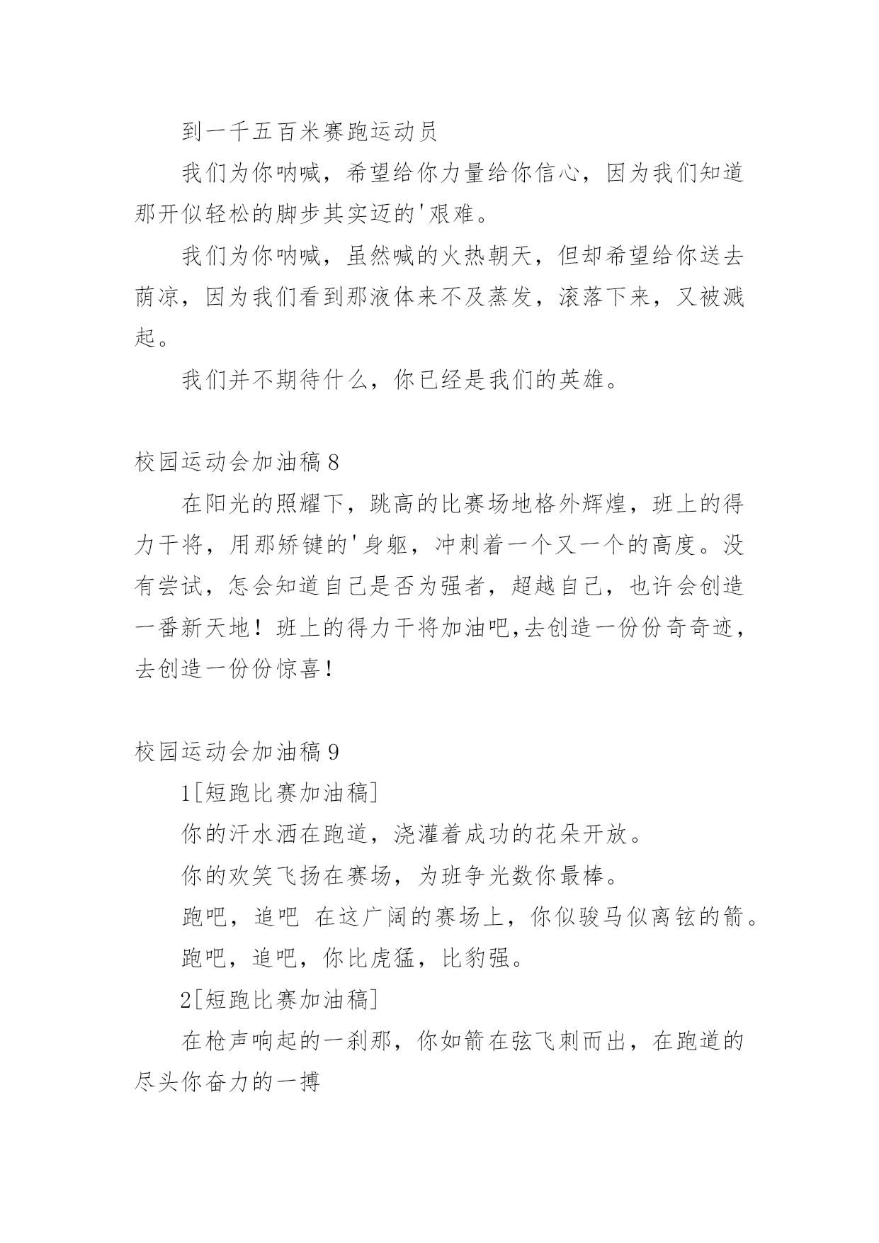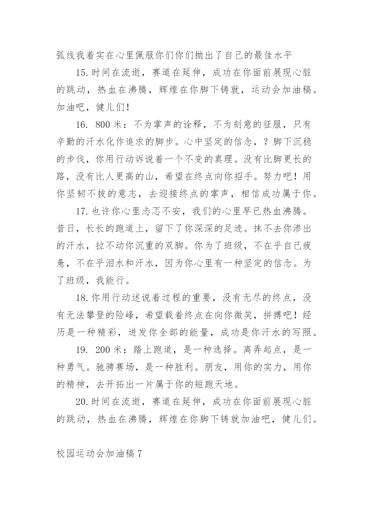 校园运动会加油稿校园运动会加油稿集合15篇在社会发展不断提速的今天,我们需要用到加油稿的情形越来越多,适当使用加油稿可以给对方打气加油。为了让您在写加油稿时更加简单方便,下面是小编整理的校园运动会加油稿,希望对大家有所帮助。校园运动会加油稿1为你们祝福,为你们喝彩。一声枪响伴着飒爽的秋风,你们亮出自己的风采,在这短短的100米中,你们与时间争分夺秒,只为了那最后的冲刺。不管结果如何,你们都是胜利者。因为,你们曾与时间竞赛。走过一段很长的路,你用青春的脚步,敲出铿锵的音符。成功融入笑容,失败也有幸福。一双双期盼的目光,每个人脚下都有一条成功之路。为拼搏喝彩在黑白相间的.跑道上,留下了你们灿烂的身影。在枪响的那一刹那,似流星、似闪电,如骏马奔腾,如蛟龙腾空,如猛虎出洞,不在乎名次高低,不在乎成绩高下。努力拼搏,顽强奋斗,即使落后,也顽强不屈,永不退缩!校园运动会加油稿2给予的越多.收获的越多.奋斗的`越多收获的越多坚韧的毅力坚定的信念收获闪光的金牌成功属于谁人生的路,有坦途,也有坎坷;做过的岁月,有欢笑,也有苦涩,泪水告诉我一个跌倒的故事,汗水使我多了一份沉重,几多成熟。理想毕竟不同于现实,失败是生活的一部分,谁也无法选择,无法拒绝。人生要自己去拼搏,去奋斗,在风雨中百折不挠勇往前进,在集资的每个驿站上都留下一段不悔的回忆。流泪不是失落,徘徊不是迷惑,成功属于那些战胜失败,坚持不懈、勇于追求梦想的人。加油吧,运动健儿们!校园运动会加油稿3快一点,再快一点,前方的曙光正向你射来。不一定要做到最好,但要努力做到最好。你可以不超越别人,但要超越自己。生理有底线,心理无极限。超越自我便是一种胜利。千万不要轻言放弃。否则对不起自己,不要说自己不行,因为你还有十足的潜力。校园运动会加油稿4跑道上,你正在飞驰,面对如此遥远的路途,你也许腿脚发麻,你也许有些茫然。但你可知道,在你身后,有同学们一双双期待的眼睛;在你身后,是你日日苦练的汗水。鼓起勇气,奋勇向前吧!力量;声声助威,见证了你们的`实力与拼搏。绵绵青山困不住你飞扬的梦想,滔滔江河阻不住你向上的步伐,漫漫黑夜挡不住你望向黎明的眼神,炎炎烈日盖不住你激昂的斗志。健儿们,如果你是雄鹰,那就飞得更高;如果你是高山,那就屹立不倒;如果你是劲松,那就不为霜雪;如果你是红梅,那就凌寒独放。健儿们,狭路相逢勇者胜,风雨赛场我为王!健儿们,向上吧!前进吧!拼搏吧!今日的赛场上,你就是王!校园运动会加油稿51.场上英姿显自豪,脚下步伐在飞奔。你们是骄傲。你们是自豪,跑道因你幻彩,面对红色跑道,你们挥洒自如,不惧一切冲向重点,2.面对艰苦的征程,你们毫不畏惧,接力棒在你们手中传递着集体的力量,听,我们在为你呐喊,你们诠释着奥运的精神,你们是我们心中的骄傲,深深的呼吸,等待你的是艰难的800米。相信胜利会属于你们,但在这征途上,需要你勇敢的心去面对。我们在为你加油,你是否听到了我们发自内心的呐喊,困难和胜利都在向你招手,去呀,不要犹豫,快去击败困难,快去夺取胜利,相信你会送给我们一个汗水浸湿的微笑3.大海如此的浩淼,鼓声多么美妙,运动员们,你们不再像平时那样渺小,我们默默的祈祷,以你们为骄傲,我们会永远为你们叫好,4.看,终点就在眼前,听,同学为你呼喊。鼓起勇气奋力向前,用你的荣誉带给我们希望。5.看!那一面面迎风飘舞的彩旗,是一朵朵盛开的鲜花;听!那一阵阵惊天动地的欢呼,是回响在耳边胜利的风声。运动场上的你们,是胜利的标志,运动场上的你们,是青春的赞叹。去吧!去迎接那伟大的挑战,去吧!去做一名追风的少年。6.人生的路,有坦途,也有坎坷;做过的岁月,有欢笑,也有苦涩,泪水告诉我一个跌倒的故事,汗水使我多了一份沉重,几多成熟。7.理想毕竟不同于现实,失败是生活的一部分,谁也无法选择,无法拒绝。人生要自己去拼搏,去奋斗,在风雨中百折不挠勇往前进,在集资的每个驿站上都留下一段不悔的回忆。流泪不是失落,徘徊不是迷惑,成功属于那些战胜失败,坚持不懈、勇于追求梦想的人。加油吧,运动健儿们!8.众多的高尚品德,都在这小小的运动场上表现了出来,不信请看:跑200米的'那位同学不慎摔倒,但他不气馁,仍然坚持跑了下来,再看,男子00米之后,一位同学体力不支倒下,但向他伸来的是多少爱的手啊,我感动我敬佩。9.在100米长的直道上,站着一群人,随着一声命令,所有的人都一起蹲下,然后一声枪响,伴随着优美的姿态,和场下的呐喊,如箭一般,此时空气凝固,直到十余秒后,分出胜负,好心情会让阴雨连绵的日子出现阳光。10.好心情会让枯萎的花朵绽放,好心情会让没有希望踏出一条新路来,好心情会让你骤然绽放一种新面容,别不相信好心情有时会创造奇迹,鼓起勇气树立信心放平心态,去努力找出,命中注定的本来就该属于你的那一份果实,让好心情陪伴我们一生。校园运