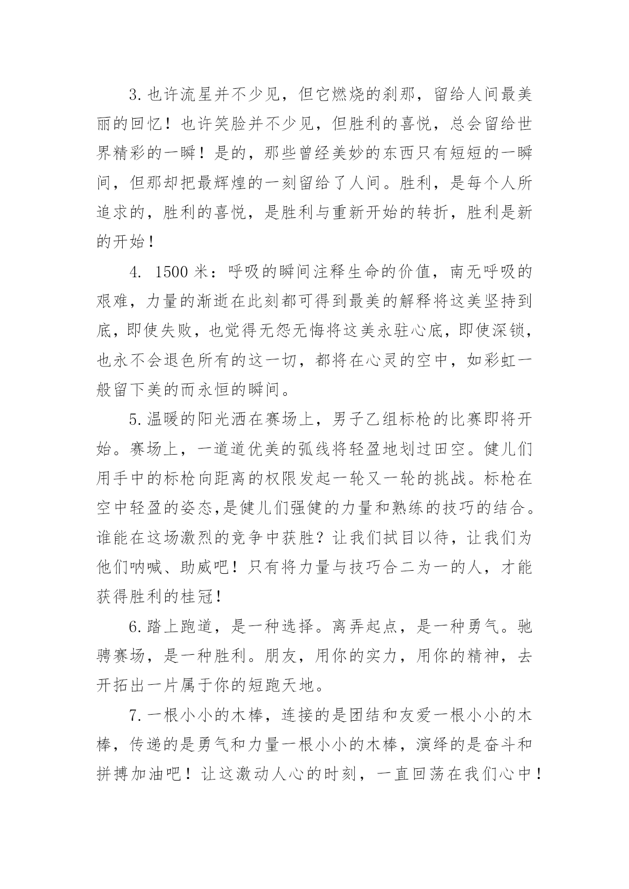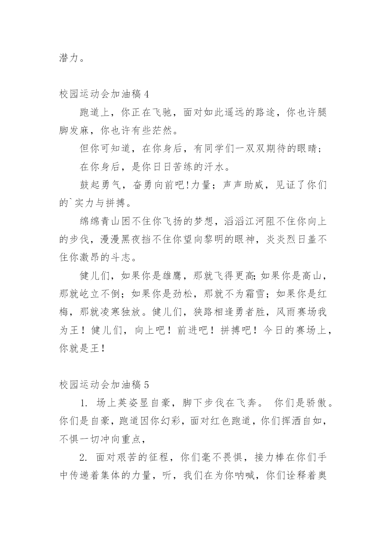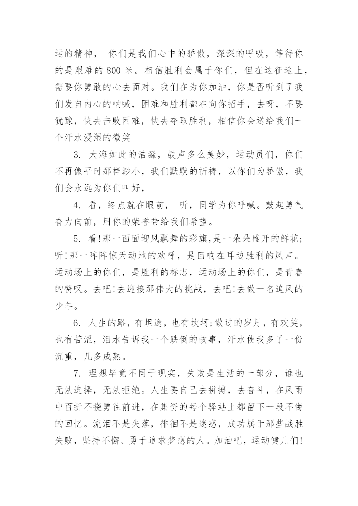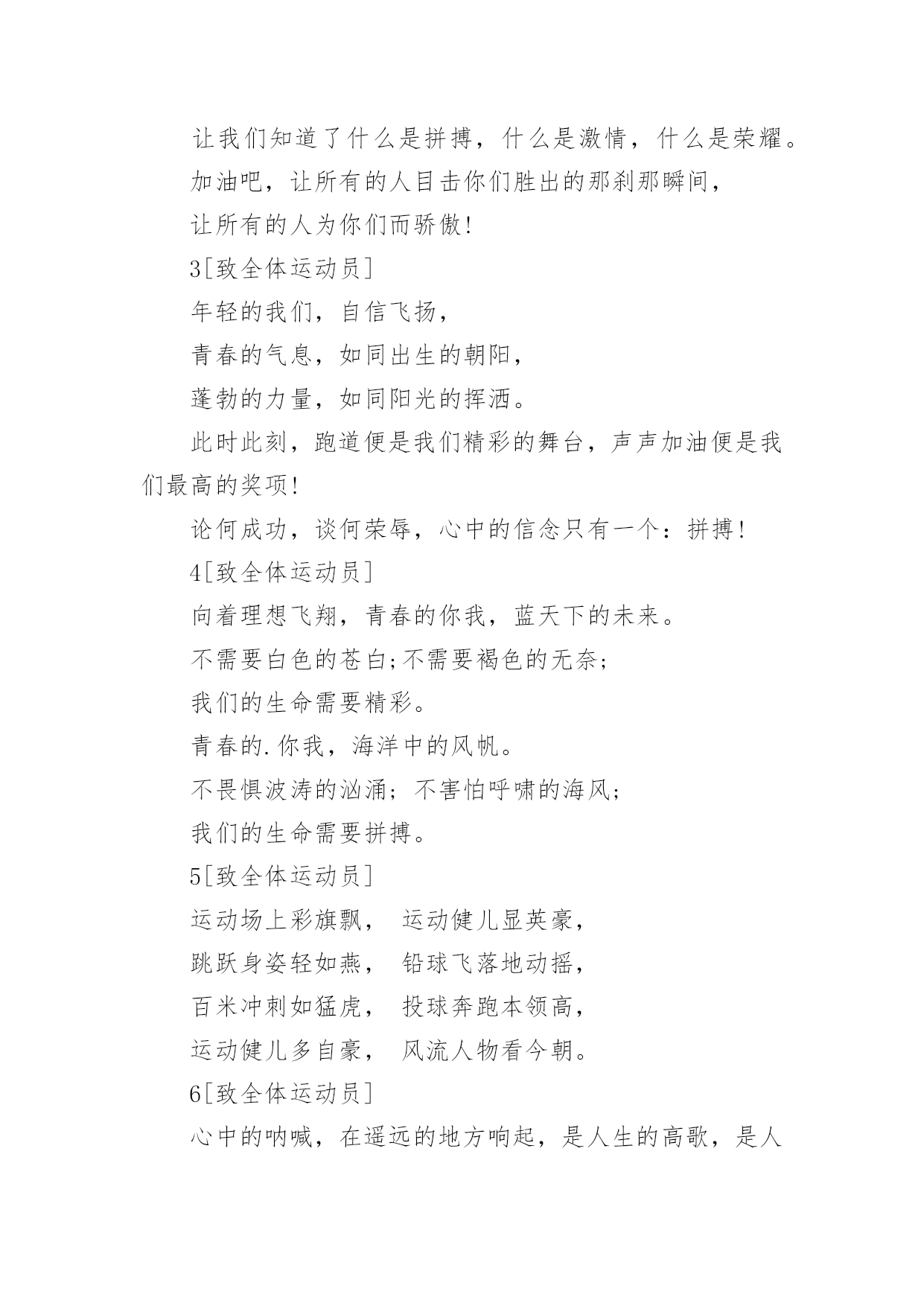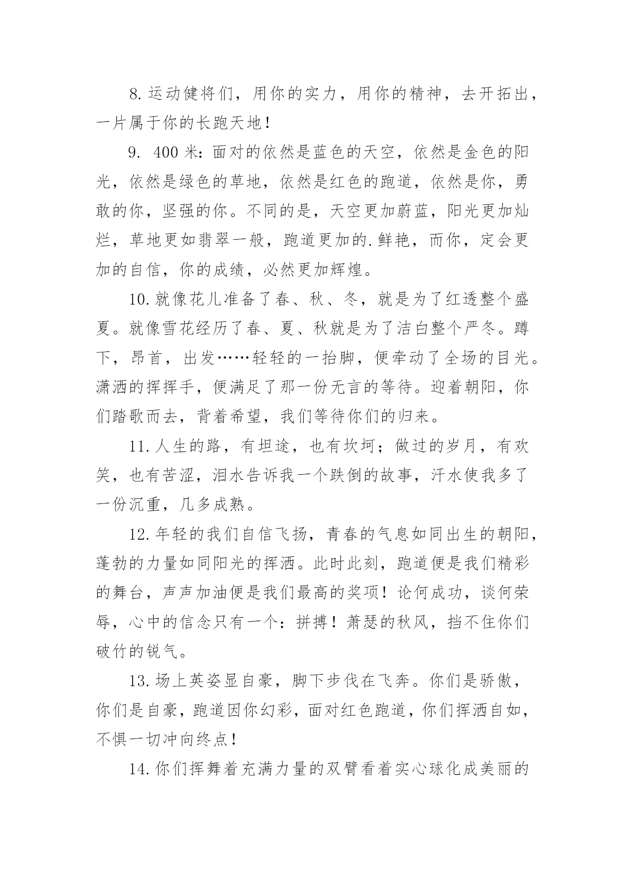 校园运动会加油稿校园运动会加油稿集合15篇在社会发展不断提速的今天,我们需要用到加油稿的情形越来越多,适当使用加油稿可以给对方打气加油。为了让您在写加油稿时更加简单方便,下面是小编整理的校园运动会加油稿,希望对大家有所帮助。校园运动会加油稿1为你们祝福,为你们喝彩。一声枪响伴着飒爽的秋风,你们亮出自己的风采,在这短短的100米中,你们与时间争分夺秒,只为了那最后的冲刺。不管结果如何,你们都是胜利者。因为,你们曾与时间竞赛。走过一段很长的路,你用青春的脚步,敲出铿锵的音符。成功融入笑容,失败也有幸福。一双双期盼的目光,每个人脚下都有一条成功之路。为拼搏喝彩在黑白相间的.跑道上,留下了你们灿烂的身影。在枪响的那一刹那,似流星、似闪电,如骏马奔腾,如蛟龙腾空,如猛虎出洞,不在乎名次高低,不在乎成绩高下。努力拼搏,顽强奋斗,即使落后,也顽强不屈,永不退缩!校园运动会加油稿2给予的越多.收获的越多.奋斗的`越多收获的越多坚韧的毅力坚定的信念收获闪光的金牌成功属于谁人生的路,有坦途,也有坎坷;做过的岁月,有欢笑,也有苦涩,泪水告诉我一个跌倒的故事,汗水使我多了一份沉重,几多成熟。理想毕竟不同于现实,失败是生活的一部分,谁也无法选择,无法拒绝。人生要自己去拼搏,去奋斗,在风雨中百折不挠勇往前进,在集资的每个驿站上都留下一段不悔的回忆。流泪不是失落,徘徊不是迷惑,成功属于那些战胜失败,坚持不懈、勇于追求梦想的人。加油吧,运动健儿们!校园运动会加油稿3快一点,再快一点,前方的曙光正向你射来。不一定要做到最好,但要努力做到最好。你可以不超越别人,但要超越自己。生理有底线,心理无极限。超越自我便是一种胜利。千万不要轻言放弃。否则对不起自己,不要说自己不行,因为你还有十足的潜力。校园运动会加油稿4跑道上,你正在飞驰,面对如此遥远的路途,你也许腿脚发麻,你也许有些茫然。但你可知道,在你身后,有同学们一双双期待的眼睛;在你身后,是你日日苦练的汗水。鼓起勇气,奋勇向前吧!力量;声声助威,见证了你们的`实力与拼搏。绵绵青山困不住你飞扬的梦想,滔滔江河阻不住你向上的步伐,漫漫黑夜挡不住你望向黎明的眼神,炎炎烈日盖不住你激昂的斗志。健儿们,如果你是雄鹰,那就飞得更高;如果你是高山,那就屹立不倒;如果你是劲松,那就不为霜雪;如果你是红梅,那就凌寒独放。健儿们,狭路相逢勇者胜,风雨赛场我为王!健儿们,向上吧!前进吧!拼搏吧!今日的赛场上,你就是王!校园运动会加油稿51.场上英姿显自豪,脚下步伐在飞奔。你们是骄傲。你们是自豪,跑道因你幻彩,面对红色跑道,你们挥洒自如,不惧一切冲向重点,2.面对艰苦的征程,你们毫不畏惧,接力棒在你们手中传递着集体的力量,听,我们在为你呐喊,你们诠释着奥运的精神,你们是我们心中的骄傲,深深的呼吸,等待你的是艰难的800米。相信胜利会属于你们,但在这征途上,需要你勇敢的心去面对。我们在为你加油,你是否听到了我们发自内心的呐喊,困难和胜利都在向你招手,去呀,不要犹豫,快去击败困难,快去夺取胜利,相信你会送给我们一个汗水浸湿的微笑3.大海如此的浩淼,鼓声多么美妙,运动员们,你们不再像平时那样渺小,我们默默的祈祷,以你们为骄傲,我们会永远为你们叫好,4.看,终点就在眼前,听,同学为你呼喊。鼓起勇气奋力向前,用你的荣誉带给我们希望。5.看!那一面面迎风飘舞的彩旗,是一朵朵盛开的鲜花;听!那一阵阵惊天动地的欢呼,是回响在耳边胜利的风声。运动场上的你们,是胜利的标志,运动场上的你们,是青春的赞叹。去吧!去迎接那伟大的挑战,去吧!去做一名追风的少年。6.人生的路,有坦途,也有坎坷;做过的岁月,有欢笑,也有苦涩,泪水告诉我一个跌倒的故事,汗水使我多了一份沉重,几多成熟。7.理想毕竟不同于现实,失败是生活的一部分,谁也无法选择,无法拒绝。人生要自己去拼搏,去奋斗,在风雨中百折不挠勇往前进,在集资的每个驿站上都留下一段不悔的回忆。流泪不是失落,徘徊不是迷惑,成功属于那些战胜失败,坚持不懈、勇于追求梦想的人。加油吧,运动健儿们!8.众多的高尚品德,都在这小小的运动场上表现了出来,不信请看:跑200米的'那位同学不慎摔倒,但他不气馁,仍然坚持跑了下来,再看,男子00米之后,一位同学体力不支倒下,但向他伸来的是多少爱的手啊,我感动我敬佩。9.在100米长的直道上,站着一群人,随着一声命令,所有的人都一起蹲下,然后一声枪响,伴随着优美的姿态,和场下的呐喊,如箭一般,此时空气凝固,直到十余秒后,分出胜负,好心情会让阴雨连绵的日子出现阳光。10.好心情会让枯萎的花朵绽放,好心情会让没有希望踏出一条新路来,好心情会让你骤然绽放一种新面容,别不相信好心情有时会创造奇迹,鼓起勇气树立信心放平心态,去努力找出,命中注定的本来就该属于你的那一份果实,让好心情陪伴我们一生。校园运