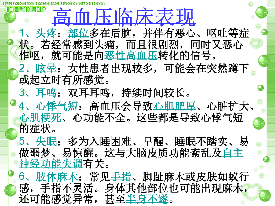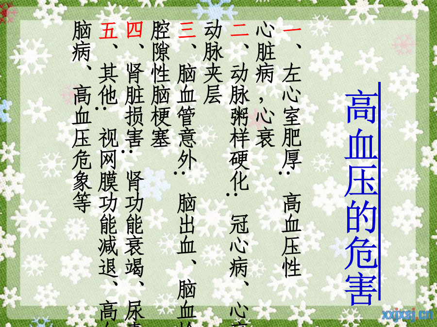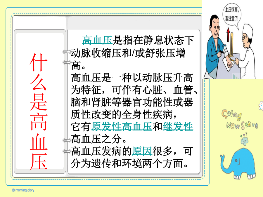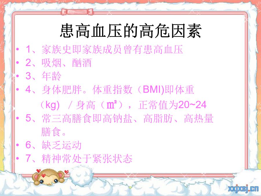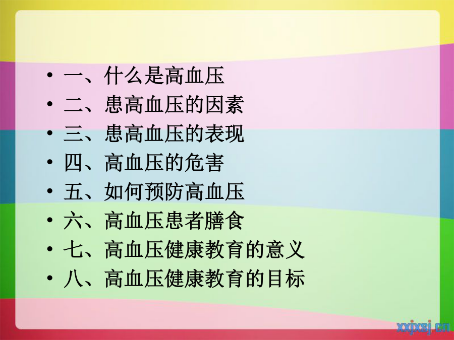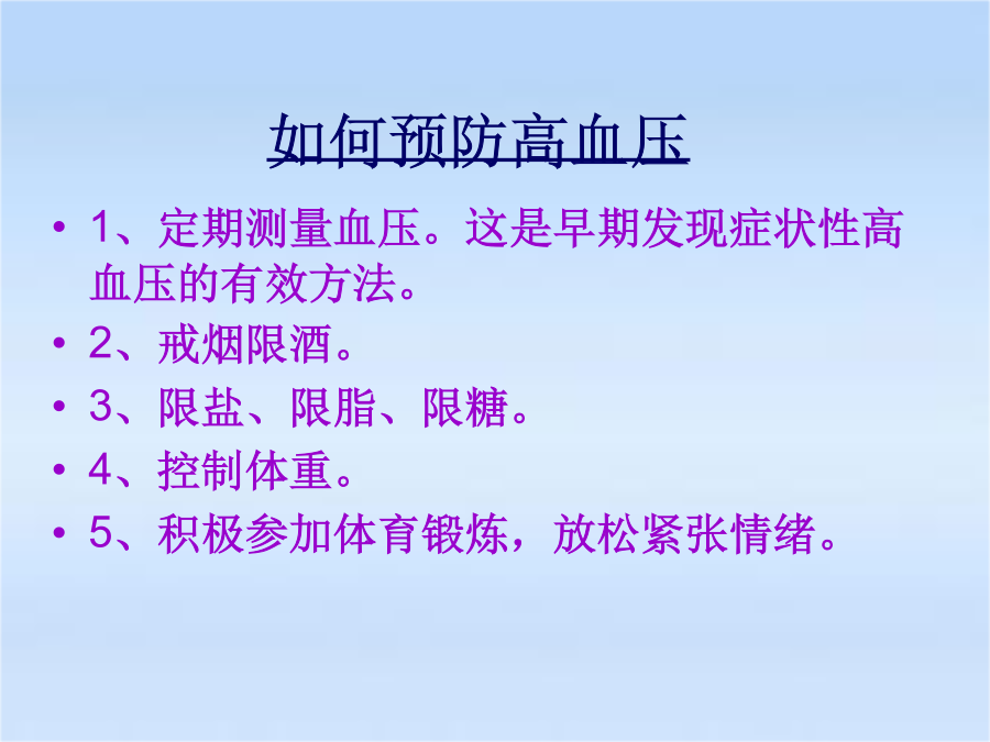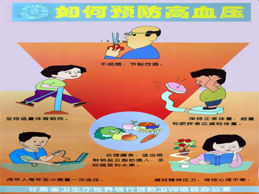 高血压健康教育一、什么是高血压二、患高血压的因素三、患高血压的表现四、高血压的危害五、如何预防高血压六、高血压患者膳食七、高血压健康教育的意义八、高血压健康教育的目标类别患高血压的高危因素高血压临床表现高血压的危害如何预防高血压健康四大基石高血压患者膳食“五味不过”原则高血压饮食注意事项1、高血压饮食限制钠盐的摄入饮食应以清淡为宜,少吃咸食,吃盐过多,会使血管硬化和血压升高,每天吃盐应以5克以下为宜。2、高血压饮食少吃甜食甜食含糖量高,可在体内转化成脂肪,容易促进动脉硬化。3、高血压饮食少吃动物脂肪动物含胆固醇量高,可加速动脉硬化。如肝、脑、心等应少吃。4、高血压戒烟少酒有烟酒嗜好的高血压患者,会因烟酒过多引心肌梗塞,脑中风。5、高血压饮食宜多食钾食物钾在体内能缓冲纳的食物有:黄豆、小豆、番茄、西葫芦、芹菜、鲜蘑菇及各种绿叶蔬菜;水果有橘子、苹果、香蕉、梨、猕猴桃、柿子、菠萝、核桃、西瓜等。6、宜多食含蛋白和维生素的食物。如鱼、牛奶、瘦肉、豆制品等。7、多食含钙食物。美国医学专家认为,高血压患者每天坚持食人高钙食物,能有明显的降压效果。含钙的食物有:奶制品、豆制品、花生、红枣、海带、黑木耳、核桃、鱼等。8、避免饮用浓茶、咖啡9、补充维生素C总之高血压病健康教育的意义: