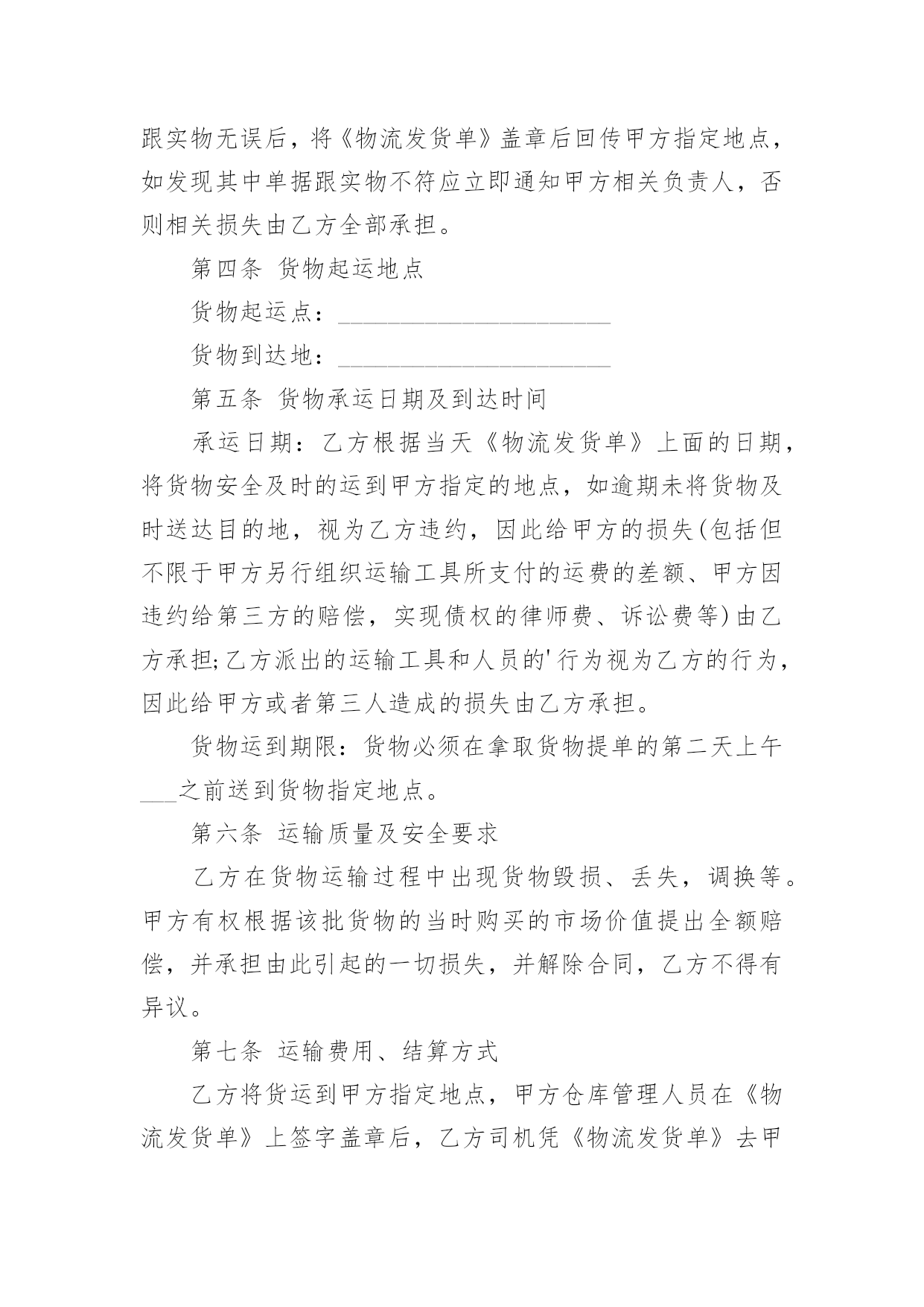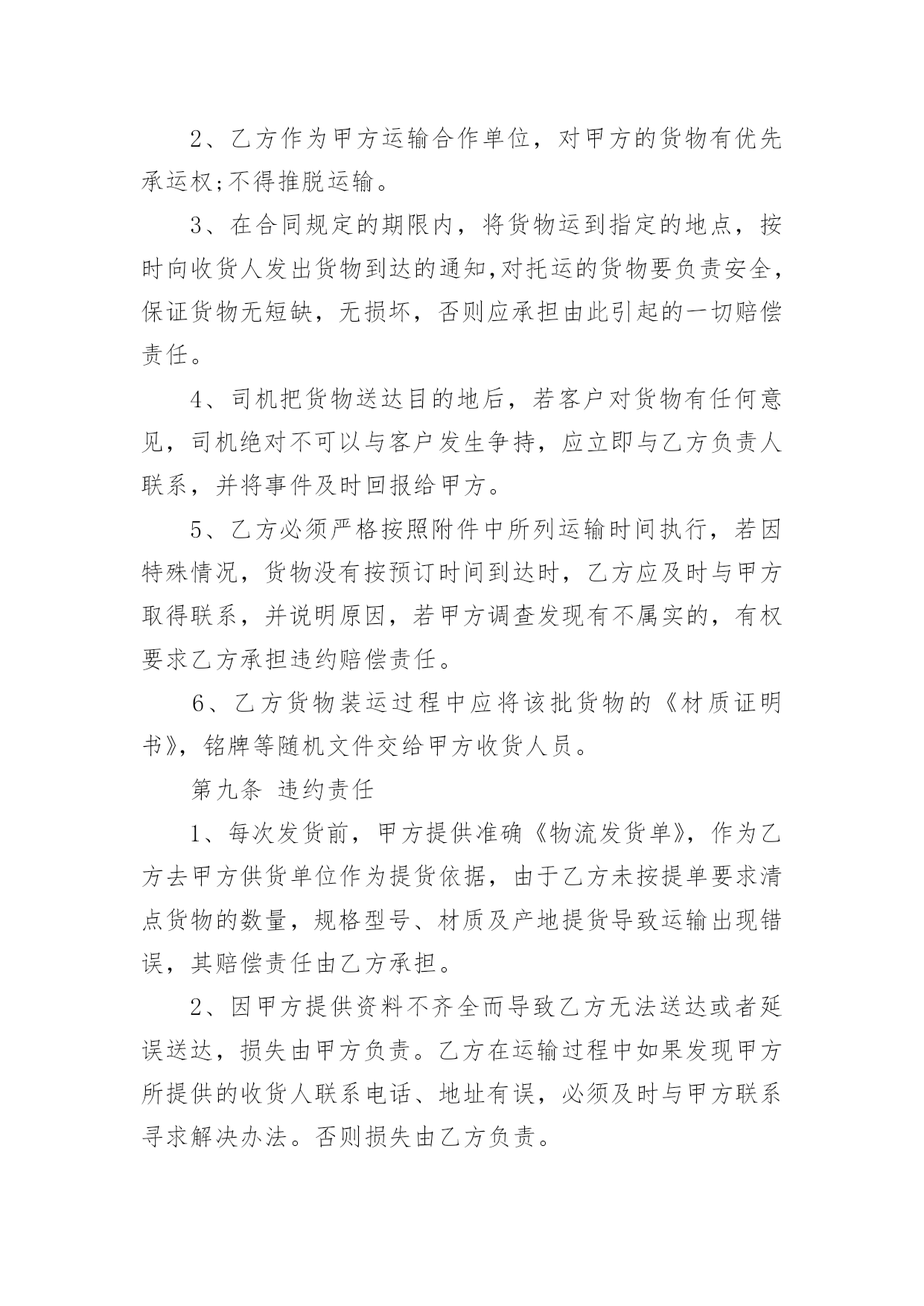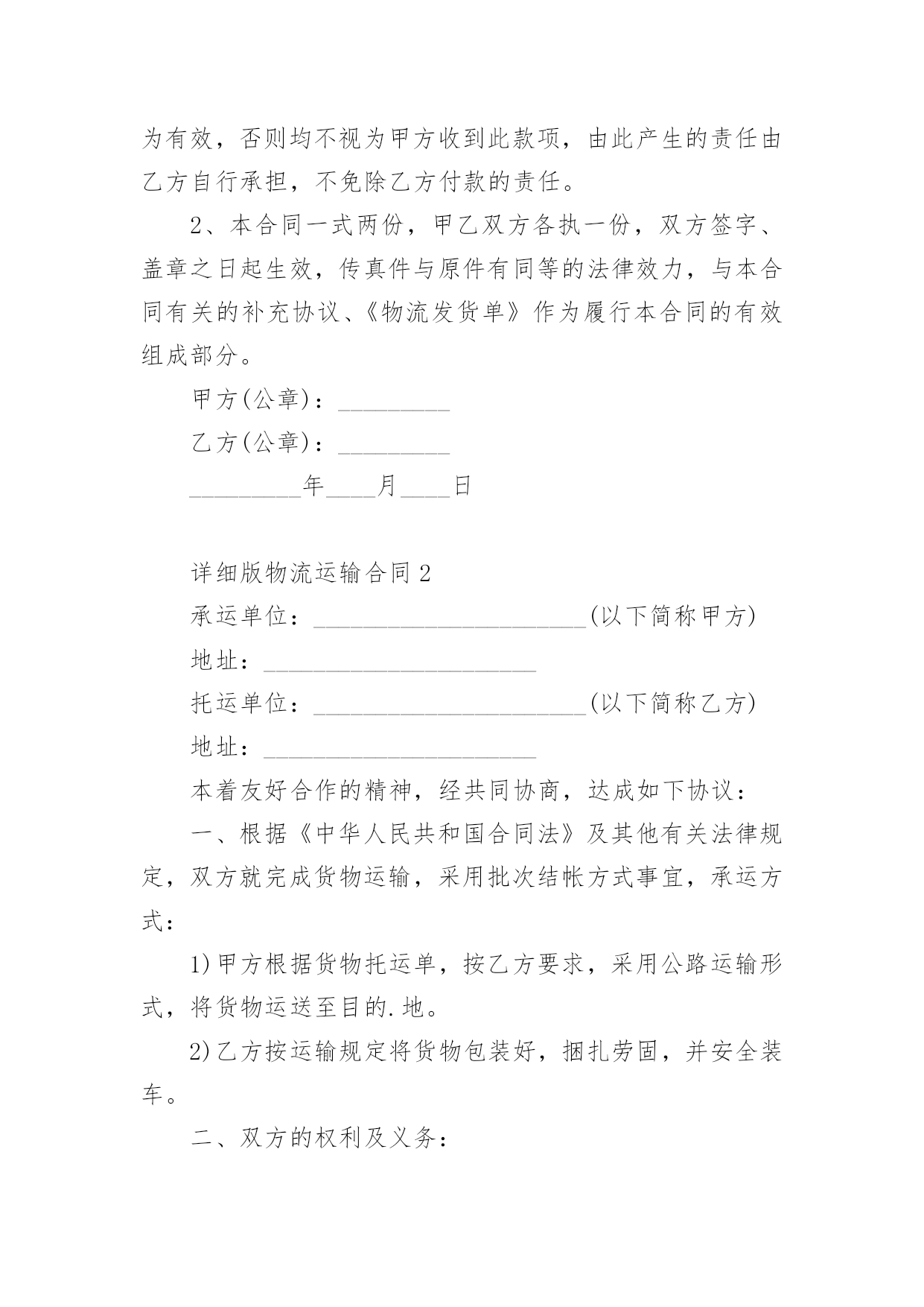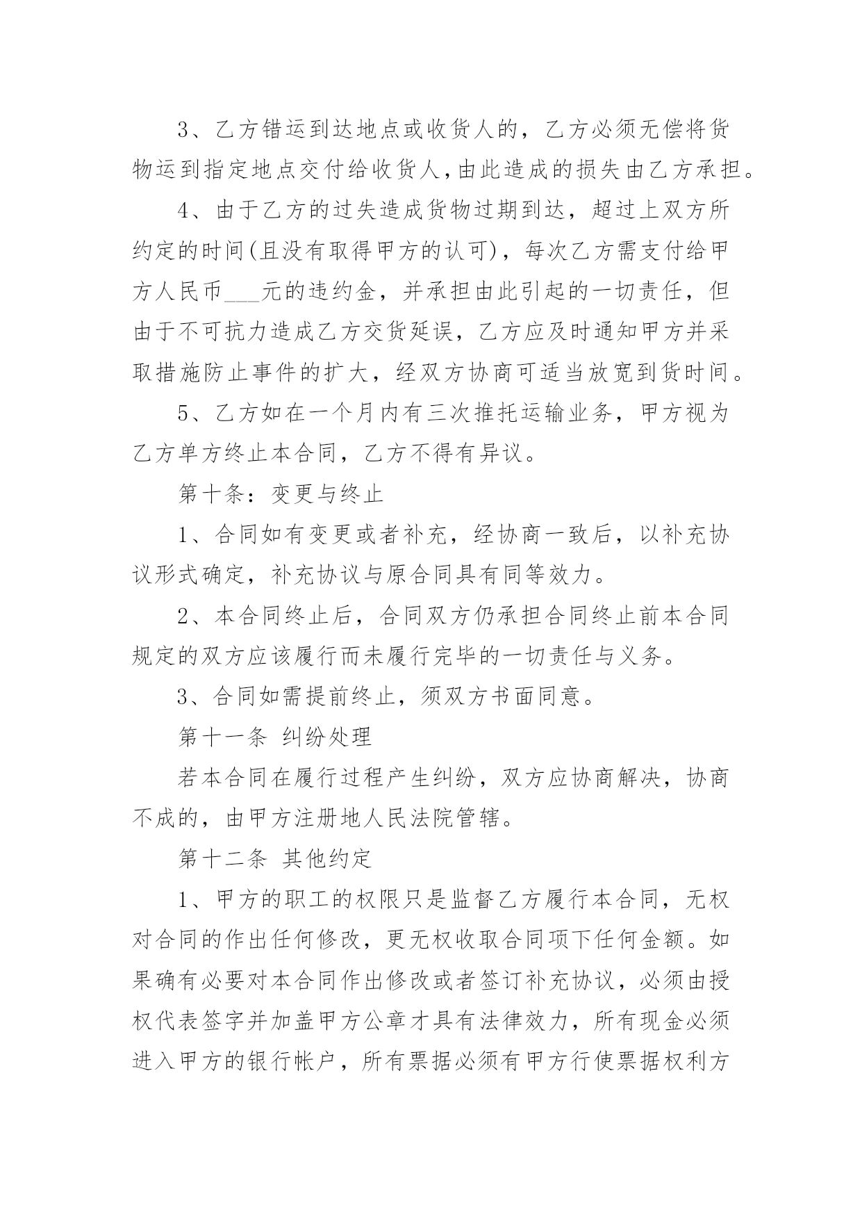 详细版物流运输合同在人们愈发重视契约的社会中,合同在生活中的使用越来越广泛,签订合同可以使我们的合法权益得到法律的保障。那么相关的合同到底怎么写呢?以下是小编精心整理的详细版物流运输合同,希望能够帮助到大家。详细版物流运输合同1甲方:______________________乙方:______________________根据相关法律规定,经过双方充分协商,特订立本合同,以资共同遵守。第一条业务模式甲方根据业务当天___采购实际情况以《物流发货单》的方式通知乙方去甲方指点供货单位提货,乙方根据甲方《物流发货单》,《货物提单》上的货物名称、规格、产地、数量跟实物确认无误后进行装运货物,并运到甲方指定地点。第二条货物运输定价自合同签订生效当年为人民币___元/吨,以后年份运费随行就市。甲方除支付上价格外,不再乙方支付任何其他费用(包括但不限于乙方装车、转运、卸货等产生的费用),但本合同另有约定的除外。第三条货物验收要求乙方根据甲方供货单位拿《货物提单》,核实两张单据跟实物无误后,将《物流发货单》盖章后回传甲方指定地点,如发现其中单据跟实物不符应立即通知甲方相关负责人,否则相关损失由乙方全部承担。第四条货物起运地点货物起运点:______________________货物到达地:______________________第五条货物承运日期及到达时间承运日期:乙方根据当天《物流发货单》上面的日期,将货物安全及时的运到甲方指定的地点,如逾期未将货物及时送达目的地,视为乙方违约,因此给甲方的损失(包括但不限于甲方另行组织运输工具所支付的运费的差额、甲方因违约给第三方的赔偿,实现债权的律师费、诉讼费等)由乙方承担;乙方派出的运输工具和人员的'行为视为乙方的行为,因此给甲方或者第三人造成的损失由乙方承担。货物运到期限:货物必须在拿取货物提单的第二天上午___之前送到货物指定地点。第六条运输质量及安全要求乙方在货物运输过程中出现货物毁损、丢失,调换等。甲方有权根据该批货物的当时购买的市场价值提出全额赔偿,并承担由此引起的一切损失,并解除合同,乙方不得有异议。第七条运输费用、结算方式乙方将货运到甲方指定地点,甲方仓库管理人员在《物流发货单》上签字盖章后,乙方司机凭《物流发货单》去甲方财务办公室结算,每月___日和___日为结算日(遇法定节假日顺延)第八条各方的责任、义务一、甲方的责任1、有权要求乙方按照合同规定的时间、地点、把货物运输到目的地。货物托运后,甲方需要变更到货地点或收货人,或者取消托运时,有权向乙方提出变更合同的内容或解除合同的要求。但必须在货物未运到目的地之前通知乙方,并相应支付给乙方所需费用。2、因甲方原因而引起的无法抵达目的地或找不到收货人的,乙方必须妥善保管好货物,并以书面通知甲方,否则造成的损失由乙方承担。3、甲方保证按合同要求在乙方向甲方提交相关单据时在结算日及时结算运费给乙方,乙方不得以甲方未支付运费或者甲方许可的费用为由对运输货物进行留置,必须将所运货物交付给甲方指定的人和指定的地方。4、货物到达甲方运输目的地,在乙方运输司机的配合下,甲方应积极组织人员进行货物卸载,其吊装费用由甲方承担。二、乙方的责任1、乙方收到甲方的《物流发货单》后,应根据《物流发货单》上的联系方式去甲方供货单位提货,提货时结合《物流发货单》上的名称,数量,规格清点货物,如发现数量,名称,规格,材质与实际不符,应及时通知甲方。2、乙方作为甲方运输合作单位,对甲方的货物有优先承运权;不得推脱运输。3、在合同规定的期限内,将货物运到指定的地点,按时向收货人发出货物到达的通知,对托运的货物要负责安全,保证货物无短缺,无损坏,否则应承担由此引起的一切赔偿责任。4、司机把货物送达目的地后,若客户对货物有任何意见,司机绝对不可以与客户发生争持,应立即与乙方负责人联系,并将事件及时回报给甲方。5、乙方必须严格按照附件中所列运输时间执行,若因特殊情况,货物没有按预订时间到达时,乙方应及时与甲方取得联系,并说明原因,若甲方调查发现有不属实的,有权要求乙方承担违约赔偿责任。6、乙方货物装运过程中应将该批货物的《材质证明书》,铭牌等随机文件交给甲方收货人员。第九条违约责任1、每次发货前,甲方提供准确《物流发货单》,作为乙方去甲方供货单位作为提货依据,由于乙方未按提单要求清点货物的数量,规格型号、材质及产地提货导致运输出现错误,其赔偿责任由乙方承担。2、因甲方提供资料不齐全而导致乙方无法送达或者延误送达,损失由甲方负责。乙方在运输过程中如果发现甲方所提供的收货人联系电话、地址有误,必须及时与甲方联系寻求解决办法。否则损失由乙方负责。3、乙方错运到达地点或收货人的,乙方必须无偿将货物运到指定地点交付给收货人,由此造成的损失由乙方承担。4、由于乙方的过失造成货物过