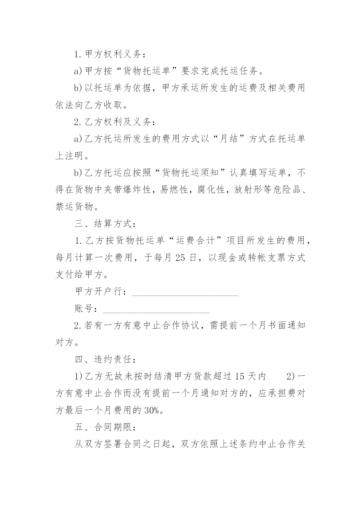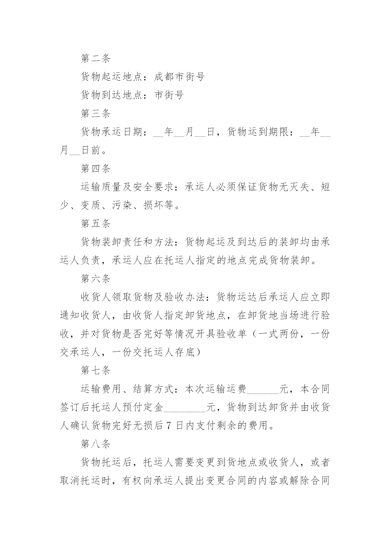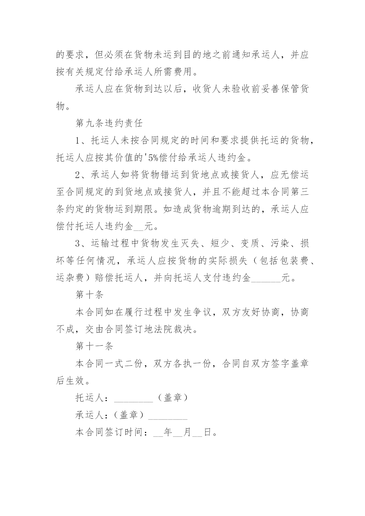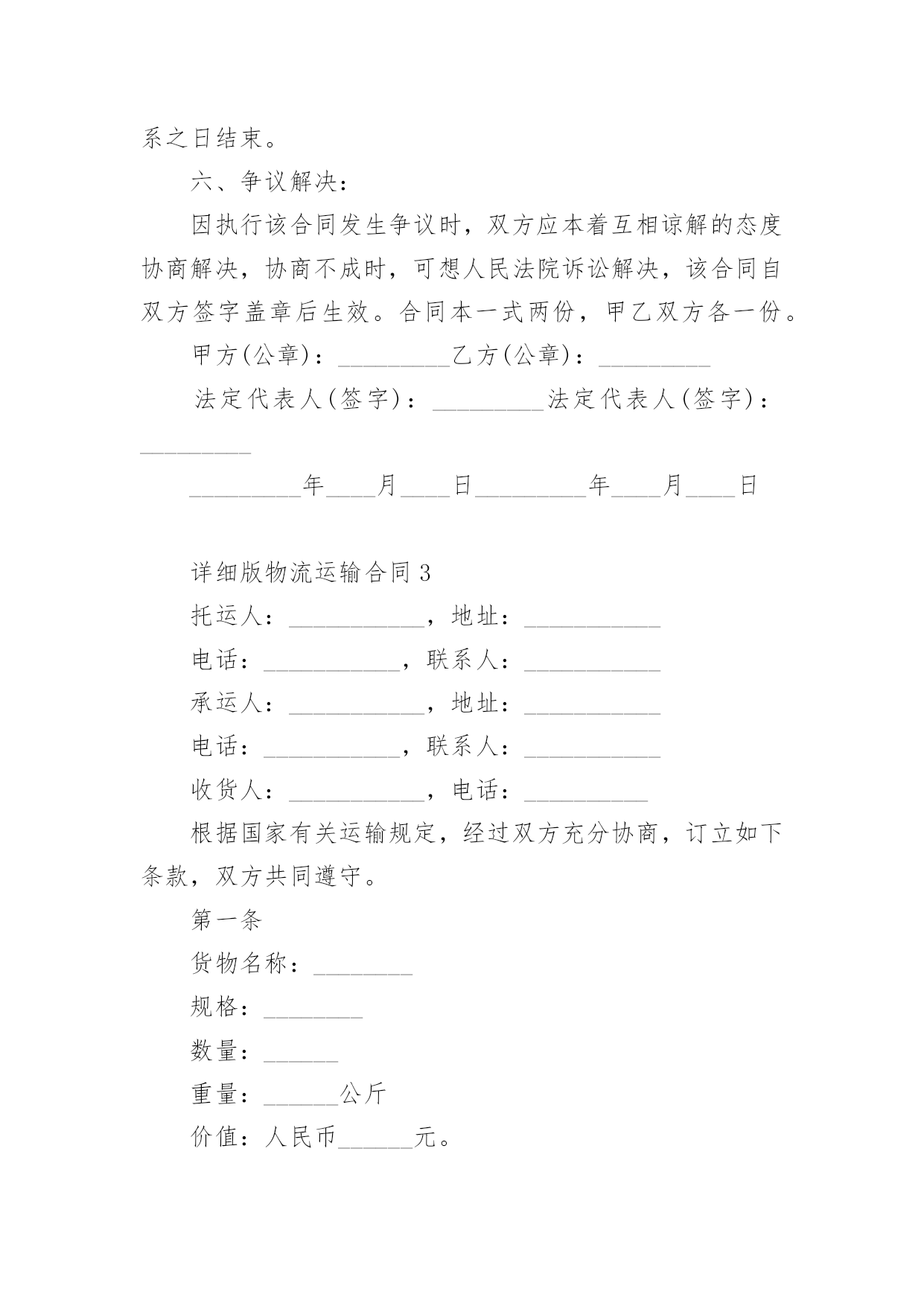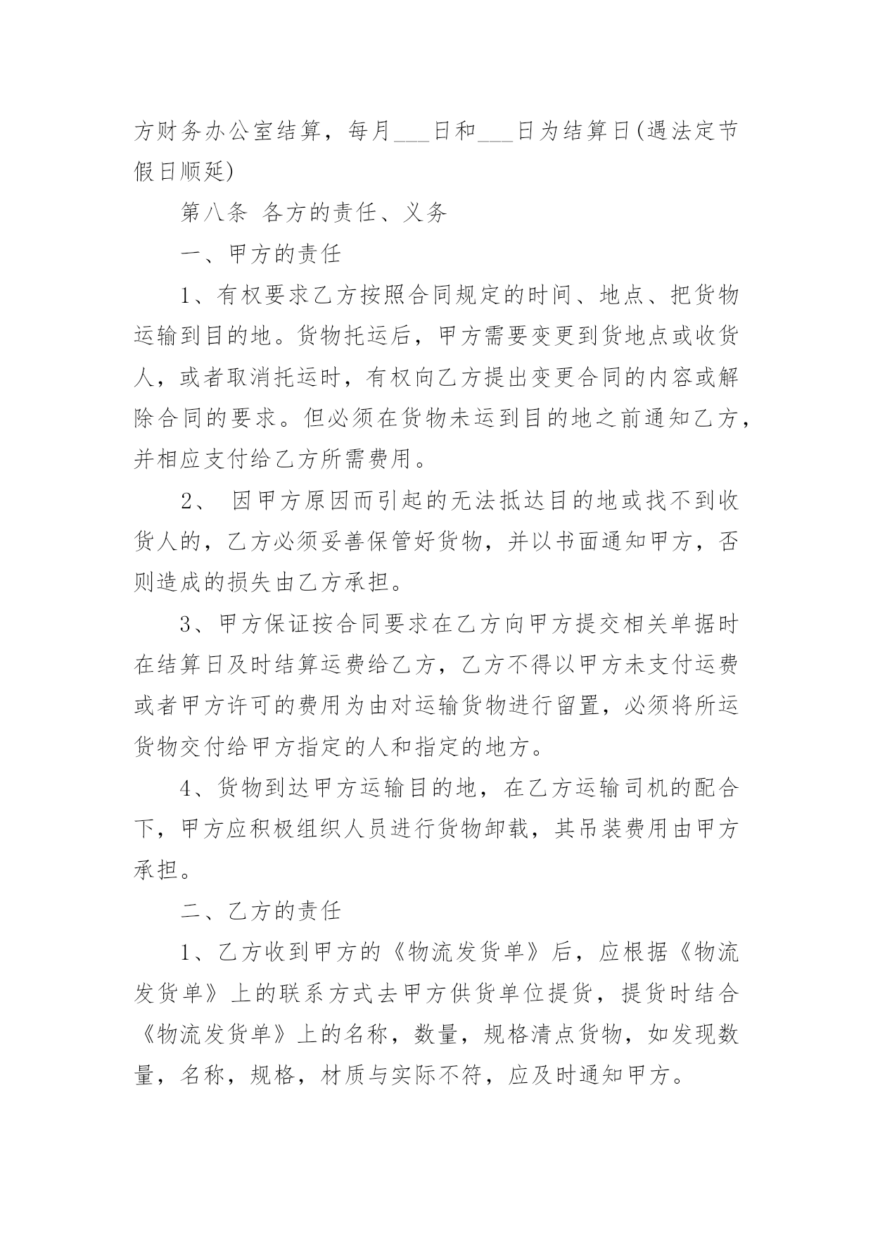详细版物流运输合同在人们愈发重视契约的社会中,合同在生活中的使用越来越广泛,签订合同可以使我们的合法权益得到法律的保障。那么相关的合同到底怎么写呢?以下是小编精心整理的详细版物流运输合同,希望能够帮助到大家。详细版物流运输合同1甲方:______________________乙方:______________________根据相关法律规定,经过双方充分协商,特订立本合同,以资共同遵守。第一条业务模式甲方根据业务当天___采购实际情况以《物流发货单》的方式通知乙方去甲方指点供货单位提货,乙方根据甲方《物流发货单》,《货物提单》上的货物名称、规格、产地、数量跟实物确认无误后进行装运货物,并运到甲方指定地点。第二条货物运输定价自合同签订生效当年为人民币___元/吨,以后年份运费随行就市。甲方除支付上价格外,不再乙方支付任何其他费用(包括但不限于乙方装车、转运、卸货等产生的费用),但本合同另有约定的除外。第三条货物验收要求乙方根据甲方供货单位拿《货物提单》,核实两张单据跟实物无误后,将《物流发货单》盖章后回传甲方指定地点,如发现其中单据跟实物不符应立即通知甲方相关负责人,否则相关损失由乙方全部承担。第四条货物起运地点货物起运点:______________________货物到达地:______________________第五条货物承运日期及到达时间承运日期:乙方根据当天《物流发货单》上面的日期,将货物安全及时的运到甲方指定的地点,如逾期未将货物及时送达目的地,视为乙方违约,因此给甲方的损失(包括但不限于甲方另行组织运输工具所支付的运费的差额、甲方因违约给第三方的赔偿,实现债权的律师费、诉讼费等)由乙方承担;乙方派出的运输工具和人员的'行为视为乙方的行为,因此给甲方或者第三人造成的损失由乙方承担。货物运到期限:货物必须在拿取货物提单的第二天上午___之前送到货物指定地点。第六条运输质量及安全要求乙方在货物运输过程中出现货物毁损、丢失,调换等。甲方有权根据该批货物的当时购买的市场价值提出全额赔偿,并承担由此引起的一切损失,并解除合同,乙方不得有异议。第七条运输费用、结算方式乙方将货运到甲方指定地点,甲方仓库管理人员在《物流发货单》上签字盖章后,乙方司机凭《物流发货单》去甲方财务办公室结算,每月___日和___日为结算日(遇法定节假日顺延)第八条各方的责任、义务一、甲方的责任1、有权要求乙方按照合同规定的时间、地点、把货物运输到目的地。货物托运后,甲方需要变更到货地点或收货人,或者取消托运时,有权向乙方提出变更合同的内容或解除合同的要求。但必须在货物未运到目的地之前通知乙方,并相应支付给乙方所需费用。2、因甲方原因而引起的无法抵达目的地或找不到收货人的,乙方必须妥善保管好货物,并以书面通知甲方,否则造成的损失由乙方承担。3、甲方保证按合同要求在乙方向甲方提交相关单据时在结算日及时结算运费给乙方,乙方不得以甲方未支付运费或者甲方许可的费用为由对运输货物进行留置,必须将所运货物交付给甲方指定的人和指定的地方。4、货物到达甲方运输目的地,在乙方运输司机的配合下,甲方应积极组织人员进行货物卸载,其吊装费用由甲方承担。二、乙方的责任1、乙方收到甲方的《物流发货单》后,应根据《物流发货单》上的联系方式去甲方供货单位提货,提货时结合《物流发货单》上的名称,数量,规格清点货物,如发现数量,名称,规格,材质与实际不符,应及时通知甲方。2、乙方作为甲方运输合作单位,对甲方的货物有优先承运权;不得推脱运输。3、在合同规定的期限内,将货物运到指定的地点,按时向收货人发出货物到达的通知,对托运的货物要负责安全,保证货物无短缺,无损坏,否则应承担由此引起的一切赔偿责任。4、司机把货物送达目的地后,若客户对货物有任何意见,司机绝对不可以与客户发生争持,应立即与乙方负责人联系,并将事件及时回报给甲方。5、乙方必须严格按照附件中所列运输时间执行,若因特殊情况,货物没有按预订时间到达时,乙方应及时与甲方取得联系,并说明原因,若甲方调查发现有不属实的,有权要求乙方承担违约赔偿责任。6、乙方货物装运过程中应将该批货物的《材质证明书》,铭牌等随机文件交给甲方收货人员。第九条违约责任1、每次发货前,甲方提供准确《物流发货单》,作为乙方去甲方供货单位作为提货依据,由于乙方未按提单要求清点货物的数量,规格型号、材质及产地提货导致运输出现错误,其赔偿责任由乙方承担。2、因甲方提供资料不齐全而导致乙方无法送达或者延误送达,损失由甲方负责。乙方在运输过程中如果发现甲方所提供的收货人联系电话、地址有误,必须及时与甲方联系寻求解决办法。否则损失由乙方负责。3、乙方错运到达地点或收货人的,乙方必须无偿将货物运到指定地点交付给收货人,由此造成的损失由乙方承担。4、由于乙方的过失造成货物过