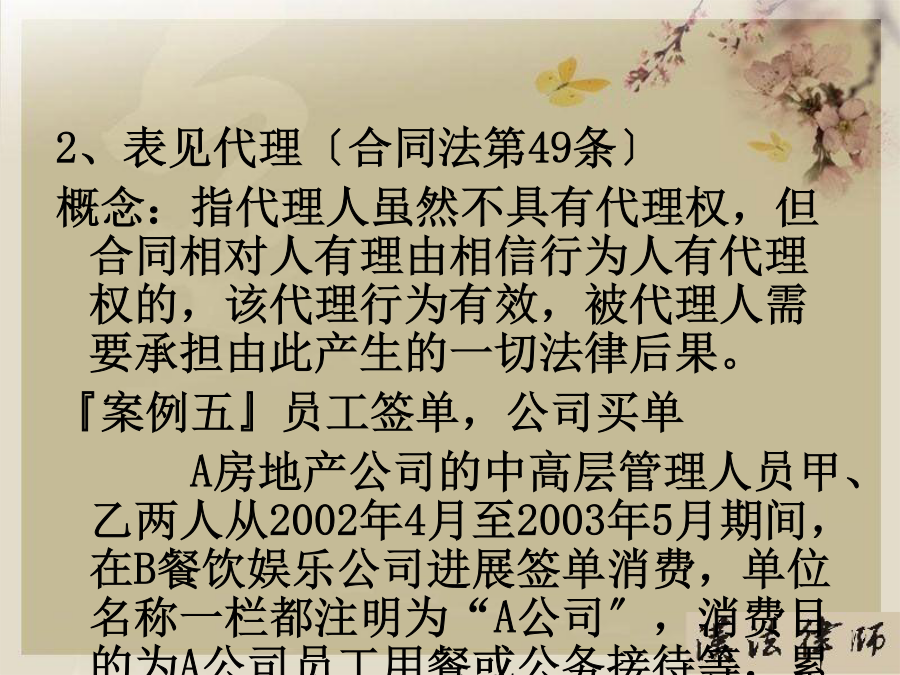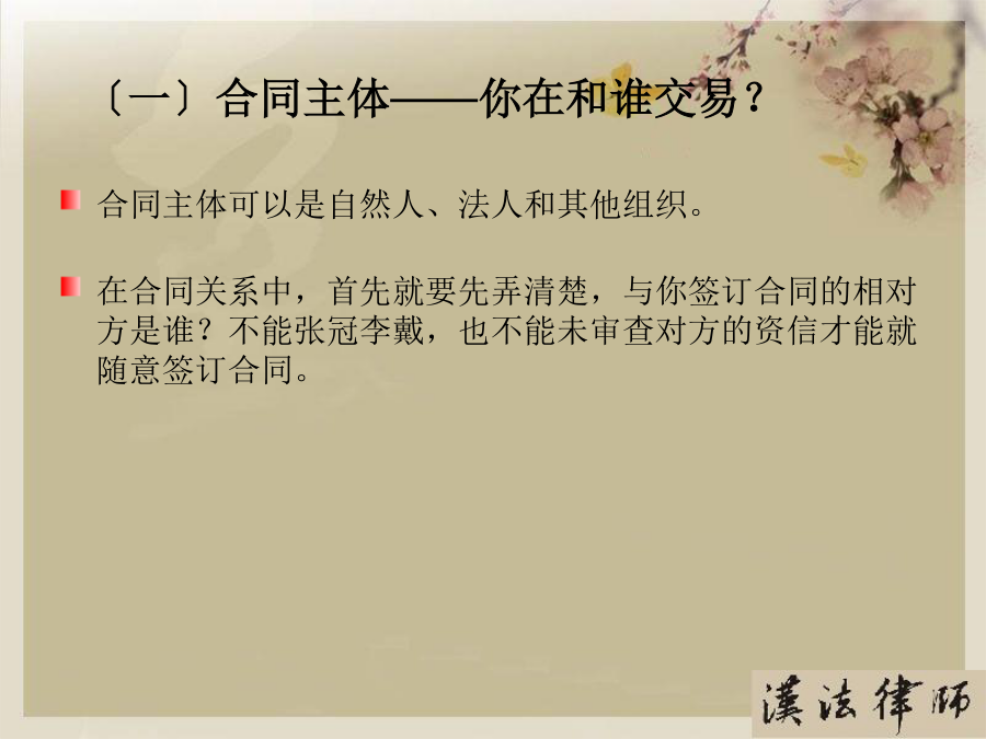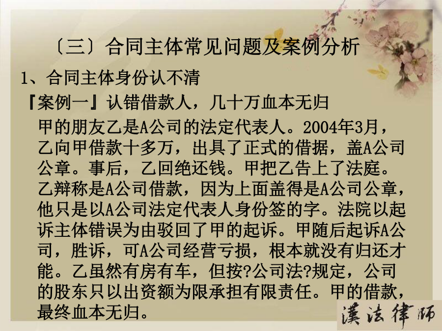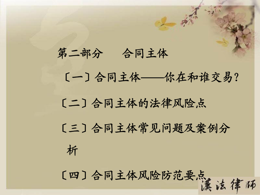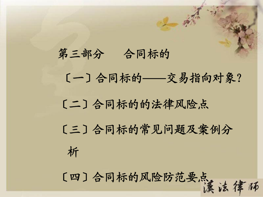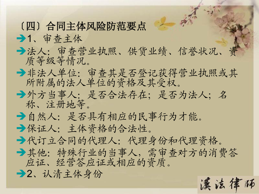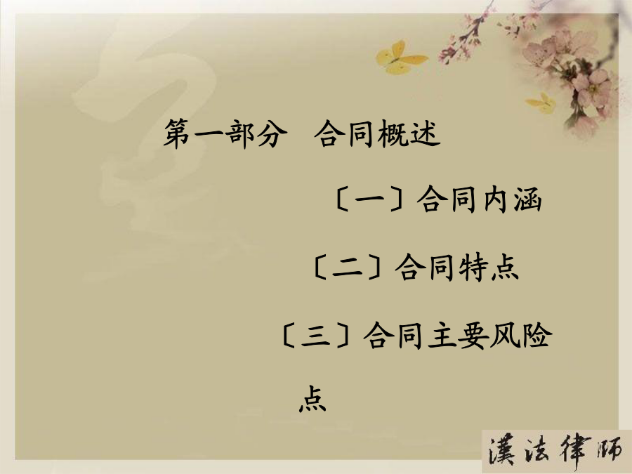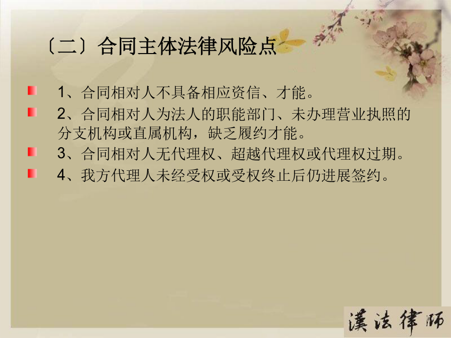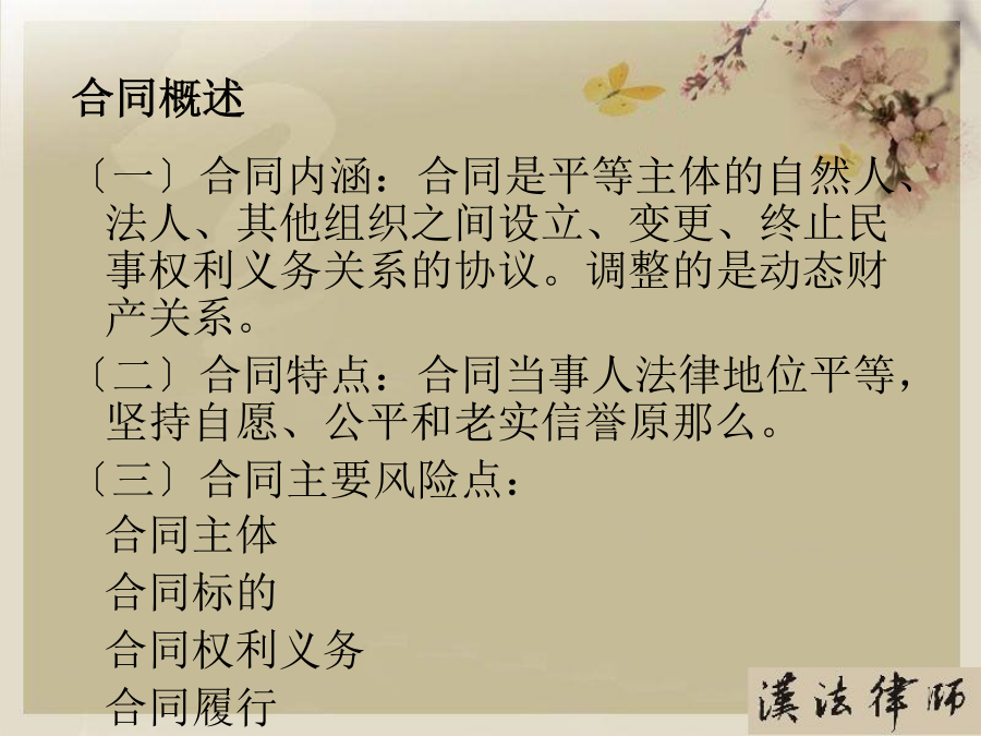 第一部分合同概述〔一〕合同内涵〔二〕合同特点〔三〕合同主要风险点第二部分合同主体〔一〕合同主体——你在和谁交易?〔二〕合同主体的法律风险点〔三〕合同主体常见问题及案例分析〔四〕合同主体风险防范要点〔一〕合同主体——你在和谁交易?〔二〕合同主体法律风险点〔三〕合同主体常见问题及案例分析2、表见代理〔合同法第49条〕概念:指代理人虽然不具有代理权,但合同相对人有理由相信行为人有代理权的,该代理行为有效,被代理人需要承担由此产生的一切法律后果。『案例五』员工签单,公司买单A房地产公司的中高层管理人员甲、乙两人从2002年4月至2003年5月期间,在B餐饮娱乐公司进展签单消费,单位名称一栏都注明为“A公司〞,消费目的为A公司员工用餐或公务接待等,累计签单欠款共元。后甲、乙两人分开A公司,B公司知悉后屡次向A公司催收欠款,A公司以甲乙两人并无受权签单消费为由回绝支付欠款。B公司向法院提起诉讼,其法律后果应当由A承担,因此支持了B公司的诉讼恳求。〔四〕合同主体风险防范要点第三部分合同标的〔一〕合同标的——交易指向对象?〔二〕合同标的的法律风险点〔三〕合同标的常见问题及案例分析〔四〕合同标的风险防范要点〔一〕合同标的——交易指向对象?〔二〕合同标的的法律风险点1、合同标确实定性『案例二』合同标的物不清,形成争议甲、乙两单位签订一设备租赁协议,甲方将真空离子镀膜机出租给乙方,双方约定了租期、租金等事项。租期届满时,乙方交付设备时,甲方发现不是其出租的设备。由于时间较长,原办事人员都已离任,从双方的协议中,找不到租赁物的型号或是明显特征,因此引发纠纷。经法院主持达成调解协议。甲方拉回一台不属于自己的设备,约损失15万元。2、实际交付的标的不符『案例三』标的物被调包市民杨先生的朋友为其买了一台二手笔记本电脑,价值4000多元,通过一家快递公司托运给他。日后,速递公司的业务员当面把包裹交给他。杨先生支付给对方50元邮费,签单接收了包裹,但忘记当场验看。稍后,他回到住处翻开包裹,发现被骗。于是他带包裹到速递公司进展交涉。由于送货单上没有写明货物的名称、重量和单价等,杨先生也未当场验货,因此双方各执一词,难辨真伪。〔四〕合同标的风险防范要点第四部分合同权利义务〔一〕合同权利义务——详细交易内容?〔二〕合同权利义务的法律风险点〔三〕合同权利义务常见问题及案例分析〔四〕合同权利义务审查要点〔一〕合同权利义务——详细交易内容?〔二〕合同权利义务的法律风险点〔三〕合同权利义务常见问题及案例分析2、交付地点约定不清『案例二』漏掉一个字,运费多开支某公司与水果商签订了水果购销合同。双方约定在公司大仓库交货。但双方合同都写成了“公司仓库交货〞,漏掉了“大〞字,结果又将货物装箱重新进展运输,费时费力费钱。3、瑕疵担保义务概念:卖方需承担的一项根本义务,指出卖人对其所交付的标的物,应担保其有依通常交易观念或当事人的意思认为应当具有的价值、效用或品质。种类:质量〔物的〕瑕疵担保义务和权利瑕疵担保义务。『案例三』质量瑕疵担保义务常某租赁方某门面房,用于创办饭馆,月租12000元,常某另外支付方某保证金3万元,如常某违约那么该保证金不予退还。日后,房顶原有的裂缝不断加大,饭馆也出现亏损,常某不想再继续经营,便以该房存在严重危平安隐患为由提出要求退租,并要求返还该3万元保证金,遭方某回绝后,将方某诉至法院。方某辩称,常某在租赁时已经知道房屋原有裂缝将继续扩大,其退租的真正的原因是饭馆盈利状况不佳。诉讼中法院委托鉴定部门就此房屋进展了司法鉴定,结论该房屋系危房,不合适居住。后法院根据我国?合同法?第233条支持了常某的诉讼恳求。〔四〕合同权利义务风险防范要点第五部分合同履行〔一〕、合同履行——如何交易?〔二〕、合同履行的法律风险点〔三〕、合同履行常见问题及案例分析〔四〕、合同履行风险防范要点〔一〕合同履行——如何交易?〔二〕合同履行的法律风险点〔三〕合同履行常见问题及案例分析2、不安抗辩权〔合同法第68条〕『案例二』你亏损严重,我停顿履行某电热厂从某煤矿厂购煤,约定交货期限为2021年9月30日,付款期限为2021年10月30日。9月底,煤矿厂发现电热厂经营不善,财务状况严重恶化,并有确切证据可以证明电热厂已无付款之可能,此时煤矿厂可行使不安抗辩权,要求电热厂提供担保或者解除合同3、顺序履行抗辩权〔合同法第67条〕『案例三』某电热厂从某煤矿厂购煤,约定交货期限为2021年9月30日,付款期限为2021年10月30日。9月底,矿场交付约定数量的煤,后电热厂经检验发现煤的含硫量远远超过标准,根据政府规定不能在该厂附近燃烧,此时电热厂可以回绝交付货款。4、合同变更〔合同法第77条〕?合同法?第78