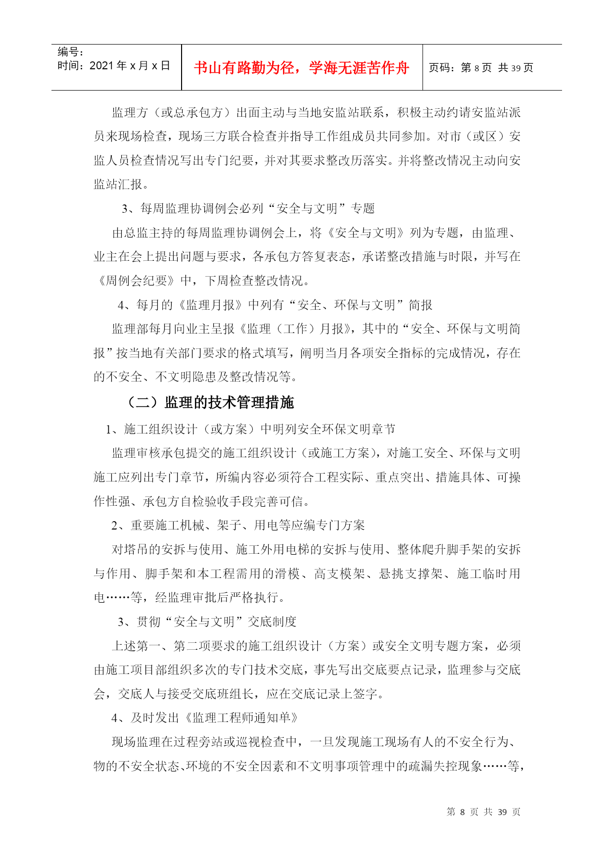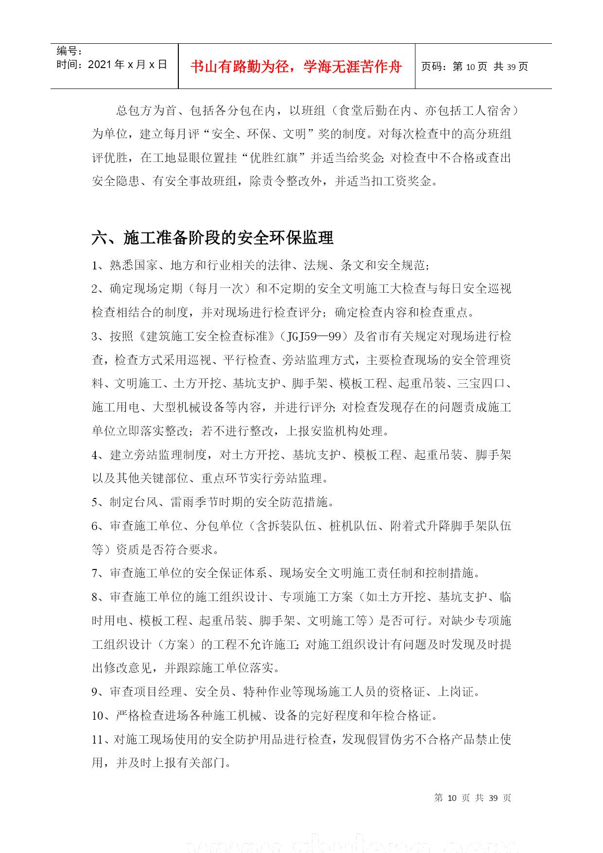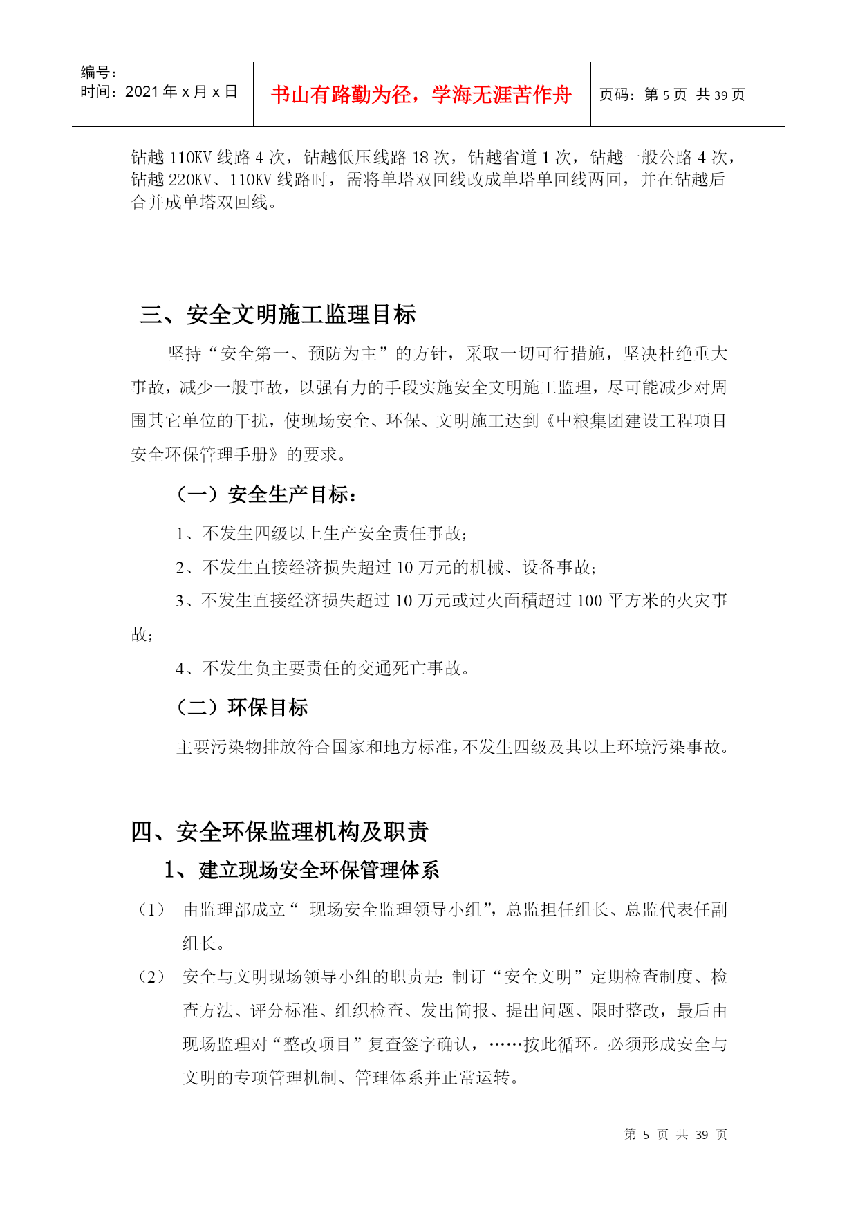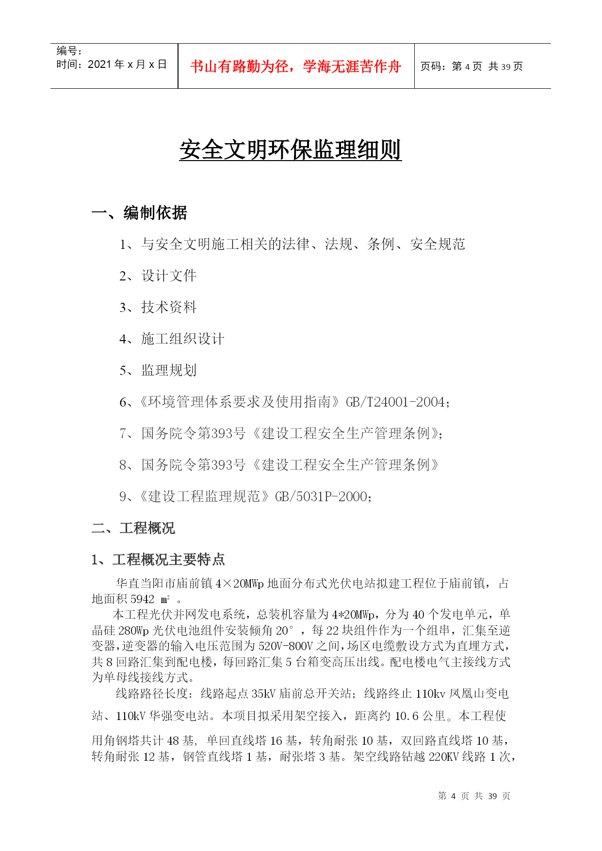 编号:时间:2021年x月x日书山有路勤为径,学海无涯苦作舟页码:第PAGE39页共NUMPAGES39页第PAGE\*MERGEFORMAT39页共NUMPAGES\*MERGEFORMAT39页编号HYC-LDGJB-QP安全环保文明施工监理细则编制总监华直当阳市庙前镇4*20MWp地面分布式农光互补光伏发电项目监理项目部2017年11月5日目录二、工程概况:三、安全文明施工监理目标四、安全环保监理机构及职责五、安全环保监理措施(一)监理的组织管理措施(二)监理的技术管理措施(三)监理的合同管理措施(四)监理的经济管理措施六、施工准备阶段的安全环保监理七、施工阶段的安全施工监理(一)施工用电(二)基础工程(三)钢管脚手架工程(四)模板工程(五)“三宝”、“四口”防护(六)施工机具(七)结构吊装(八)塔吊(九)物料提升机(十)施工电梯八、对环境保护的监理措施(1)现场环境保护标准(2)现场环境保护监督措施(3)现场环境保护实施办法(4)扬尘治理措施(5)大气环境、噪音及粉尘的防治(6)固体废弃物的处理(7)防止废、污水污染监理措施九、施工阶段文明施工的监理1.围墙:2.封闭管理:3.施工场地:4.材料堆放5.现场住宿6.现场防火7.治安综合治理8.施工现场标牌9.生活设施10.社区服务十、事故处理安全文明环保监理细则一、编制依据1、与安全文明施工相关的法律、法规、条例、安全规范2、设计文件3、技术资料4、施工组织设计5、监理规划6、《环境管理体系要求及使用指南》GB/T24001-2004;7、国务院令第393号《建设工程安全生产管理条例》;8、国务院令第393号《建设工程安全生产管理条例》9、《建设工程监理规范》GB/5031P-2000;二、工程概况1、工程概况主要特点华直当阳市庙前镇4×20MWp地面分布式光伏电站拟建工程位于庙前镇,占地面积5942m2。本工程光伏并网发电系统,总装机容量为4*20MWp,分为40个发电单元,单晶硅280Wp光伏电池组件安装倾角20°,每22块组件作为一个组串,汇集至逆变器,逆变器的输入电压范围为520V-800V之间,场区电缆敷设方式为直埋方式,共8回路汇集到配电楼,每回路汇集5台箱变高压出线。配电楼电气主接线方式为单母线接线方式。线路路径长度:线路起点35kV庙前总开关站;线路终止110kv凤凰山变电站、110kV华强变电站。本项目拟采用架空接入,距离约10.6公里。本工程使用角钢塔共计48基,单回直线塔16基,转角耐张10基,双回路直线塔10基,转角耐张12基,钢管直线塔1基,耐张塔3基。架空线路钻越220KV线路1次,钻越110KV线路4次,钻越低压线路18次,钻越省道1次,钻越一般公路4次,钻越220KV、110KV线路时,需将单塔双回线改成单塔单回线两回,并在钻越后合并成单塔双回线。三、安全文明施工监理目标坚持“安全第一、预防为主”的方针,采取一切可行措施,坚决杜绝重大事故,减少一般事故,以强有力的手段实施安全文明施工监理,尽可能减少对周围其它单位的干扰,使现场安全、环保、文明施工达到《中粮集团建设工程项目安全环保管理手册》的要求。(一)安全生产目标:1、不发生四级以上生产安全责任事故;2、不发生直接经济损失超过10万元的机械、设备事故;3、不发生直接经济损失超过10万元或过火靣積超过100平方米的火灾事故;4、不发生负主要责任的交通死亡事故。(二)环保目标主要污染物排放符合国家和地方标准,不发生四级及其以上环境污染事故。四、安全环保监理机构及职责1、建立现场安全环保管理体系由监理部成立“现场安全监理领导小组”,总监担任组长、总监代表任副组长。安全与文明现场领导小组的职责是:制订“安全文明”定期检查制度、检查方法、评分标准、组织检查、发出简报、提出问题、限时整改,最后由现场监理对“整改项目”复查签字确认,……按此循环。必须形成安全与文明的专项管理机制、管理体系并正常运转。总承包方的项目经理部下设专业的“安全主任”,此职务应由有安全上岗资质且有组织协调能力、有一定经验的安全工程师担任,负责领导并布置全现场安全文明管理机关工作,总包或分包方,以及专业承包方,均应按现场大型机械组、临时用电组、架子和“四口五临边”组、“生活后勤”组监理部设一名专(兼)职安全环保监理工程师,负责配合项目总监理工程师抓好工地的安全、环保、文明施工检查与督促管理工作。2、安全环保监理人员分工安全环保监理组长(总监兼)副组长(总代兼)环境保护文明施