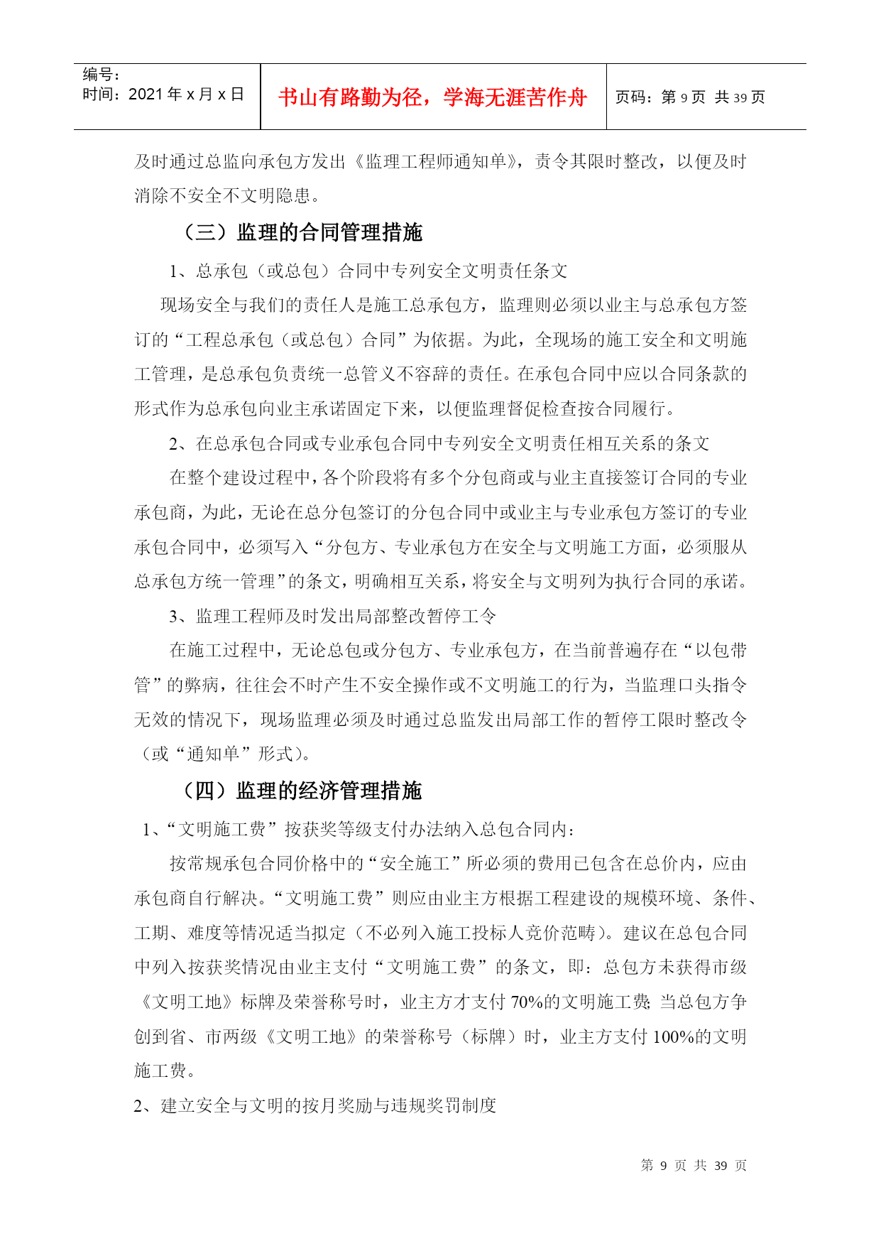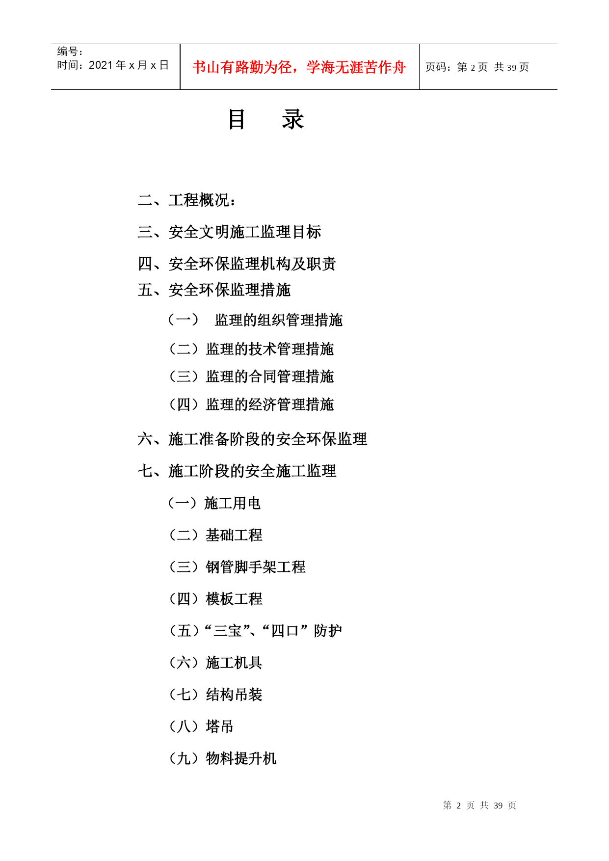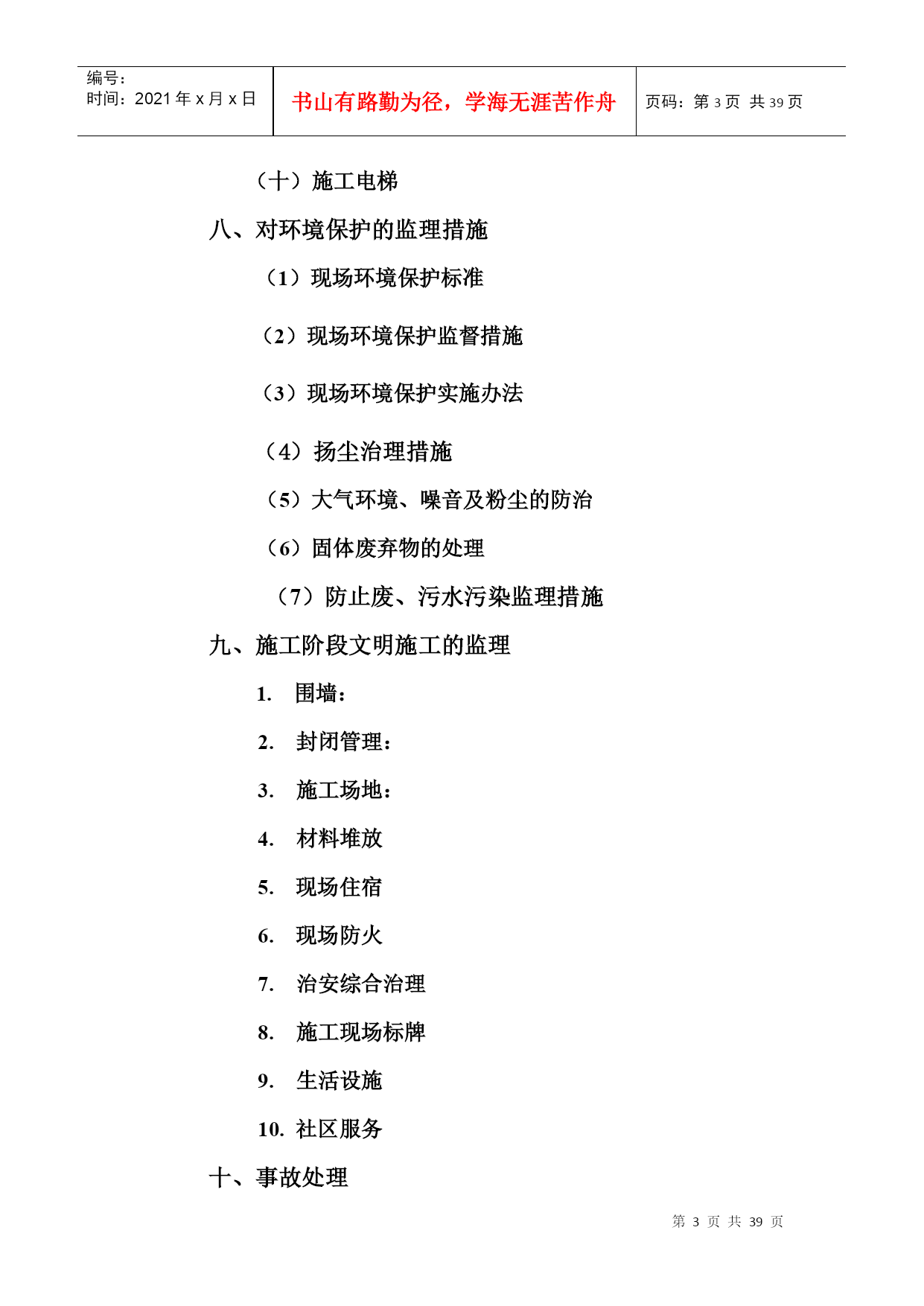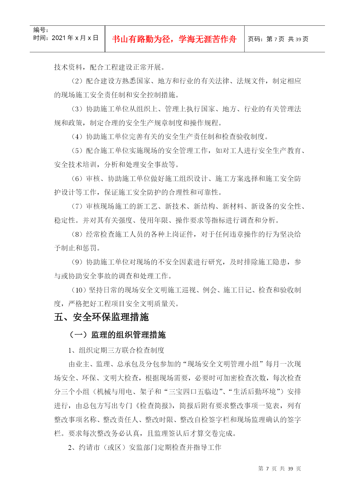 编号:时间:2021年x月x日书山有路勤为径,学海无涯苦作舟页码:第PAGE39页共NUMPAGES39页第PAGE\*MERGEFORMAT39页共NUMPAGES\*MERGEFORMAT39页编号HYC-LDGJB-QP安全环保文明施工监理细则编制总监华直当阳市庙前镇4*20MWp地面分布式农光互补光伏发电项目监理项目部2017年11月5日目录二、工程概况:三、安全文明施工监理目标四、安全环保监理机构及职责五、安全环保监理措施(一)监理的组织管理措施(二)监理的技术管理措施(三)监理的合同管理措施(四)监理的经济管理措施六、施工准备阶段的安全环保监理七、施工阶段的安全施工监理(一)施工用电(二)基础工程(三)钢管脚手架工程(四)模板工程(五)“三宝”、“四口”防护(六)施工机具(七)结构吊装(八)塔吊(九)物料提升机(十)施工电梯八、对环境保护的监理措施(1)现场环境保护标准(2)现场环境保护监督措施(3)现场环境保护实施办法(4)扬尘治理措施(5)大气环境、噪音及粉尘的防治(6)固体废弃物的处理(7)防止废、污水污染监理措施九、施工阶段文明施工的监理1.围墙:2.封闭管理:3.施工场地:4.材料堆放5.现场住宿6.现场防火7.治安综合治理8.施工现场标牌9.生活设施10.社区服务十、事故处理安全文明环保监理细则一、编制依据1、与安全文明施工相关的法律、法规、条例、安全规范2、设计文件3、技术资料4、施工组织设计5、监理规划6、《环境管理体系要求及使用指南》GB/T24001-2004;7、国务院令第393号《建设工程安全生产管理条例》;8、国务院令第393号《建设工程安全生产管理条例》9、《建设工程监理规范》GB/5031P-2000;二、工程概况1、工程概况主要特点华直当阳市庙前镇4×20MWp地面分布式光伏电站拟建工程位于庙前镇,占地面积5942m2。本工程光伏并网发电系统,总装机容量为4*20MWp,分为40个发电单元,单晶硅280Wp光伏电池组件安装倾角20°,每22块组件作为一个组串,汇集至逆变器,逆变器的输入电压范围为520V-800V之间,场区电缆敷设方式为直埋方式,共8回路汇集到配电楼,每回路汇集5台箱变高压出线。配电楼电气主接线方式为单母线接线方式。线路路径长度:线路起点35kV庙前总开关站;线路终止110kv凤凰山变电站、110kV华强变电站。本项目拟采用架空接入,距离约10.6公里。本工程使用角钢塔共计48基,单回直线塔16基,转角耐张10基,双回路直线塔10基,转角耐张12基,钢管直线塔1基,耐张塔3基。架空线路钻越220KV线路1次,钻越110KV线路4次,钻越低压线路18次,钻越省道1次,钻越一般公路4次,钻越220KV、110KV线路时,需将单塔双回线改成单塔单回线两回,并在钻越后合并成单塔双回线。三、安全文明施工监理目标坚持“安全第一、预防为主”的方针,采取一切可行措施,坚决杜绝重大事故,减少一般事故,以强有力的手段实施安全文明施工监理,尽可能减少对周围其它单位的干扰,使现场安全、环保、文明施工达到《中粮集团建设工程项目安全环保管理手册》的要求。(一)安全生产目标:1、不发生四级以上生产安全责任事故;2、不发生直接经济损失超过10万元的机械、设备事故;3、不发生直接经济损失超过10万元或过火靣積超过100平方米的火灾事故;4、不发生负主要责任的交通死亡事故。(二)环保目标主要污染物排放符合国家和地方标准,不发生四级及其以上环境污染事故。四、安全环保监理机构及职责1、建立现场安全环保管理体系由监理部成立“现场安全监理领导小组”,总监担任组长、总监代表任副组长。安全与文明现场领导小组的职责是:制订“安全文明”定期检查制度、检查方法、评分标准、组织检查、发出简报、提出问题、限时整改,最后由现场监理对“整改项目”复查签字确认,……按此循环。必须形成安全与文明的专项管理机制、管理体系并正常运转。总承包方的项目经理部下设专业的“安全主任”,此职务应由有安全上岗资质且有组织协调能力、有一定经验的安全工程师担任,负责领导并布置全现场安全文明管理机关工作,总包或分包方,以及专业承包方,均应按现场大型机械组、临时用电组、架子和“四口五临边”组、“生活后勤”组监理部设一名专(兼)职安全环保监理工程师,负责配合项目总监理工程师抓好工地的安全、环保、文明施工检查与督促管理工作。2、安全环保监理人员分工安全环保监理组长(总监兼)副组长(总代兼)环境保护文明施