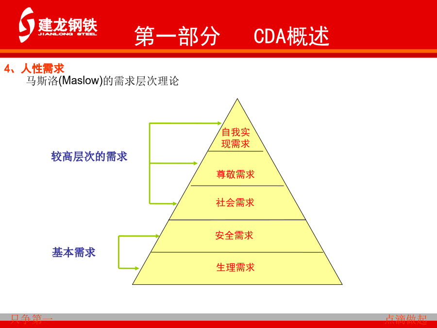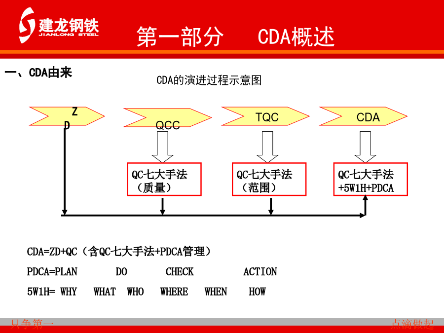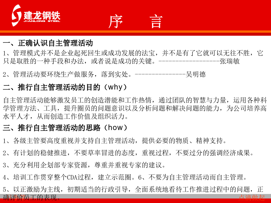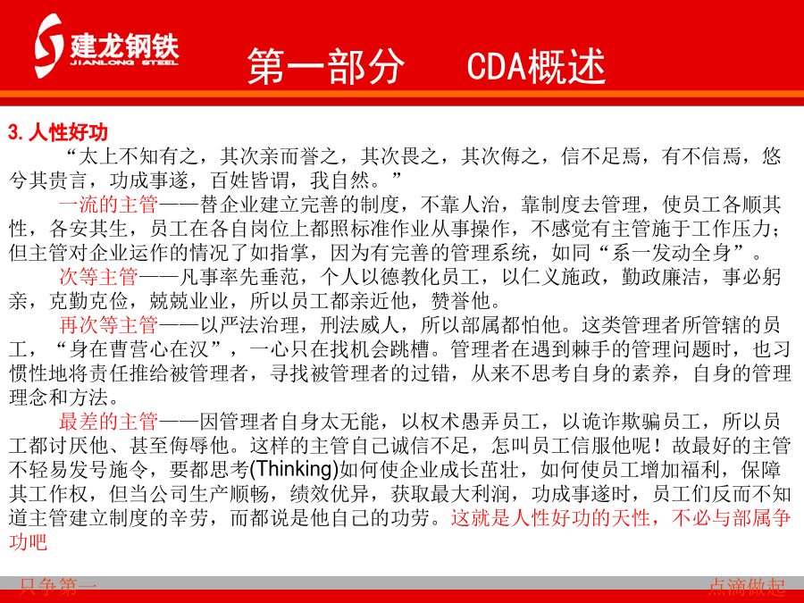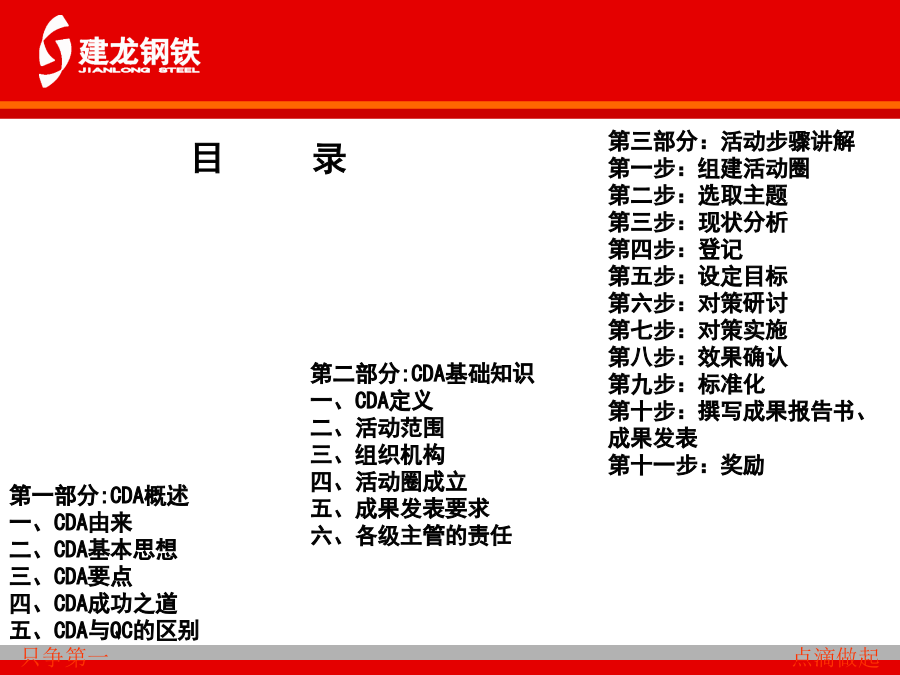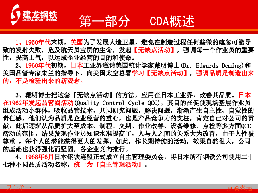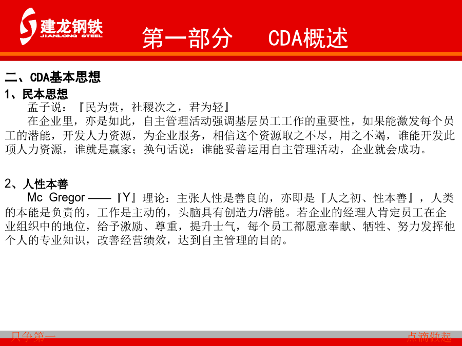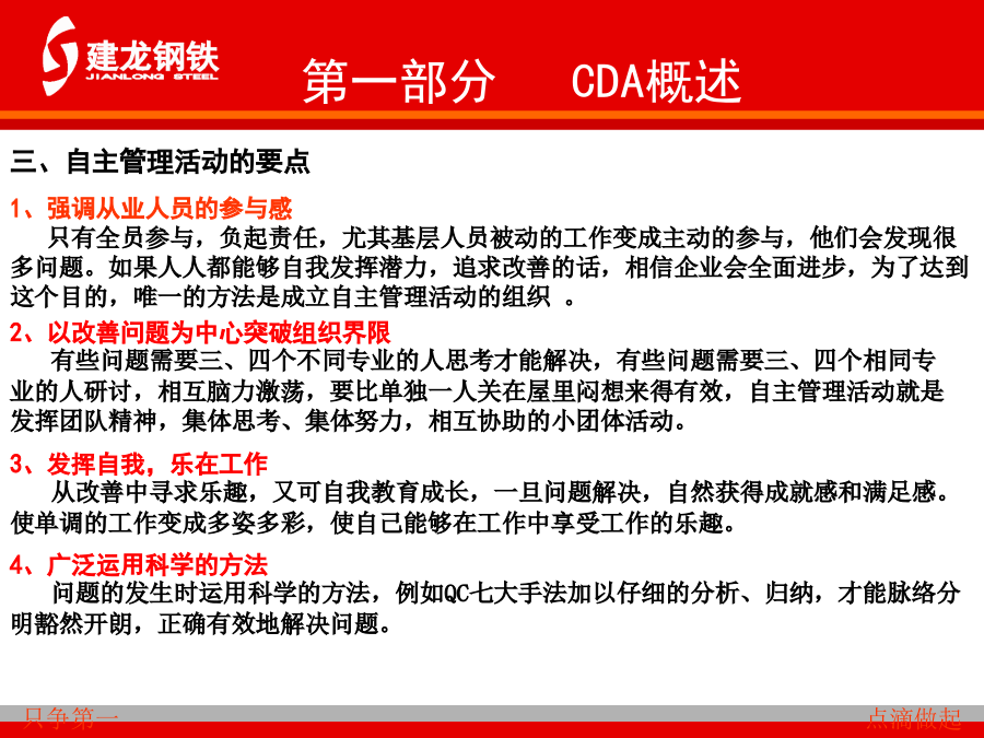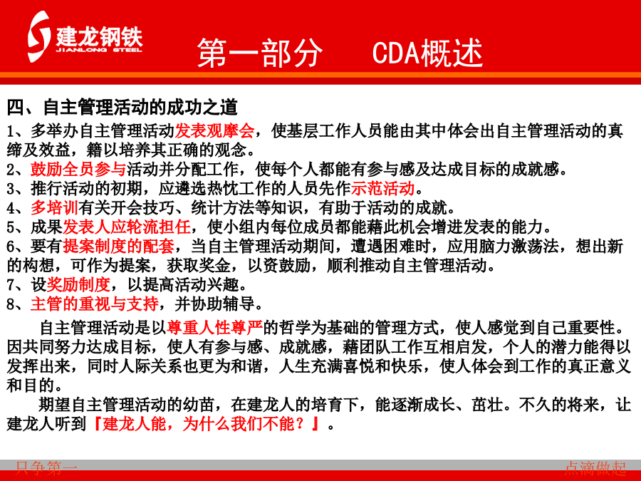 自主管理活动培训讲义二、推行自主管理活动的目的(why)自主管理活动能够激发员工的创造潜能和工作热情,通过团队的智慧与力量,运用各种科学管理方法、工具,提升圈员的问题意识以及分析问题和解决问题的能力,为公司培养高水平人才,从而创造工作价值及组织活力。第三部分:活动步骤讲解第一步:组建活动圈第二步:选取主题第三步:现状分析第四步:登记第五步:设定目标第六步:对策研讨第七步:对策实施第八步:效果确认第九步:标准化第十步:撰写成果报告书、成果发表第十一步:奖励一、CDA由来二、CDA基本思想三、自主管理活动的要点四、自主管理活动的成功之道五、自主管理活动与QC的区别第二部分CDA基础知识三、组织机构1、所有基层作业人员均有资格组成自主管理活动圈。2、活动圈的组成具有弹性,可由同一工作单位或不同工作单位人员组成,活动圈人数一般5~10人,可视实际需要酌情增减人数。3、活动圈的圈名,由圈员共同讨论投票决定。4、圈长由圈员选举产生,或者由圈员轮流担任。副圈长由圈长指定或由圈员选举产生。5、根据活动圈的需要,辅导员一般由作业长、工程师、新入企大学生担任。6、会议记录人员及会议主席根据不同阶段合理安排。第三部分CDA活动步骤第三部分CDA活动步骤第三部分CDA活动步骤第三部分CDA活动步骤第一步、组建活动圈没问题和有问题有一个企业家坐在餐厅的角落了,独立一人喝着闷酒,一位热心人走过来,问道:您一定有什么难解的问题,不妨说出来,让我给你帮帮忙。企业家看了他一眼,冷冷的说:我的问题太多了,没人能帮我。热心人掏出一张名片,要企业家明天到他的办公室。第二天,企业家如约前往,热新人说:走,我带你去个地方。企业家不知道他葫芦里面卖的什么药,热心人用车子把他带到荒郊野外,两个人下车后,热心人指着前面的坟场对企业家说,你看看吧,只有躺下的人才统统是没有问题的,企业家恍然大悟。第二步、选取活动主题参考一1、把问题的背景、重要性及紧急性表现出来,以凸显改善的价值。2、表达力求具体且符合事实,故应数据作判断依据。3、能以容易了解的图表如柏拉图、推移图、长条图表达更佳。8、甘特图示例第三步、分析现状4、收集数据(查检表)数据=事实是CDA的生命,要具有代表性、真实性、时效性。数据可以分为计量值数据和计数值数据。第四步、登记第五步、设定目标值第六步、对策研讨第六步、对策研讨示例4、提出对策的技巧(3)希望列举法缺点列举法是把握问题点的方法,是消极性的,相对的希望点列举法是具有积极性的意义。例如;钢笔a希望能出墨水。b希望能使用2种以上颜色。c希望同时写粗笔字和细笔字。d希望放在衣袋里时能变小。e希望笔尖不会变粗。f希望不需替换墨水。g希望晚上也能看的h、…………..第七步、对策实施第七步、对策实施第七步、对策实施第八步、效果确认4、活用推移图效果确认注意事项(1)异常值必须记录发生之现象,原因并加以说明,于计算中除去异常值。(2)以数字表示真正效果,必须将改善前所收集的数据全部列出。(3)改善中对策需分段实施,推移图记入对策编号,有异常点亦必须画在方格子重点,以确认各对策之效果。(4)效果有副作用时,必须两者同时比较利弊得失。(5)对策实施中要注意效果,有严重不良发生时,应立即停止对策实施。(6)确认效果的尺寸需前后一致,特性要相同。(7)数据要不断的收集,未完成的对策继续实施,在确认效果。(8)效果确认的时间a改善前:对策开始实施以前。b改善中:改善对策实施至厂处级发表会以前。(3)改善后:厂处级发表会以后。第九步、对策标准化1、撰写成果报告书的目的3、成果报告书的内容第十步、成果发表及奖励第十步、成果发表及奖励3、相关制度(1)活动圈在对策实施完毕后,效果持续至少2个月方可参加发表会;发表会后需继续追踪效果持续情况至少4个月。(2)成果发表会分为集团发表会、公司级发表会和厂处级发表会。集团发表会原则上每年10月份举办一次;公司级发表会和厂处级发表会每四个月举办一次。(3)若公司活动圈完成主题总数16(含)个以下,厂处级发表会和公司级发表会要合并举办。原则上完成5(含)个以上主题的厂处,才可以组织厂处级发表会;完成的主题少于5个的厂处须合并举办厂处级发表会,合并举办的方式由各公司管理委员会事务小组根据实际情况规定。(4)公司级发表会的主题数量入选规则:1)主题总数最多不得超过16个;2)完成主题数量较多的厂处,入选公司级发表会的主题数也多。入选主题数计算方法:15*本厂处主题数/公司总主题数。(5)每届公司级发表会的第一名,推荐参加集团成果发表会,重复得奖,由公司工作组决定。发表会5、集团级表彰(1)每年办理一次优秀圈表彰,评选出上一周期年主题积分前20个(同积分者并列入围)为优秀圈,于集团成果发表暨总结大会上公开表