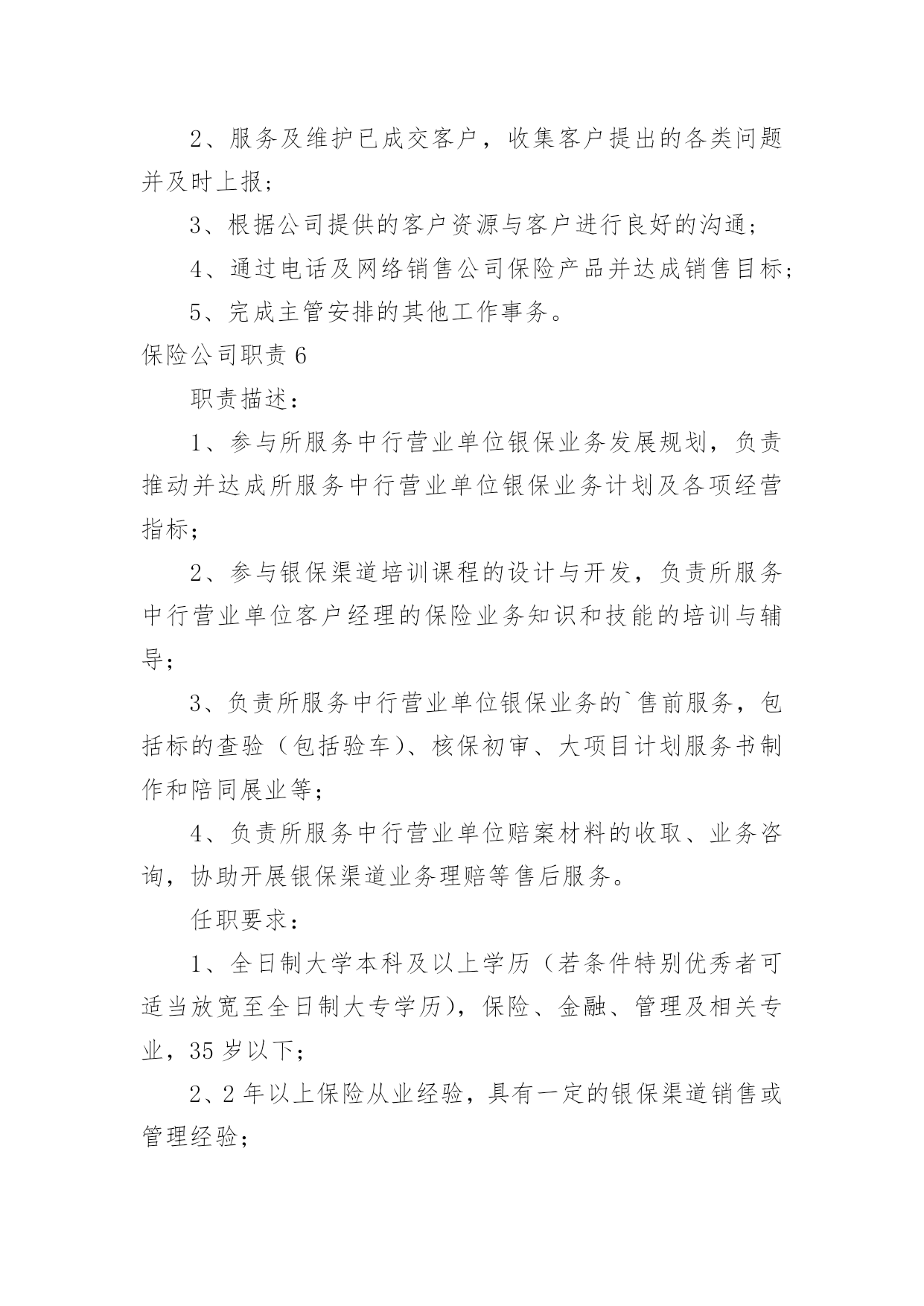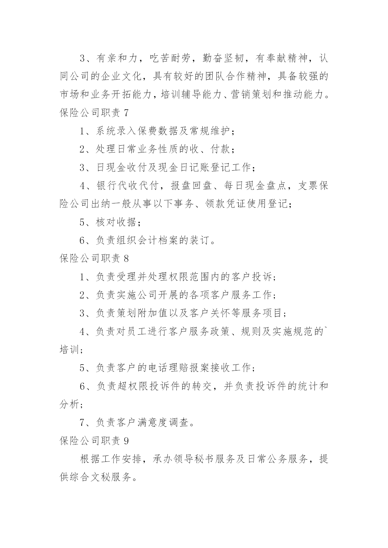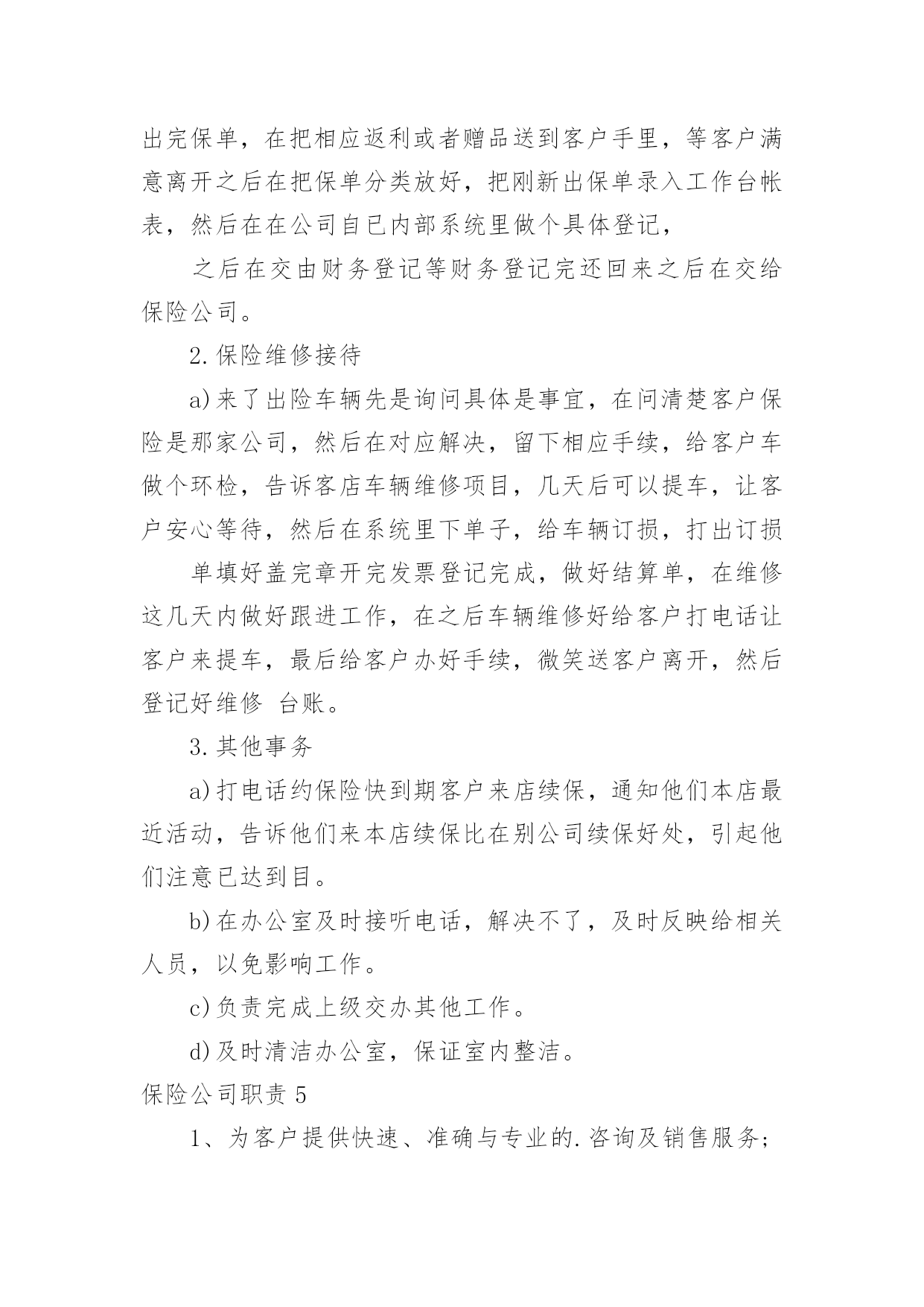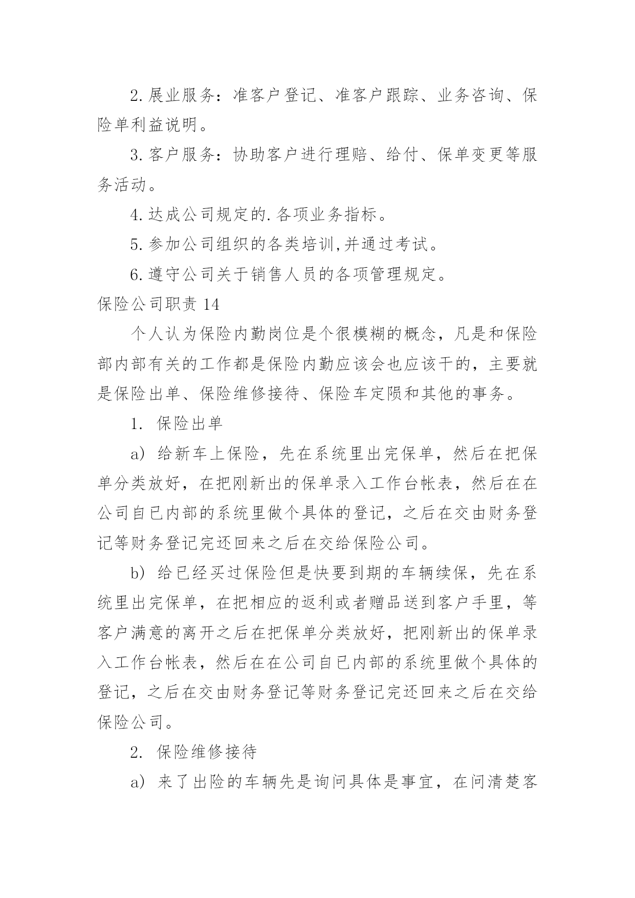 保险公司职责保险公司职责(15篇)保险公司职责11.负责起草公司业务风险控制的相关工作流程、制度,并对相关的制度提出改进意见。2.与业务部共同对每项业务按工作流程的规定进行完全的'风险调查与评估。3.协同法律资产保全部共同对每项业务的实际操作过程及法律文件进行风险分析与评估。4.完成业务风险分析评估报告,向审贷委员会汇报业务风险调查与分析评估结果。5.协助各部门已放贷业务进行跟踪监督。保险公司职责2讲师中国太平洋人寿保险股份有限公司,中国太平洋人寿保险股份有限公司,岗位职责1、组织营销团队的各类培训,开展授课工作;2、追踪培训反馈、评估培训效果、分析培训活动;3、定期开发各类培训课程、教辅工具。招聘方向(新人训练、主管训练、产品培训)任职要求1、全日制大学本科及以上学历;2、3年以上保险组训、讲师工作经验;3、优秀的组织协调能力、勇于开拓创新,具有挑战精神。4、为人正直、团队合作意识强,具备良好的沟通能力,能够承受较强的.工作压力。保险公司职责31.保障执行电话中心的总体工作计划,制定电话中心的各项业务及运营工作目标及工作计划,确保各业务及运营指标达到电话中心标准。2.认真贯彻执行公司和电话中心的各项规章制度、业务处理流程。负责电话中心客户服务人员各工作组的工作及岗位职责的落实,并对其工作质量进行检查。3.负责电话中心现场业务及运营管理,确保日常运营工作正常、顺利的进行。4.负责与相关部门、外部单位进行联系和沟通,为电话中心提供良好的.资讯沟通与使用环境。5.负责协调与解答客户提出的疑难问题,确保电话中心重大投诉的及时通报。6.协调团队关系,保持团结,提高员工满意度。保险公司职责41.保险出单a)给新车上保险,先在系统里出完保单,然后在把保单分类放好,在把刚新出保单录入工作台帐表,然后在在公司自已内部系统里做个具体登记,之后在交由财务登记等财务登记完还回来之后在交给保险公司。b)给已经买过保险但是快要到期车辆续保,先在系统里出完保单,在把相应返利或者赠品送到客户手里,等客户满意离开之后在把保单分类放好,把刚新出保单录入工作台帐表,然后在在公司自已内部系统里做个具体登记,之后在交由财务登记等财务登记完还回来之后在交给保险公司。2.保险维修接待a)来了出险车辆先是询问具体是事宜,在问清楚客户保险是那家公司,然后在对应解决,留下相应手续,给客户车做个环检,告诉客店车辆维修项目,几天后可以提车,让客户安心等待,然后在系统里下单子,给车辆订损,打出订损单填好盖完章开完发票登记完成,做好结算单,在维修这几天内做好跟进工作,在之后车辆维修好给客户打电话让客户来提车,最后给客户办好手续,微笑送客户离开,然后登记好维修台账。3.其他事务a)打电话约保险快到期客户来店续保,通知他们本店最近活动,告诉他们来本店续保比在别公司续保好处,引起他们注意已达到目。b)在办公室及时接听电话,解决不了,及时反映给相关人员,以免影响工作。c)负责完成上级交办其他工作。d)及时清洁办公室,保证室内整洁。保险公司职责51、为客户提供快速、准确与专业的.咨询及销售服务;2、服务及维护已成交客户,收集客户提出的各类问题并及时上报;3、根据公司提供的客户资源与客户进行良好的沟通;4、通过电话及网络销售公司保险产品并达成销售目标;5、完成主管安排的其他工作事务。保险公司职责6职责描述:1、参与所服务中行营业单位银保业务发展规划,负责推动并达成所服务中行营业单位银保业务计划及各项经营指标;2、参与银保渠道培训课程的设计与开发,负责所服务中行营业单位客户经理的保险业务知识和技能的培训与辅导;3、负责所服务中行营业单位银保业务的`售前服务,包括标的查验(包括验车)、核保初审、大项目计划服务书制作和陪同展业等;4、负责所服务中行营业单位赔案材料的收取、业务咨询,协助开展银保渠道业务理赔等售后服务。任职要求:1、全日制大学本科及以上学历(若条件特别优秀者可适当放宽至全日制大专学历),保险、金融、管理及相关专业,35岁以下;2、2年以上保险从业经验,具有一定的银保渠道销售或管理经验;3、有亲和力,吃苦耐劳,勤奋坚韧,有奉献精神,认同公司的企业文化,具有较好的团队合作精神,具备较强的市场和业务开拓能力,培训辅导能力、营销策划和推动能力。保险公司职责71、系统录入保费数据及常规维护;2、处理日常业务性质的收、付款;3、日现金收付及现金日记账登记工作;4、银行代收代付,报盘回盘、每日现金盘点,支票保险公司出纳一般从事以下事务、领款凭证使用登记;5、核对收据;6、负责组织会计档案的装订。保险公司职责81、负责受理并处理权限范围内的客户投诉;2、负责实施公司开展的各项客户服务工作;3、负责策划附加值以及客户关怀等服务项目;4、负责对员工进行客户服务政策、规则及实施规范的`培训;5、负责客户的