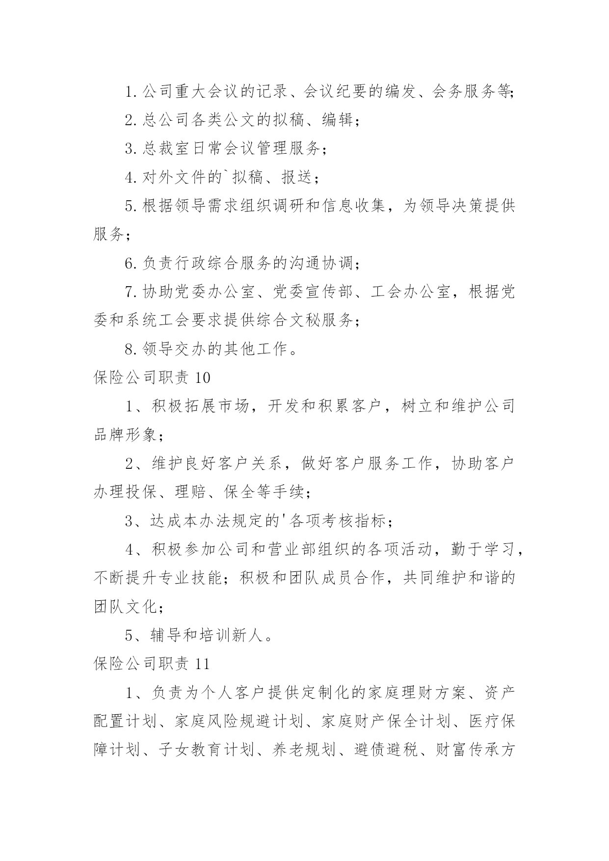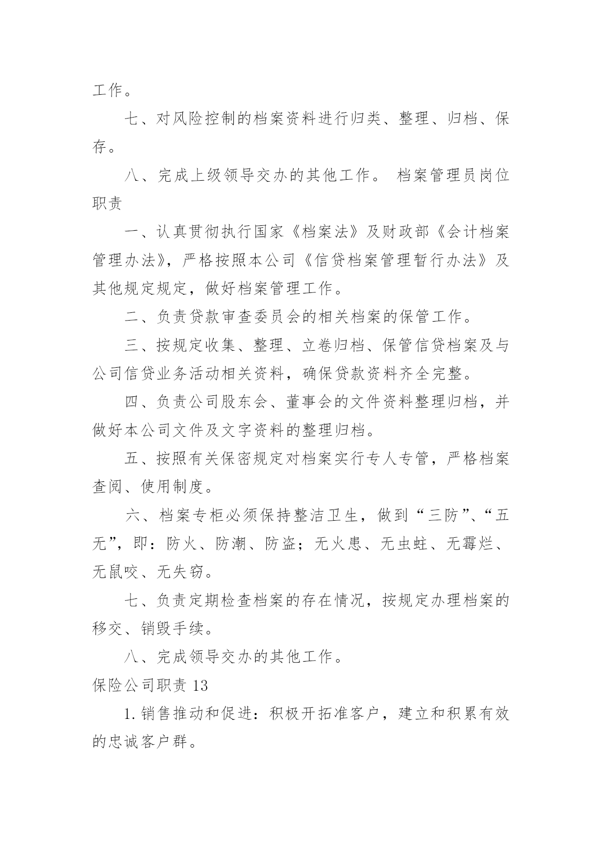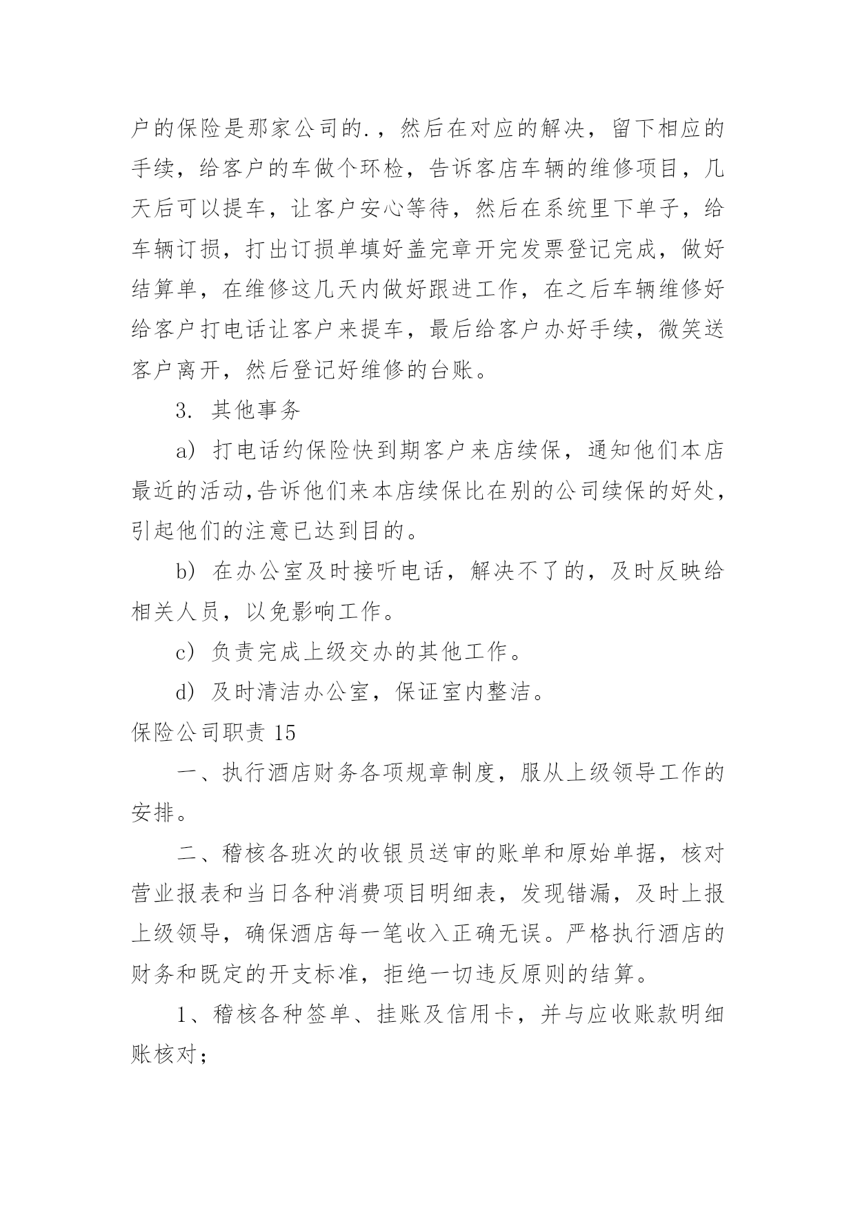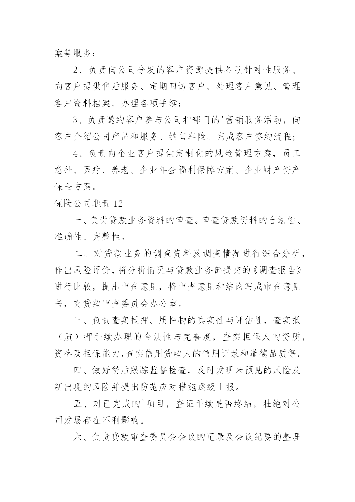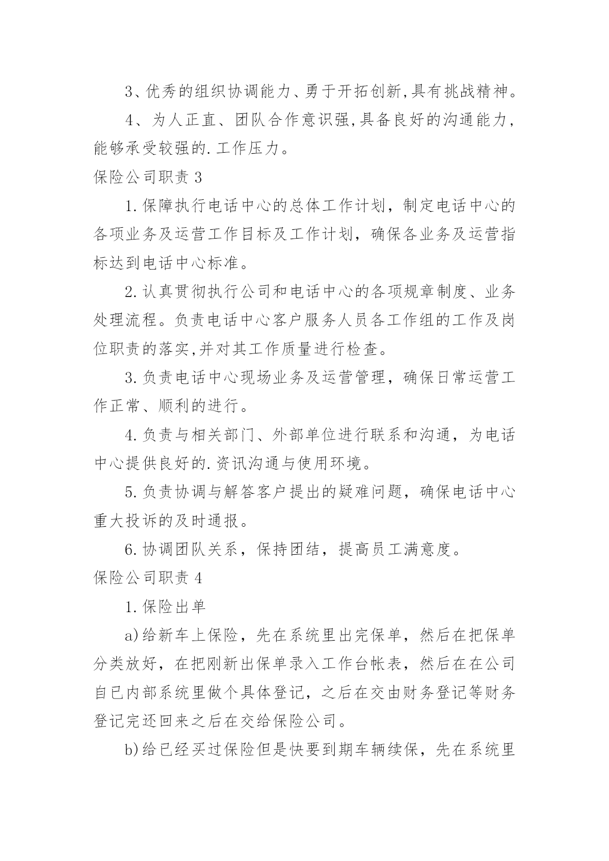 保险公司职责保险公司职责(15篇)保险公司职责11.负责起草公司业务风险控制的相关工作流程、制度,并对相关的制度提出改进意见。2.与业务部共同对每项业务按工作流程的规定进行完全的'风险调查与评估。3.协同法律资产保全部共同对每项业务的实际操作过程及法律文件进行风险分析与评估。4.完成业务风险分析评估报告,向审贷委员会汇报业务风险调查与分析评估结果。5.协助各部门已放贷业务进行跟踪监督。保险公司职责2讲师中国太平洋人寿保险股份有限公司,中国太平洋人寿保险股份有限公司,岗位职责1、组织营销团队的各类培训,开展授课工作;2、追踪培训反馈、评估培训效果、分析培训活动;3、定期开发各类培训课程、教辅工具。招聘方向(新人训练、主管训练、产品培训)任职要求1、全日制大学本科及以上学历;2、3年以上保险组训、讲师工作经验;3、优秀的组织协调能力、勇于开拓创新,具有挑战精神。4、为人正直、团队合作意识强,具备良好的沟通能力,能够承受较强的.工作压力。保险公司职责31.保障执行电话中心的总体工作计划,制定电话中心的各项业务及运营工作目标及工作计划,确保各业务及运营指标达到电话中心标准。2.认真贯彻执行公司和电话中心的各项规章制度、业务处理流程。负责电话中心客户服务人员各工作组的工作及岗位职责的落实,并对其工作质量进行检查。3.负责电话中心现场业务及运营管理,确保日常运营工作正常、顺利的进行。4.负责与相关部门、外部单位进行联系和沟通,为电话中心提供良好的.资讯沟通与使用环境。5.负责协调与解答客户提出的疑难问题,确保电话中心重大投诉的及时通报。6.协调团队关系,保持团结,提高员工满意度。保险公司职责41.保险出单a)给新车上保险,先在系统里出完保单,然后在把保单分类放好,在把刚新出保单录入工作台帐表,然后在在公司自已内部系统里做个具体登记,之后在交由财务登记等财务登记完还回来之后在交给保险公司。b)给已经买过保险但是快要到期车辆续保,先在系统里出完保单,在把相应返利或者赠品送到客户手里,等客户满意离开之后在把保单分类放好,把刚新出保单录入工作台帐表,然后在在公司自已内部系统里做个具体登记,之后在交由财务登记等财务登记完还回来之后在交给保险公司。2.保险维修接待a)来了出险车辆先是询问具体是事宜,在问清楚客户保险是那家公司,然后在对应解决,留下相应手续,给客户车做个环检,告诉客店车辆维修项目,几天后可以提车,让客户安心等待,然后在系统里下单子,给车辆订损,打出订损单填好盖完章开完发票登记完成,做好结算单,在维修这几天内做好跟进工作,在之后车辆维修好给客户打电话让客户来提车,最后给客户办好手续,微笑送客户离开,然后登记好维修台账。3.其他事务a)打电话约保险快到期客户来店续保,通知他们本店最近活动,告诉他们来本店续保比在别公司续保好处,引起他们注意已达到目。b)在办公室及时接听电话,解决不了,及时反映给相关人员,以免影响工作。c)负责完成上级交办其他工作。d)及时清洁办公室,保证室内整洁。保险公司职责51、为客户提供快速、准确与专业的.咨询及销售服务;2、服务及维护已成交客户,收集客户提出的各类问题并及时上报;3、根据公司提供的客户资源与客户进行良好的沟通;4、通过电话及网络销售公司保险产品并达成销售目标;5、完成主管安排的其他工作事务。保险公司职责6职责描述:1、参与所服务中行营业单位银保业务发展规划,负责推动并达成所服务中行营业单位银保业务计划及各项经营指标;2、参与银保渠道培训课程的设计与开发,负责所服务中行营业单位客户经理的保险业务知识和技能的培训与辅导;3、负责所服务中行营业单位银保业务的`售前服务,包括标的查验(包括验车)、核保初审、大项目计划服务书制作和陪同展业等;4、负责所服务中行营业单位赔案材料的收取、业务咨询,协助开展银保渠道业务理赔等售后服务。任职要求:1、全日制大学本科及以上学历(若条件特别优秀者可适当放宽至全日制大专学历),保险、金融、管理及相关专业,35岁以下;2、2年以上保险从业经验,具有一定的银保渠道销售或管理经验;3、有亲和力,吃苦耐劳,勤奋坚韧,有奉献精神,认同公司的企业文化,具有较好的团队合作精神,具备较强的市场和业务开拓能力,培训辅导能力、营销策划和推动能力。保险公司职责71、系统录入保费数据及常规维护;2、处理日常业务性质的收、付款;3、日现金收付及现金日记账登记工作;4、银行代收代付,报盘回盘、每日现金盘点,支票保险公司出纳一般从事以下事务、领款凭证使用登记;5、核对收据;6、负责组织会计档案的装订。保险公司职责81、负责受理并处理权限范围内的客户投诉;2、负责实施公司开展的各项客户服务工作;3、负责策划附加值以及客户关怀等服务项目;4、负责对员工进行客户服务政策、规则及实施规范的`培训;5、负责客户的
