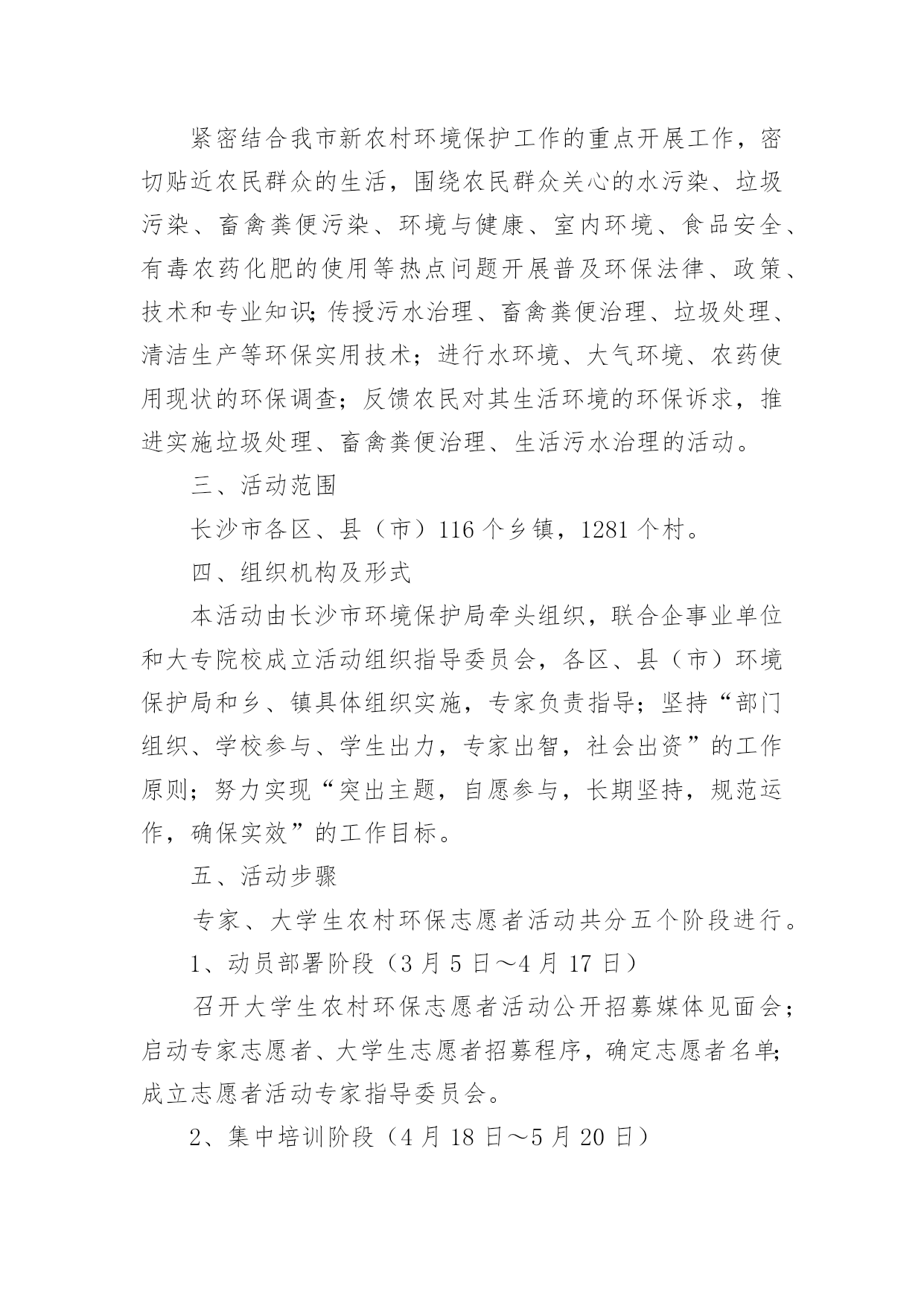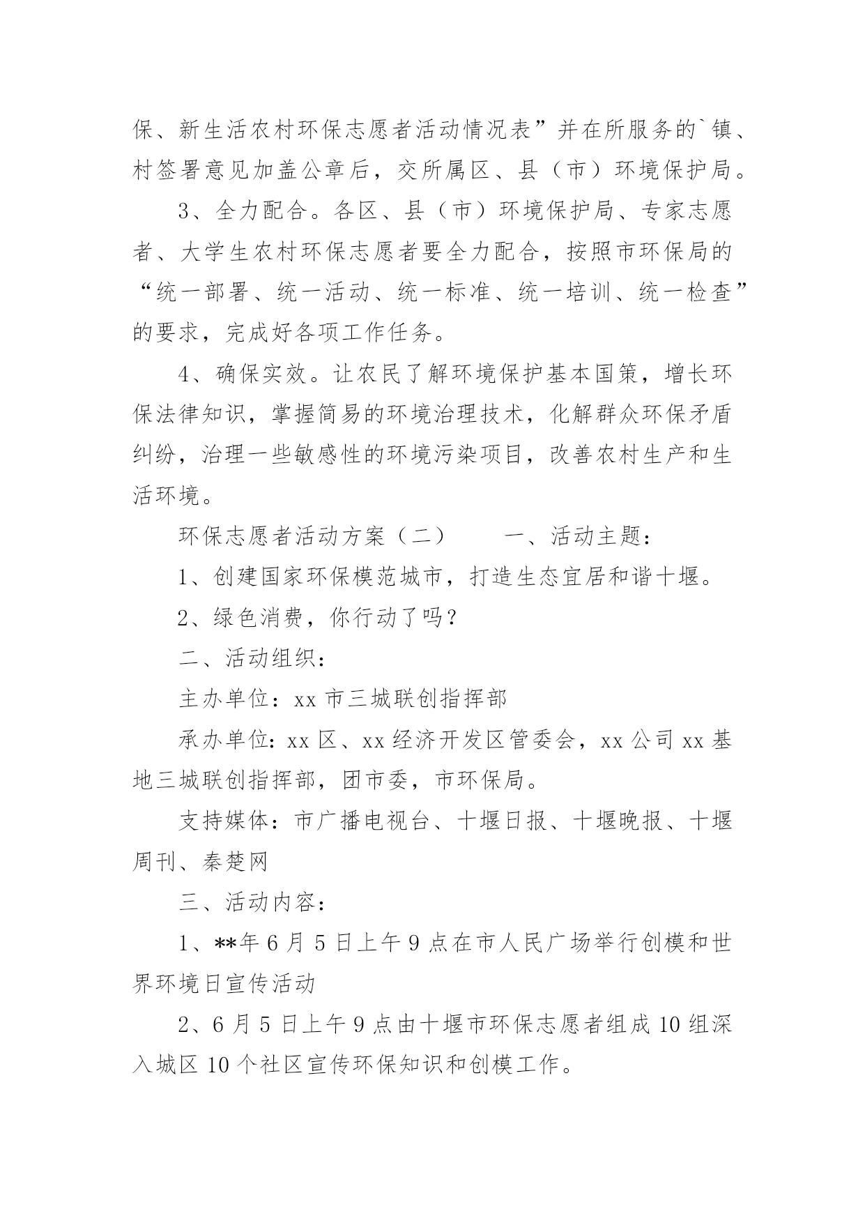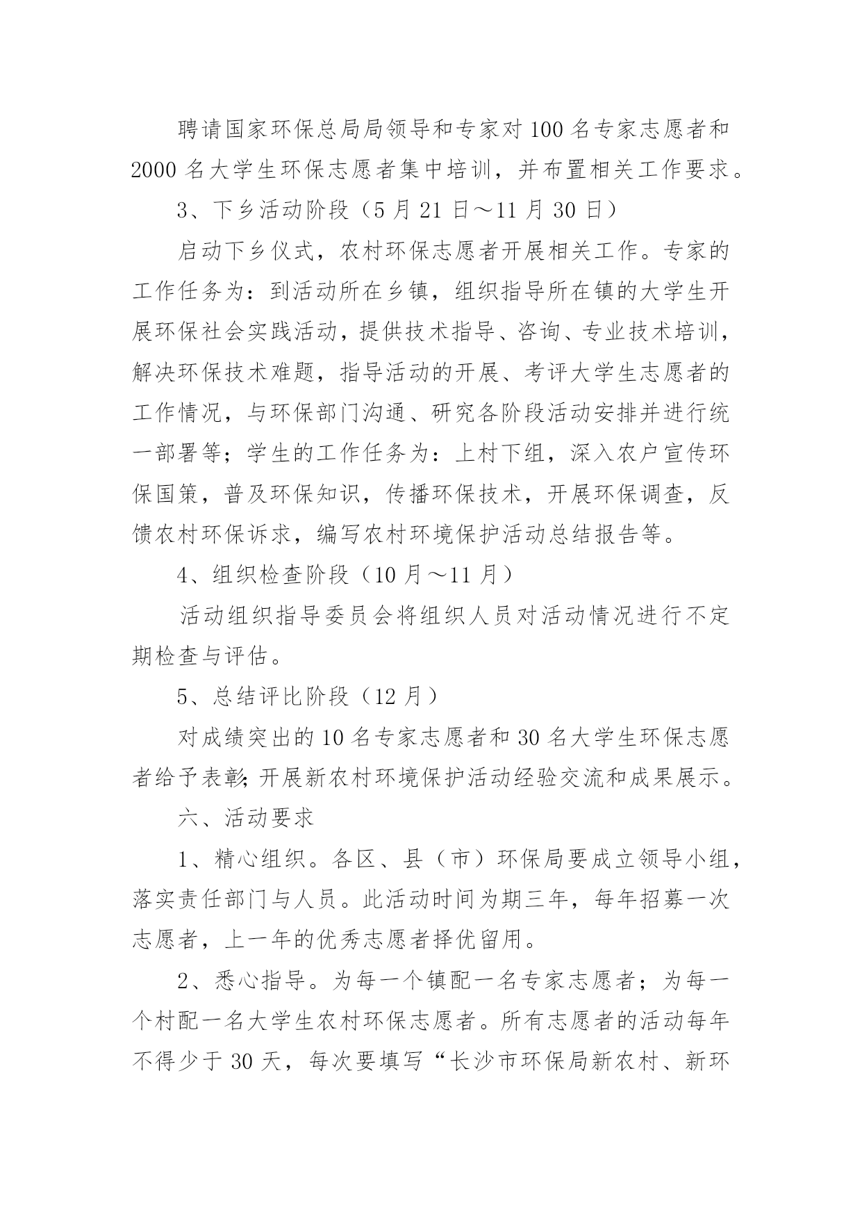 环保志愿者活动方案环保志愿者活动方案导语:针对环保志愿者活动,大家会制定怎样的方案?下面是小编整理的环保志愿者活动方案,供各位参考。环保志愿者活动方案(一)一、活动意义当前我市农村环境形势严峻,面源污染、农村生活污染、畜禽养殖业污染、生活垃圾污染问题突出;农业固体废物处置不当;农药、化肥施用不合理;城市污染向农村转移;农村环保专业人员空缺;农民环保知识缺乏。人居环境“脏、乱、差”问题普遍存在,部分地区饮用水水质安全受到严重威胁,农村的环境监管能力十分薄弱。为提高农民群众环境保护意识和科技文化素质,改善农村环境质量,长沙市环境保护局决定,在全市组织专家、大学生参加农村环保志愿者活动,旨在调动全社会的力量积极推进我市农村“生产发展、生活宽裕、乡风文明、村容整洁、管理民主”的新农村建设;推进“清洁家园、清洁水源、清洁田园、清洁能源”新环保建设;推进“富裕文明,和乐和美,和谐安康”的新生活建设。向农民群众普及环境保护科学知识,宣传环保基本国策,掌握环保法律知识和污染治理技术,化解农民群众环保纠纷,动员广大农民群众自觉地参与新农村环境保护工作,引导农民群众关注、理解与支持环保工作,提升农村整体环境质量,促进农村人与自然的和谐发展。二、活动内容紧密结合我市新农村环境保护工作的重点开展工作,密切贴近农民群众的生活,围绕农民群众关心的水污染、垃圾污染、畜禽粪便污染、环境与健康、室内环境、食品安全、有毒农药化肥的使用等热点问题开展普及环保法律、政策、技术和专业知识;传授污水治理、畜禽粪便治理、垃圾处理、清洁生产等环保实用技术;进行水环境、大气环境、农药使用现状的环保调查;反馈农民对其生活环境的环保诉求,推进实施垃圾处理、畜禽粪便治理、生活污水治理的活动。三、活动范围长沙市各区、县(市)116个乡镇,1281个村。四、组织机构及形式本活动由长沙市环境保护局牵头组织,联合企事业单位和大专院校成立活动组织指导委员会,各区、县(市)环境保护局和乡、镇具体组织实施,专家负责指导;坚持“部门组织、学校参与、学生出力,专家出智,社会出资”的工作原则;努力实现“突出主题,自愿参与,长期坚持,规范运作,确保实效”的工作目标。五、活动步骤专家、大学生农村环保志愿者活动共分五个阶段进行。1、动员部署阶段(3月5日~4月17日)召开大学生农村环保志愿者活动公开招募媒体见面会;启动专家志愿者、大学生志愿者招募程序,确定志愿者名单;成立志愿者活动专家指导委员会。2、集中培训阶段(4月18日~5月20日)聘请国家环保总局局领导和专家对100名专家志愿者和2000名大学生环保志愿者集中培训,并布置相关工作要求。3、下乡活动阶段(5月21日~11月30日)启动下乡仪式,农村环保志愿者开展相关工作。专家的工作任务为:到活动所在乡镇,组织指导所在镇的大学生开展环保社会实践活动,提供技术指导、咨询、专业技术培训,解决环保技术难题,指导活动的开展、考评大学生志愿者的工作情况,与环保部门沟通、研究各阶段活动安排并进行统一部署等;学生的工作任务为:上村下组,深入农户宣传环保国策,普及环保知识,传播环保技术,开展环保调查,反馈农村环保诉求,编写农村环境保护活动总结报告等。4、组织检查阶段(10月~11月)活动组织指导委员会将组织人员对活动情况进行不定期检查与评估。5、总结评比阶段(12月)对成绩突出的10名专家志愿者和30名大学生环保志愿者给予表彰;开展新农村环境保护活动经验交流和成果展示。六、活动要求1、精心组织。各区、县(市)环保局要成立领导小组,落实责任部门与人员。此活动时间为期三年,每年招募一次志愿者,上一年的优秀志愿者择优留用。2、悉心指导。为每一个镇配一名专家志愿者;为每一个村配一名大学生农村环保志愿者。所有志愿者的活动每年不得少于30天,每次要填写“长沙市环保局新农村、新环保、新生活农村环保志愿者活动情况表”并在所服务的`镇、村签署意见加盖公章后,交所属区、县(市)环境保护局。3、全力配合。各区、县(市)环境保护局、专家志愿者、大学生农村环保志愿者要全力配合,按照市环保局的“统一部署、统一活动、统一标准、统一培训、统一检查”的要求,完成好各项工作任务。4、确保实效。让农民了解环境保护基本国策,增长环保法律知识,掌握简易的环境治理技术,化解群众环保矛盾纠纷,治理一些敏感性的环境污染项目,改善农村生产和生活环境。环保志愿者活动方案(二)一、活动主题:1、创建国家环保模范城市,打造生态宜居和谐十堰。2、绿色消费,你行动了吗?二、活动组织:主办单位:xx市三城联创指挥部承办单位:xx区、xx经济开发区管委会,xx公司xx基地三城联创指挥部,团市委,市环保局。支持媒体:市广播电视台、十堰日报、十堰晚报、十堰周刊、秦楚网三、活动内容:1、**年6月5日上午9点在市人民广场举行创模和世界