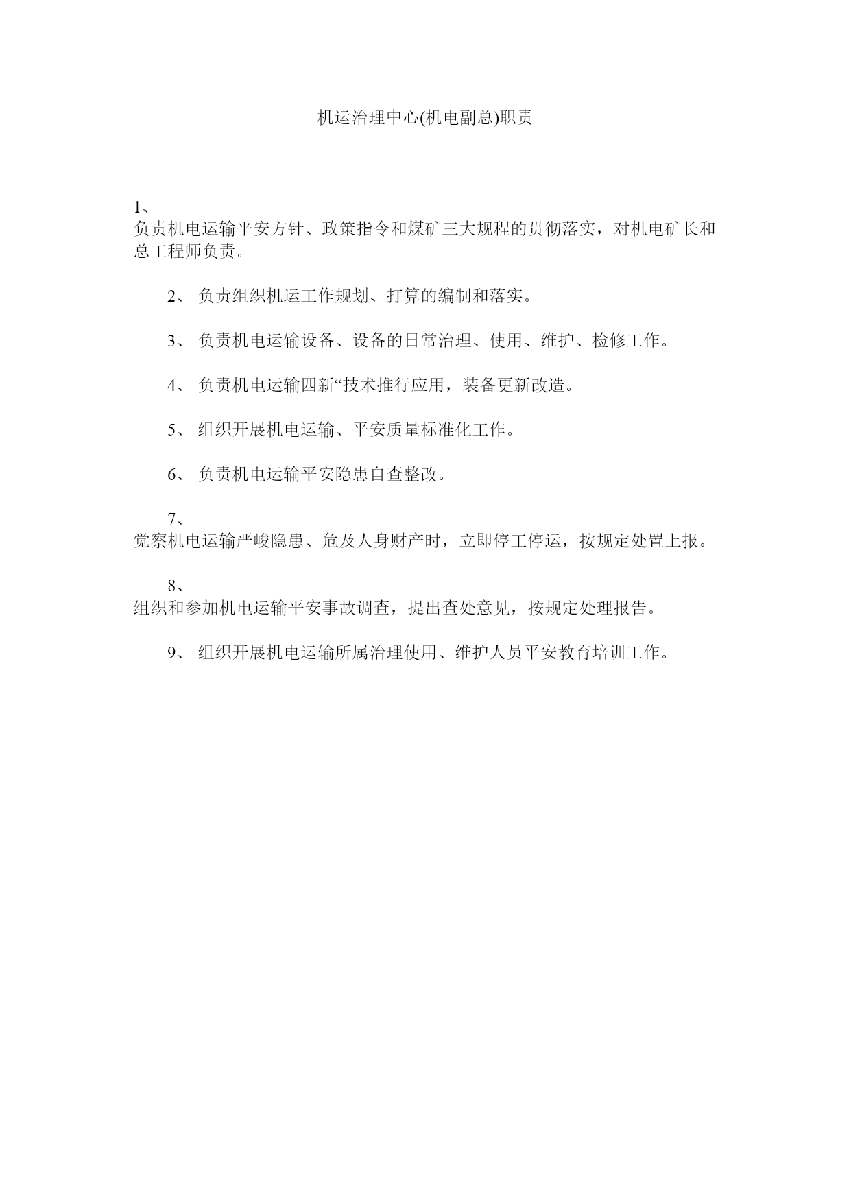 机运治理中心(机电副总)职责1、负责机电运输平安方针、政策指令和煤矿三大规程的贯彻落实,对机电矿长和总工程师负责。2、负责组织机运工作规划、打算的编制和落实。3、负责机电运输设备、设备的日常治理、使用、维护、检修工作。4、负责机电运输四新“技术推行应用,装备更新改造。5、组织开展机电运输、平安质量标准化工作。6、负责机电运输平安隐患自查整改。7、觉察机电运输严峻隐患、危及人身财产时,立即停工停运,按规定处置上报。8、组织和参加机电运输平安事故调查,提出查处意见,按规定处理报告。9、组织开展机电运输所属治理使用、维护人员平安教育培训工作。