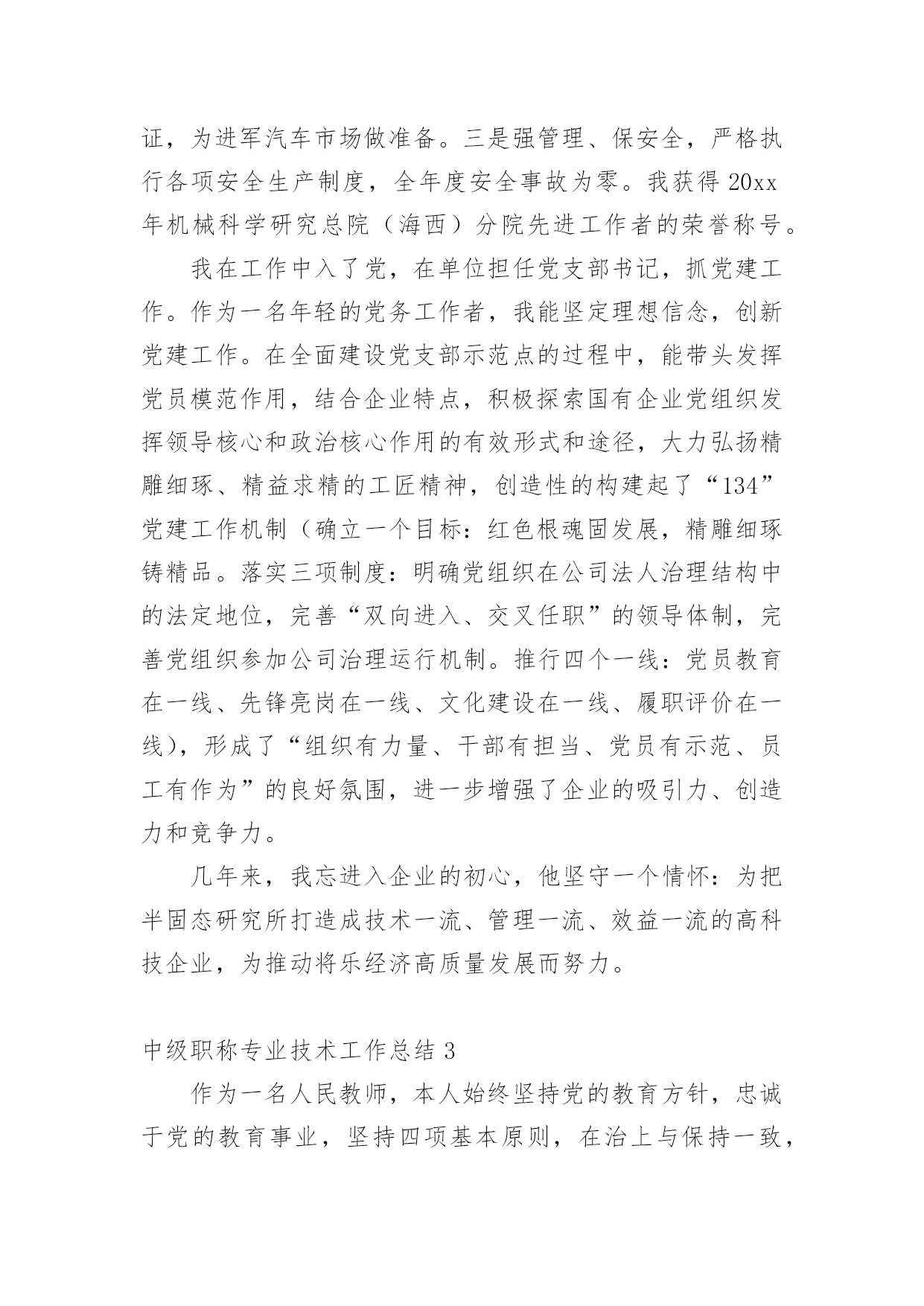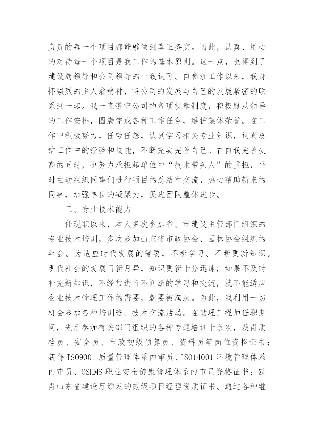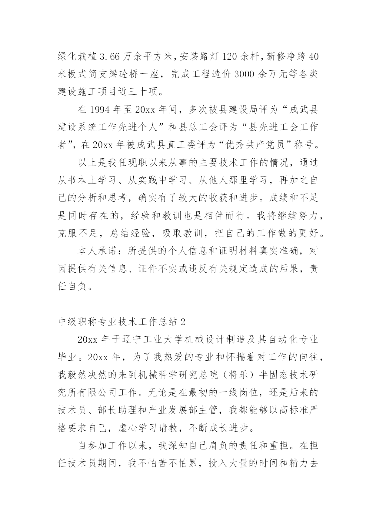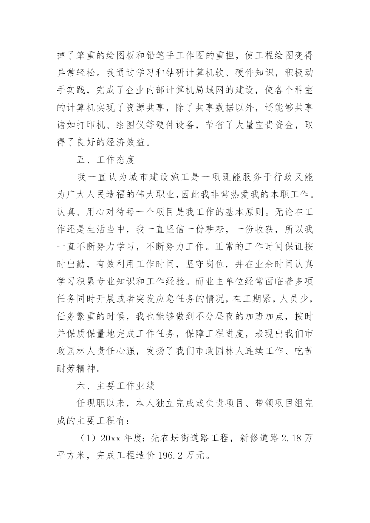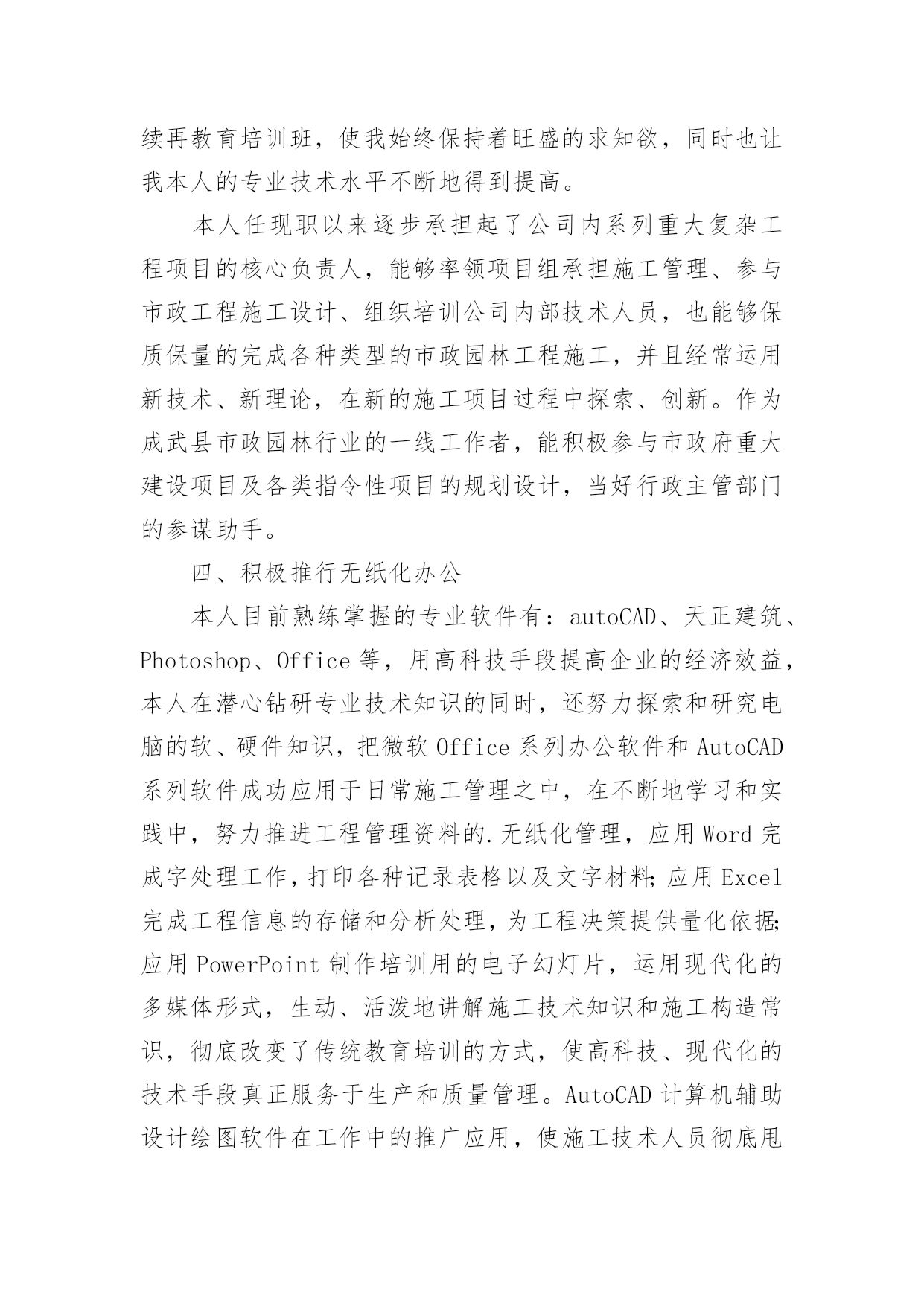 中级职称专业技术工作总结中级职称专业技术工作总结【实用15篇】总结就是把一个时段的学习、工作或其完成情况进行一次全面系统的总结,它可以帮助我们有寻找学习和工作中的规律,让我们来为自己写一份总结吧。我们该怎么写总结呢?下面是小编精心整理的中级职称专业技术工作总结,仅供参考,大家一起来看看吧。中级职称专业技术工作总结1一、个人简历本人1987年毕业于中央农业广播学校,农学专业,中专学历。就职于成武县市政园林处从事市政道路、桥梁、排水和园林绿化施工工作。1994年被任命为成武县是真园林处副主任至今。一直从事市政道路、桥梁、排水和园林绿化施工工作,在“德、能、勤、绩”等方面均表现突出。二、政治思想及道德品质首先,在思想上积极要求进步,紧跟时代步伐,认真学习党和国家的方针政策,了解社会的最新动态。一直以一名党员的标准严格要求自己,自觉接受党组织和同事们的监督和帮助,坚持不懈地克服自身的缺点,弥补自己的不足,争取在以后漫长的岁月中经得起考验。作为一个城市建设的工作者,我一直坚守建筑行业的职业道德,努力在行政手段、大众利益与群众需求之间寻找最大交集和平衡点,力求我所负责的每一个项目都能够做到真正务实。因此,认真、用心的对待每一个项目是我工作的基本原则。这一点,也得到了建设局领导和公司领导的一致认可。自参加工作以来,我身怀强烈的主人翁精神,将公司的发展与自己的发展紧密的联系到一起。我一直遵守公司的各项规章制度,积极服从领导的工作安排,圆满完成各种工作任务,维护集体荣誉。在工作中积极努力,任劳任怨,认真学习相关专业知识,认真总结工作中的经验和技能,不断充实完善自己。在自我完善提高的同时,也努力承担起单位中“技术带头人”的重担,平时主动组织同事们进行项目的总结和交流,热心帮助新来的同事,加强单位的凝聚力,促进团队整体进步。三、专业技术能力任现职以来,本人多次参加省、市建设主管部门组织的专业技术培训,多次参加山东省市政协会、园林协会组织的年会。为适应时代发展的需要,不断学习、不断更新知识。现代社会的发展日新月异,知识更新十分迅速,如果不及时补充新知识,不经常进行不间断的学习和交流,就不能适应企业技术管理工作的需要,就要被淘汰。为此,我利用一切机会参加各种培训班、技术交流活动。在助理工程师任职期间,先后参加有关部门组织的各种专题培训十余次,获得质检员、安全员、市政初级预算员、资料员等岗位资格证书;获得ISO9001质量管理体系内审员、ISO14001环境管理体系内审员、OSHMS职业安全健康管理体系内审员资格证书;获得山东省建设厅颁发的贰级项目经理资质证书。通过各种继续再教育培训班,使我始终保持着旺盛的求知欲,同时也让我本人的专业技术水平不断地得到提高。本人任现职以来逐步承担起了公司内系列重大复杂工程项目的核心负责人,能够率领项目组承担施工管理、参与市政工程施工设计、组织培训公司内部技术人员,也能够保质保量的完成各种类型的市政园林工程施工,并且经常运用新技术、新理论,在新的施工项目过程中探索、创新。作为成武县市政园林行业的一线工作者,能积极参与市政府重大建设项目及各类指令性项目的规划设计,当好行政主管部门的参谋助手。四、积极推行无纸化办公本人目前熟练掌握的专业软件有:autoCAD、天正建筑、Photoshop、Office等,用高科技手段提高企业的经济效益,本人在潜心钻研专业技术知识的同时,还努力探索和研究电脑的软、硬件知识,把微软Office系列办公软件和AutoCAD系列软件成功应用于日常施工管理之中,在不断地学习和实践中,努力推进工程管理资料的.无纸化管理,应用Word完成字处理工作,打印各种记录表格以及文字材料;应用Excel完成工程信息的存储和分析处理,为工程决策提供量化依据;应用PowerPoint制作培训用的电子幻灯片,运用现代化的多媒体形式,生动、活泼地讲解施工技术知识和施工构造常识,彻底改变了传统教育培训的方式,使高科技、现代化的技术手段真正服务于生产和质量管理。AutoCAD计算机辅助设计绘图软件在工作中的推广应用,使施工技术人员彻底甩掉了笨重的绘图板和铅笔手工作图的重担,使工程绘图变得异常轻松。我通过学习和钻研计算机软、硬件知识,积极动手实践,完成了企业内部计算机局域网的建设,使各个科室的计算机实现了资源共享,除了共享数据以外,还能够共享诸如打印机、绘图仪等硬件设备,节省了大量宝贵资金,取得了良好的经济效益。五、工作态度我一直认为城市建设施工是一项既能服务于行政又能为广大人民造福的伟大职业,因此我非常热爱我的本职工作。认真、用心对待每一个项目是我工作的基本原则。无论在工作还是生活当中,我一直坚信一份耕耘,一份收获,所以我一直不断努力学习,不断努力工作。正常的工作时间保证按时出勤,有效利用工作时间,坚守岗位,并在业余时间认真