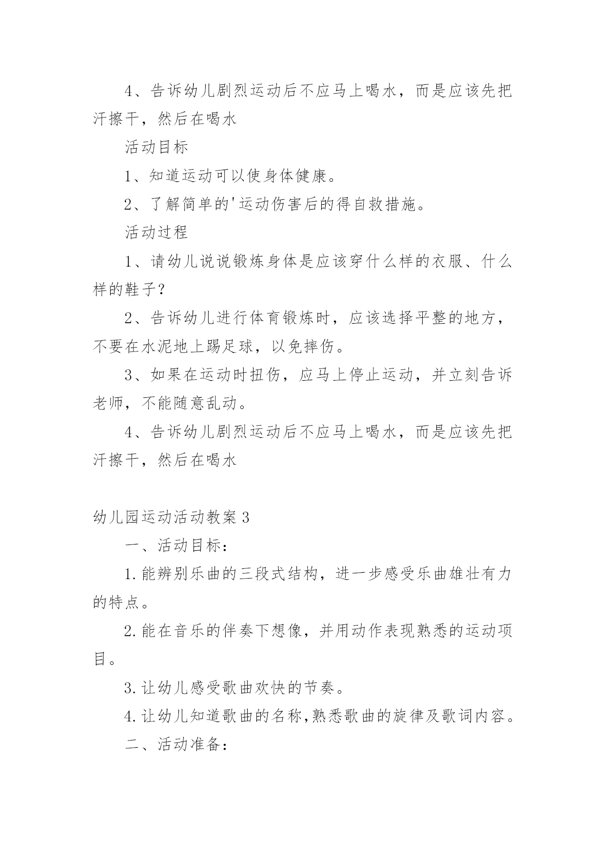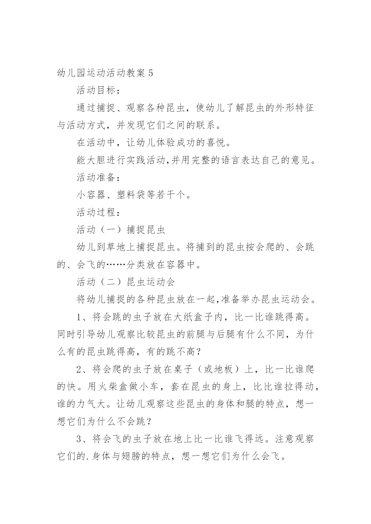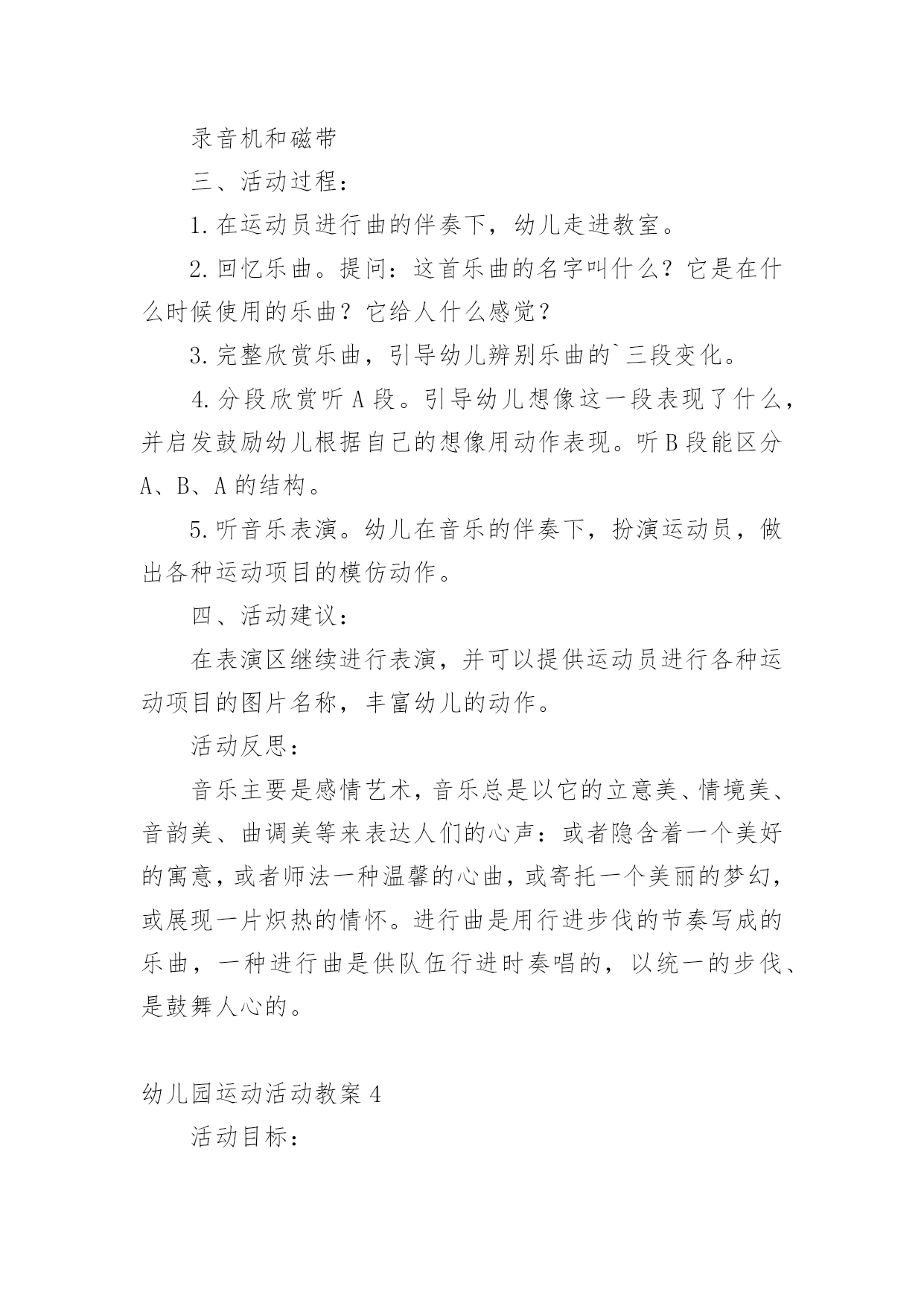 幼儿园运动活动教案作为一位优秀的人民教师,通常需要用到教案来辅助教学,教案有助于学生理解并掌握系统的知识。那么问题来了,教案应该怎么写?以下是小编帮大家整理的幼儿园运动活动教案,欢迎阅读,希望大家能够喜欢。幼儿园运动活动教案1活动目标1、通过观察与实验,使幼儿进一步感知不同物体的弹性现象,培养幼儿观察的敏锐性。2、培养幼儿对事物的好奇心,乐于大胆探究和实验。3、愿意大胆尝试,并与同伴分享自己的心得。4、学习用语言、符号等多种形式记录自己的发现。5、激发幼儿对科学活动的兴趣。活动准备皮球、橡筋、气球、弹簧、木块、铁片、弹性球、动物标靶、自制弹弓(每人一个)、纸制子弹等。活动过程拍一拍,捏一捏,感知不同物体的弹性。幼儿自主选择一个皮球跟着音乐拍球,其中有些皮球是没有气的。诱导幼儿按一按、捏一捏有气和没有气的皮球,共同找出原因,知道皮球打了气会弹得高,原来空气也有弹性。找一找生活中有弹性的物品。(1)在一大堆物品中找出有弹性的物品(如拉一拉弹簧、橡筋、捏一捏气球、海绵等)。(2)在日常生活中还有哪些物品是有弹性的。如弹簧床、海棉枕头、沙发、床垫、吹气救生圈等。玩一玩。(1)橡筋的一端系在中指上,另一端系一只小球,并用同一只手拿着球向下投,用手掌收回小球。(2)橡筋一端系着中指,然后一只手拿着球向前投,随后收回,重复投掷,可投向目标处。(3)固定橡筋一端,另一端手拉着小球,拉到一定的距离时放手,让球反弹回去,超过固定物的高度。(4)将长橡筋的`一端固定在乒乓球拍柄上,然后用球拍向上拍打小球,让小球弹上去又拉回来,反复拍打。做游戏。(1)看谁射中靶。用力投掷玩一玩中的小球,使橡皮筋拉长,让小球能打中相隔一定距离的动物标靶。(2)看谁弹得远。一手握小弹弓的把柄,另一手用纸制子弹拉紧橡筋,然后放手,让子弹弹出去。拉得越紧,子弹弹得越远。在地上按一定距离画三条线,超过最远一条线得3分,超过第二条线得2分,超过第一条线得1分。注意事项1.小弹弓不要对着别人。2.可分别采用集体活动、分组活动和自由活动的形式。拓展思路弹簧纸偶:先把一张大的长方形纸卷成筒状,然后在上面画上眼睛、嘴巴、耳朵及尾巴等。用另一张小纸条来回折叠,折成弹簧状,要求折得整齐。然后把纸筒粘在弹簧状纸条上,用手轻轻一按,它一会儿变矮,一会儿变高。活动反思在教师的启发下幼儿归纳出了弹性的概念。在分类活动中,幼儿再次操作,玩中观察,玩中发现,自然而然的将有弹性的物体和没有弹性的物体进行了分类。活动时,幼儿玩中学,学中玩,自主学习能力有了明显的增强。幼儿园运动活动教案2活动目标1、知道运动可以使身体健康。2、了解简单的运动伤害后的得自救措施。活动过程1请幼儿说说锻炼身体是应该穿什么样的衣服、什么样的鞋子?2、告诉幼儿进行体育锻炼时,应该选择平整的地方,不要在水泥地上踢足球,以免摔伤。3、如果在运动时扭伤,应马上停止运动,并立刻告诉老师,不能随意乱动。4、告诉幼儿剧烈运动后不应马上喝水,而是应该先把汗擦干,然后在喝水活动目标1、知道运动可以使身体健康。2、了解简单的'运动伤害后的得自救措施。活动过程1、请幼儿说说锻炼身体是应该穿什么样的衣服、什么样的鞋子?2、告诉幼儿进行体育锻炼时,应该选择平整的地方,不要在水泥地上踢足球,以免摔伤。3、如果在运动时扭伤,应马上停止运动,并立刻告诉老师,不能随意乱动。4、告诉幼儿剧烈运动后不应马上喝水,而是应该先把汗擦干,然后在喝水幼儿园运动活动教案3一、活动目标:1.能辨别乐曲的三段式结构,进一步感受乐曲雄壮有力的特点。2.能在音乐的伴奏下想像,并用动作表现熟悉的运动项目。3.让幼儿感受歌曲欢快的节奏。4.让幼儿知道歌曲的名称,熟悉歌曲的旋律及歌词内容。二、活动准备:录音机和磁带三、活动过程:1.在运动员进行曲的伴奏下,幼儿走进教室。2.回忆乐曲。提问:这首乐曲的名字叫什么?它是在什么时候使用的乐曲?它给人什么感觉?3.完整欣赏乐曲,引导幼儿辨别乐曲的`三段变化。4.分段欣赏听A段。引导幼儿想像这一段表现了什么,并启发鼓励幼儿根据自己的想像用动作表现。听B段能区分A、B、A的结构。5.听音乐表演。幼儿在音乐的伴奏下,扮演运动员,做出各种运动项目的模仿动作。四、活动建议:在表演区继续进行表演,并可以提供运动员进行各种运动项目的图片名称,丰富幼儿的动作。活动反思:音乐主要是感情艺术,音乐总是以它的立意美、情境美、音韵美、曲调美等来表达人们的心声:或者隐含着一个美好的寓意,或者师法一种温馨的心曲,或寄托一个美丽的梦幻,或展现一片炽热的情怀。进行曲是用行进步伐的节奏写成的乐曲,一种进行曲是供队伍行进时奏唱的,以统一的步伐、是鼓舞人心的。幼儿园运动活动教案4活动目标:1、和爸爸妈妈共同参与运动会,享受亲子活动的快乐。2、能控制自己的情绪,遵守运动规则。3、积极