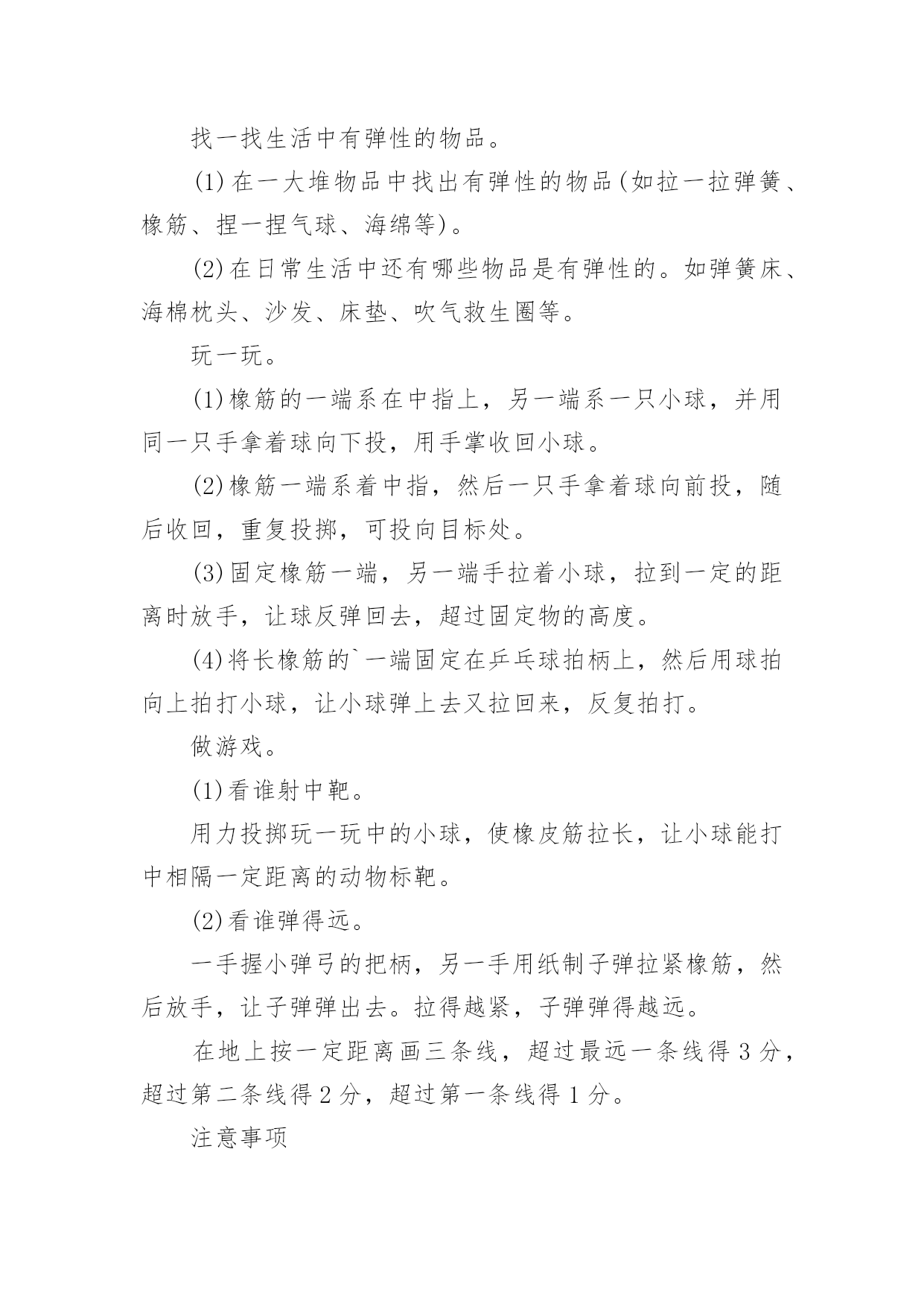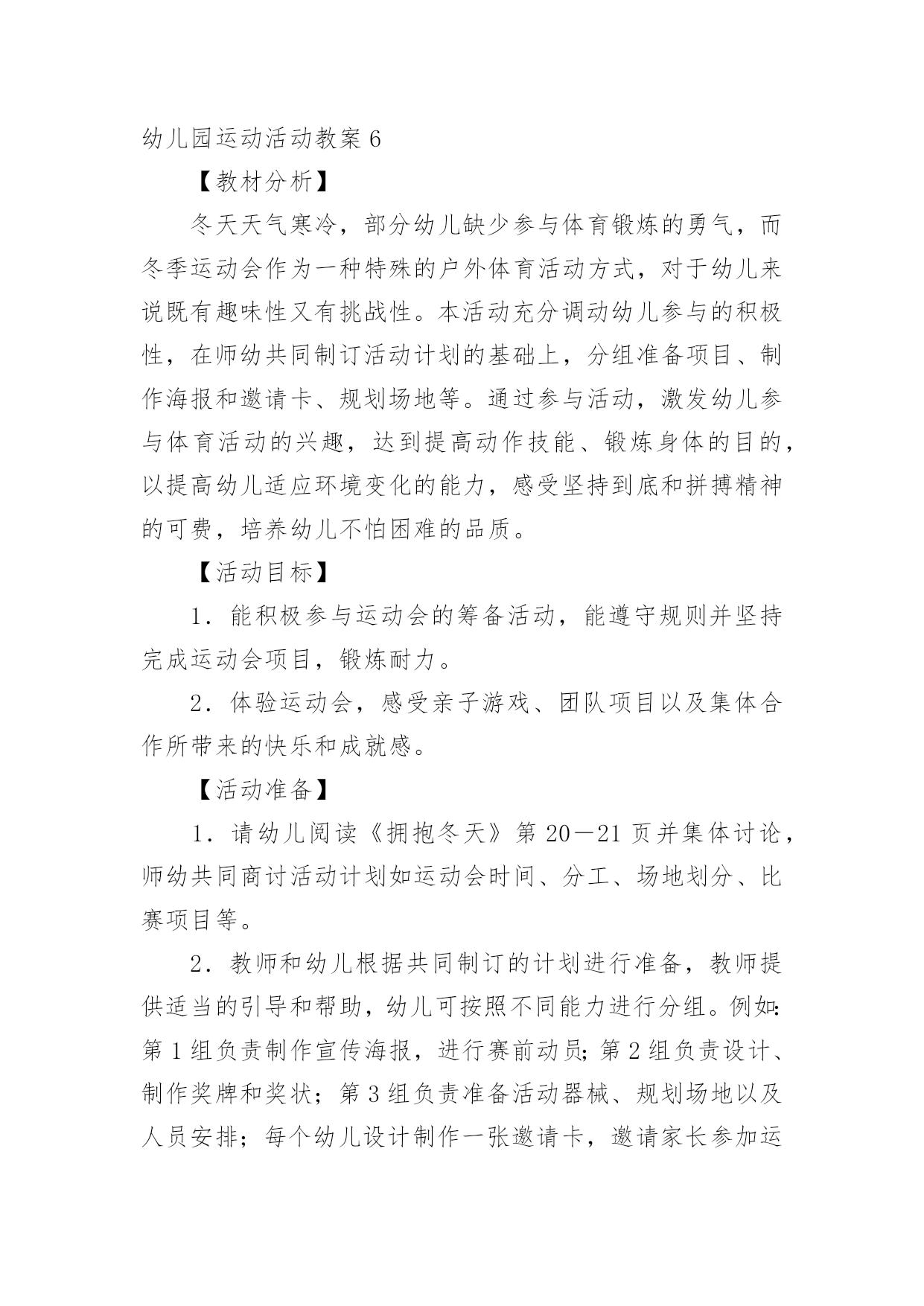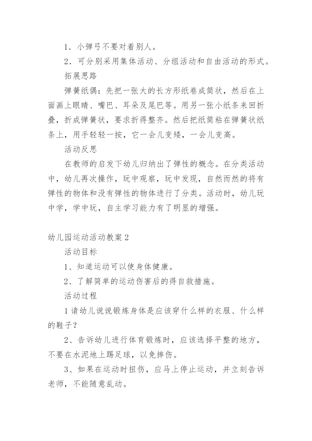 幼儿园运动活动教案作为一位优秀的人民教师,通常需要用到教案来辅助教学,教案有助于学生理解并掌握系统的知识。那么问题来了,教案应该怎么写?以下是小编帮大家整理的幼儿园运动活动教案,欢迎阅读,希望大家能够喜欢。幼儿园运动活动教案1活动目标1、通过观察与实验,使幼儿进一步感知不同物体的弹性现象,培养幼儿观察的敏锐性。2、培养幼儿对事物的好奇心,乐于大胆探究和实验。3、愿意大胆尝试,并与同伴分享自己的心得。4、学习用语言、符号等多种形式记录自己的发现。5、激发幼儿对科学活动的兴趣。活动准备皮球、橡筋、气球、弹簧、木块、铁片、弹性球、动物标靶、自制弹弓(每人一个)、纸制子弹等。活动过程拍一拍,捏一捏,感知不同物体的弹性。幼儿自主选择一个皮球跟着音乐拍球,其中有些皮球是没有气的。诱导幼儿按一按、捏一捏有气和没有气的皮球,共同找出原因,知道皮球打了气会弹得高,原来空气也有弹性。找一找生活中有弹性的物品。(1)在一大堆物品中找出有弹性的物品(如拉一拉弹簧、橡筋、捏一捏气球、海绵等)。(2)在日常生活中还有哪些物品是有弹性的。如弹簧床、海棉枕头、沙发、床垫、吹气救生圈等。玩一玩。(1)橡筋的一端系在中指上,另一端系一只小球,并用同一只手拿着球向下投,用手掌收回小球。(2)橡筋一端系着中指,然后一只手拿着球向前投,随后收回,重复投掷,可投向目标处。(3)固定橡筋一端,另一端手拉着小球,拉到一定的距离时放手,让球反弹回去,超过固定物的高度。(4)将长橡筋的`一端固定在乒乓球拍柄上,然后用球拍向上拍打小球,让小球弹上去又拉回来,反复拍打。做游戏。(1)看谁射中靶。用力投掷玩一玩中的小球,使橡皮筋拉长,让小球能打中相隔一定距离的动物标靶。(2)看谁弹得远。一手握小弹弓的把柄,另一手用纸制子弹拉紧橡筋,然后放手,让子弹弹出去。拉得越紧,子弹弹得越远。在地上按一定距离画三条线,超过最远一条线得3分,超过第二条线得2分,超过第一条线得1分。注意事项1.小弹弓不要对着别人。2.可分别采用集体活动、分组活动和自由活动的形式。拓展思路弹簧纸偶:先把一张大的长方形纸卷成筒状,然后在上面画上眼睛、嘴巴、耳朵及尾巴等。用另一张小纸条来回折叠,折成弹簧状,要求折得整齐。然后把纸筒粘在弹簧状纸条上,用手轻轻一按,它一会儿变矮,一会儿变高。活动反思在教师的启发下幼儿归纳出了弹性的概念。在分类活动中,幼儿再次操作,玩中观察,玩中发现,自然而然的将有弹性的物体和没有弹性的物体进行了分类。活动时,幼儿玩中学,学中玩,自主学习能力有了明显的增强。幼儿园运动活动教案2活动目标1、知道运动可以使身体健康。2、了解简单的运动伤害后的得自救措施。活动过程1请幼儿说说锻炼身体是应该穿什么样的衣服、什么样的鞋子?2、告诉幼儿进行体育锻炼时,应该选择平整的地方,不要在水泥地上踢足球,以免摔伤。3、如果在运动时扭伤,应马上停止运动,并立刻告诉老师,不能随意乱动。4、告诉幼儿剧烈运动后不应马上喝水,而是应该先把汗擦干,然后在喝水活动目标1、知道运动可以使身体健康。2、了解简单的'运动伤害后的得自救措施。活动过程1、请幼儿说说锻炼身体是应该穿什么样的衣服、什么样的鞋子?2、告诉幼儿进行体育锻炼时,应该选择平整的地方,不要在水泥地上踢足球,以免摔伤。3、如果在运动时扭伤,应马上停止运动,并立刻告诉老师,不能随意乱动。4、告诉幼儿剧烈运动后不应马上喝水,而是应该先把汗擦干,然后在喝水幼儿园运动活动教案3一、活动目标:1.能辨别乐曲的三段式结构,进一步感受乐曲雄壮有力的特点。2.能在音乐的伴奏下想像,并用动作表现熟悉的运动项目。3.让幼儿感受歌曲欢快的节奏。4.让幼儿知道歌曲的名称,熟悉歌曲的旋律及歌词内容。二、活动准备:录音机和磁带三、活动过程:1.在运动员进行曲的伴奏下,幼儿走进教室。2.回忆乐曲。提问:这首乐曲的名字叫什么?它是在什么时候使用的乐曲?它给人什么感觉?3.完整欣赏乐曲,引导幼儿辨别乐曲的`三段变化。4.分段欣赏听A段。引导幼儿想像这一段表现了什么,并启发鼓励幼儿根据自己的想像用动作表现。听B段能区分A、B、A的结构。5.听音乐表演。幼儿在音乐的伴奏下,扮演运动员,做出各种运动项目的模仿动作。四、活动建议:在表演区继续进行表演,并可以提供运动员进行各种运动项目的图片名称,丰富幼儿的动作。活动反思:音乐主要是感情艺术,音乐总是以它的立意美、情境美、音韵美、曲调美等来表达人们的心声:或者隐含着一个美好的寓意,或者师法一种温馨的心曲,或寄托一个美丽的梦幻,或展现一片炽热的情怀。进行曲是用行进步伐的节奏写成的乐曲,一种进行曲是供队伍行进时奏唱的,以统一的步伐、是鼓舞人心的。幼儿园运动活动教案4活动目标:1、和爸爸妈妈共同参与运动会,享受亲子活动的快乐。2、能控制自己的情绪,遵守运动规则。3、积极