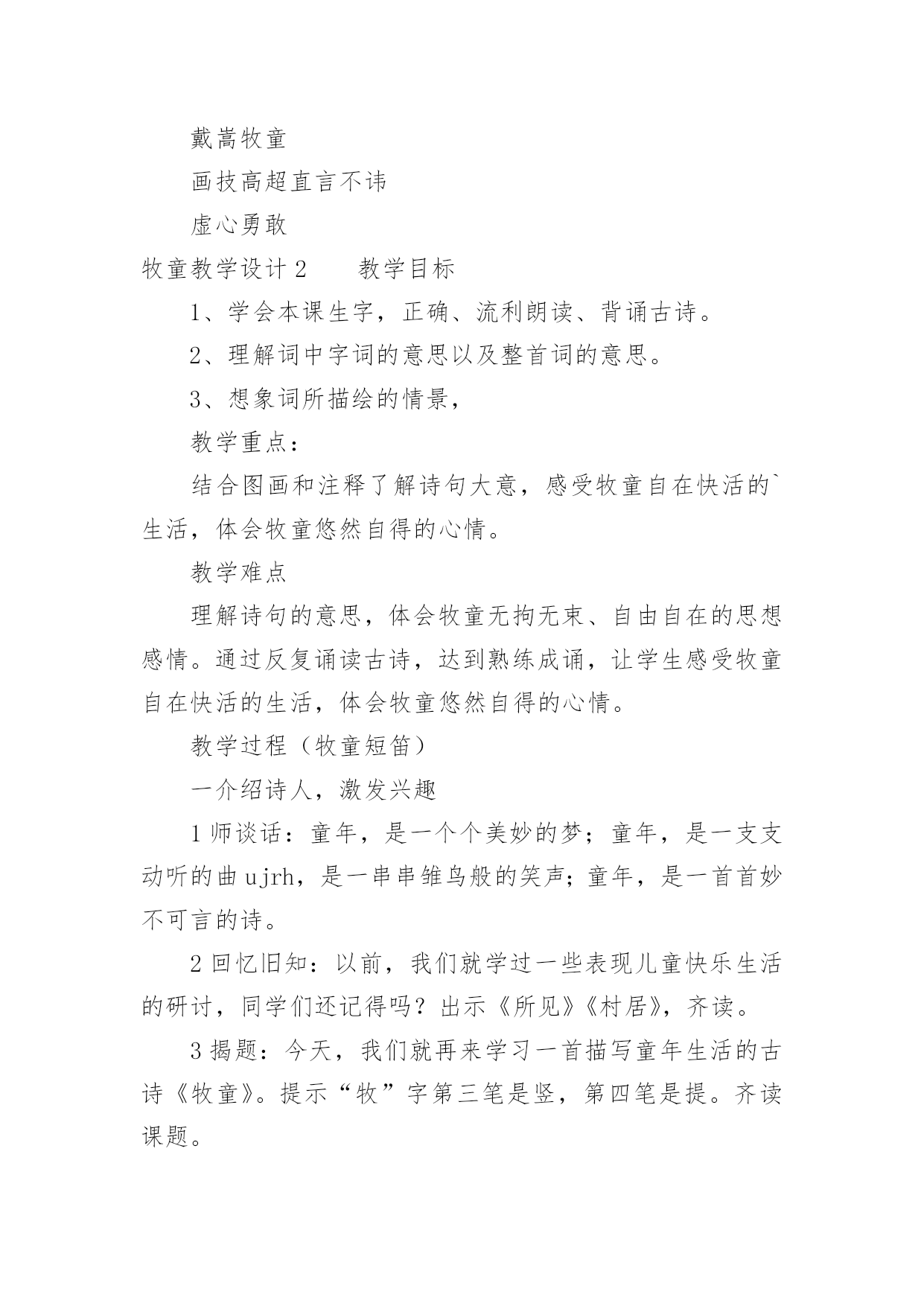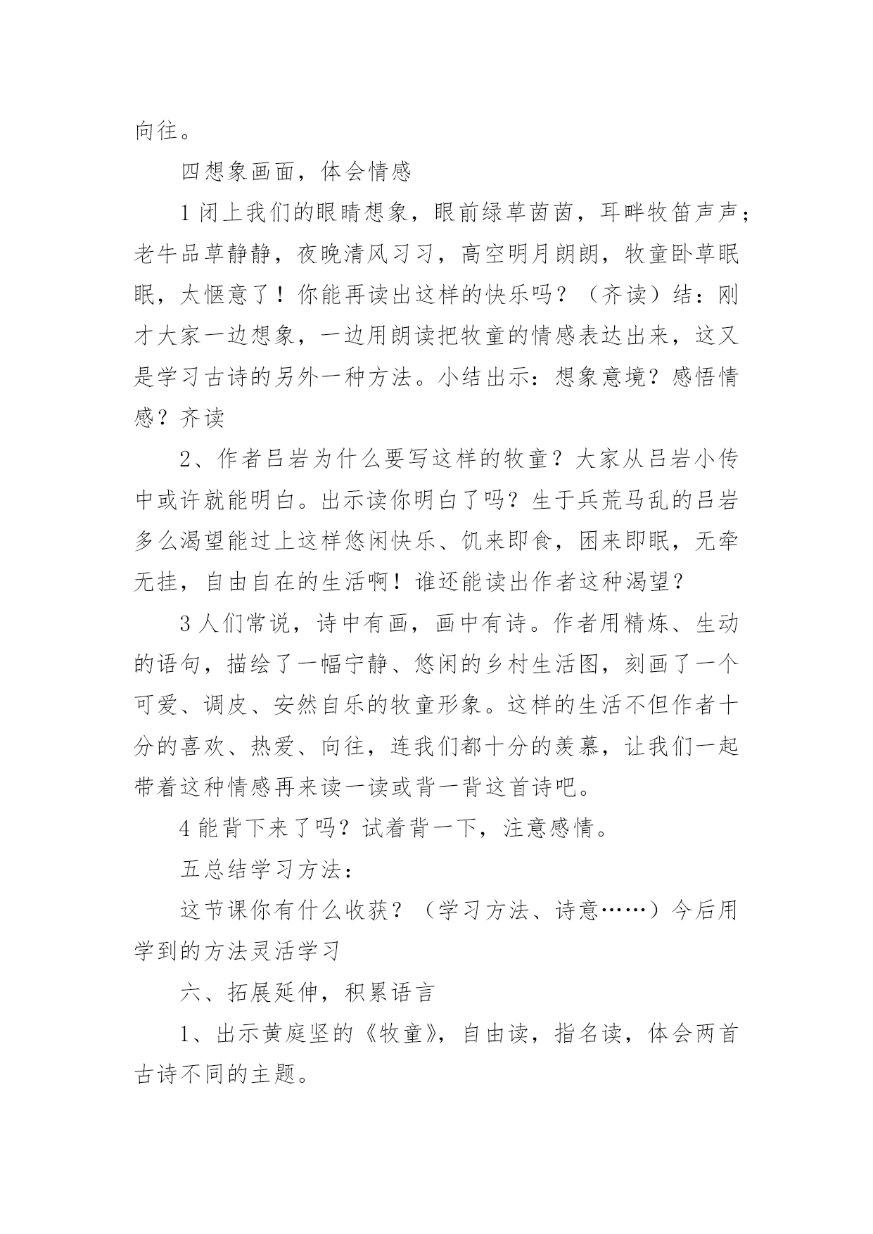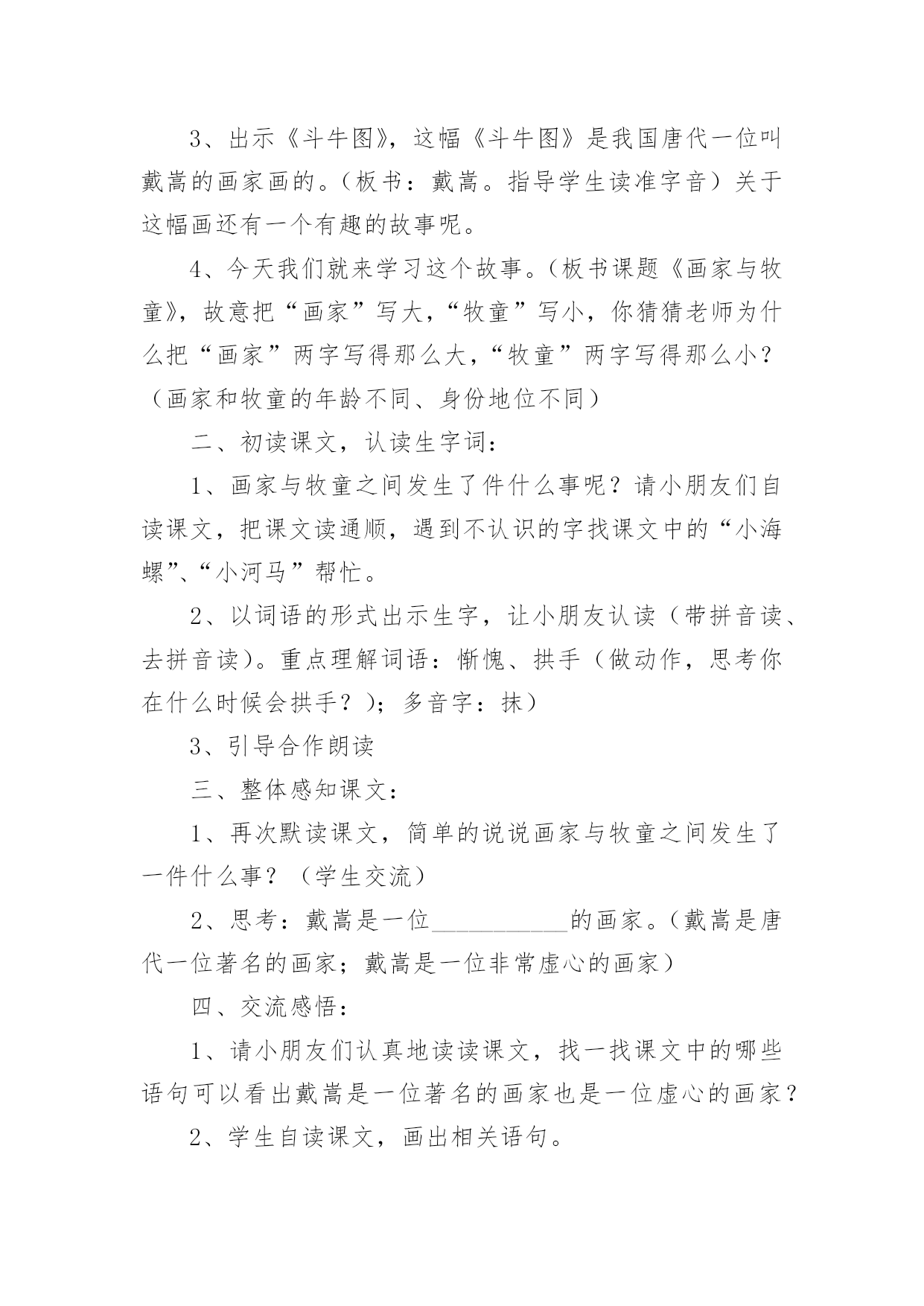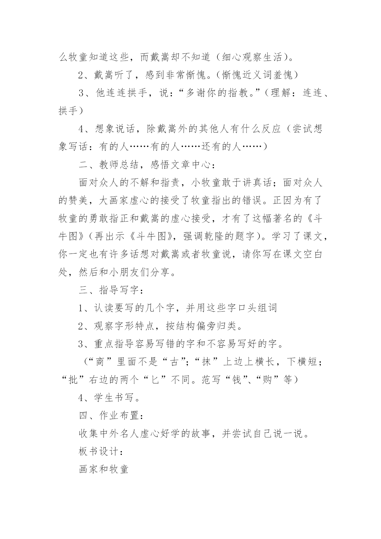 牧童教学设计牧童教学设计作为一位杰出的老师,编写教学设计是必不可少的,借助教学设计可以更好地组织教学活动。教学设计要怎么写呢?以下是小编整理的牧童教学设计,仅供参考,欢迎大家阅读。牧童教学设计1教学目标:1、会认13个生字,能读好带生字的词;会写12个生字。2、正确、流利、有感情地朗读课文,体会画家和牧童的优秀品质;3、结合插图展开想象,懂得要敢于挑战权威,也要谦虚谨慎。教学重、难点:识字写字,图文结合阅读理解体会人物的优秀品质。教具准备:PPT课件教学时间:2课时教学流程:第一课时一、欣赏作品,导入新课:1、(PPT出示齐白石、徐悲鸿、张大千等人的画作)小朋友,老师请大家欣赏几幅名画。2、看了这几幅画,你想说些什么呢?(学生交流)3、出示《斗牛图》,这幅《斗牛图》是我国唐代一位叫戴嵩的画家画的。(板书:戴嵩。指导学生读准字音)关于这幅画还有一个有趣的故事呢。4、今天我们就来学习这个故事。(板书课题《画家与牧童》,故意把“画家”写大,“牧童”写小,你猜猜老师为什么把“画家”两字写得那么大,“牧童”两字写得那么小?(画家和牧童的年龄不同、身份地位不同)二、初读课文,认读生字词:1、画家与牧童之间发生了件什么事呢?请小朋友们自读课文,把课文读通顺,遇到不认识的字找课文中的“小海螺”、“小河马”帮忙。2、以词语的形式出示生字,让小朋友认读(带拼音读、去拼音读)。重点理解词语:惭愧、拱手(做动作,思考你在什么时候会拱手?);多音字:抹)3、引导合作朗读三、整体感知课文:1、再次默读课文,简单的说说画家与牧童之间发生了一件什么事?(学生交流)2、思考:戴嵩是一位___________的画家。(戴嵩是唐代一位著名的画家;戴嵩是一位非常虚心的画家)四、交流感悟:1、请小朋友们认真地读读课文,找一找课文中的哪些语句可以看出戴嵩是一位著名的画家也是一位虚心的画家?2、学生自读课文,画出相关语句。3、交流讨论,将戴嵩的任务形象“大化”戴嵩是一位著名的画家:预设:1、他一会儿浓墨涂抹,一会儿轻笔细描,很快就画成了。(PPT演示什么是“浓墨涂抹”、“轻笔细描”;一会儿,一会儿仿句训练)2、他的话一挂出来,就有许多人观赏。(一……就仿句训练)3、看画的人没有不点头称赞的,有钱的人还争着花大价钱购买。(理解并尝试运用“没有不”)4、围观的人纷纷夸赞……………赞扬道。(1、朗读训练2、夸赞、称赞、赞美、赞许等近义词3、想象说话:也许还有哪些人夸赞戴嵩,他们可能怎样夸赞?)第二课时一、复习导入:上节课我们知道了戴嵩不仅是一位著名的画家,而且是一位虚心的画家。请小朋友们一起去课文中找找线索,看看哪些语句可以看出戴嵩的谦虚?戴嵩是一位谦虚的画家:预设:1、戴嵩把牧童叫到面前,和蔼地说:“小兄弟,我很愿意听到你的批评,请你说说什么地方画错了?”(指导读出戴嵩的语气)——————1、插入对牧童话的理解,体会牧童的勇敢指正。(牧童的话很长,谁能用自己的话简单的说一说:这张画错再____________,应该________________,因为_________________。)2、思考为什么牧童知道这些,而戴嵩却不知道(细心观察生活)。2、戴嵩听了,感到非常惭愧。(惭愧近义词羞愧)3、他连连拱手,说:“多谢你的指教。”(理解:连连、拱手)4、想象说话,除戴嵩外的其他人有什么反应(尝试想象写话:有的人……有的人……还有的人……)二、教师总结,感悟文章中心:面对众人的不解和指责,小牧童敢于讲真话;面对众人的赞美,大画家虚心的接受了牧童指出的错误。正因为有了牧童的勇敢指正和戴嵩的虚心接受,才有了这幅著名的《斗牛图》(再出示《斗牛图》,强调乾隆的题字)。学习了课文,你一定也有许多话想对戴嵩或者牧童说,请你写在课文空白处,然后和小朋友们分享。三、指导写字:1、认读要写的几个字,并用这些字口头组词2、观察字形特点,按结构偏旁归类。3、重点指导容易写错的字和不容易写好的字。(“商”里面不是“古”;“抹”上边上横长,下横短;“批”右边的两个“匕”不同。范写“钱”、“购”等)4、学生书写。四、作业布置:收集中外名人虚心好学的故事,并尝试自己说一说。板书设计:画家和牧童戴嵩牧童画技高超直言不讳虚心勇敢牧童教学设计2教学目标1、学会本课生字,正确、流利朗读、背诵古诗。2、理解词中字词的意思以及整首词的意思。3、想象词所描绘的情景,教学重点:结合图画和注释了解诗句大意,感受牧童自在快活的`生活,体会牧童悠然自得的心情。教学难点理解诗句的意思,体会牧童无拘无束、自由自在的思想感情。通过反复诵读古诗,达到熟练成诵,让学生感受牧童自在快活的生活,体会牧童悠然自得的心情。教学过程(牧童短笛)一介绍诗人,激发兴趣1师谈话:童年,是一个个美妙的梦;童年,是一支支动听的曲ujrh,是一串串雏鸟般的