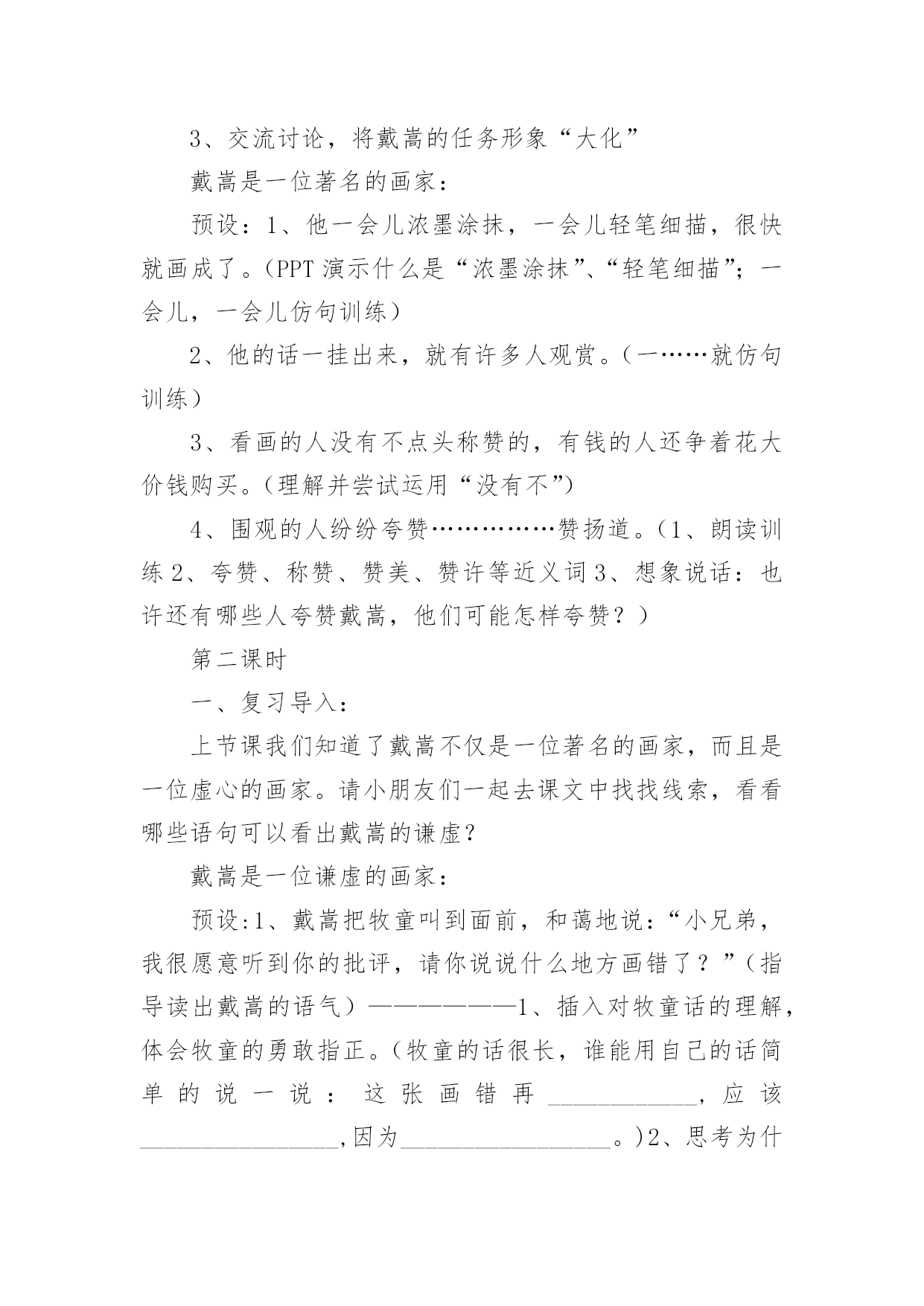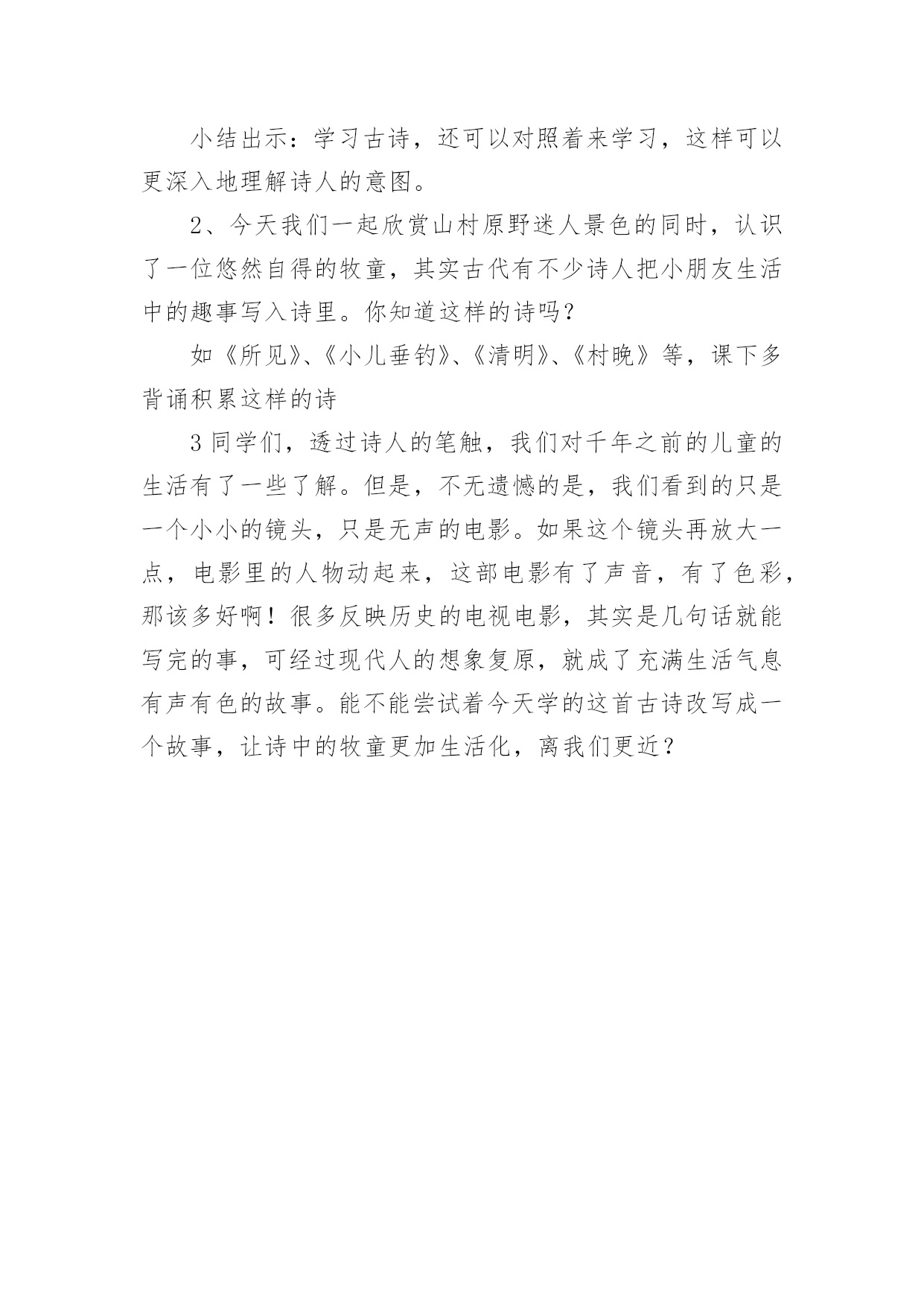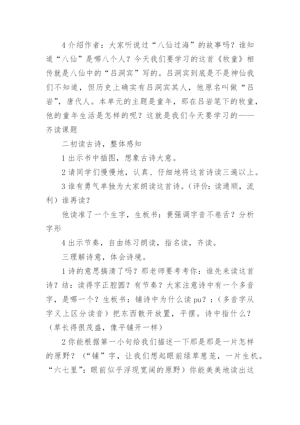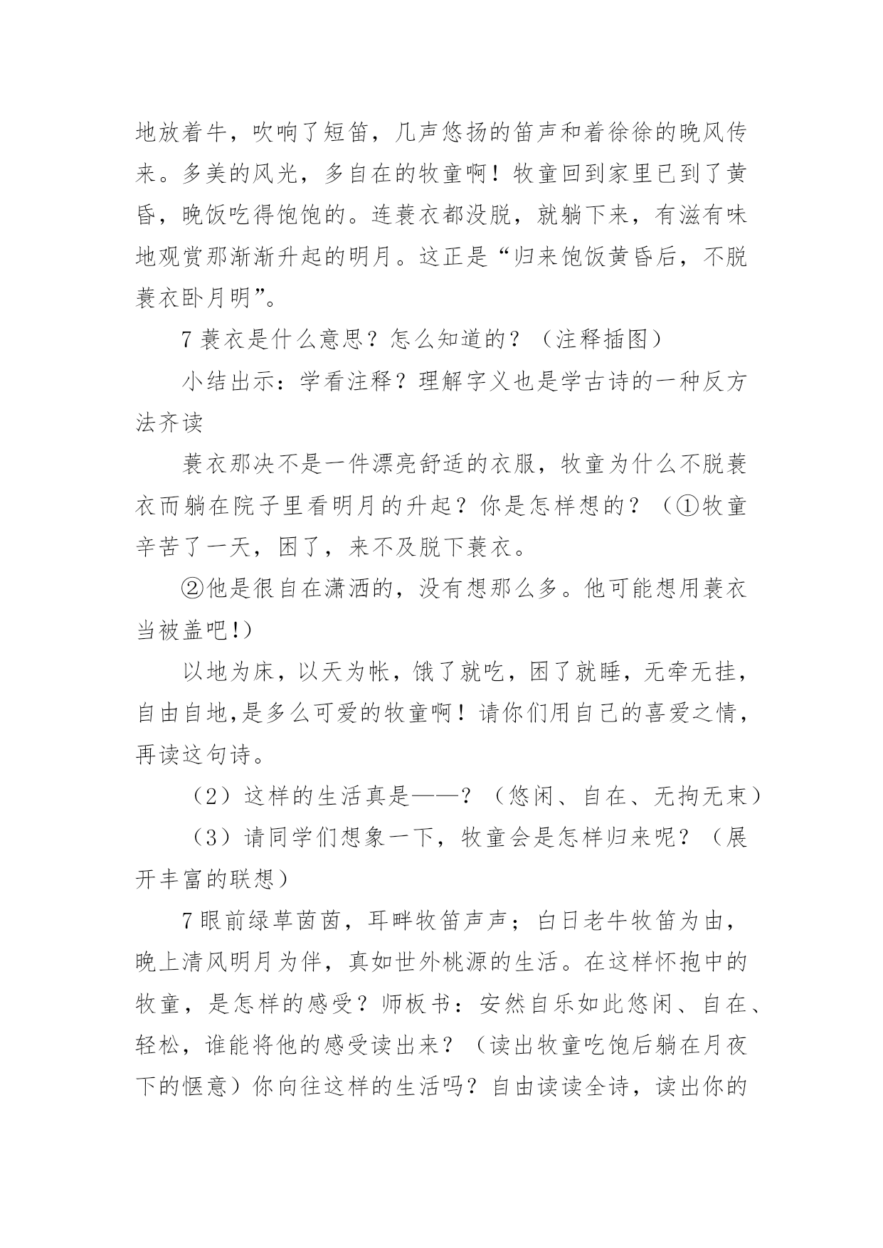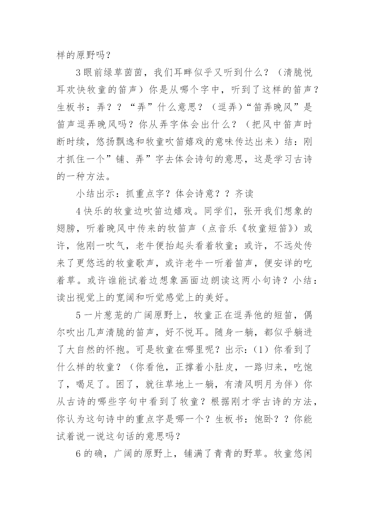 牧童教学设计牧童教学设计作为一位杰出的老师,编写教学设计是必不可少的,借助教学设计可以更好地组织教学活动。教学设计要怎么写呢?以下是小编整理的牧童教学设计,仅供参考,欢迎大家阅读。牧童教学设计1教学目标:1、会认13个生字,能读好带生字的词;会写12个生字。2、正确、流利、有感情地朗读课文,体会画家和牧童的优秀品质;3、结合插图展开想象,懂得要敢于挑战权威,也要谦虚谨慎。教学重、难点:识字写字,图文结合阅读理解体会人物的优秀品质。教具准备:PPT课件教学时间:2课时教学流程:第一课时一、欣赏作品,导入新课:1、(PPT出示齐白石、徐悲鸿、张大千等人的画作)小朋友,老师请大家欣赏几幅名画。2、看了这几幅画,你想说些什么呢?(学生交流)3、出示《斗牛图》,这幅《斗牛图》是我国唐代一位叫戴嵩的画家画的。(板书:戴嵩。指导学生读准字音)关于这幅画还有一个有趣的故事呢。4、今天我们就来学习这个故事。(板书课题《画家与牧童》,故意把“画家”写大,“牧童”写小,你猜猜老师为什么把“画家”两字写得那么大,“牧童”两字写得那么小?(画家和牧童的年龄不同、身份地位不同)二、初读课文,认读生字词:1、画家与牧童之间发生了件什么事呢?请小朋友们自读课文,把课文读通顺,遇到不认识的字找课文中的“小海螺”、“小河马”帮忙。2、以词语的形式出示生字,让小朋友认读(带拼音读、去拼音读)。重点理解词语:惭愧、拱手(做动作,思考你在什么时候会拱手?);多音字:抹)3、引导合作朗读三、整体感知课文:1、再次默读课文,简单的说说画家与牧童之间发生了一件什么事?(学生交流)2、思考:戴嵩是一位___________的画家。(戴嵩是唐代一位著名的画家;戴嵩是一位非常虚心的画家)四、交流感悟:1、请小朋友们认真地读读课文,找一找课文中的哪些语句可以看出戴嵩是一位著名的画家也是一位虚心的画家?2、学生自读课文,画出相关语句。3、交流讨论,将戴嵩的任务形象“大化”戴嵩是一位著名的画家:预设:1、他一会儿浓墨涂抹,一会儿轻笔细描,很快就画成了。(PPT演示什么是“浓墨涂抹”、“轻笔细描”;一会儿,一会儿仿句训练)2、他的话一挂出来,就有许多人观赏。(一……就仿句训练)3、看画的人没有不点头称赞的,有钱的人还争着花大价钱购买。(理解并尝试运用“没有不”)4、围观的人纷纷夸赞……………赞扬道。(1、朗读训练2、夸赞、称赞、赞美、赞许等近义词3、想象说话:也许还有哪些人夸赞戴嵩,他们可能怎样夸赞?)第二课时一、复习导入:上节课我们知道了戴嵩不仅是一位著名的画家,而且是一位虚心的画家。请小朋友们一起去课文中找找线索,看看哪些语句可以看出戴嵩的谦虚?戴嵩是一位谦虚的画家:预设:1、戴嵩把牧童叫到面前,和蔼地说:“小兄弟,我很愿意听到你的批评,请你说说什么地方画错了?”(指导读出戴嵩的语气)——————1、插入对牧童话的理解,体会牧童的勇敢指正。(牧童的话很长,谁能用自己的话简单的说一说:这张画错再____________,应该________________,因为_________________。)2、思考为什么牧童知道这些,而戴嵩却不知道(细心观察生活)。2、戴嵩听了,感到非常惭愧。(惭愧近义词羞愧)3、他连连拱手,说:“多谢你的指教。”(理解:连连、拱手)4、想象说话,除戴嵩外的其他人有什么反应(尝试想象写话:有的人……有的人……还有的人……)二、教师总结,感悟文章中心:面对众人的不解和指责,小牧童敢于讲真话;面对众人的赞美,大画家虚心的接受了牧童指出的错误。正因为有了牧童的勇敢指正和戴嵩的虚心接受,才有了这幅著名的《斗牛图》(再出示《斗牛图》,强调乾隆的题字)。学习了课文,你一定也有许多话想对戴嵩或者牧童说,请你写在课文空白处,然后和小朋友们分享。三、指导写字:1、认读要写的几个字,并用这些字口头组词2、观察字形特点,按结构偏旁归类。3、重点指导容易写错的字和不容易写好的字。(“商”里面不是“古”;“抹”上边上横长,下横短;“批”右边的两个“匕”不同。范写“钱”、“购”等)4、学生书写。四、作业布置:收集中外名人虚心好学的故事,并尝试自己说一说。板书设计:画家和牧童戴嵩牧童画技高超直言不讳虚心勇敢牧童教学设计2教学目标1、学会本课生字,正确、流利朗读、背诵古诗。2、理解词中字词的意思以及整首词的意思。3、想象词所描绘的情景,教学重点:结合图画和注释了解诗句大意,感受牧童自在快活的`生活,体会牧童悠然自得的心情。教学难点理解诗句的意思,体会牧童无拘无束、自由自在的思想感情。通过反复诵读古诗,达到熟练成诵,让学生感受牧童自在快活的生活,体会牧童悠然自得的心情。教学过程(牧童短笛)一介绍诗人,激发兴趣1师谈话:童年,是一个个美妙的梦;童年,是一支支动听的曲ujrh,是一串串雏鸟般的