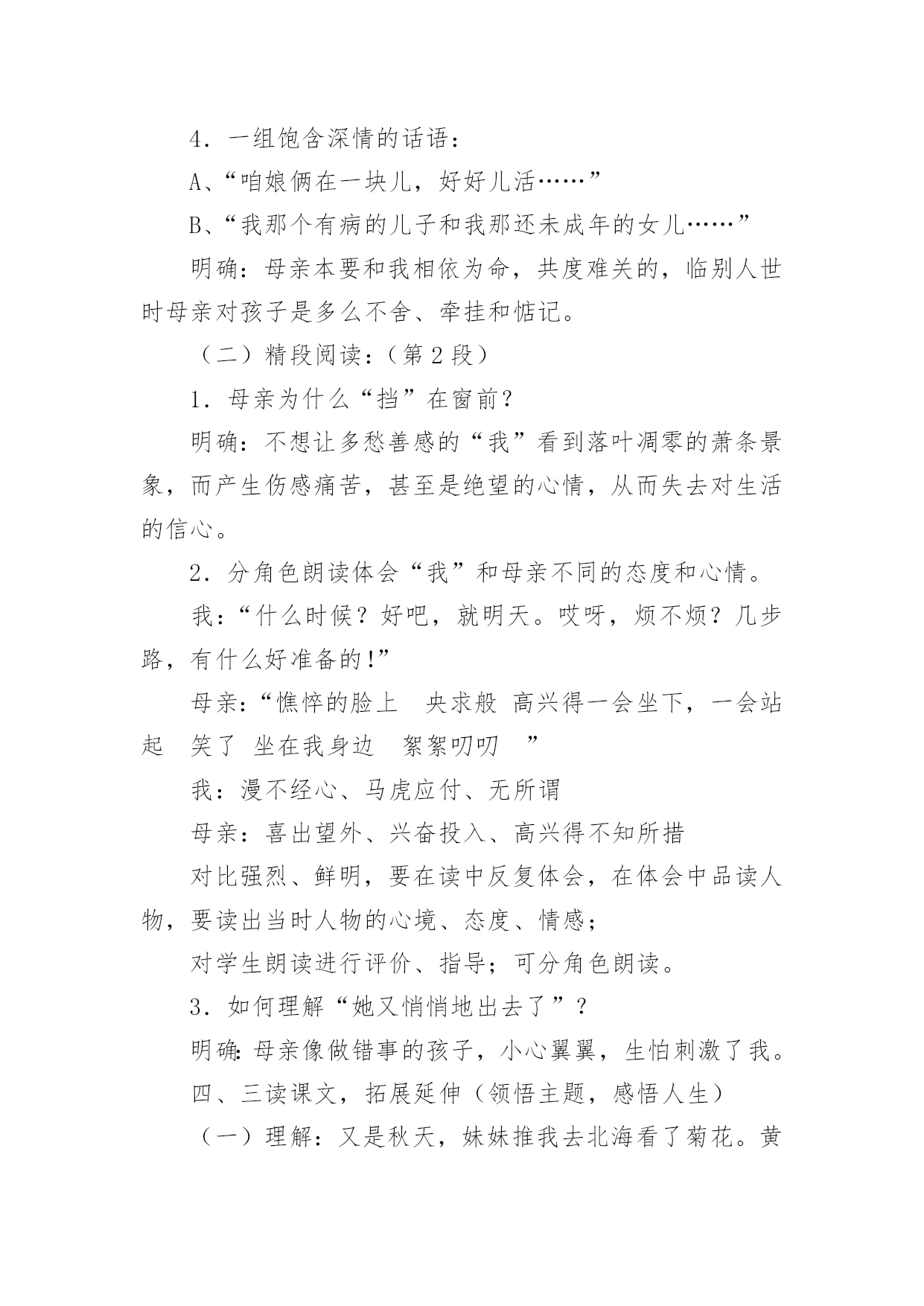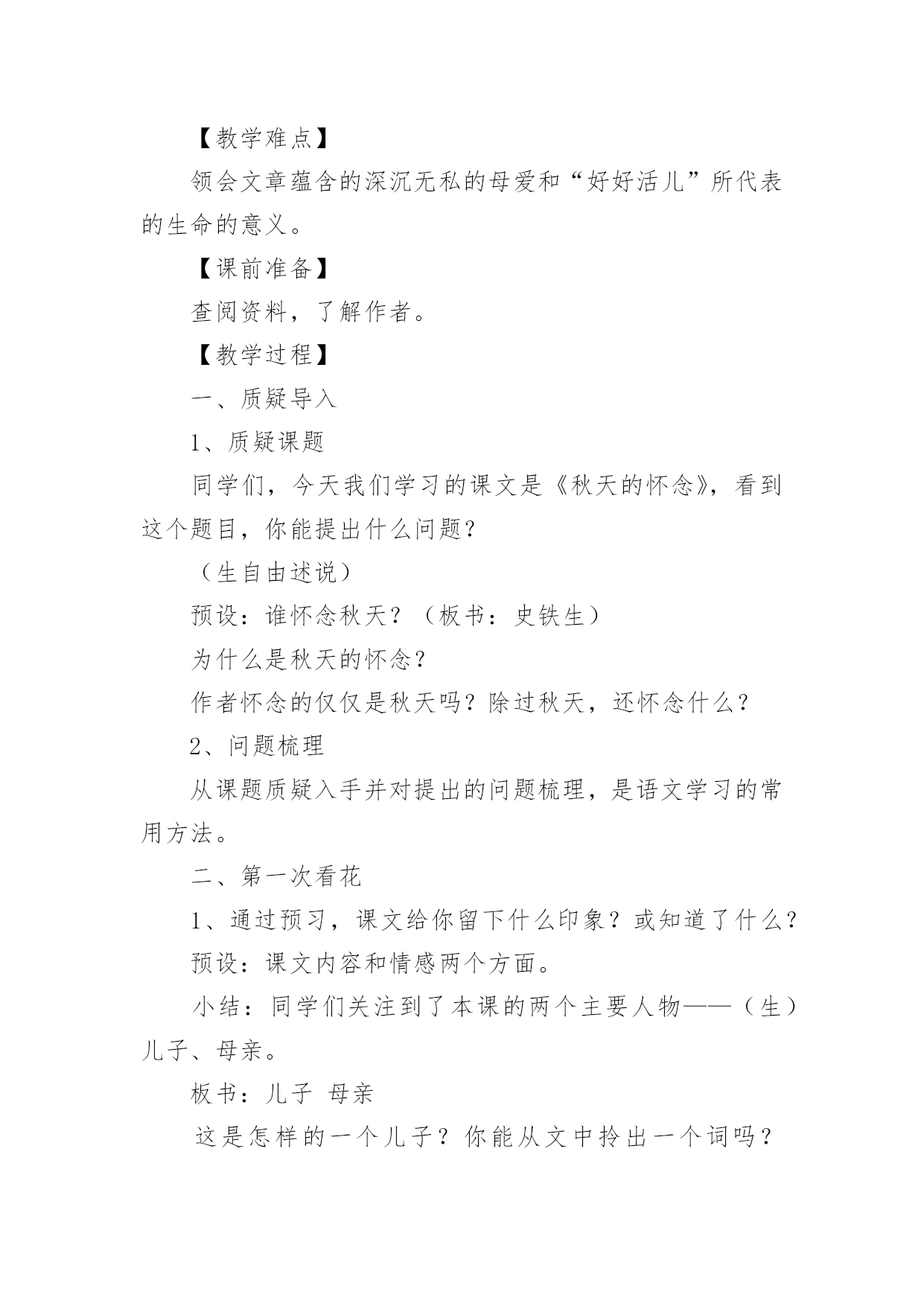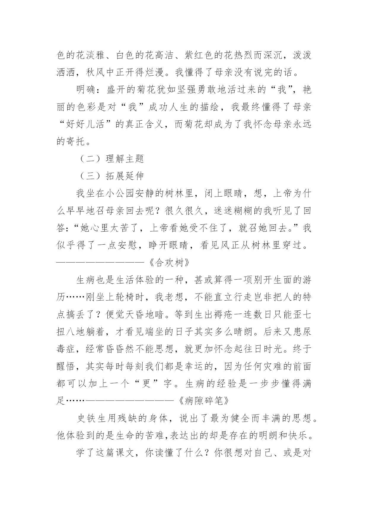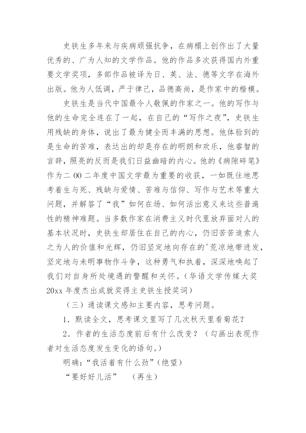 《秋天的怀念》教学设计《秋天的怀念》教学设计通用15篇作为一名为他人授业解惑的教育工作者,就难以避免地要准备教学设计,借助教学设计可以更大幅度地提高学生各方面的能力,从而使学生获得良好的发展。那么大家知道规范的教学设计是怎么写的吗?下面是小编为大家收集的《秋天的怀念》教学设计,仅供参考,大家一起来看看吧。《秋天的怀念》教学设计1教学目标知识与技能:理解课文内容,把握母亲艺术形象,感悟作者意图。训练学生概括课文主要内容的能力,培养学生有感情的读好课文的能力和深入理解课文内容的能力。过程与方法:1.指导学生通过自学讨论,自己读懂课文,培养学生自学能力。2.学习作者运用细节描写刻画人物和运用色彩烘托情感的写作手法。情感态度价值观:1.感受母博大、宽厚的母爱和儿子对于母亲的思念、忏悔、自责。2.体会磨难对于人生的意义,学习在磨难中成长坚强的品质。教学重难点品味赏析细节描写;朗读设计的评价和指导;探寻作者写作意旨教学工具多媒体设备教学过程一、导入在《背影》中我们体会了父爱的伟大和深沉。今天我们学习《秋天的怀念》,同学们自读课文,看一看,作者怀念的是什么?文章的主题是什么?二、初读课文,整体感知(一)根据课文内容,推断作者遭遇(二)作者简介史铁生(1951年1月4日—20xx年12月31日),原籍河北涿县,1951年出生于北京,1967年毕业于清华大学附属中学,1969年去延安一带插队。因双腿瘫痪于1972年回到北京。后来又患肾病并发展到尿毒症,需要靠透析维持生命。自称是“职业是生病,业余在写作”。史铁生创作的散文《我与地坛》鼓励了无数的人。20xx年获华语文学传媒大奖年度杰出成就奖。曾任中国作家协会全国委员会委员,北京作家协会副主席,中国残疾人协会评议委员会委员。20xx年12月31日凌晨3点46分因突发脑溢血逝世。根据其生前遗愿,他的脊椎、大脑将捐给医学研究;他的肝脏将捐给需要的患者。史铁生多年来与疾病顽强抗争,在病榻上创作出了大量优秀的、广为人知的文学作品。他的作品多次获得国内外重要文学奖项,多部作品被译为日、英、法、德等文字在海外出版。他为人低调,严于律己,品德高尚,是作家中的楷模。史铁生是当代中国最令人敬佩的作家之一。他的写作与他的生命完全连在了一起,在自己的“写作之夜”,史铁生用残缺的身体,说出了最为健全而丰满的思想。他体验到的是生命的苦难,表达出的却是存在的明朗和欢乐,他睿智的言辞,照亮的反而是我们日益幽暗的内心。他的《病隙碎笔》作为二OO二年度中国文学最为重要的收获,一如既往地思考着生与死、残缺与爱情、苦难与信仰、写作与艺术等重大问题,并解答了“我”如何在场、如何活出意义来这些普遍性的精神难题。当多数作家在消费主义时代里放弃面对人的基本状况时,史铁生却居住在自己的内心,仍旧苦苦追索人之为人的价值和光辉,仍旧坚定地向存在的'荒凉地带进发,坚定地与未明事物作斗争,这种勇气和执着,深深地唤起了我们对自身所处境遇的警醒和关怀。(华语文学传媒大奖20xx年度杰出成就奖得主史铁生授奖词)(三)通读课文感知主要内容,思考问题。1.默读全文,思考课文里写了几次秋天里看菊花?2.作者的生活态度前后有什么改变?(勾画出表现作者对生活态度发生变化的语句。)明确:“我活着有什么劲”(绝望)“要好好儿活”(再生)(师):是谁促使作者对生活的态度发生巨大的转变,并影响了作者的人生观?明确:母亲结尾句:我懂得母亲没有说完的话……要好好儿活。3.通过读课文,你能填写出:“母亲爱____花__________,更爱__双腿瘫痪的儿子__”吗?从文中哪些地方可以看出母亲爱花?她更爱儿子?“母亲喜欢花,可自从我的腿瘫痪后,她待弄的那些花都死了。”“母亲进来了,挡在窗前……央求般的神色。”“央求……喜出望外……高兴得一会儿坐下,一会儿站起”母亲就悄悄地躲出去……她又悄悄地进来,眼边红红的……她又悄悄地出去了。对于“跑”和“踩”一类的字眼儿,她比我还敏感。后来妹妹告诉我,她常常肝疼得整宿整宿翻来覆去地睡不着觉。她昏迷前的最后一句话是:“我那个有病的儿子和我那个还未成年的女儿……”三、再读课文,揣摩细节(理解人物,把握情感)(一)PPT呈现:建议你从这些角度品读课文:抓住一组对比性强烈的动词;一组重叠词;一组否定含义的词;一组饱含深情的话语;(对文本细节的剖析这一部分,要让学生读出其中的情味。这些细节应该是渗透着愧疚、追悔、怀念的。品析与朗读相结合。)1.一组对比性的动词:“我”:突然砸碎猛地摔向狠命捶打喊着母亲:躲出去听我的动静进来扑过来抓住忍住哭明确:母亲忍受着我暴躁的脾气,忍受着儿子瘫痪对自己的打击,把痛苦埋藏在心里,坚定的鼓励儿子。2.一组重叠词:悄悄地躲出去;偷偷地听我的动静;又悄悄地进来;眼圈红红的;明确:刻画了细腻深沉的母爱,她让“我”尽情地发泄心