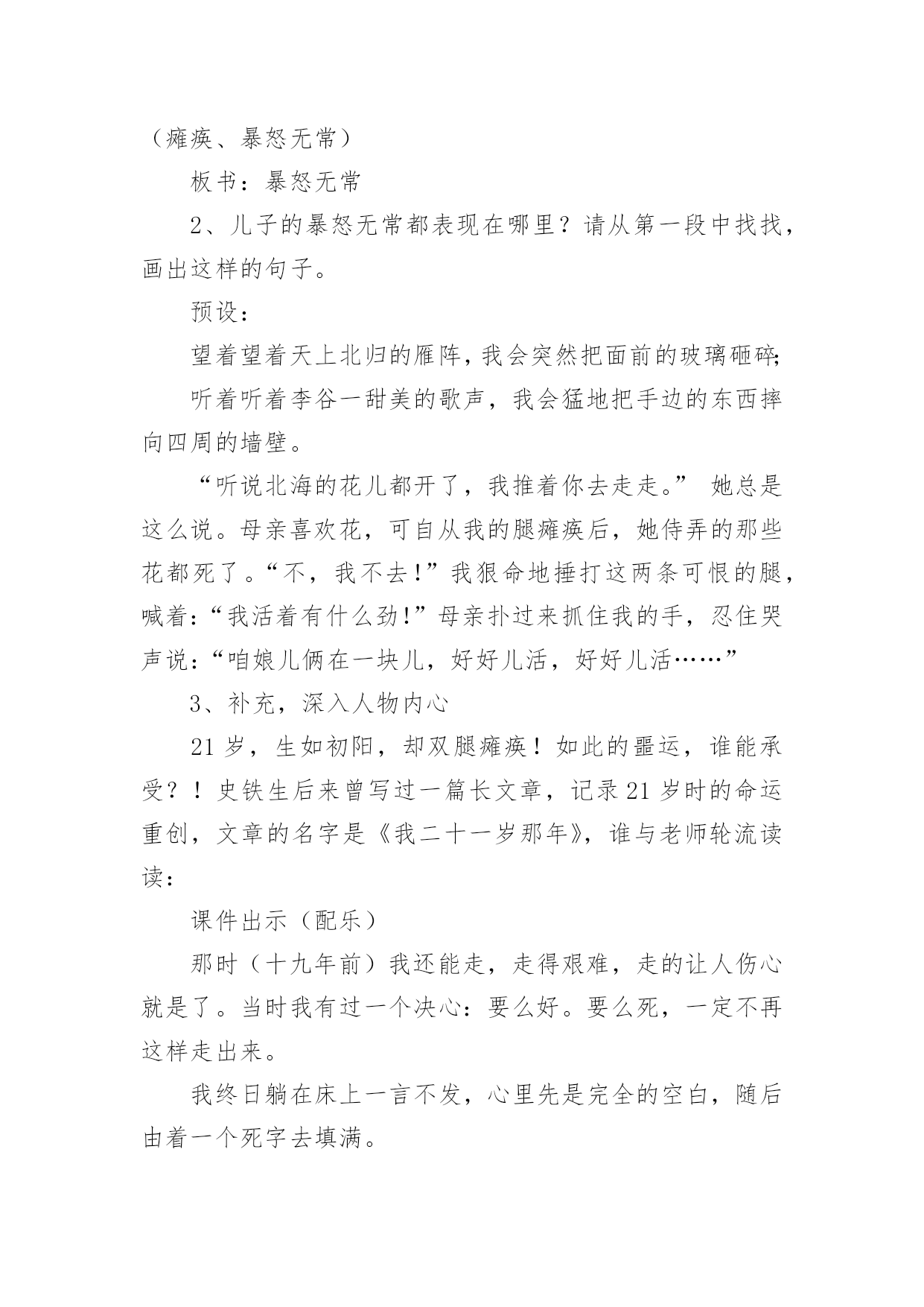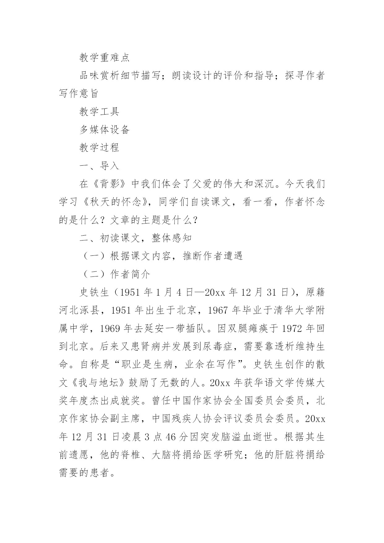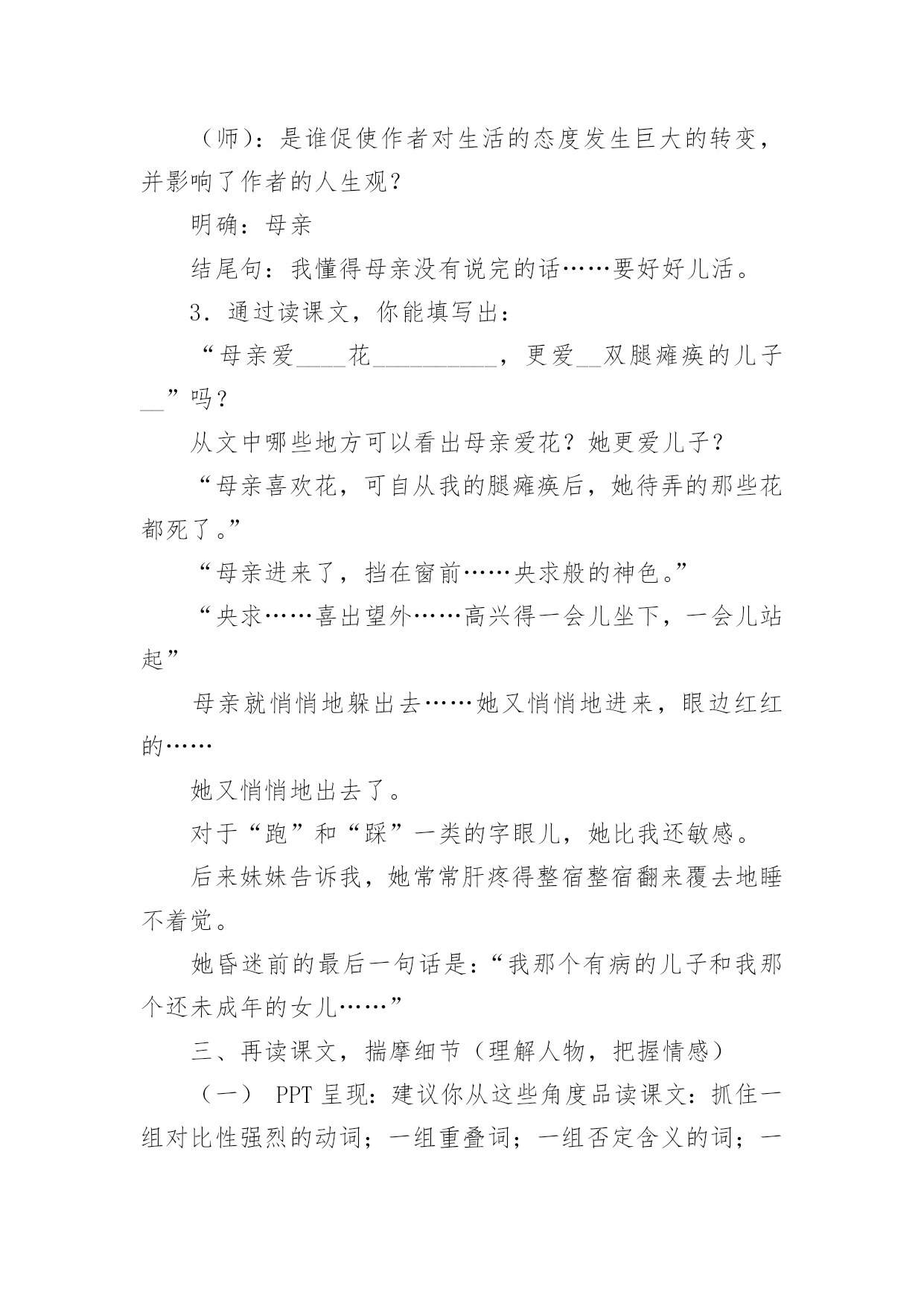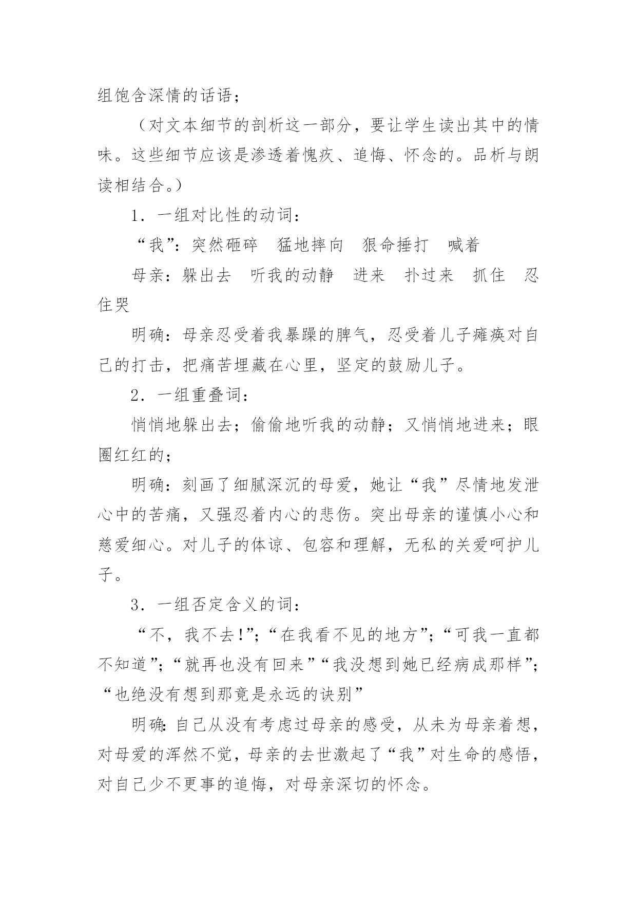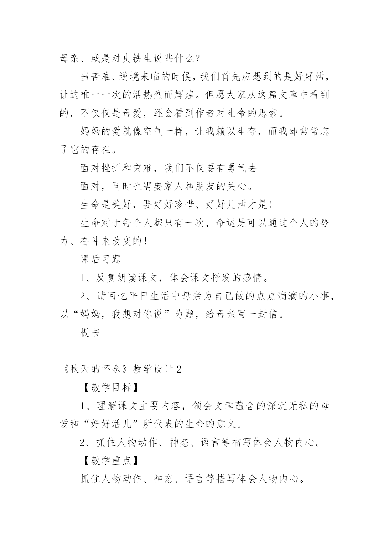 《秋天的怀念》教学设计《秋天的怀念》教学设计通用15篇作为一名为他人授业解惑的教育工作者,就难以避免地要准备教学设计,借助教学设计可以更大幅度地提高学生各方面的能力,从而使学生获得良好的发展。那么大家知道规范的教学设计是怎么写的吗?下面是小编为大家收集的《秋天的怀念》教学设计,仅供参考,大家一起来看看吧。《秋天的怀念》教学设计1教学目标知识与技能:理解课文内容,把握母亲艺术形象,感悟作者意图。训练学生概括课文主要内容的能力,培养学生有感情的读好课文的能力和深入理解课文内容的能力。过程与方法:1.指导学生通过自学讨论,自己读懂课文,培养学生自学能力。2.学习作者运用细节描写刻画人物和运用色彩烘托情感的写作手法。情感态度价值观:1.感受母博大、宽厚的母爱和儿子对于母亲的思念、忏悔、自责。2.体会磨难对于人生的意义,学习在磨难中成长坚强的品质。教学重难点品味赏析细节描写;朗读设计的评价和指导;探寻作者写作意旨教学工具多媒体设备教学过程一、导入在《背影》中我们体会了父爱的伟大和深沉。今天我们学习《秋天的怀念》,同学们自读课文,看一看,作者怀念的是什么?文章的主题是什么?二、初读课文,整体感知(一)根据课文内容,推断作者遭遇(二)作者简介史铁生(1951年1月4日—20xx年12月31日),原籍河北涿县,1951年出生于北京,1967年毕业于清华大学附属中学,1969年去延安一带插队。因双腿瘫痪于1972年回到北京。后来又患肾病并发展到尿毒症,需要靠透析维持生命。自称是“职业是生病,业余在写作”。史铁生创作的散文《我与地坛》鼓励了无数的人。20xx年获华语文学传媒大奖年度杰出成就奖。曾任中国作家协会全国委员会委员,北京作家协会副主席,中国残疾人协会评议委员会委员。20xx年12月31日凌晨3点46分因突发脑溢血逝世。根据其生前遗愿,他的脊椎、大脑将捐给医学研究;他的肝脏将捐给需要的患者。史铁生多年来与疾病顽强抗争,在病榻上创作出了大量优秀的、广为人知的文学作品。他的作品多次获得国内外重要文学奖项,多部作品被译为日、英、法、德等文字在海外出版。他为人低调,严于律己,品德高尚,是作家中的楷模。史铁生是当代中国最令人敬佩的作家之一。他的写作与他的生命完全连在了一起,在自己的“写作之夜”,史铁生用残缺的身体,说出了最为健全而丰满的思想。他体验到的是生命的苦难,表达出的却是存在的明朗和欢乐,他睿智的言辞,照亮的反而是我们日益幽暗的内心。他的《病隙碎笔》作为二OO二年度中国文学最为重要的收获,一如既往地思考着生与死、残缺与爱情、苦难与信仰、写作与艺术等重大问题,并解答了“我”如何在场、如何活出意义来这些普遍性的精神难题。当多数作家在消费主义时代里放弃面对人的基本状况时,史铁生却居住在自己的内心,仍旧苦苦追索人之为人的价值和光辉,仍旧坚定地向存在的'荒凉地带进发,坚定地与未明事物作斗争,这种勇气和执着,深深地唤起了我们对自身所处境遇的警醒和关怀。(华语文学传媒大奖20xx年度杰出成就奖得主史铁生授奖词)(三)通读课文感知主要内容,思考问题。1.默读全文,思考课文里写了几次秋天里看菊花?2.作者的生活态度前后有什么改变?(勾画出表现作者对生活态度发生变化的语句。)明确:“我活着有什么劲”(绝望)“要好好儿活”(再生)(师):是谁促使作者对生活的态度发生巨大的转变,并影响了作者的人生观?明确:母亲结尾句:我懂得母亲没有说完的话……要好好儿活。3.通过读课文,你能填写出:“母亲爱____花__________,更爱__双腿瘫痪的儿子__”吗?从文中哪些地方可以看出母亲爱花?她更爱儿子?“母亲喜欢花,可自从我的腿瘫痪后,她待弄的那些花都死了。”“母亲进来了,挡在窗前……央求般的神色。”“央求……喜出望外……高兴得一会儿坐下,一会儿站起”母亲就悄悄地躲出去……她又悄悄地进来,眼边红红的……她又悄悄地出去了。对于“跑”和“踩”一类的字眼儿,她比我还敏感。后来妹妹告诉我,她常常肝疼得整宿整宿翻来覆去地睡不着觉。她昏迷前的最后一句话是:“我那个有病的儿子和我那个还未成年的女儿……”三、再读课文,揣摩细节(理解人物,把握情感)(一)PPT呈现:建议你从这些角度品读课文:抓住一组对比性强烈的动词;一组重叠词;一组否定含义的词;一组饱含深情的话语;(对文本细节的剖析这一部分,要让学生读出其中的情味。这些细节应该是渗透着愧疚、追悔、怀念的。品析与朗读相结合。)1.一组对比性的动词:“我”:突然砸碎猛地摔向狠命捶打喊着母亲:躲出去听我的动静进来扑过来抓住忍住哭明确:母亲忍受着我暴躁的脾气,忍受着儿子瘫痪对自己的打击,把痛苦埋藏在心里,坚定的鼓励儿子。2.一组重叠词:悄悄地躲出去;偷偷地听我的动静;又悄悄地进来;眼圈红红的;明确:刻画了细腻深沉的母爱,她让“我”尽情地发泄心