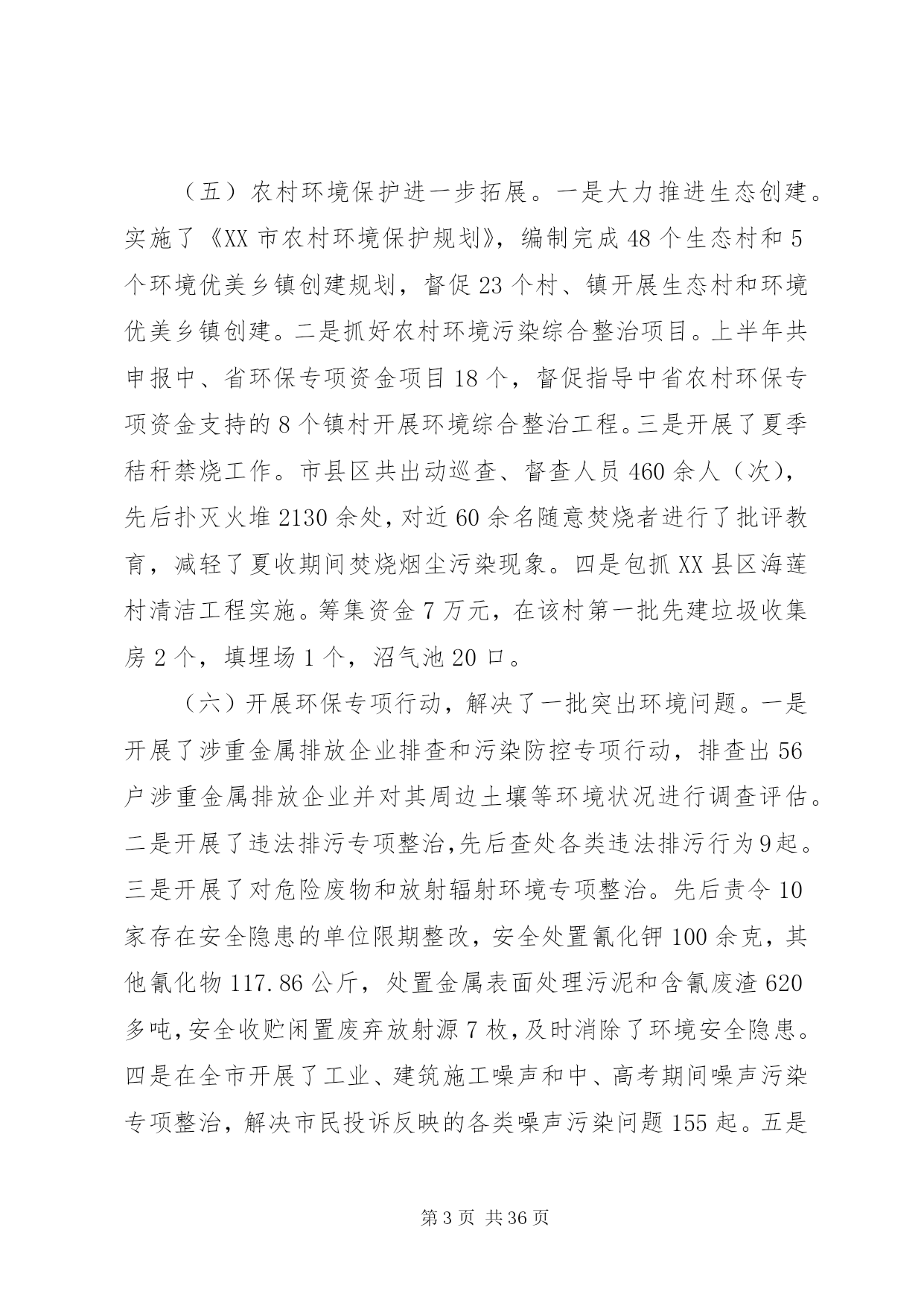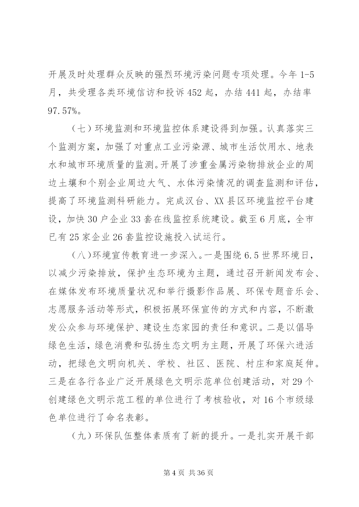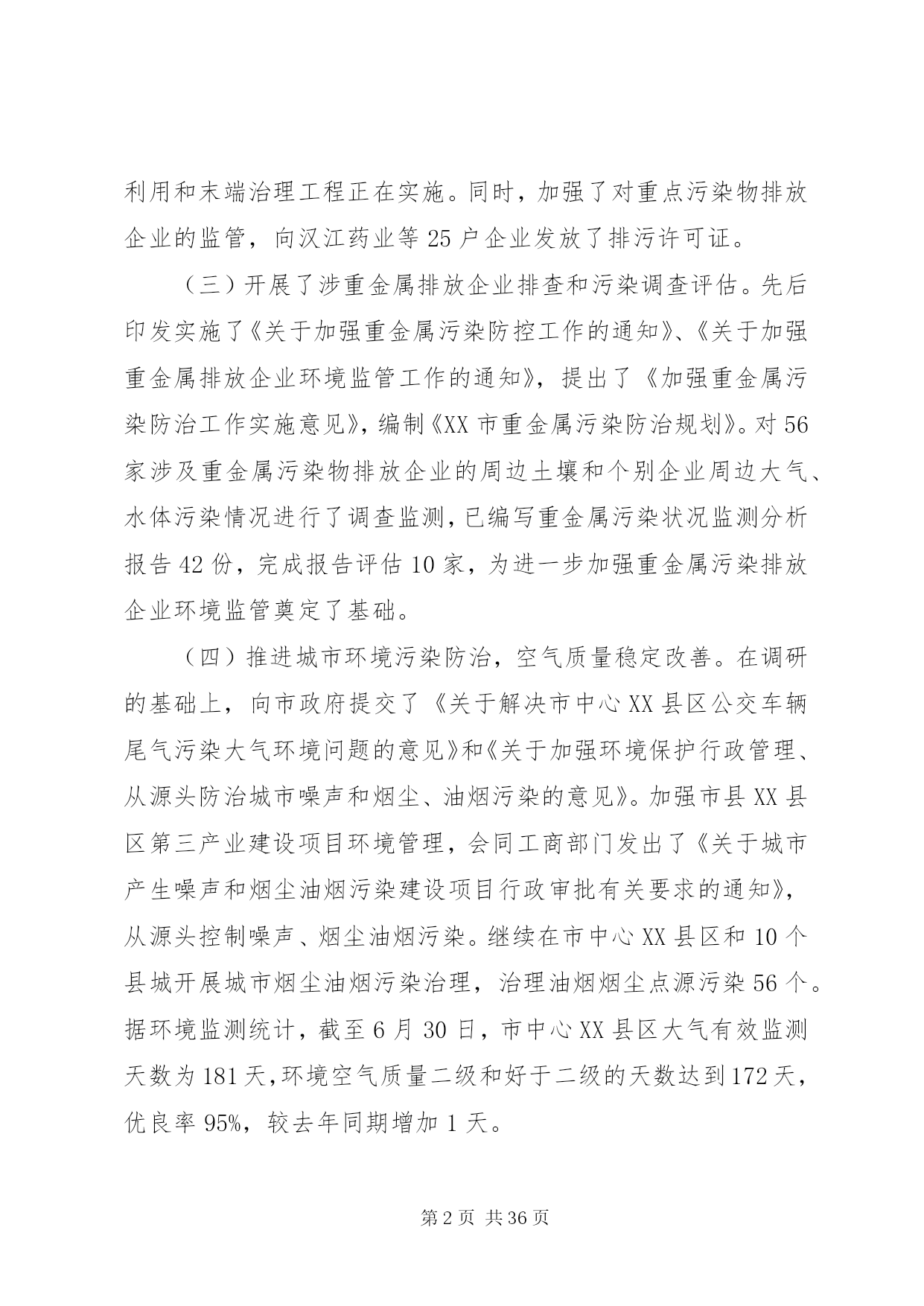 第PAGE\*Arabic\*MERGEFORMAT36页共NUMPAGES\*MERGEFORMAT36页环保局长座谈会上的讲话环保局长座谈会上的讲话篇1同志们:今天的会议的主要任务是,汇报交流各县区、各单位上半年重点工作任务进展情况,安排部署下半年各项工作。刚才,听了大家的汇报,总的感觉是都能抓住工作重点,采取措施推进,也取得了一定成效。但有些工作任务推进的速度还比较慢,措施还不够有力。下面,我就全市上半年环保重点工作任务进展情况做一通报,对如何做好下半年各项工作讲一些具体意见。一、主要工作任务不断推进,目标任务完成良好(一)狠抓减排措施的落实,两项污染物削减任务过半。制定并实施了《XX市20xx年主要污染物总量减排实施方案》,将省政府下达的年度减排任务分解到各县区和重点减排单位。认真落实污染减排三项措施,狠抓27个重点减排项目的实施。根据国家减排核查组核查,上半年全市完成二氧化硫削减量4580吨,化学需氧量削减1620吨,分别占年削减量的80.35%和73.64%。(二)加强了工业重点污染源治理和监管。以金属冶炼、化工、建材、酿造等行业为重点,全市今年下达33家企业的污染源治理任务,其中市级下达重点工业污染源限期治理项目15个。城固酒业、汉江药业、精诚化工等14家企业废水废气治理已基本完成,3户氮肥、2户医药、3户食品酿造企业生产废水循环利用和末端治理工程正在实施。同时,加强了对重点污染物排放企业的监管,向汉江药业等25户企业发放了排污许可证。(三)开展了涉重金属排放企业排查和污染调查评估。先后印发实施了《关于加强重金属污染防控工作的通知》、《关于加强重金属排放企业环境监管工作的通知》,提出了《加强重金属污染防治工作实施意见》,编制《XX市重金属污染防治规划》。对56家涉及重金属污染物排放企业的周边土壤和个别企业周边大气、水体污染情况进行了调查监测,已编写重金属污染状况监测分析报告42份,完成报告评估10家,为进一步加强重金属污染排放企业环境监管奠定了基础。(四)推进城市环境污染防治,空气质量稳定改善。在调研的基础上,向市政府提交了《关于解决市中心XX县区公交车辆尾气污染大气环境问题的意见》和《关于加强环境保护行政管理、从源头防治城市噪声和烟尘、油烟污染的意见》。加强市县XX县区第三产业建设项目环境管理,会同工商部门发出了《关于城市产生噪声和烟尘油烟污染建设项目行政审批有关要求的通知》,从源头控制噪声、烟尘油烟污染。继续在市中心XX县区和10个县城开展城市烟尘油烟污染治理,治理油烟烟尘点源污染56个。据环境监测统计,截至6月30日,市中心XX县区大气有效监测天数为181天,环境空气质量二级和好于二级的天数达到172天,优良率95%,较去年同期增加1天。(五)农村环境保护进一步拓展。一是大力推进生态创建。实施了《XX市农村环境保护规划》,编制完成48个生态村和5个环境优美乡镇创建规划,督促23个村、镇开展生态村和环境优美乡镇创建。二是抓好农村环境污染综合整治项目。上半年共申报中、省环保专项资金项目18个,督促指导中省农村环保专项资金支持的8个镇村开展环境综合整治工程。三是开展了夏季秸秆禁烧工作。市县区共出动巡查、督查人员460余人(次),先后扑灭火堆2130余处,对近60余名随意焚烧者进行了批评教育,减轻了夏收期间焚烧烟尘污染现象。四是包抓XX县区海莲村清洁工程实施。筹集资金7万元,在该村第一批先建垃圾收集房2个,填埋场1个,沼气池20口。(六)开展环保专项行动,解决了一批突出环境问题。一是开展了涉重金属排放企业排查和污染防控专项行动,排查出56户涉重金属排放企业并对其周边土壤等环境状况进行调查评估。二是开展了违法排污专项整治,先后查处各类违法排污行为9起。三是开展了对危险废物和放射辐射环境专项整治。先后责令10家存在安全隐患的单位限期整改,安全处置氰化钾100余克,其他氰化物117.86公斤,处置金属表面处理污泥和含氰废渣620多吨,安全收贮闲置废弃放射源7枚,及时消除了环境安全隐患。四是在全市开展了工业、建筑施工噪声和中、高考期间噪声污染专项整治,解决市民投诉反映的各类噪声污染问题155起。五是开展及时处理群众反映的强烈环境污染问题专项处理。今年1-5月,共受理各类环境信访和投诉452起,办结441起,办结率97.57%。(七)环境监测和环境监控体系建设得到加强。认真落实三个监测方案,加强了对重点工业污染源、城市生活饮用水、地表水和城市环境质量的监测。开展了涉重金属污染物排放企业的周边土壤和个别企业周边大气、水体污染情况的调查监测和评估,提高了环境监测科研能力。完成汉台、XX县区环境监控平台建设,加快30户企业33套在线监控系统建设。截至6月底,全市已有25家企业26套监控设施投入试运行。(八