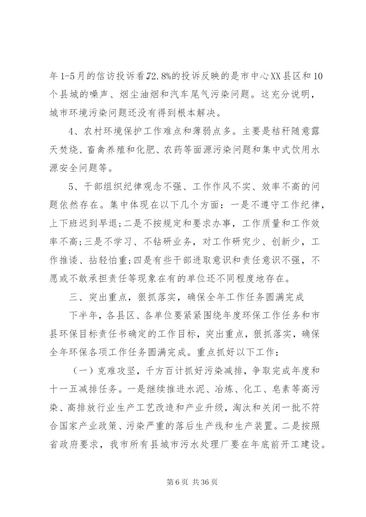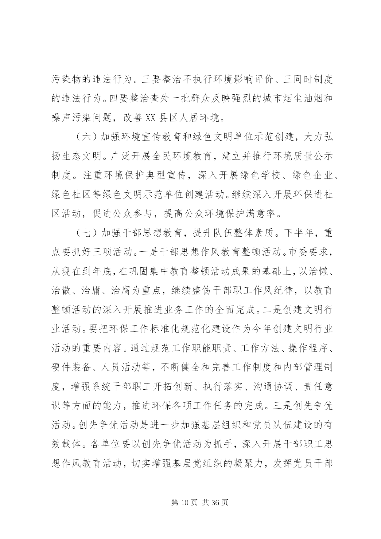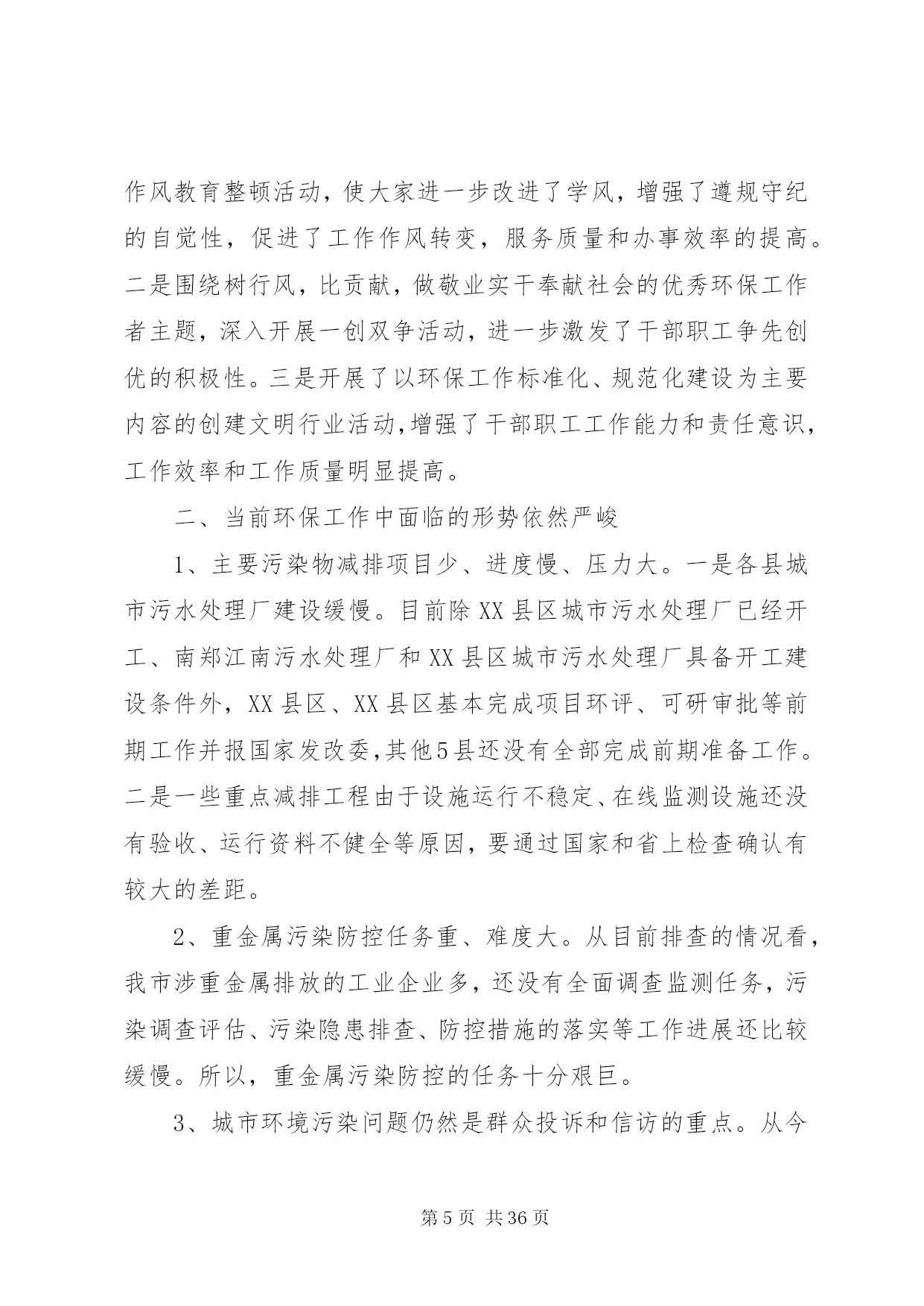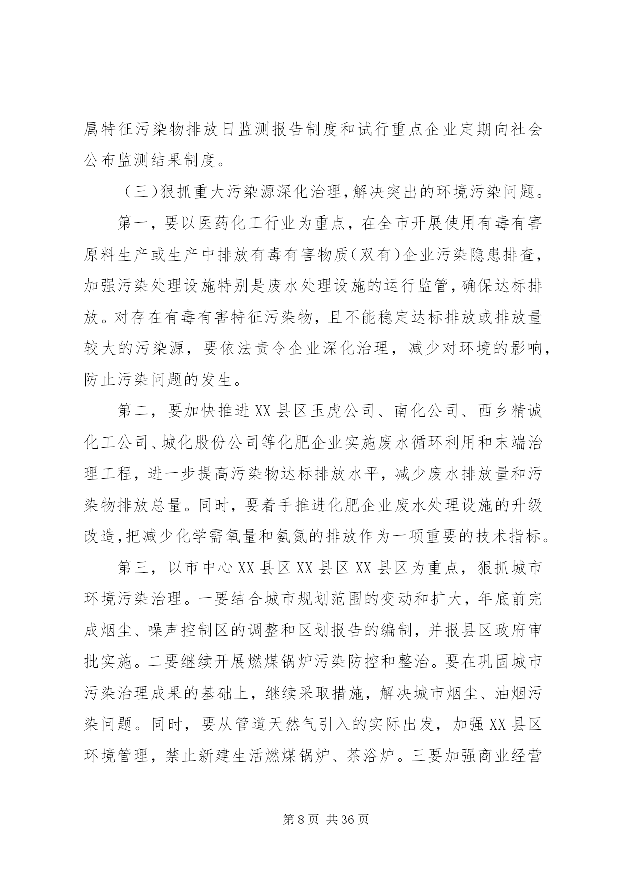 第PAGE\*Arabic\*MERGEFORMAT36页共NUMPAGES\*MERGEFORMAT36页环保局长座谈会上的讲话环保局长座谈会上的讲话篇1同志们:今天的会议的主要任务是,汇报交流各县区、各单位上半年重点工作任务进展情况,安排部署下半年各项工作。刚才,听了大家的汇报,总的感觉是都能抓住工作重点,采取措施推进,也取得了一定成效。但有些工作任务推进的速度还比较慢,措施还不够有力。下面,我就全市上半年环保重点工作任务进展情况做一通报,对如何做好下半年各项工作讲一些具体意见。一、主要工作任务不断推进,目标任务完成良好(一)狠抓减排措施的落实,两项污染物削减任务过半。制定并实施了《XX市20xx年主要污染物总量减排实施方案》,将省政府下达的年度减排任务分解到各县区和重点减排单位。认真落实污染减排三项措施,狠抓27个重点减排项目的实施。根据国家减排核查组核查,上半年全市完成二氧化硫削减量4580吨,化学需氧量削减1620吨,分别占年削减量的80.35%和73.64%。(二)加强了工业重点污染源治理和监管。以金属冶炼、化工、建材、酿造等行业为重点,全市今年下达33家企业的污染源治理任务,其中市级下达重点工业污染源限期治理项目15个。城固酒业、汉江药业、精诚化工等14家企业废水废气治理已基本完成,3户氮肥、2户医药、3户食品酿造企业生产废水循环利用和末端治理工程正在实施。同时,加强了对重点污染物排放企业的监管,向汉江药业等25户企业发放了排污许可证。(三)开展了涉重金属排放企业排查和污染调查评估。先后印发实施了《关于加强重金属污染防控工作的通知》、《关于加强重金属排放企业环境监管工作的通知》,提出了《加强重金属污染防治工作实施意见》,编制《XX市重金属污染防治规划》。对56家涉及重金属污染物排放企业的周边土壤和个别企业周边大气、水体污染情况进行了调查监测,已编写重金属污染状况监测分析报告42份,完成报告评估10家,为进一步加强重金属污染排放企业环境监管奠定了基础。(四)推进城市环境污染防治,空气质量稳定改善。在调研的基础上,向市政府提交了《关于解决市中心XX县区公交车辆尾气污染大气环境问题的意见》和《关于加强环境保护行政管理、从源头防治城市噪声和烟尘、油烟污染的意见》。加强市县XX县区第三产业建设项目环境管理,会同工商部门发出了《关于城市产生噪声和烟尘油烟污染建设项目行政审批有关要求的通知》,从源头控制噪声、烟尘油烟污染。继续在市中心XX县区和10个县城开展城市烟尘油烟污染治理,治理油烟烟尘点源污染56个。据环境监测统计,截至6月30日,市中心XX县区大气有效监测天数为181天,环境空气质量二级和好于二级的天数达到172天,优良率95%,较去年同期增加1天。(五)农村环境保护进一步拓展。一是大力推进生态创建。实施了《XX市农村环境保护规划》,编制完成48个生态村和5个环境优美乡镇创建规划,督促23个村、镇开展生态村和环境优美乡镇创建。二是抓好农村环境污染综合整治项目。上半年共申报中、省环保专项资金项目18个,督促指导中省农村环保专项资金支持的8个镇村开展环境综合整治工程。三是开展了夏季秸秆禁烧工作。市县区共出动巡查、督查人员460余人(次),先后扑灭火堆2130余处,对近60余名随意焚烧者进行了批评教育,减轻了夏收期间焚烧烟尘污染现象。四是包抓XX县区海莲村清洁工程实施。筹集资金7万元,在该村第一批先建垃圾收集房2个,填埋场1个,沼气池20口。(六)开展环保专项行动,解决了一批突出环境问题。一是开展了涉重金属排放企业排查和污染防控专项行动,排查出56户涉重金属排放企业并对其周边土壤等环境状况进行调查评估。二是开展了违法排污专项整治,先后查处各类违法排污行为9起。三是开展了对危险废物和放射辐射环境专项整治。先后责令10家存在安全隐患的单位限期整改,安全处置氰化钾100余克,其他氰化物117.86公斤,处置金属表面处理污泥和含氰废渣620多吨,安全收贮闲置废弃放射源7枚,及时消除了环境安全隐患。四是在全市开展了工业、建筑施工噪声和中、高考期间噪声污染专项整治,解决市民投诉反映的各类噪声污染问题155起。五是开展及时处理群众反映的强烈环境污染问题专项处理。今年1-5月,共受理各类环境信访和投诉452起,办结441起,办结率97.57%。(七)环境监测和环境监控体系建设得到加强。认真落实三个监测方案,加强了对重点工业污染源、城市生活饮用水、地表水和城市环境质量的监测。开展了涉重金属污染物排放企业的周边土壤和个别企业周边大气、水体污染情况的调查监测和评估,提高了环境监测科研能力。完成汉台、XX县区环境监控平台建设,加快30户企业33套在线监控系统建设。截至6月底,全市已有25家企业26套监控设施投入试运行。(八