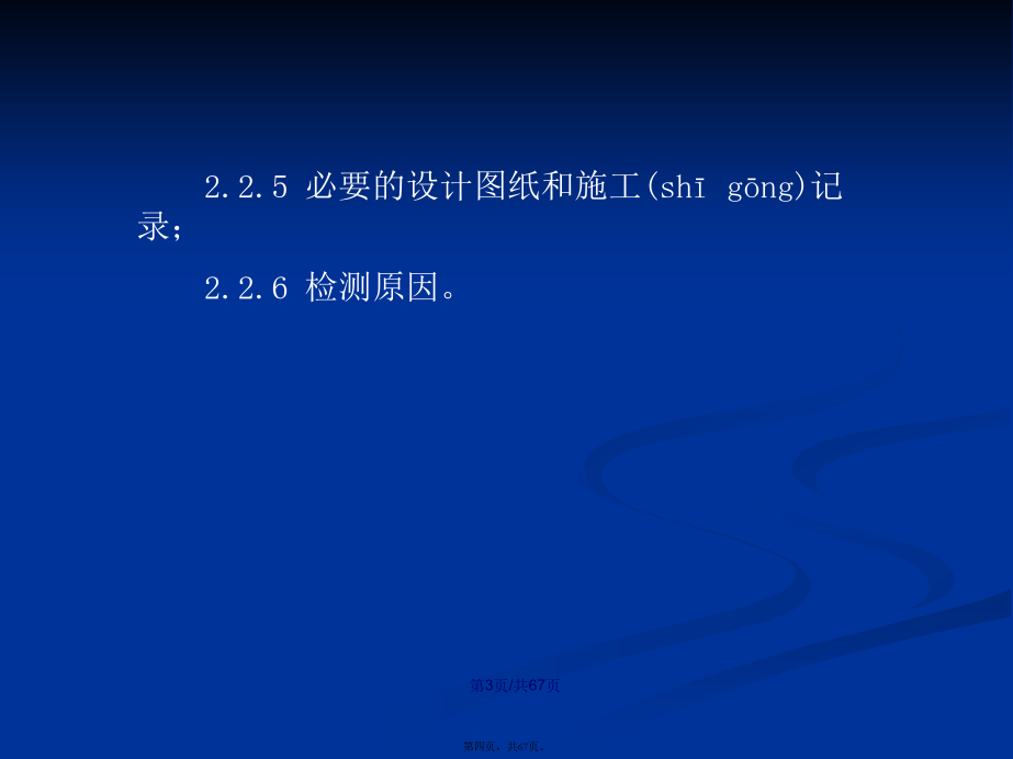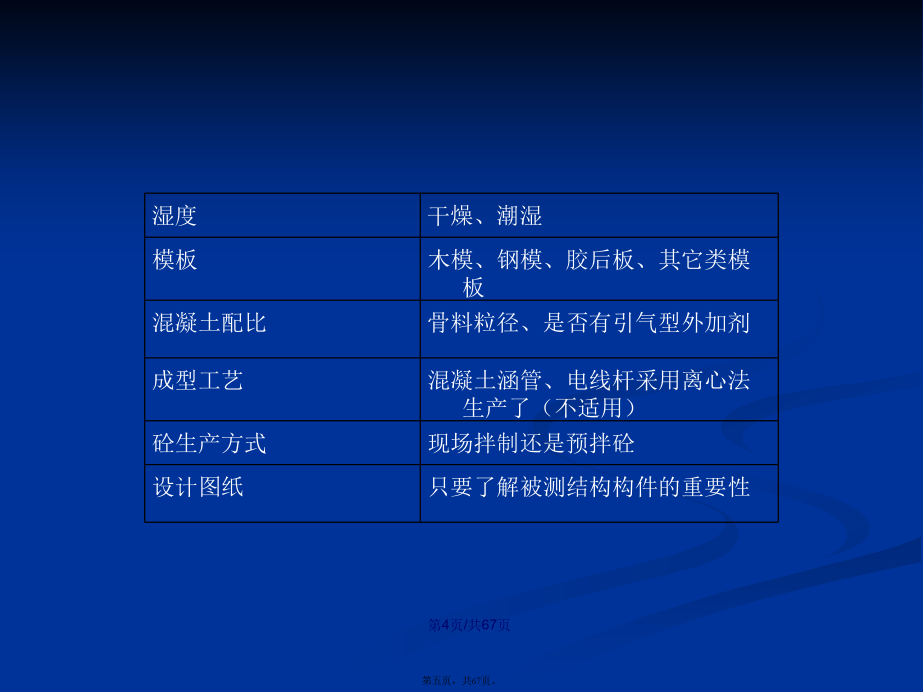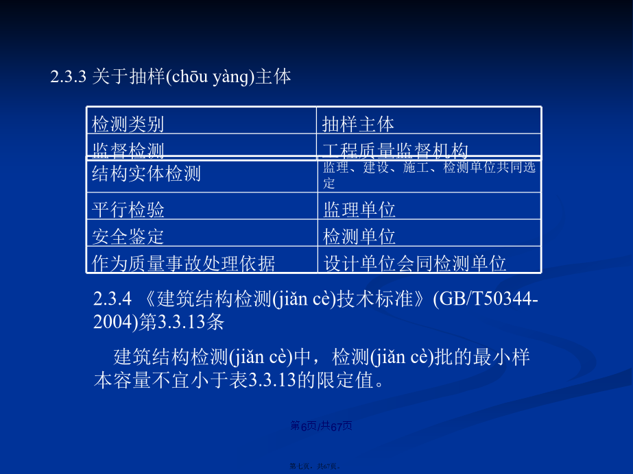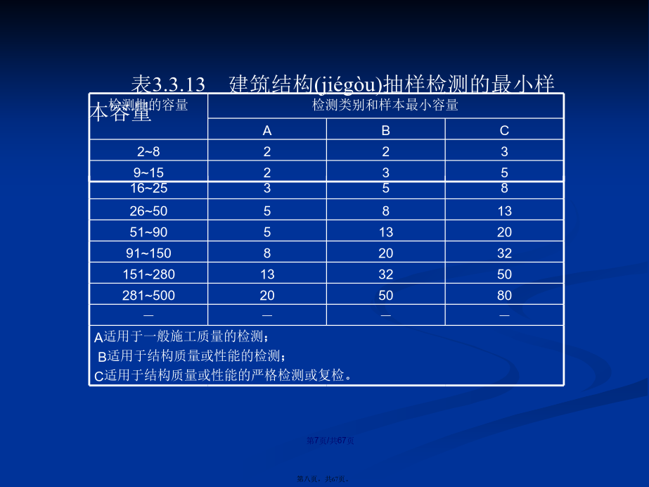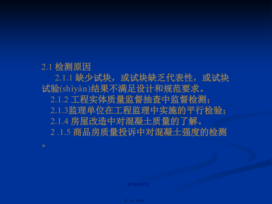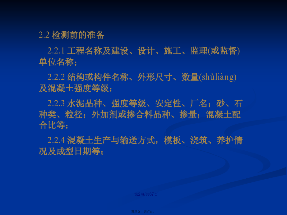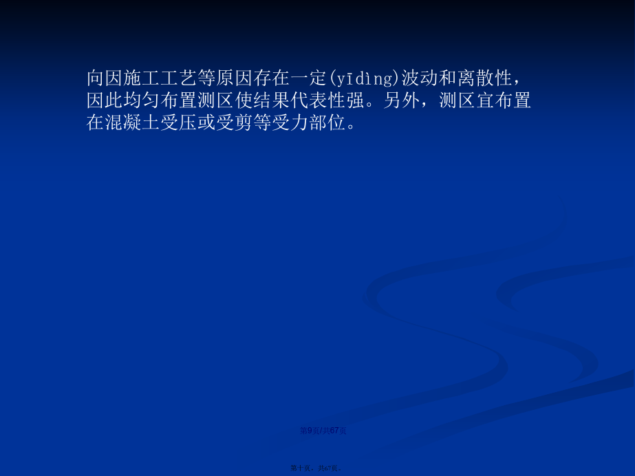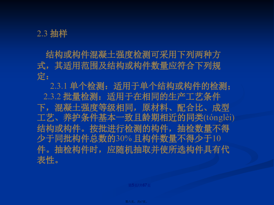 会计学2.1检测原因2.1.1缺少试块,或试块缺乏代表性,或试块试验(shìyàn)结果不满足设计和规范要求。2.1.2工程实体质量监督抽查中监督检测;2.1.3监理单位在工程监理中实施的平行检验;2.1.4房屋改造中对混凝土质量的了解。2.1.5商品房质量投诉中对混凝土强度的检测。2.2检测前的准备2.2.1工程名称及建设、设计、施工、监理(或监督)单位名称;2.2.2结构或构件名称、外形尺寸、数量(shùliàng)及混凝土强度等级;2.2.3水泥品种、强度等级、安定性、厂名;砂、石种类、粒径;外加剂或掺合料品种、掺量;混凝土配合比等;2.2.4混凝土生产与输送方式,模板、浇筑、养护情况及成型日期等;2.2.5必要的设计图纸和施工(shīgōng)记录;2.2.6检测原因。湿度2.3抽样结构或构件混凝土强度检测可采用下列两种方式,其适用范围及结构或构件数量应符合下列规定:2.3.1单个检测:适用于单个结构或构件的检测;2.3.2批量检测:适用于在相同的生产工艺条件下,混凝土强度等级相同,原材料、配合比、成型工艺、养护条件基本一致且龄期相近的同类(tónglèi)结构或构件。按批进行检测的构件,抽检数量不得少于同批构件总数的30%且构件数量不得少于10件。抽检构件时,应随机抽取并使所选构件具有代表性。检测类别表3.3.13建筑结构(jiégòu)抽样检测的最小样本容量2.3.5现行行标规定:在相同的生产工艺条件下,混凝土强度等级相同,原材料、配合比、成型工艺、养护条件基本一致且龄期相近的同类构件可以作为一个批量进行检测。因此对于一般工程,同一层柱可作为一个批量进行检测;同一层梁、板作为另一个批量进行检测;抽样的原则应根据检测目的的不同而有所不同,作为常规质量监督和验收,应采用随机抽样方法;作为安全鉴定(jiàndìng),以主要承重受力构件为主,如主梁、大跨度板、悬挑构件等;作为质量事故处理依据,应有设计等单位提出,另外,作为批量推定,当混凝土强度离散性较大时,应扩大抽样数量,使检测结果更具代表性。构件选定后,测区的布置应均匀分布在构件的长度方向上,往往构件混凝土强度沿长度和高度方向因施工工艺等原因存在一定(yīdìng)波动和离散性,因此均匀布置测区使结果代表性强。另外,测区宜布置在混凝土受压或受剪等受力部位。2.44个概念2.4.1测区:检测结构或构件混凝土抗压强度时的一个检测单元。2.4.2测点:在测区内进行的一个检测点。2.4.3测区混凝土强度换算值:由测区的平均回弹值和碳化深度值通过测强曲线计算得到(dédào)的该检测单元的现龄期混凝土抗压强度值。2.4.4结构或构件混凝土强度推定值:强度换算值总体分布中保证率不低于95%的结构或构件中的混凝土抗压强度值。2.5每一结构或构件的测区应符合下列规定:2.5.1每一结构或构件测区数不应少于10个,对某一方向尺寸小于4.5m且另一方向尺寸小于0.3m的构件,其测区数量可适当(shìdàng)减少,但不应少于5个;2.5.2相邻两测区的间距应控制在2m以内,测区离构件端部或施工缝边缘的距离不宜大于0.5m,且不宜小于0.2m;2.5.3测区应选在使回弹仪处于水平方向检测混凝土浇筑侧面。当不能满足这一要求时,可使回弹仪处于非水平方向检测混凝土浇筑侧面、表面或底面;2.5.4测区宜选在构件的两个对称可测面上,也可选在一个可测面上,且应均匀分布。在构件的重要部位及薄弱部位必须布置测区,并应避开预埋件。2.5.5测区的面积不宜大于0.04㎡;2.5.6检测面应为混凝土表面,并应清洁、平整,不应有疏松层、浮浆、油垢、涂层以及蜂窝、麻面,必要时可用砂轮清除疏松层和杂物,且不应有残留(cánliú)的粉未或碎屑;2.5.7对弹击时产生颤动的薄壁、小型构件应进行固定。/2.6不同类型构件的测区布置(bùzhì)a、带悬臂的梁(挑梁根部应有测区)b、异型柱c、牛腿柱d、剪力墙或混凝土墙板(qiánɡbǎn)e、杯形基础(jīchǔ)f、筒体(电梯井,简体(jiǎntǐ)结构,混凝土筒仓)g、大截面柱(边长大于800㎜)、壁式框架、框支柱、转换梁等,测区的面积(miànjī)建议不受0.04㎡控制。2.8当检测(jiǎncè)条件与测强曲线的适用条件有较大差异时,可采用同条件试件或钻取混凝土芯样进行修正,试件或钻取芯样数量不应少于6个。钻取芯样时每个部位应钻取一个芯样,计算时,测区混凝土强度换算值应乘以修正系数。修正系数应按下列公式计算:式中——修正(xiūzhèng)系数,精确到0.01;不小于70㎜的混凝土芯样,但芯样试件的数量(shùliàng)不应少于9个。一一对应的修正系数,可按相关技术规程的规定计算。对应样