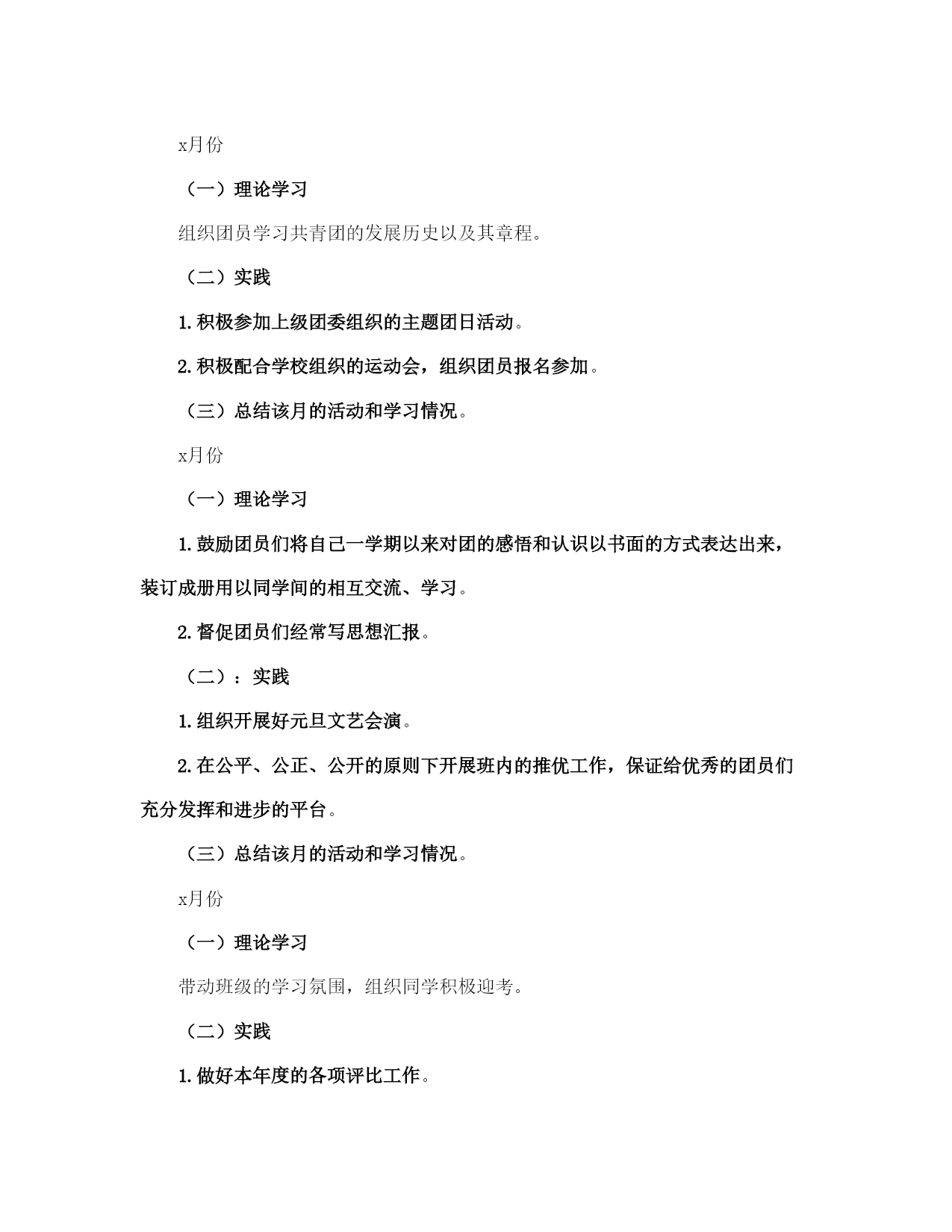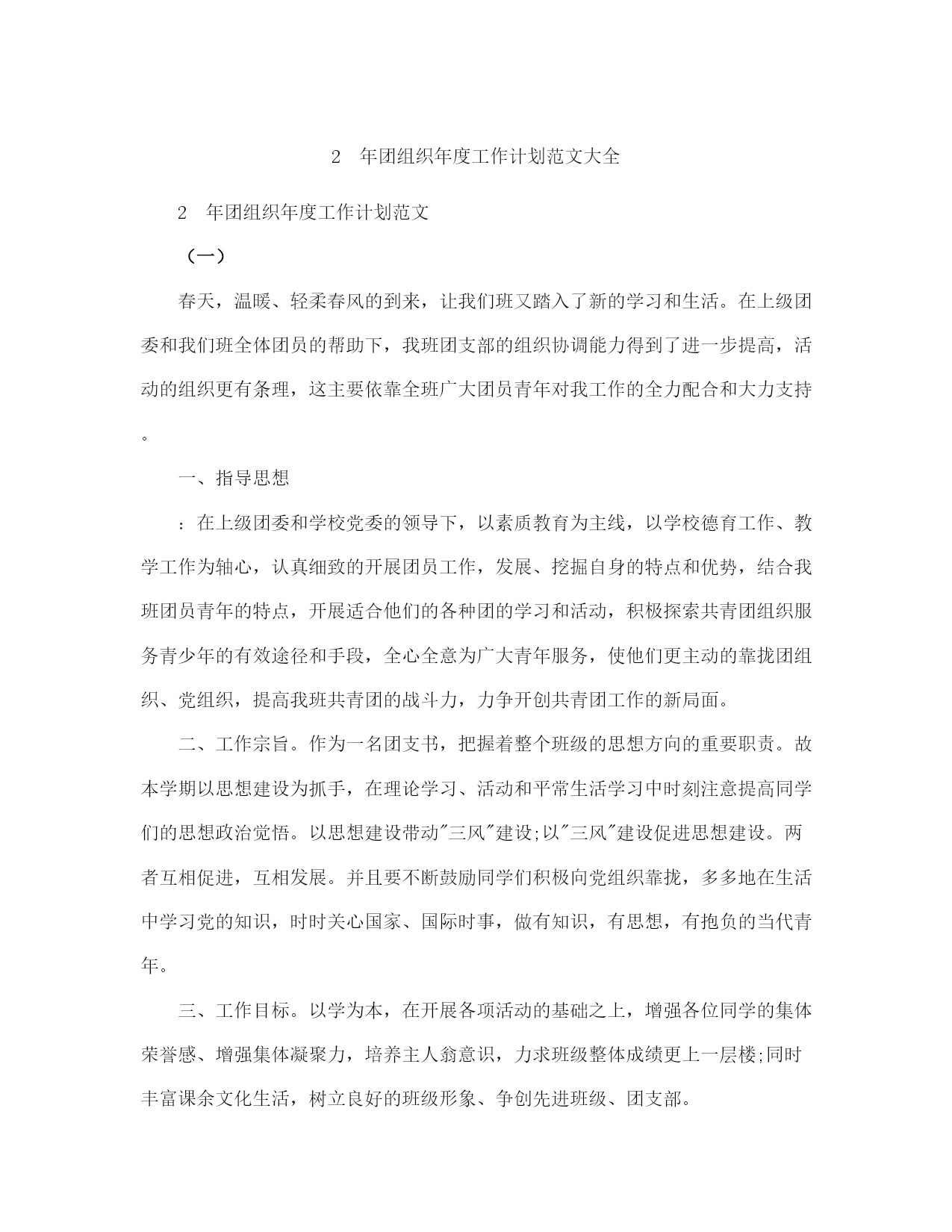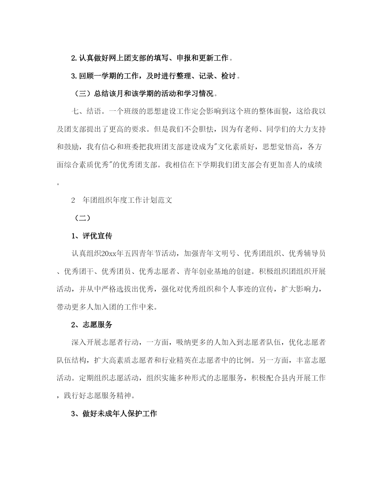 团组织度工作计划(完整版)文档资料可直接使用,可编辑,欢迎下载2年团组织年度工作计划范文大全2年团组织年度工作计划范文(一)春天,温暖、轻柔春风的到来,让我们班又踏入了新的学习和生活。在上级团委和我们班全体团员的帮助下,我班团支部的组织协调能力得到了进一步提高,活动的组织更有条理,这主要依靠全班广大团员青年对我工作的全力配合和大力支持。一、指导思想:在上级团委和学校党委的领导下,以素质教育为主线,以学校德育工作、教学工作为轴心,认真细致的开展团员工作,发展、挖掘自身的特点和优势,结合我班团员青年的特点,开展适合他们的各种团的学习和活动,积极探索共青团组织服务青少年的有效途径和手段,全心全意为广大青年服务,使他们更主动的靠拢团组织、党组织,提高我班共青团的战斗力,力争开创共青团工作的新局面。二、工作宗旨。作为一名团支书,把握着整个班级的思想方向的重要职责。故本学期以思想建设为抓手,在理论学习、活动和平常生活学习中时刻注意提高同学们的思想政治觉悟。以思想建设带动"三风"建设;以"三风"建设促进思想建设。两者互相促进,互相发展。并且要不断鼓励同学们积极向党组织靠拢,多多地在生活中学习党的知识,时时关心国家、国际时事,做有知识,有思想,有抱负的当代青年。三、工作目标。以学为本,在开展各项活动的基础之上,增强各位同学的集体荣誉感、增强集体凝聚力,培养主人翁意识,力求班级整体成绩更上一层楼;同时丰富课余文化生活,树立良好的班级形象、争创先进班级、团支部。四、常规工作有条不紊的开展:按时完成团员的注册、团费的收缴、年度的推优等工作五、具体工作计划(1)学习方面:学习是学生的天职,也是学生的重要任务,我们本学期的工作重心放在学习生活方面,为了进一步了解学习和外延,进一步增加学生对所学专业的兴趣,进一步认识学生自学能力的重要性,将具体工作如下:1、班级组织成立学习互助小组,开展自习课,提高同学们自主学习能力,同时有利于同学们对于学习问题的交流与讨论,提高班级的学习氛围,拉动没有学习积极性的同学学习积极性,促进全体团支部成员共同努力,提高全班的学习成绩。2、另外,我们还将根据具体情况,在学习委员和班长的策划下灵活组织一些关于学习方面的活动。(2)党员的发展建设。目前为止,我们班已有2名同学是党校学习班毕业生,下学期将继续在班级中积极传党的思想和精神,鼓励更多的同学递交入党申请书向党组织靠拢。六、具体活动安排x月份(一)理论学习1.团支部写好新学期工作计划。2.组织一次班内的学习党史、党章及十七大精神的主题班会,观看有关改革开放、党的历史进程的影片。(二)总结该月的活动和学习情况。x月份(一)理论学习组织团员学习共青团的发展历史以及其章程。(二)实践1.积极参加上级团委组织的主题团日活动。2.积极配合学校组织的运动会,组织团员报名参加。(三)总结该月的活动和学习情况。x月份(一)理论学习1.鼓励团员们将自己一学期以来对团的感悟和认识以书面的方式表达出来,装订成册用以同学间的相互交流、学习。2.督促团员们经常写思想汇报。(二):实践1.组织开展好元旦文艺会演。2.在公平、公正、公开的原则下开展班内的推优工作,保证给优秀的团员们充分发挥和进步的平台。(三)总结该月的活动和学习情况。x月份(一)理论学习带动班级的学习氛围,组织同学积极迎考。(二)实践1.做好本年度的各项评比工作。2.认真做好网上团支部的填写、申报和更新工作。3.回顾一学期的工作,及时进行整理、记录、检讨。(三)总结该月和该学期的活动和学习情况。七、结语。一个班级的思想建设工作定会影响到这个班的整体面貌,这给我以及团支部提出了更高的要求。但是我们不会胆怯,因为有老师、同学们的大力支持和鼓励,我有信心和班委把我班团支部建设成为"文化素质好,思想觉悟高,各方面综合素质优秀"的优秀团支部。我相信在下学期我们团支部会有更加喜人的成绩。2年团组织年度工作计划范文(二)1、评优宣传认真组织20xx年五四青年节活动,加强青年文明号、优秀团组织、优秀辅导员、优秀团干、优秀团员、优秀志愿者、青年创业基地的创建。积极组织团组织开展活动,并从中严格选拔出优秀,强化对优秀组织和个人事迹的宣传,扩大影响力,带动更多人加入团的工作中来。2、志愿服务深入开展志愿者行动,一方面,吸纳更多的人加入到志愿者队伍,优化志愿者队伍结构,扩大高素质志愿者和行业精英在志愿者中的比例。另一方面,丰富志愿活动。定期组织志愿活动,组织实施多种形式的志愿服务,积极配合县内开展工作,践行好志愿服务精神。3、做好未成年人保护工作一是进一步加大对青少年违法犯罪、未成年保护、青少年法制宣传教育力度,积极宣传未成年保*和预防青少年犯罪的相关法律