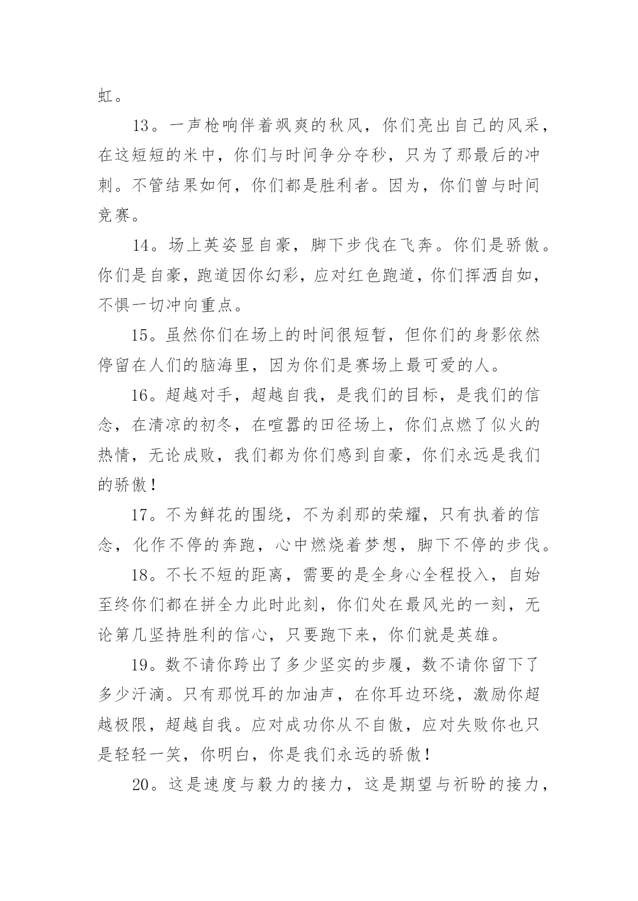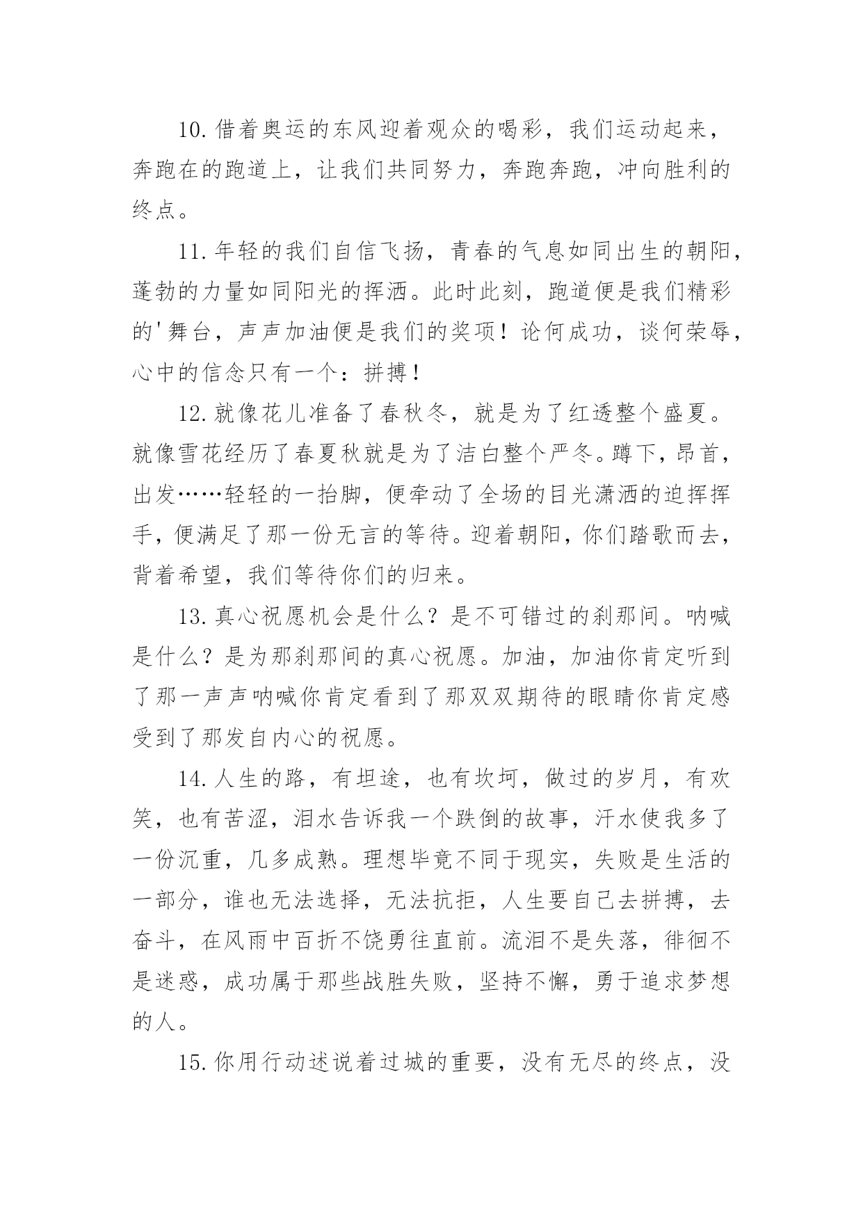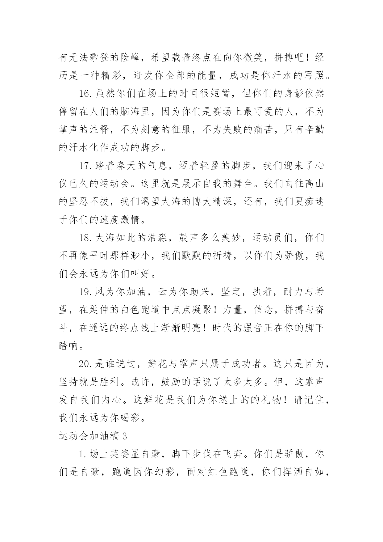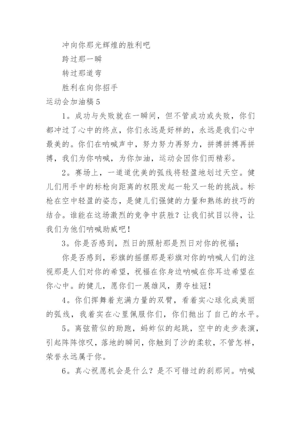 运动会加油稿(推荐)运动会加油稿15篇在不断进步的社会中,我们都不可避免地要接触到加油稿,借助加油稿可以点燃对方的激情,激发对方的斗志。写起加油稿来就毫无头绪?以下是小编为大家收集的运动会加油稿,欢迎阅读,希望大家能够喜欢。运动会加油稿1有种胜利叫坚持三千米,对于我来说是一个遥远的距离。想到的时候,觉得颤栗。然而对于站在起跑线上的`每一位运动员来说这将是她们将要面临的比赛。我认为将会有人无法跑完全程,毕竟三千米对于一个女生来说这足以是一次长征。可结果只能让我意外没有一个运动员在中途退出所有的运动员都坚持到了终点。虽然最后一名与第一名之间有将近一圈的差距然而她们都是胜利者,因为有种胜利叫坚持超越极限或许你努力过,争取过,但还是与成功的掌声和鲜花擦肩而过。或许你尝试过,失败过,但成功的火焰就是无法熊熊燃烧。或许你面对沟壑时,犹豫过,害怕过徘徊过,伤心过,滞步过但朋友,你是否冷静地思考过,或许你再往前一步或许成功便正好与你握手呢?你是否平静地反问过,或许跨越这道沟就是圣洁的梦的故乡呢?鼓起勇气吧,再向前迈出一步吧超越梦的界限,超越自己的极限,打破成功的极限!超越极限,超越自我,向梦的方向起飞吧运动会加油稿21.“沙场秋点兵”的壮阔,想必给了我们难以言喻的激情。于是,我放下手中的笔,去感受脉搏与心跳的激烈。在期盼中,在意料中,是悲是喜,是欢是狂,都未可知,但可知的是我们拥有这样一场运动盛会。2.秋风羽,天气淡淡的转凉。然而这人的秋在今天更加迷人,不是因为它的秋高气爽,也不是因为它的明媚阳光,是因为今天的人儿倍加精神气爽。看!运动场上那一幕幕,一股股,无论是哭是笑,市喜是悲,其中都融入了他们的汗水、辛劳。他们是真正的矫健者,是运动场上的骄儿,更是我们心中的英雄。加油吧!英雄们!3.场上英姿显自豪,脚下步伐在飞奔。你们是骄傲。你们是自豪,跑道因你幻彩,面对红色跑道,你们挥洒自如,不惧一切冲向终点。4.青春的脚步,青春的速度,青春的活力,青春的激情,将会在你们的身上尽情体现。迎接自我,挑战自我,战胜自我!我们相信你们一定能行,加油吧,运动员!终点就在眼前!5.踏上跑道,是一种选择。离开起点,是一种勇气。驰骋赛场,是一种胜利。6.奥林匹克精神佳,运动健将拼搏强。在运动场上的运动健儿们,发挥你们的特长,展示你们的风采,让你们的身影在运动场上留下优美的风景线,让你们的雄心壮志在运动场上发挥的淋漓尽致。7.深深的呼吸,等待你的是艰难的1500米。相信胜利会属于你们。但在这征途上,需要你勇敢的心去面对。我们在为你加油,你是否听到了我们发自心中的呐喊?8.超越对手,超越自我,是我们的目标,是我们的信念,在清凉的初冬,在喧嚣的田径场上,你们点燃了似火的热情,无论成败,我们都为你们感到自豪,你们永远是我们的骄傲!9.致运动员,是体育场上游走的火焰,是来去不息的脚步,是风中飞舞的树叶折射的金色光芒,藉此,能够诠释运动员兴奋的脸庞。那轻盈的步伐似飞鸟的翅膀,那清脆的枪声响彻天际,它粲然升起那跃动的渴望,起跑加速超越冲刺,一步一步延向胜利的曙光。那是力的比拼,素质的较量,是石榴树上,跃动的心脏。10.借着奥运的东风迎着观众的喝彩,我们运动起来,奔跑在的跑道上,让我们共同努力,奔跑奔跑,冲向胜利的终点。11.年轻的我们自信飞扬,青春的气息如同出生的朝阳,蓬勃的力量如同阳光的挥洒。此时此刻,跑道便是我们精彩的'舞台,声声加油便是我们的奖项!论何成功,谈何荣辱,心中的信念只有一个:拼搏!12.就像花儿准备了春秋冬,就是为了红透整个盛夏。就像雪花经历了春夏秋就是为了洁白整个严冬。蹲下,昂首,出发……轻轻的一抬脚,便牵动了全场的目光潇洒的迫挥挥手,便满足了那一份无言的等待。迎着朝阳,你们踏歌而去,背着希望,我们等待你们的归来。13.真心祝愿机会是什么?是不可错过的刹那间。呐喊是什么?是为那刹那间的真心祝愿。加油,加油你肯定听到了那一声声呐喊你肯定看到了那双双期待的眼睛你肯定感受到了那发自内心的祝愿。14.人生的路,有坦途,也有坎坷,做过的岁月,有欢笑,也有苦涩,泪水告诉我一个跌倒的故事,汗水使我多了一份沉重,几多成熟。理想毕竟不同于现实,失败是生活的一部分,谁也无法选择,无法抗拒,人生要自己去拼搏,去奋斗,在风雨中百折不饶勇往直前。流泪不是失落,徘徊不是迷惑,成功属于那些战胜失败,坚持不懈,勇于追求梦想的人。15.你用行动述说着过城的重要,没有无尽的终点,没有无法攀登的险峰,希望载着终点在向你微笑,拼搏吧!经历是一种精彩,迸发你全部的能量,成功是你汗水的写照。16.虽然你们在场上的时间很短暂,但你们的身影依然停留在人们的脑海里,因为你们是赛场上最可爱的人,不为掌声的注释,不为刻意的征服,不为失败的痛苦,只有辛勤的汗水化作成功的脚步。17.踏着春天的气息,迈着轻盈的脚步