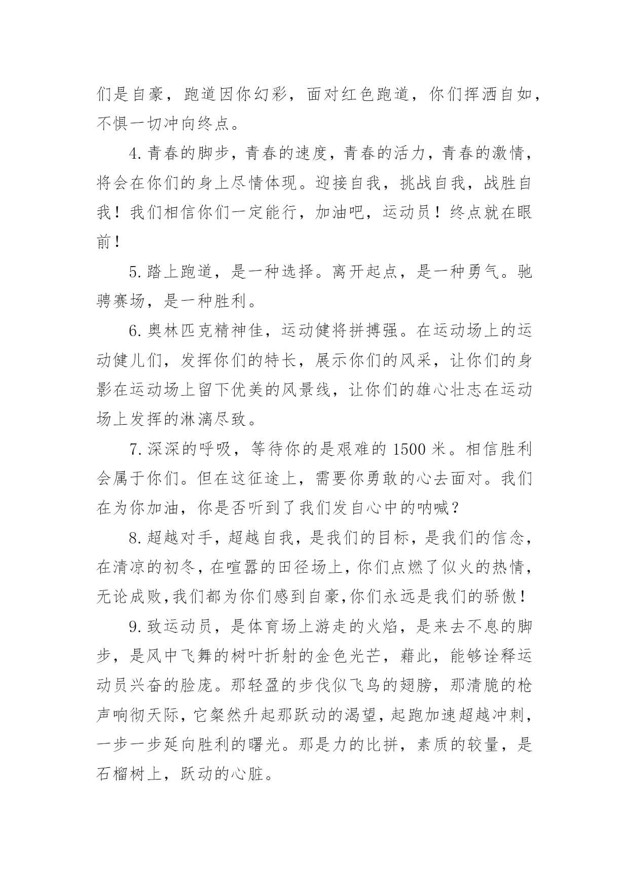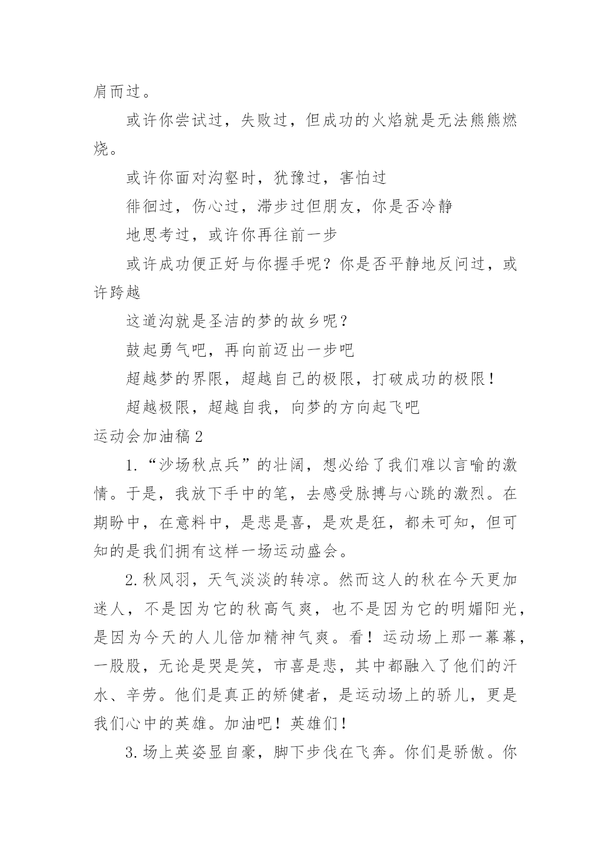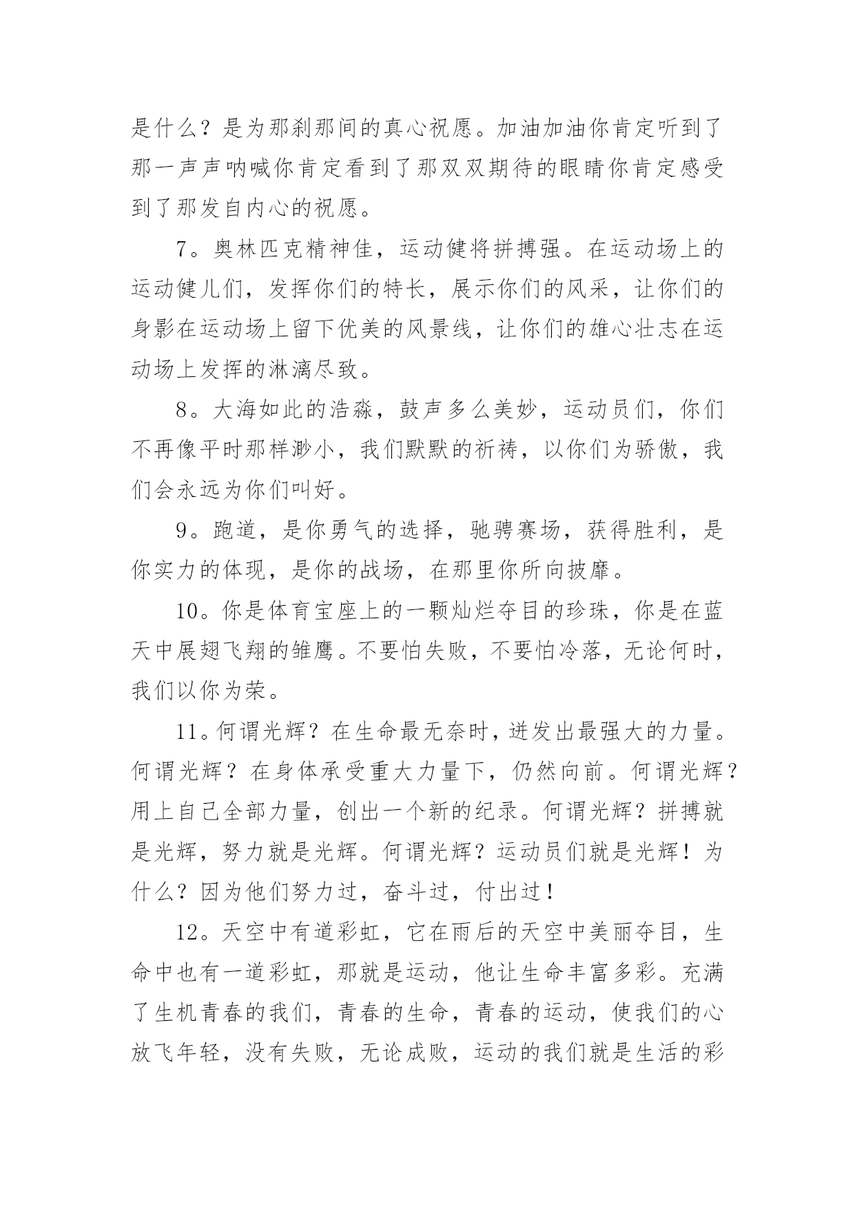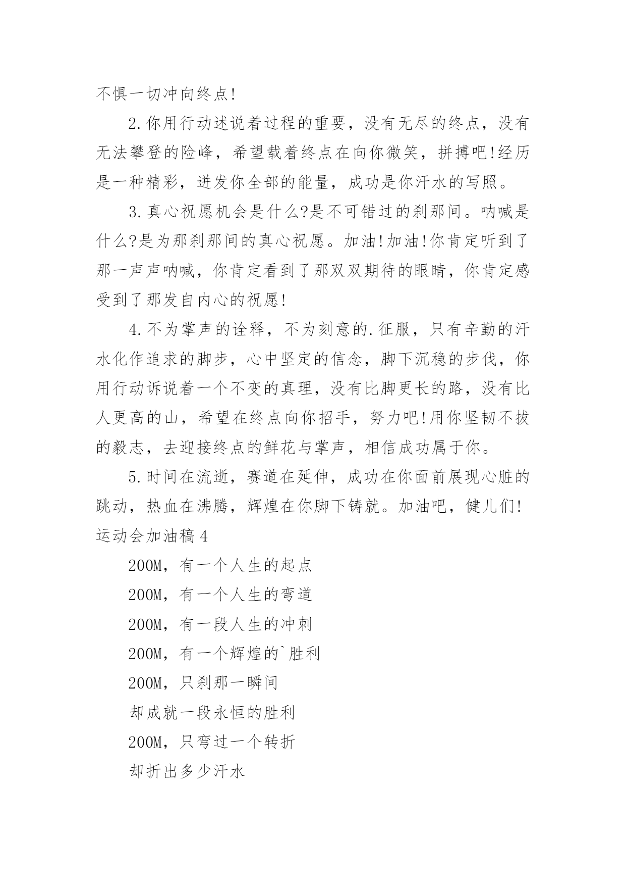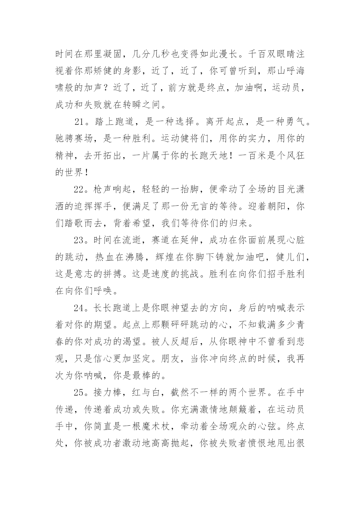 运动会加油稿(推荐)运动会加油稿15篇在不断进步的社会中,我们都不可避免地要接触到加油稿,借助加油稿可以点燃对方的激情,激发对方的斗志。写起加油稿来就毫无头绪?以下是小编为大家收集的运动会加油稿,欢迎阅读,希望大家能够喜欢。运动会加油稿1有种胜利叫坚持三千米,对于我来说是一个遥远的距离。想到的时候,觉得颤栗。然而对于站在起跑线上的`每一位运动员来说这将是她们将要面临的比赛。我认为将会有人无法跑完全程,毕竟三千米对于一个女生来说这足以是一次长征。可结果只能让我意外没有一个运动员在中途退出所有的运动员都坚持到了终点。虽然最后一名与第一名之间有将近一圈的差距然而她们都是胜利者,因为有种胜利叫坚持超越极限或许你努力过,争取过,但还是与成功的掌声和鲜花擦肩而过。或许你尝试过,失败过,但成功的火焰就是无法熊熊燃烧。或许你面对沟壑时,犹豫过,害怕过徘徊过,伤心过,滞步过但朋友,你是否冷静地思考过,或许你再往前一步或许成功便正好与你握手呢?你是否平静地反问过,或许跨越这道沟就是圣洁的梦的故乡呢?鼓起勇气吧,再向前迈出一步吧超越梦的界限,超越自己的极限,打破成功的极限!超越极限,超越自我,向梦的方向起飞吧运动会加油稿21.“沙场秋点兵”的壮阔,想必给了我们难以言喻的激情。于是,我放下手中的笔,去感受脉搏与心跳的激烈。在期盼中,在意料中,是悲是喜,是欢是狂,都未可知,但可知的是我们拥有这样一场运动盛会。2.秋风羽,天气淡淡的转凉。然而这人的秋在今天更加迷人,不是因为它的秋高气爽,也不是因为它的明媚阳光,是因为今天的人儿倍加精神气爽。看!运动场上那一幕幕,一股股,无论是哭是笑,市喜是悲,其中都融入了他们的汗水、辛劳。他们是真正的矫健者,是运动场上的骄儿,更是我们心中的英雄。加油吧!英雄们!3.场上英姿显自豪,脚下步伐在飞奔。你们是骄傲。你们是自豪,跑道因你幻彩,面对红色跑道,你们挥洒自如,不惧一切冲向终点。4.青春的脚步,青春的速度,青春的活力,青春的激情,将会在你们的身上尽情体现。迎接自我,挑战自我,战胜自我!我们相信你们一定能行,加油吧,运动员!终点就在眼前!5.踏上跑道,是一种选择。离开起点,是一种勇气。驰骋赛场,是一种胜利。6.奥林匹克精神佳,运动健将拼搏强。在运动场上的运动健儿们,发挥你们的特长,展示你们的风采,让你们的身影在运动场上留下优美的风景线,让你们的雄心壮志在运动场上发挥的淋漓尽致。7.深深的呼吸,等待你的是艰难的1500米。相信胜利会属于你们。但在这征途上,需要你勇敢的心去面对。我们在为你加油,你是否听到了我们发自心中的呐喊?8.超越对手,超越自我,是我们的目标,是我们的信念,在清凉的初冬,在喧嚣的田径场上,你们点燃了似火的热情,无论成败,我们都为你们感到自豪,你们永远是我们的骄傲!9.致运动员,是体育场上游走的火焰,是来去不息的脚步,是风中飞舞的树叶折射的金色光芒,藉此,能够诠释运动员兴奋的脸庞。那轻盈的步伐似飞鸟的翅膀,那清脆的枪声响彻天际,它粲然升起那跃动的渴望,起跑加速超越冲刺,一步一步延向胜利的曙光。那是力的比拼,素质的较量,是石榴树上,跃动的心脏。10.借着奥运的东风迎着观众的喝彩,我们运动起来,奔跑在的跑道上,让我们共同努力,奔跑奔跑,冲向胜利的终点。11.年轻的我们自信飞扬,青春的气息如同出生的朝阳,蓬勃的力量如同阳光的挥洒。此时此刻,跑道便是我们精彩的'舞台,声声加油便是我们的奖项!论何成功,谈何荣辱,心中的信念只有一个:拼搏!12.就像花儿准备了春秋冬,就是为了红透整个盛夏。就像雪花经历了春夏秋就是为了洁白整个严冬。蹲下,昂首,出发……轻轻的一抬脚,便牵动了全场的目光潇洒的迫挥挥手,便满足了那一份无言的等待。迎着朝阳,你们踏歌而去,背着希望,我们等待你们的归来。13.真心祝愿机会是什么?是不可错过的刹那间。呐喊是什么?是为那刹那间的真心祝愿。加油,加油你肯定听到了那一声声呐喊你肯定看到了那双双期待的眼睛你肯定感受到了那发自内心的祝愿。14.人生的路,有坦途,也有坎坷,做过的岁月,有欢笑,也有苦涩,泪水告诉我一个跌倒的故事,汗水使我多了一份沉重,几多成熟。理想毕竟不同于现实,失败是生活的一部分,谁也无法选择,无法抗拒,人生要自己去拼搏,去奋斗,在风雨中百折不饶勇往直前。流泪不是失落,徘徊不是迷惑,成功属于那些战胜失败,坚持不懈,勇于追求梦想的人。15.你用行动述说着过城的重要,没有无尽的终点,没有无法攀登的险峰,希望载着终点在向你微笑,拼搏吧!经历是一种精彩,迸发你全部的能量,成功是你汗水的写照。16.虽然你们在场上的时间很短暂,但你们的身影依然停留在人们的脑海里,因为你们是赛场上最可爱的人,不为掌声的注释,不为刻意的征服,不为失败的痛苦,只有辛勤的汗水化作成功的脚步。17.踏着春天的气息,迈着轻盈的脚步