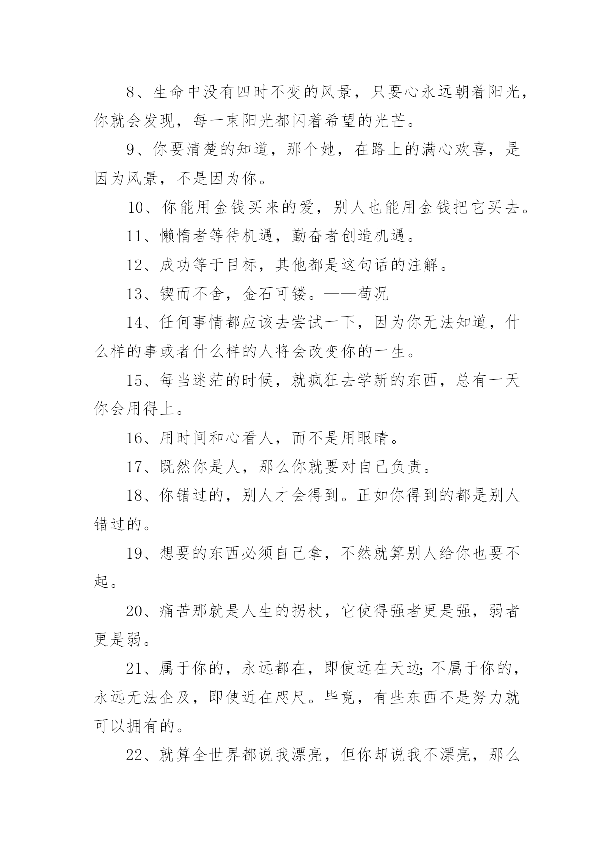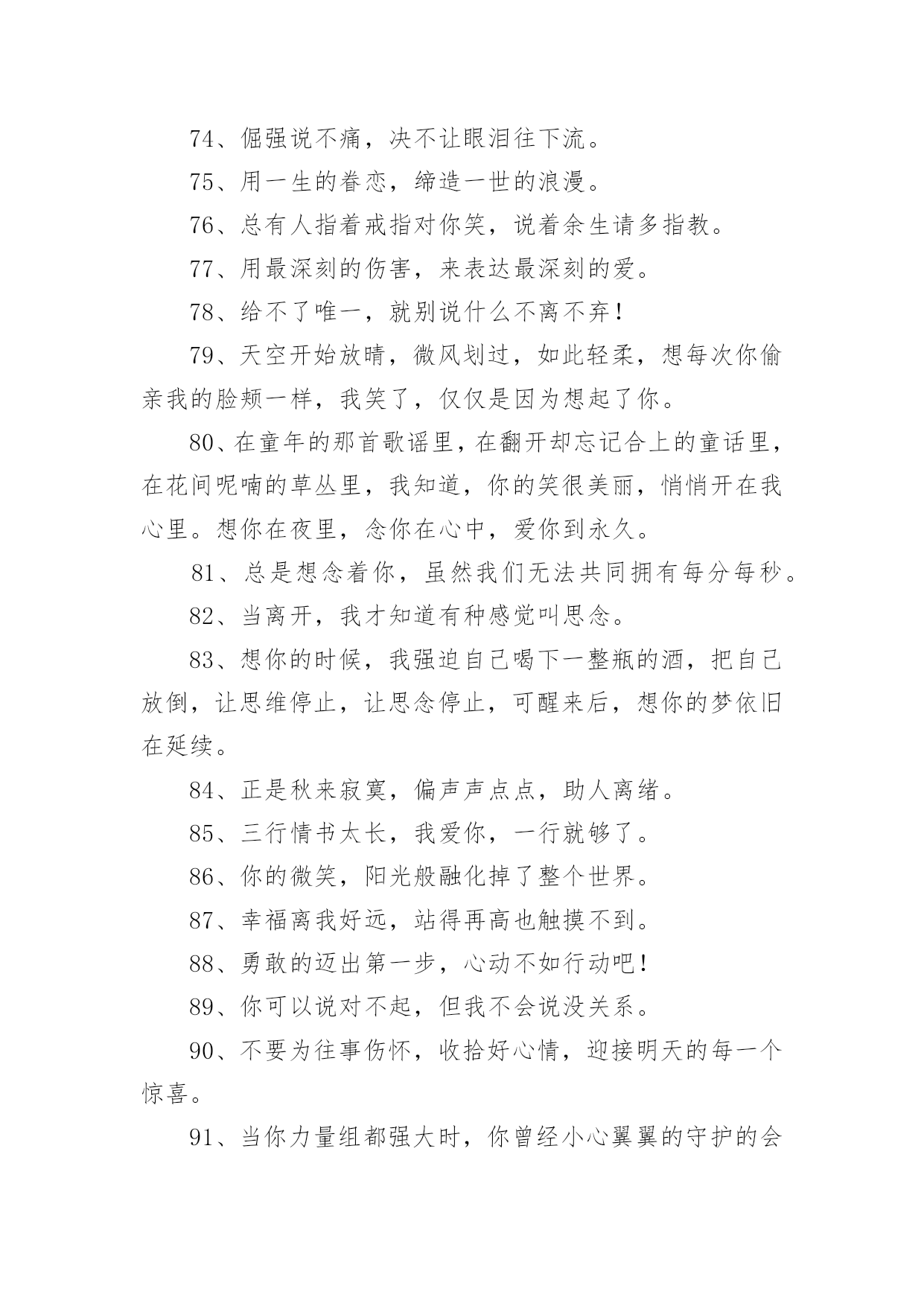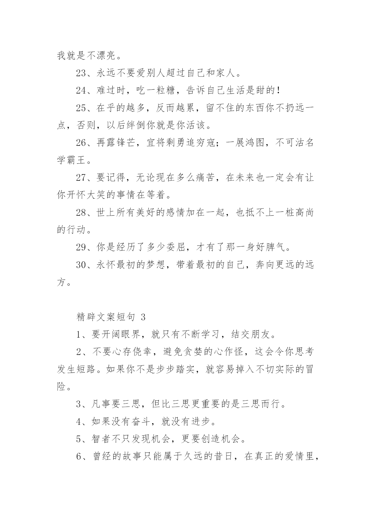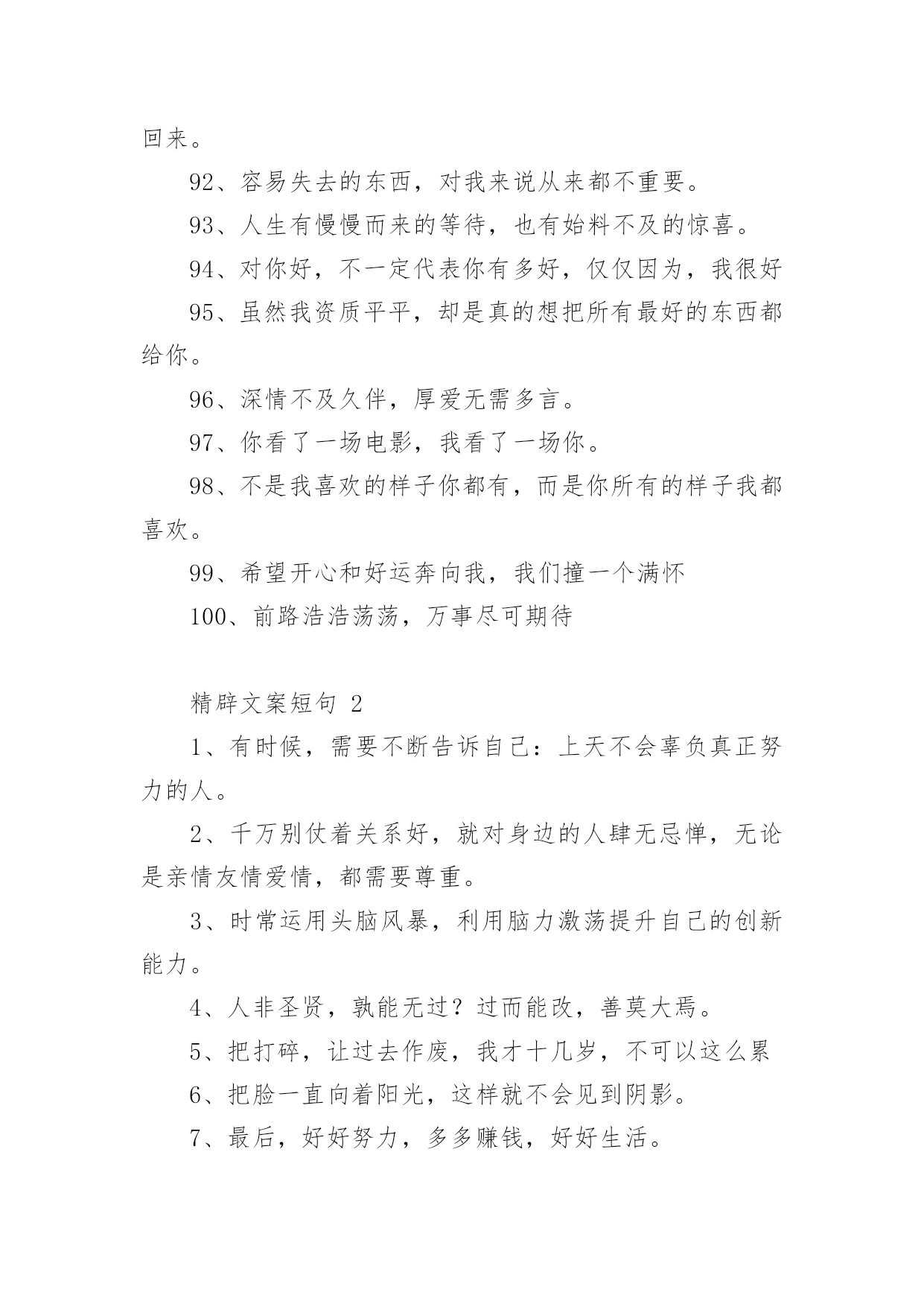精辟文案短句精辟文案短句(通用200句)在平日的学习、工作和生活里,越来越多人热衷于在朋友圈发布文案,文案用以记录学习、生活中有意义,特别是有纪念意义的事情。那些火遍朋友圈的文案都是什么样的呢?以下是小编精心整理的精辟文案短句,欢迎阅读,希望大家能够喜欢。精辟文案短句11、去到你的城市,吹过你吹过的风,算不算相拥。2、我爱的人我要亲手给她幸福别人我不放心。3、等一个发现,等一个感动让爱再沸腾。4、你眼中有浓浓的夜,挂起着盈盈的月,倾洒进我的心房,让我日思,夜也难忘。5、恐惧自己受苦的人,已经因为自己的恐惧在受苦。6、即使行动导致错误,却也带来了学习与成长,不行动则是停滞与萎缩。7、别忘了答应自己要做的事情,别忘了自己要去的远方。8、愿你一切出于自然并非刻意愿你永怀善意灵魂澄澈明朗。9、你是黄昏后的暮光,是月下散发着光亮的希望。10、你要坚信每天叫醒你的不是闹钟,而是你的梦想。11、想要赢,就别怕输,强者就是把对他人羡慕嫉妒恨的时间,全部用来提高自己。12、人生总是在前行,那些所有你以为过不去的过去,最后都留在了最后。13、这个世界从来不公平,你只有努力,才能换来那些平等的待遇14、你是我的天使,我愿做你今生的传奇;你是我的音符,我愿做你此生的乐谱;请收下我诚挚的心,让我与你心心相印。15、给人金钱是下策,给人能力是中策,给人观念是上策。16、一旦立下目标,不达目标绝不罢手,方可成功。17、生活越是艰苦,人就越发坚强;人越是坚强,生活也就变得越发简单。18、做一件事情,只有最初五分钟热情的,叫失败者;最后五分钟仍有热情的,叫成功者。19、有了坚强,你就有了战胜一切的勇气,你就有了生命的战斗力,这才是你活下去的理由。坚强的活着,你的理想,你的追求,才有了最终成为现实的渴望。20、积极者相信只有推动自己才能推动世界,只要推动自己就能推动世界。21、一个人如果能集中精力于他的强项,那么就能摆脱缺点的困扰;要善于经营自己的长处,抓住机会成就自己,毕竟我们的人生太短暂。22、学会坚强,做一只沙漠中永不哭泣的骆驼23、人生多一份挫折,就多一份人生的感悟;人生多一次跌打,就多一条抗争的经验。24、用勇气踏平坎坷,用信心重烯希望,用汗水纺织翅膀,始终坚信,梦就在前方。25、有些风景,如果你不站在高处,你永远体会不到它的魅力;有些路,如果你不去启程,你永远不知道它是多么的美丽。26、向上的路,并不拥挤。拥挤是因为,大部分人选择了安逸!27、人生可只有活一次的机会,千万不能让它后悔啊。28、不要只因一次失败,就放弃你原来决心想达到的目的。29、放眼前方,只要我们继续,收获的季节就在前方。30、不要否定自己,生活明朗,好运在路上。31、修炼自己,比到处迎合别人重要得多。32、精致背后的坚韧与自律,才是这世上最好看的风景。33、别把最好的时光,浪费在无谓的等待与犹豫不决中34、不要埋怨任何一个人一件事,自己的今天是无数个昨天的叠加与累积,所以重要的是走好今天的每一步!35、人生总是有输有赢,得势顺境时,千万不要得意忘形,放纵自己;失势逆境时,千万不可消极颓唐,放弃自己;人生成功的定义,要自己去找,别迷失在别人的看法中。36、人生只有三天,活在昨天的人迷惑,活在明天的人等待,活在今天的人最踏实。37、当你知道一颗钻石的价钱要远远高于一颗玻璃珠的时候,你就已经可悲的长大了。38、相信自己拥有无限的潜力,只要你有一刻渴望成长,它就会支撑你开花结。新的一天,加油!39、不要以为改天才有空,所谓的改天或许是最忙碌的一天;不要以为下次就能见面,所谓的下次或许变为下辈子。40、人们总是在努力珍惜未得到的,而遗忘了所拥有的。41、每个人生下来都要从事某项事业,每一个活在地还应上的人都有自己生活中的义务。42、积极的人在每一次忧患中都看到一个机会,而消极的人则在每个机会都看到某种忧患。43、希望新的一年增长的不再是体重,而是知识与见闻。44、偷偷厉害万事尽可期待45、保持很多的热爱和一点点野心46、一如既往,万事胜意。47、你的好运正在派件,请保持心情舒畅48、别让平凡的生活耗尽你对生活的向往49、别丧,你也是别人心里偷偷藏起来的月亮哦50、只要看到你的笑,世界就没有那么糟。51、这一生,除了故乡,我只为你一个人写过月亮。52、遇见你是故事的开始,走到底是余生的欢喜。53、一想到再也没有人像我这样的爱你,我就觉得我赢了。54、喜欢上她的那一刻,人就从过去迈向了未来。55、喜欢你不是三分钟热度,是蓄谋已久后的深思熟虑。56、我想变得足够好,再见你时可以自信地笑。57、我身体很好,可以扛米袋子,扛煤气罐,可就是扛不住想你。58、不要因为突如其来的失去,错过眼前正在绽放的美丽。59、不完美才能看到另一种完美。60、不要太在意自己的伤,一直往前就好了。不忆过去,不惧将来。6