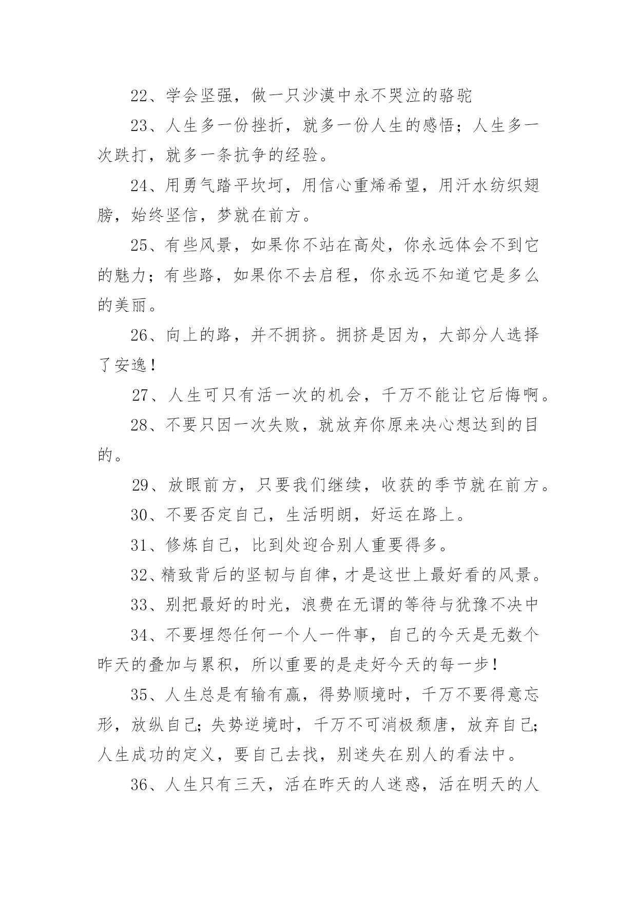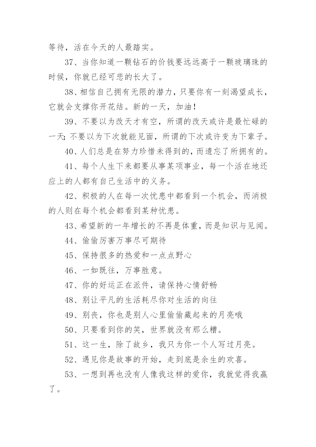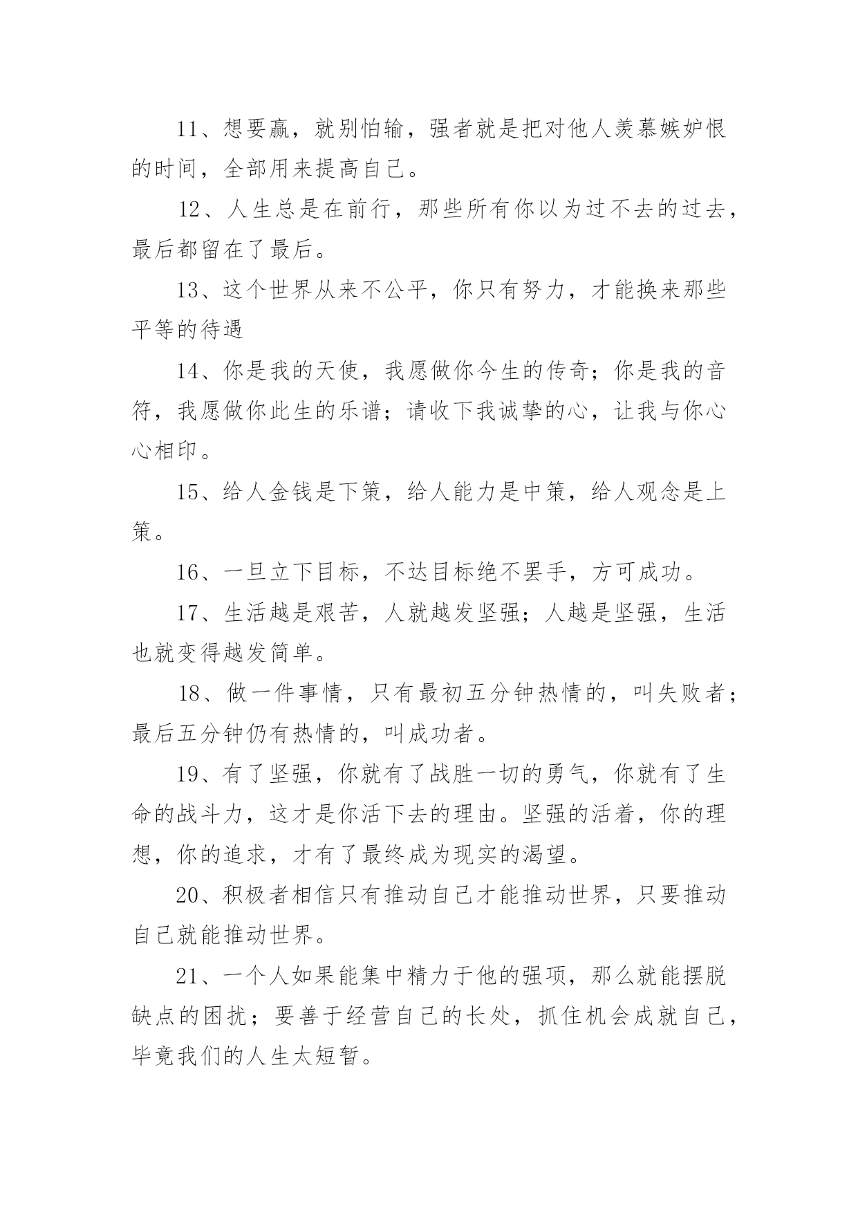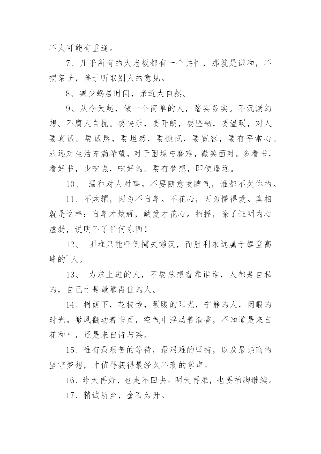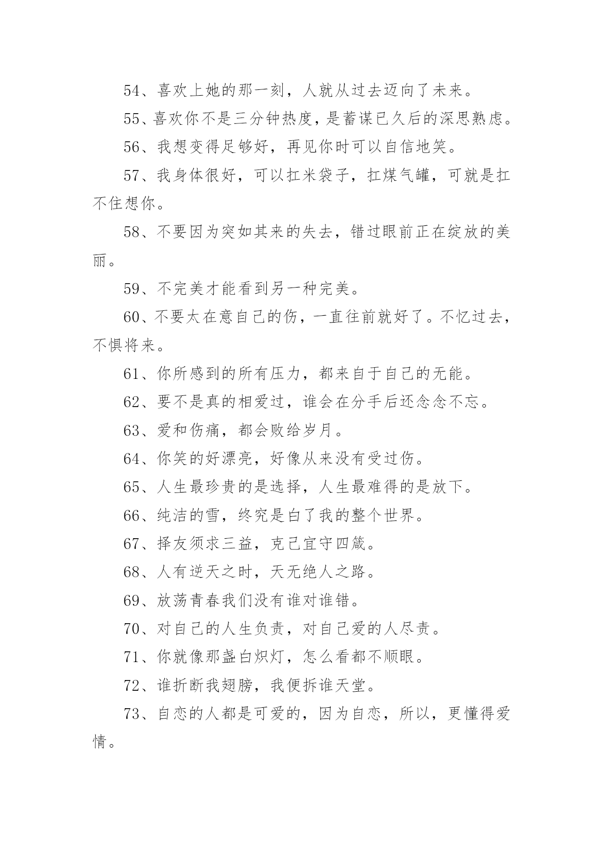 精辟文案短句精辟文案短句(通用200句)在平日的学习、工作和生活里,越来越多人热衷于在朋友圈发布文案,文案用以记录学习、生活中有意义,特别是有纪念意义的事情。那些火遍朋友圈的文案都是什么样的呢?以下是小编精心整理的精辟文案短句,欢迎阅读,希望大家能够喜欢。精辟文案短句11、去到你的城市,吹过你吹过的风,算不算相拥。2、我爱的人我要亲手给她幸福别人我不放心。3、等一个发现,等一个感动让爱再沸腾。4、你眼中有浓浓的夜,挂起着盈盈的月,倾洒进我的心房,让我日思,夜也难忘。5、恐惧自己受苦的人,已经因为自己的恐惧在受苦。6、即使行动导致错误,却也带来了学习与成长,不行动则是停滞与萎缩。7、别忘了答应自己要做的事情,别忘了自己要去的远方。8、愿你一切出于自然并非刻意愿你永怀善意灵魂澄澈明朗。9、你是黄昏后的暮光,是月下散发着光亮的希望。10、你要坚信每天叫醒你的不是闹钟,而是你的梦想。11、想要赢,就别怕输,强者就是把对他人羡慕嫉妒恨的时间,全部用来提高自己。12、人生总是在前行,那些所有你以为过不去的过去,最后都留在了最后。13、这个世界从来不公平,你只有努力,才能换来那些平等的待遇14、你是我的天使,我愿做你今生的传奇;你是我的音符,我愿做你此生的乐谱;请收下我诚挚的心,让我与你心心相印。15、给人金钱是下策,给人能力是中策,给人观念是上策。16、一旦立下目标,不达目标绝不罢手,方可成功。17、生活越是艰苦,人就越发坚强;人越是坚强,生活也就变得越发简单。18、做一件事情,只有最初五分钟热情的,叫失败者;最后五分钟仍有热情的,叫成功者。19、有了坚强,你就有了战胜一切的勇气,你就有了生命的战斗力,这才是你活下去的理由。坚强的活着,你的理想,你的追求,才有了最终成为现实的渴望。20、积极者相信只有推动自己才能推动世界,只要推动自己就能推动世界。21、一个人如果能集中精力于他的强项,那么就能摆脱缺点的困扰;要善于经营自己的长处,抓住机会成就自己,毕竟我们的人生太短暂。22、学会坚强,做一只沙漠中永不哭泣的骆驼23、人生多一份挫折,就多一份人生的感悟;人生多一次跌打,就多一条抗争的经验。24、用勇气踏平坎坷,用信心重烯希望,用汗水纺织翅膀,始终坚信,梦就在前方。25、有些风景,如果你不站在高处,你永远体会不到它的魅力;有些路,如果你不去启程,你永远不知道它是多么的美丽。26、向上的路,并不拥挤。拥挤是因为,大部分人选择了安逸!27、人生可只有活一次的机会,千万不能让它后悔啊。28、不要只因一次失败,就放弃你原来决心想达到的目的。29、放眼前方,只要我们继续,收获的季节就在前方。30、不要否定自己,生活明朗,好运在路上。31、修炼自己,比到处迎合别人重要得多。32、精致背后的坚韧与自律,才是这世上最好看的风景。33、别把最好的时光,浪费在无谓的等待与犹豫不决中34、不要埋怨任何一个人一件事,自己的今天是无数个昨天的叠加与累积,所以重要的是走好今天的每一步!35、人生总是有输有赢,得势顺境时,千万不要得意忘形,放纵自己;失势逆境时,千万不可消极颓唐,放弃自己;人生成功的定义,要自己去找,别迷失在别人的看法中。36、人生只有三天,活在昨天的人迷惑,活在明天的人等待,活在今天的人最踏实。37、当你知道一颗钻石的价钱要远远高于一颗玻璃珠的时候,你就已经可悲的长大了。38、相信自己拥有无限的潜力,只要你有一刻渴望成长,它就会支撑你开花结。新的一天,加油!39、不要以为改天才有空,所谓的改天或许是最忙碌的一天;不要以为下次就能见面,所谓的下次或许变为下辈子。40、人们总是在努力珍惜未得到的,而遗忘了所拥有的。41、每个人生下来都要从事某项事业,每一个活在地还应上的人都有自己生活中的义务。42、积极的人在每一次忧患中都看到一个机会,而消极的人则在每个机会都看到某种忧患。43、希望新的一年增长的不再是体重,而是知识与见闻。44、偷偷厉害万事尽可期待45、保持很多的热爱和一点点野心46、一如既往,万事胜意。47、你的好运正在派件,请保持心情舒畅48、别让平凡的生活耗尽你对生活的向往49、别丧,你也是别人心里偷偷藏起来的月亮哦50、只要看到你的笑,世界就没有那么糟。51、这一生,除了故乡,我只为你一个人写过月亮。52、遇见你是故事的开始,走到底是余生的欢喜。53、一想到再也没有人像我这样的爱你,我就觉得我赢了。54、喜欢上她的那一刻,人就从过去迈向了未来。55、喜欢你不是三分钟热度,是蓄谋已久后的深思熟虑。56、我想变得足够好,再见你时可以自信地笑。57、我身体很好,可以扛米袋子,扛煤气罐,可就是扛不住想你。58、不要因为突如其来的失去,错过眼前正在绽放的美丽。59、不完美才能看到另一种完美。60、不要太在意自己的伤,一直往前就好了。不忆过去,不惧将来。6
