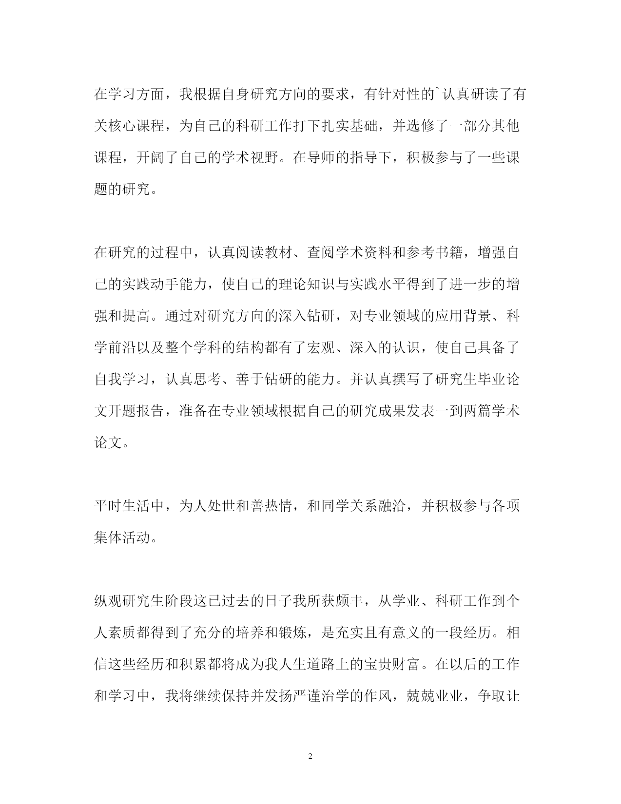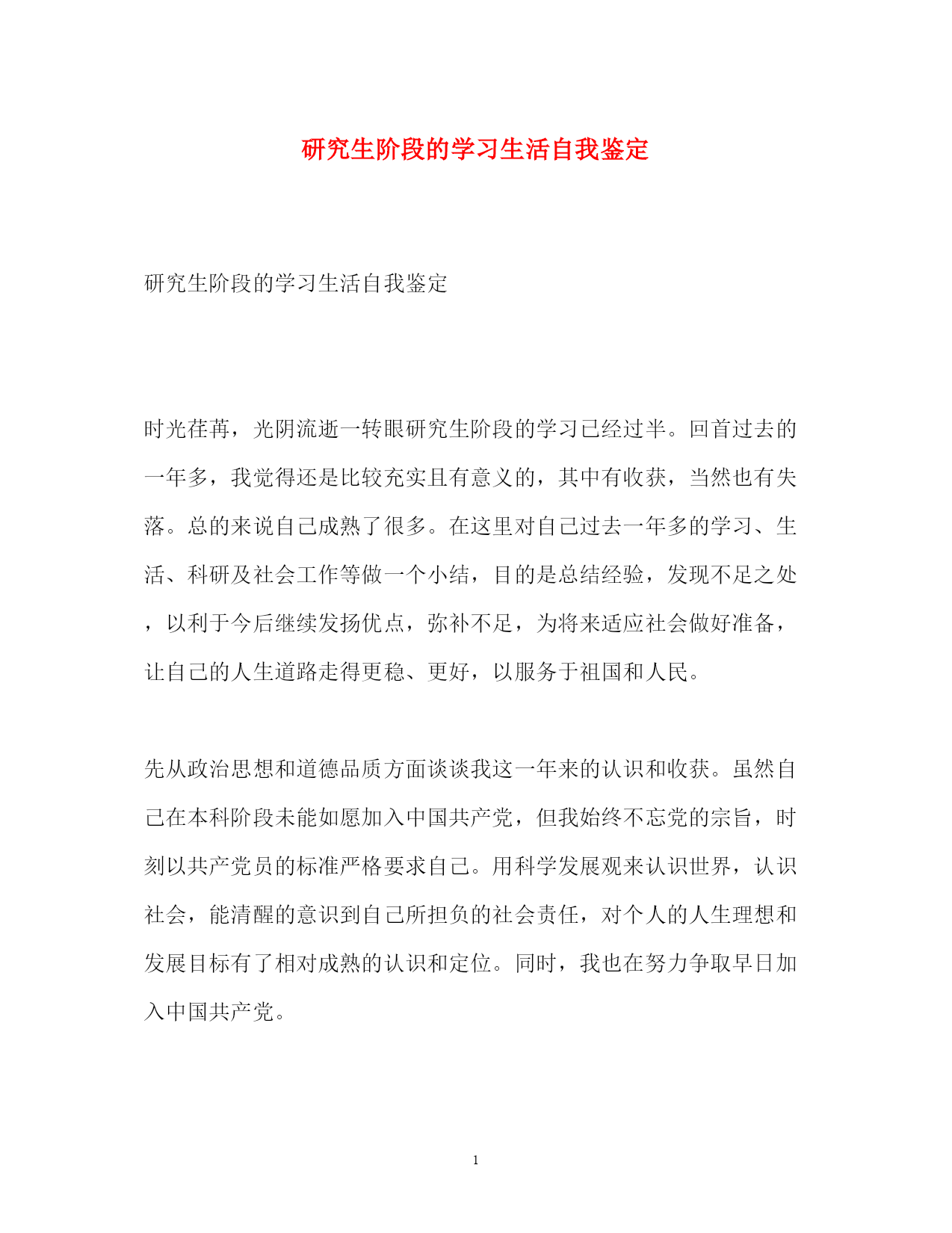 此资料由网络收集而来,如有侵权请告知上传者立即删除。资料共分享,我们负责传递知识。PAGEPAGE3研究生阶段的学习生活自我鉴定研究生阶段的学习生活自我鉴定时光荏苒,光阴流逝一转眼研究生阶段的学习已经过半。回首过去的一年多,我觉得还是比较充实且有意义的,其中有收获,当然也有失落。总的来说自己成熟了很多。在这里对自己过去一年多的学习、生活、科研及社会工作等做一个小结,目的是总结经验,发现不足之处,以利于今后继续发扬优点,弥补不足,为将来适应社会做好准备,让自己的人生道路走得更稳、更好,以服务于祖国和人民。先从政治思想和道德品质方面谈谈我这一年来的认识和收获。虽然自己在本科阶段未能如愿加入中国共产党,但我始终不忘党的宗旨,时刻以共产党员的标准严格要求自己。用科学发展观来认识世界,认识社会,能清醒的意识到自己所担负的社会责任,对个人的人生理想和发展目标有了相对成熟的认识和定位。同时,我也在努力争取早日加入中国共产党。在学习方面,我根据自身研究方向的要求,有针对性的`认真研读了有关核心课程,为自己的科研工作打下扎实基础,并选修了一部分其他课程,开阔了自己的学术视野。在导师的指导下,积极参与了一些课题的研究。在研究的过程中,认真阅读教材、查阅学术资料和参考书籍,增强自己的实践动手能力,使自己的理论知识与实践水平得到了进一步的增强和提高。通过对研究方向的深入钻研,对专业领域的应用背景、科学前沿以及整个学科的结构都有了宏观、深入的认识,使自己具备了自我学习,认真思考、善于钻研的能力。并认真撰写了研究生毕业论文开题报告,准备在专业领域根据自己的研究成果发表一到两篇学术论文。平时生活中,为人处世和善热情,和同学关系融洽,并积极参与各项集体活动。纵观研究生阶段这已过去的日子我所获颇丰,从学业、科研工作到个人素质都得到了充分的培养和锻炼,是充实且有意义的一段经历。相信这些经历和积累都将成为我人生道路上的宝贵财富。在以后的工作和学习中,我将继续保持并发扬严谨治学的作风,兢兢业业,争取让每一天更加充实且有意义。