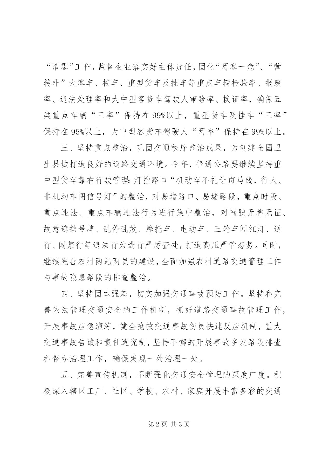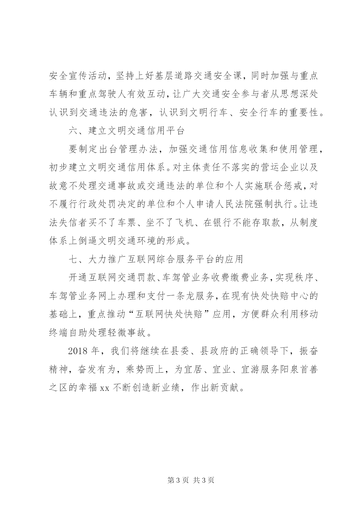 第PAGE\*Arabic\*MERGEFORMAT3页共NUMPAGES\*MERGEFORMAT3页交通安全表态发言稿xx公安局交警大队xxx道路交通安全直接关系着人民群众的安全出行,关系到千家万户,事关全县改革、发展、稳定大局。过去的一年,我县道路交通安全管理工作在县委、县政府的正确领导下,全体公安交通民警按照县局和市交警支队的要求,坚持以压事故、保安全、保畅通为工作目标,经过全体公安民警的共同努力圆满完成了上级安排的各项工作,受到县委、县政府、上级公安交通管理部门的充分肯定。今年,我队将继续深入贯彻落实党的十九大精神,以习近平新时代中国特色社会主义思想为指导,围绕交通安全和群众满意的总目标谋篇布局,把握“政治建警、数据引领、高效用警、大交通管理”新理念,建立导向明确、科学合理的管理考核体系,以七项重点工作为着力点,努力推动我队公安交管工作取得新发展、新进步。一、抓班子,带队伍,提素质,抓规范。多措并举,从严治警,深入学习贯彻党的十九大会议精神和习近平总书记系列重要讲话精神,明确政治建警,继续落实好风险隐患研判机制,定期通报排查结果,确保不发生大、恶、丑现象,强化执法记录仪配备、使用和管理,抓好党风廉政建设,打造一支过硬的公安交警队伍。二、坚持源头治理,压实企业主体责任。继续强化源头隐患“清零”工作,监督企业落实好主体责任,固化“两客一危”、“营转非”大客车、校车、重型货车及挂车等重点车辆检验率、报废率、违法处理率和大中型客货车驾驶人审验率、换证率,确保五类重点车辆“三率”保持在99%以上,重型货车及挂车“三率”保持在95%以上,大中型客货车驾驶人“两率”保持在99%以上。三、坚持重点整治,巩固交通秩序整治成果,为创建全国卫生县城打造良好的道路交通环境。今年,普通公路要继续坚持重中型货车靠右行驶管理;灯控路口“机动车不礼让斑马线,行人、非机动车闯信号灯”的整治,对易堵路口、易堵路段,重点时段、重点违法、重点车辆违法行为进行集中整治,对驾驶无牌无证、故意遮挡号牌、乱停乱放、摩托车、电动车、三轮车闯红灯、逆行、闯禁行等违法行为进行严厉查处,打造高压严管态势。同时,继续完善农村两站两员的建设,全面加强农村道路交通管理工作与事故隐患路段的排查整治。四、坚持固本强基,切实加强交通事故预防工作。坚持和完善依法管理交通安全的工作机制,抓好道路交通事故管理工作,开展事故应急演练,健全抢救交通事故伤员快速反应机制,重大交通事故告诫和责任追究制,坚持不懈的开展事故多发路段排查和督办治理工作,确保发现一处治理一处。五、完善宣传机制,不断强化交通安全管理的深度广度。积极深入辖区工厂、社区、学校、农村、家庭开展丰富多彩的交通安全宣传活动,坚持上好基层道路交通安全课,同时加强与重点车辆和重点驾驶人有效互动,让广大交通安全参与者从思想深处认识到交通违法的危害,认识到文明行车、安全行车的重要性。六、建立文明交通信用平台要制定出台管理办法,加强交通信用信息收集和使用管理,初步建立文明交通信用体系。对主体责任不落实的营运企业以及故意不处理交通事故或交通违法的单位和个人实施联合惩戒,对不履行行政处罚决定的单位和个人申请人民法院强制执行。让违法失信者买不了车票、坐不了飞机、在银行不能存取款,从制度体系上倒逼文明交通环境的形成。七、大力推广互联网综合服务平台的应用开通互联网交通罚款、车驾管业务收费缴费业务,实现秩序、车驾管业务网上办理和支付一条龙服务,在现有快处快赔中心的基础上,重点推动“互联网快处快赔”应用,方便群众利用移动终端自助处理轻微事故。2018年,我们将继续在县委、县政府的正确领导下,振奋精神,奋发有为,乘势而上,为宜居、宜业、宜游服务阳泉首善之区的幸福xx不断创造新业绩,作出新贡献。